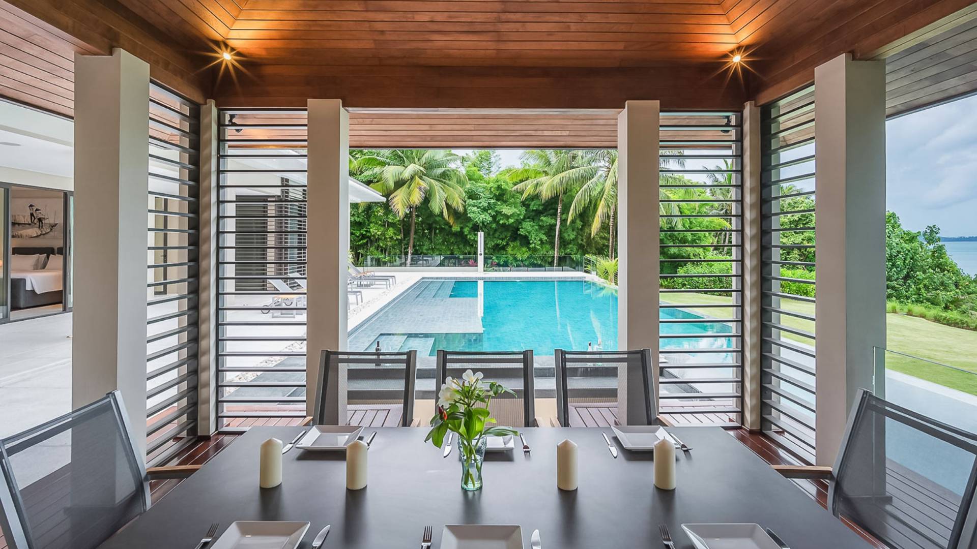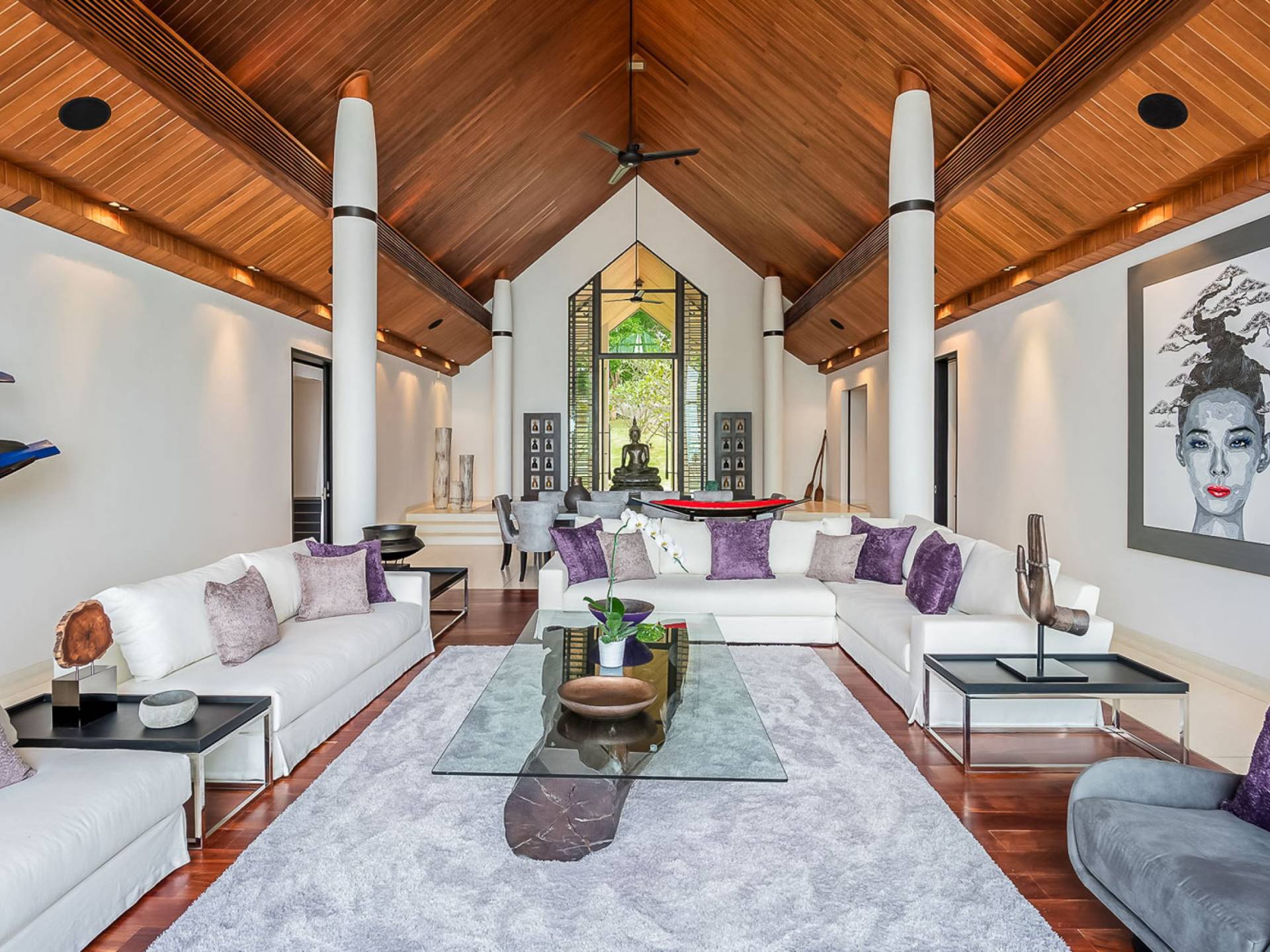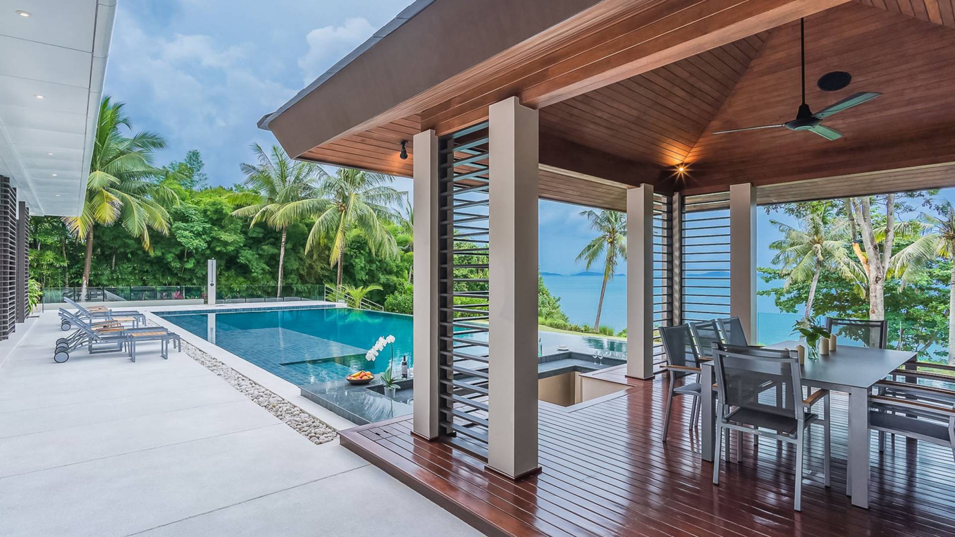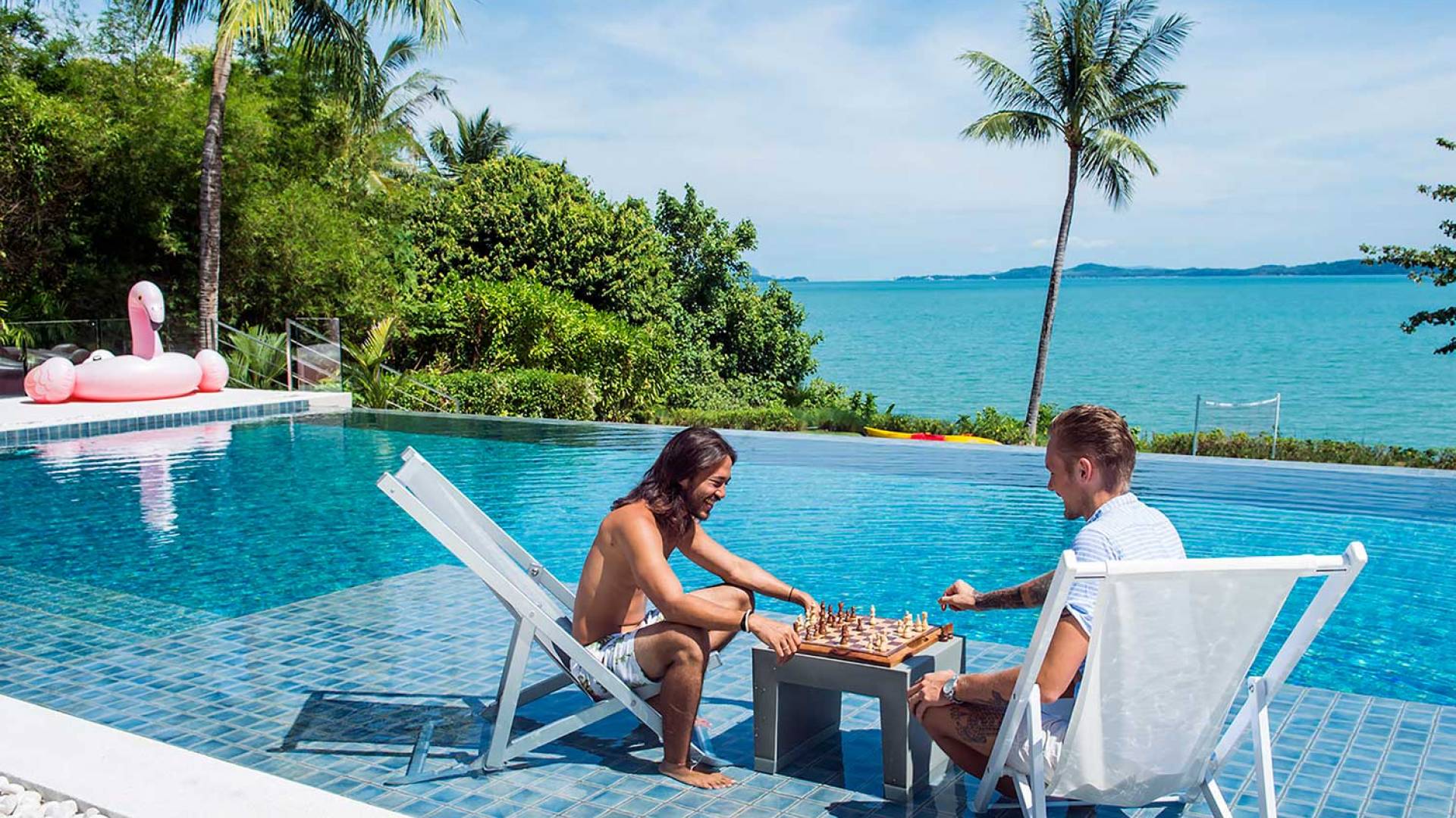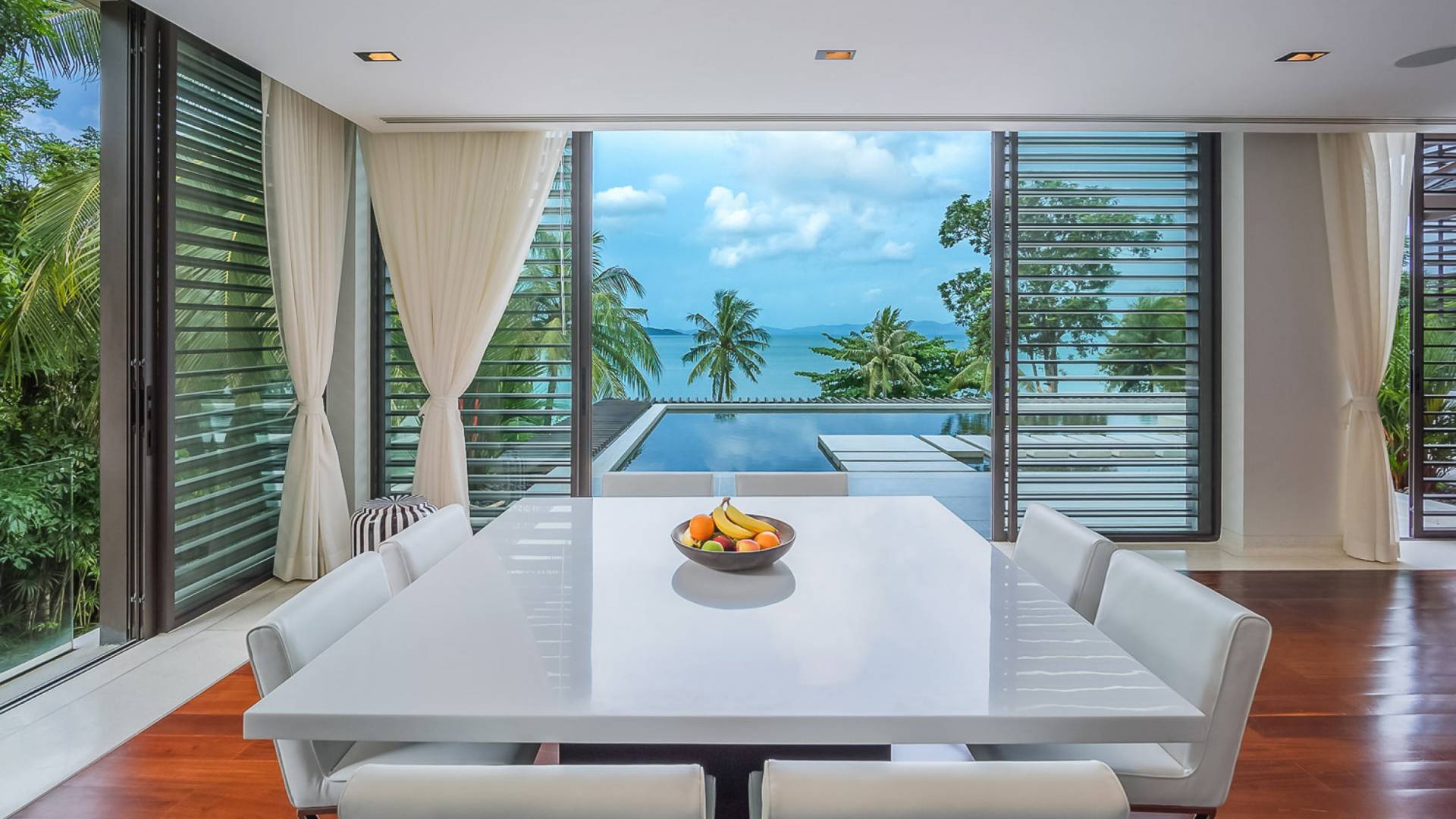 Las 4 luminosas habitaciones con baño disfrutan de vistas cinematográficas. Imagínese despertarse por la mañana y pasar unos momentos en la cama mientras contempla las espectaculares vistas. Villa Naam ofrece lujosos espacios para vivir y comer, mientras que su piscina infinita privada de 30 metros de largo con su bar en la piscina lo dejará asombrado. Amplios jardines con césped y altas palmeras aíslan la villa y ofrecen total privacidad a sus huéspedes. El amable equipo de personal incluye un chef ejecutivo, asistentes de limpieza, personal de servicio y seguridad.