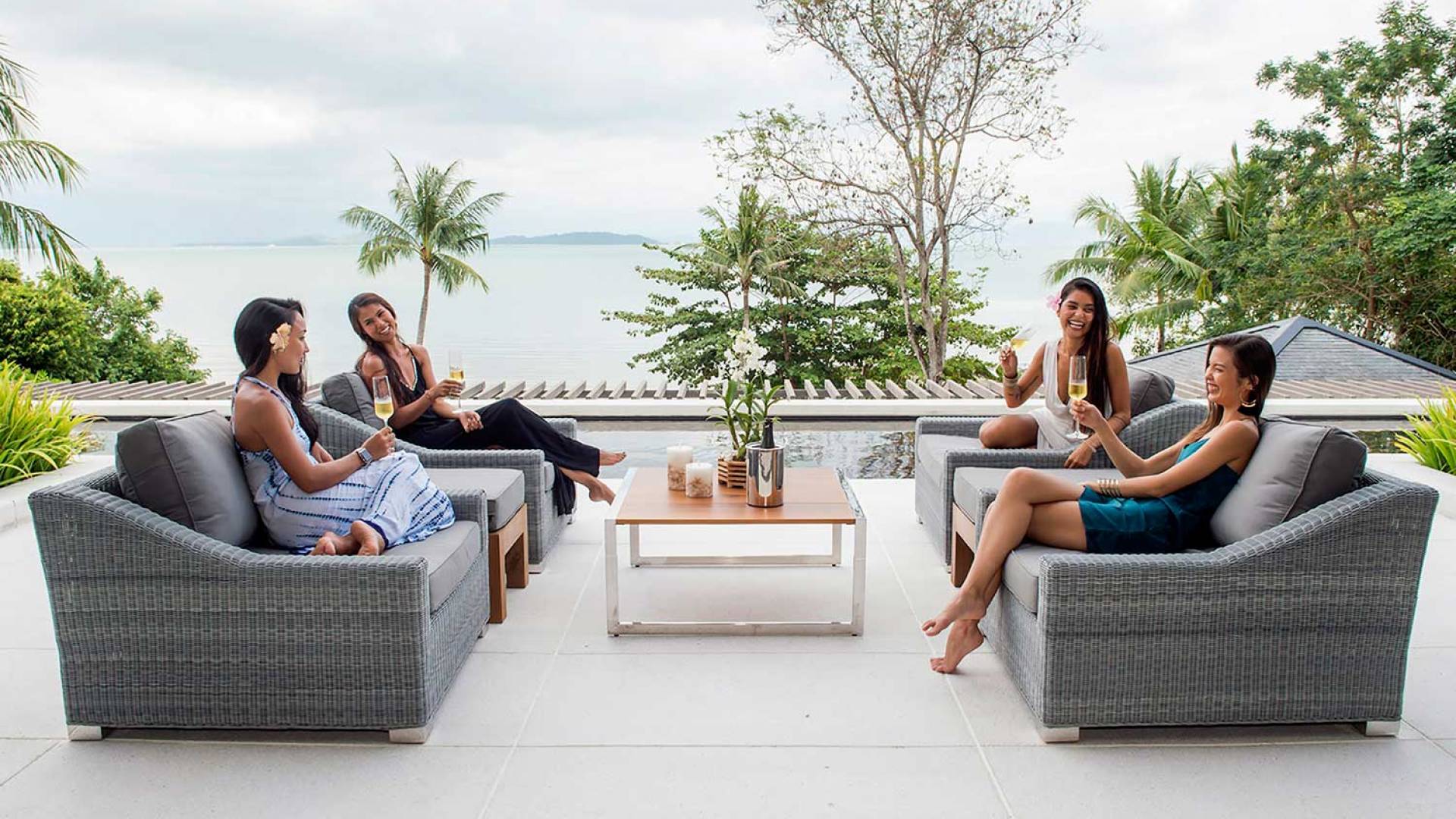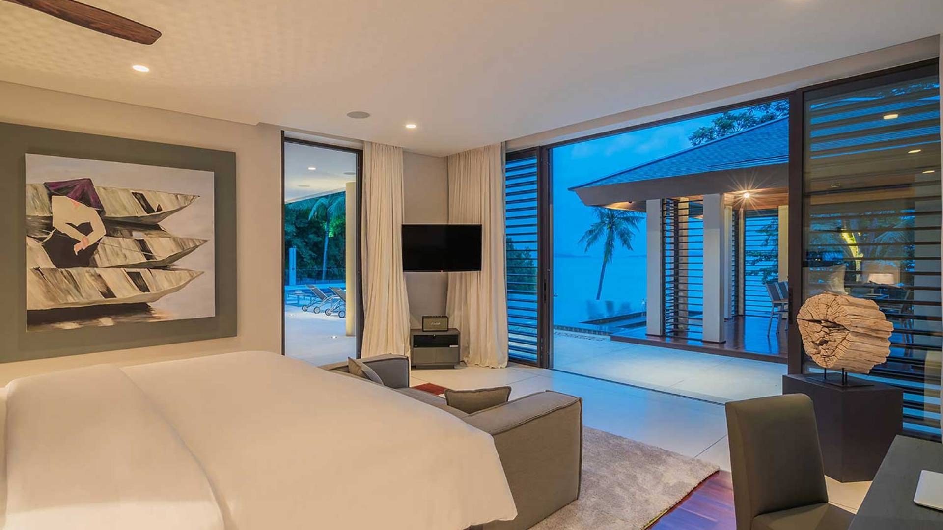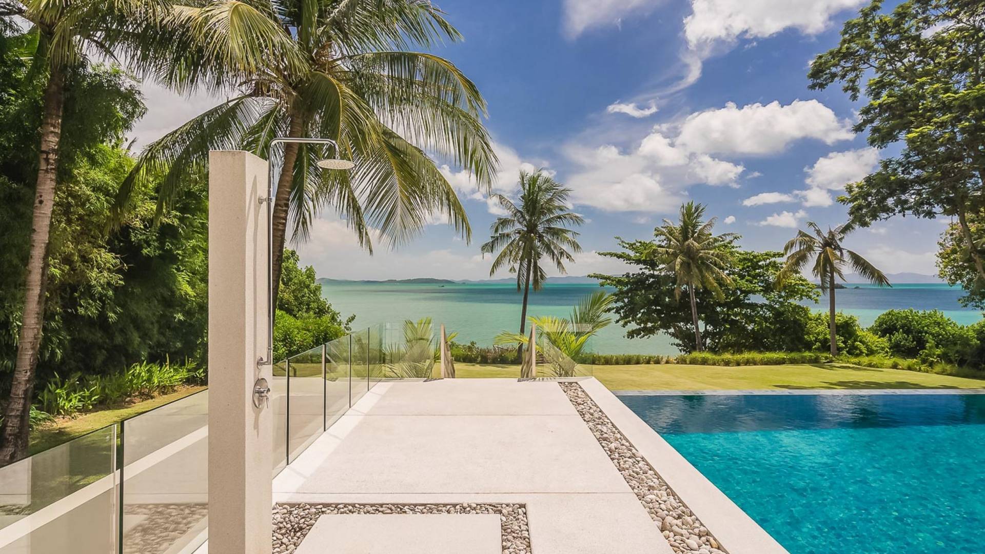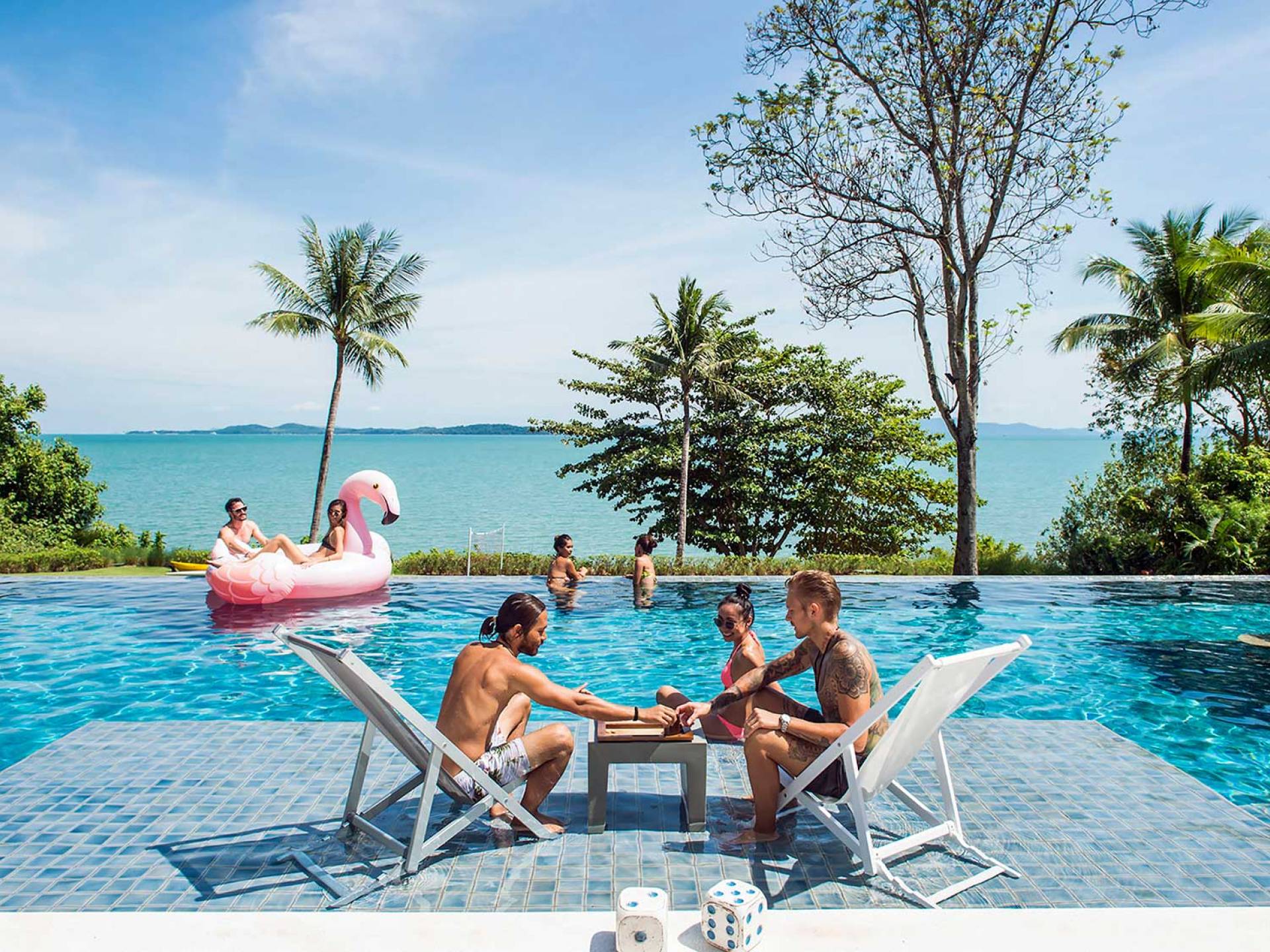 Las 4 luminosas habitaciones con baño disfrutan de vistas cinematográficas. Imagínese despertarse por la mañana y pasar unos momentos en la cama mientras contempla las espectaculares vistas. Villa Naam ofrece lujosos espacios para vivir y comer, mientras que su piscina infinita privada de 30 metros de largo con su bar en la piscina lo dejará asombrado. Amplios jardines con césped y altas palmeras aíslan la villa y ofrecen total privacidad a sus huéspedes. El amable equipo de personal incluye un chef ejecutivo, asistentes de limpieza, personal de servicio y seguridad.