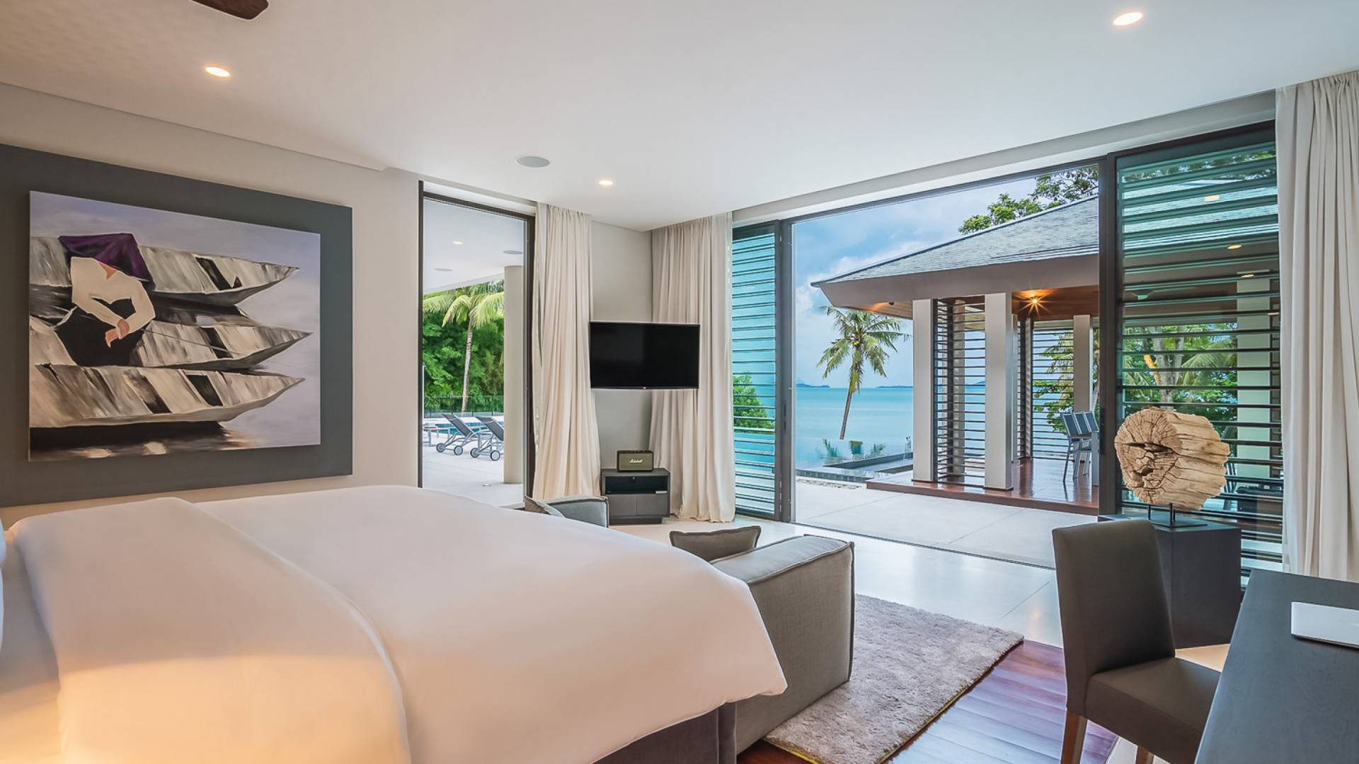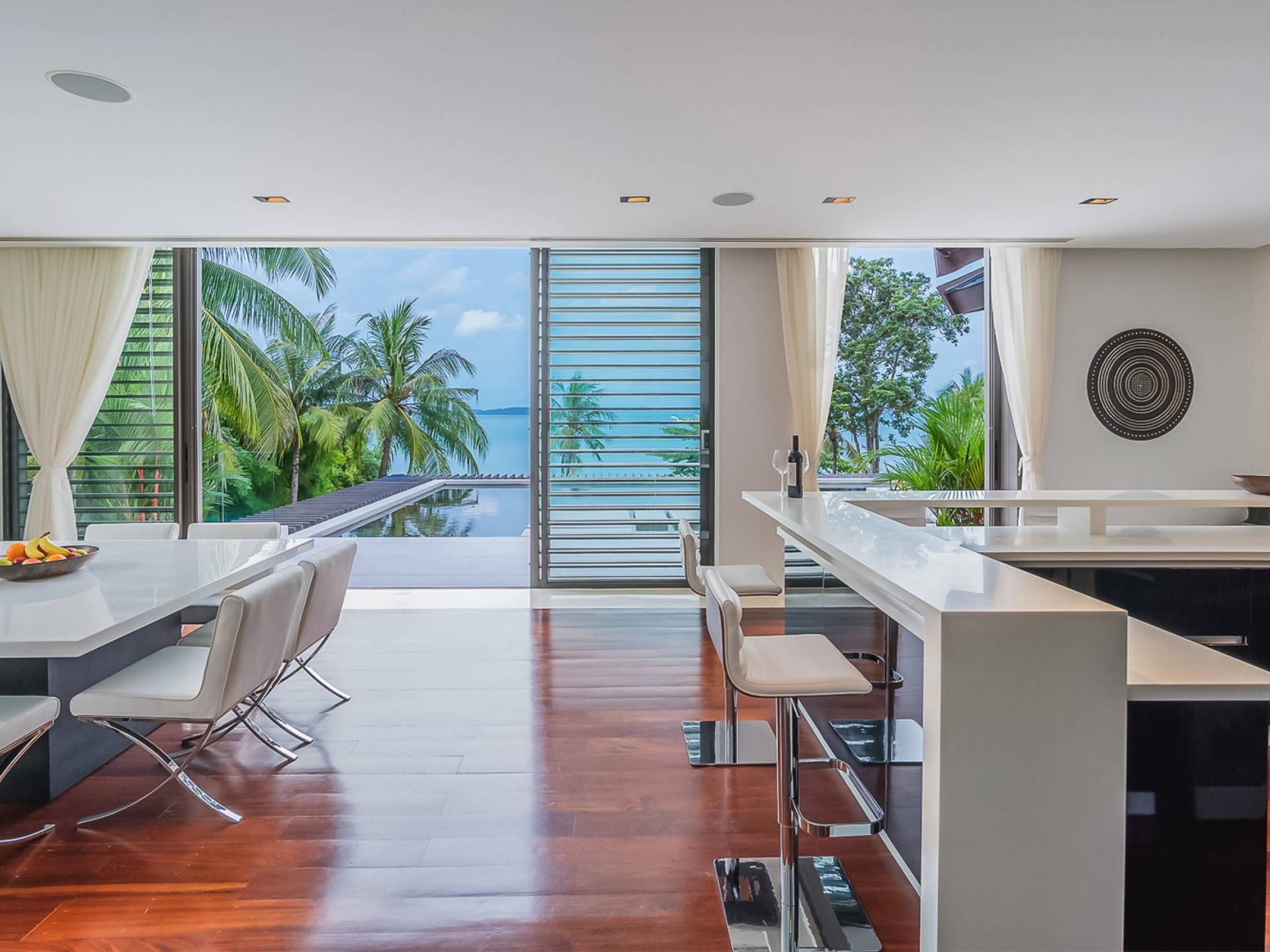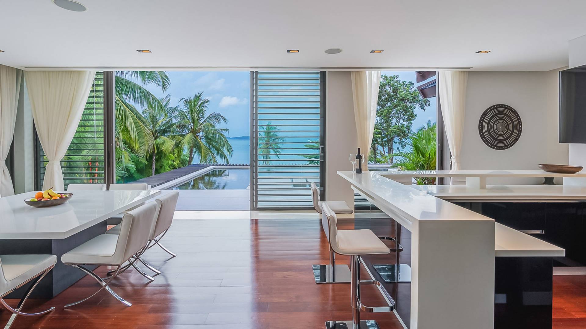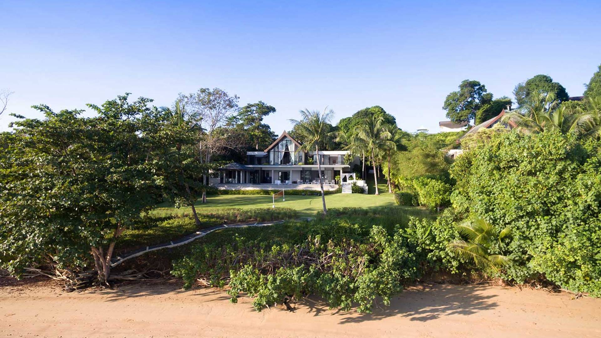 Las puertas de vidrio de gran tamaño permiten que los espacios interiores y exteriores se fusionen y brinden las vistas más maravillosas. Esta impresionante villa frente al mar permite el acceso a la playa privada, por lo tanto, es el lugar perfecto para familias o amigos que deseen pasar sus días relajándose o divirtiéndose en la playa.