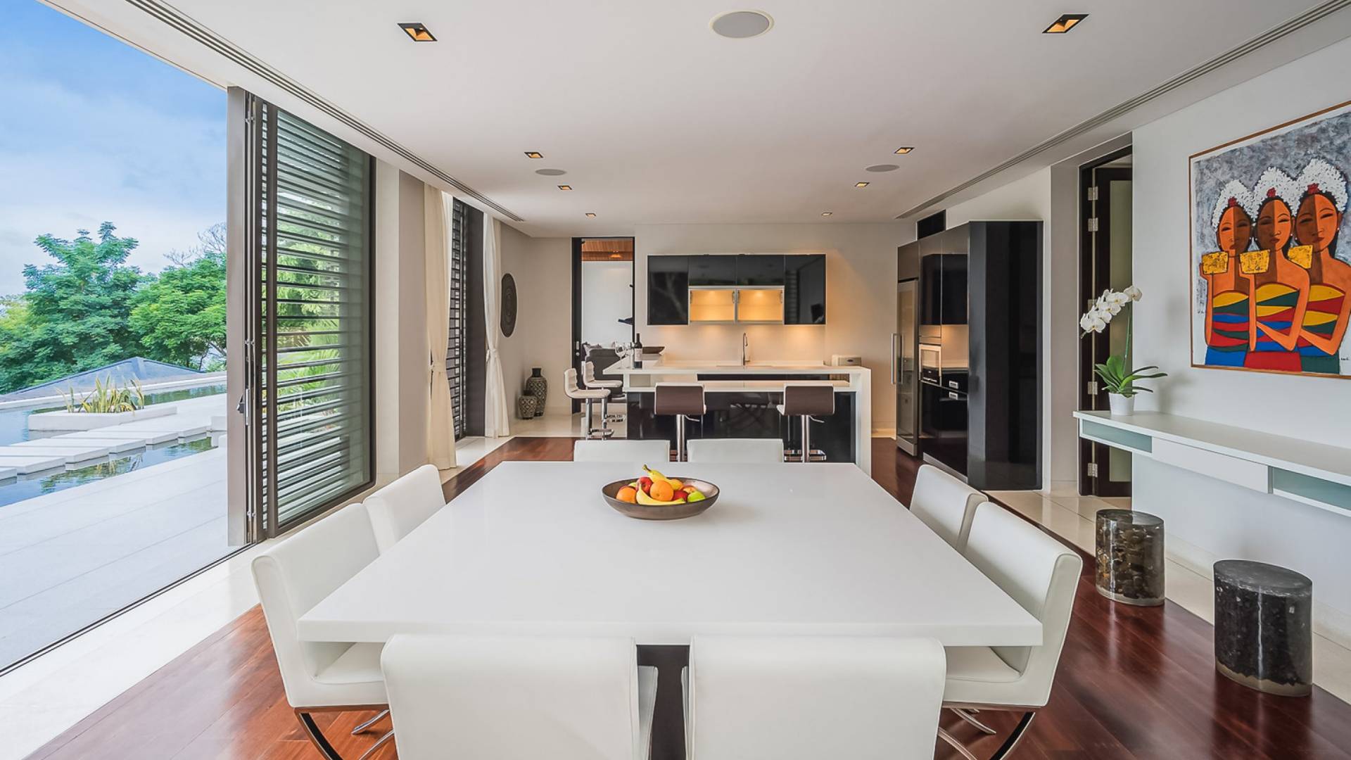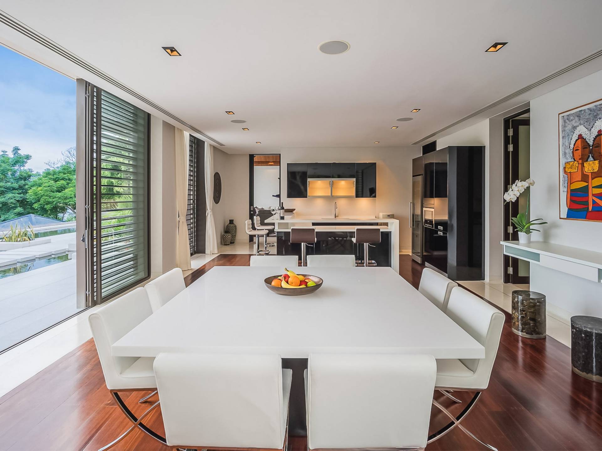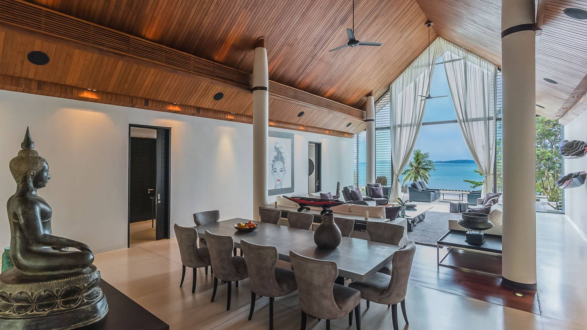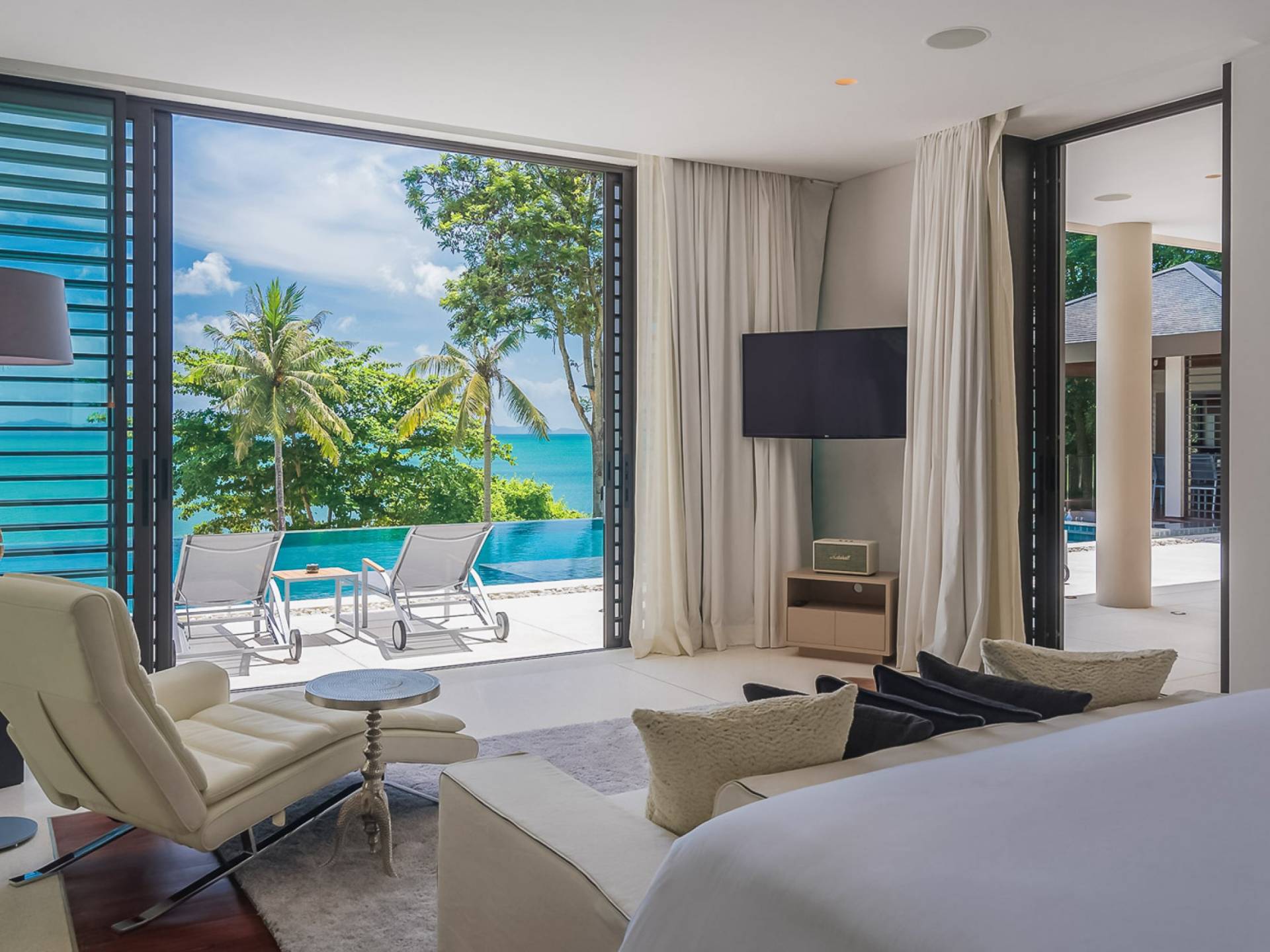 Las puertas de vidrio de gran tamaño permiten que los espacios interiores y exteriores se fusionen y brinden las vistas más maravillosas. Esta impresionante villa frente al mar permite el acceso a la playa privada, por lo tanto, es el lugar perfecto para familias o amigos que deseen pasar sus días relajándose o divirtiéndose en la playa.