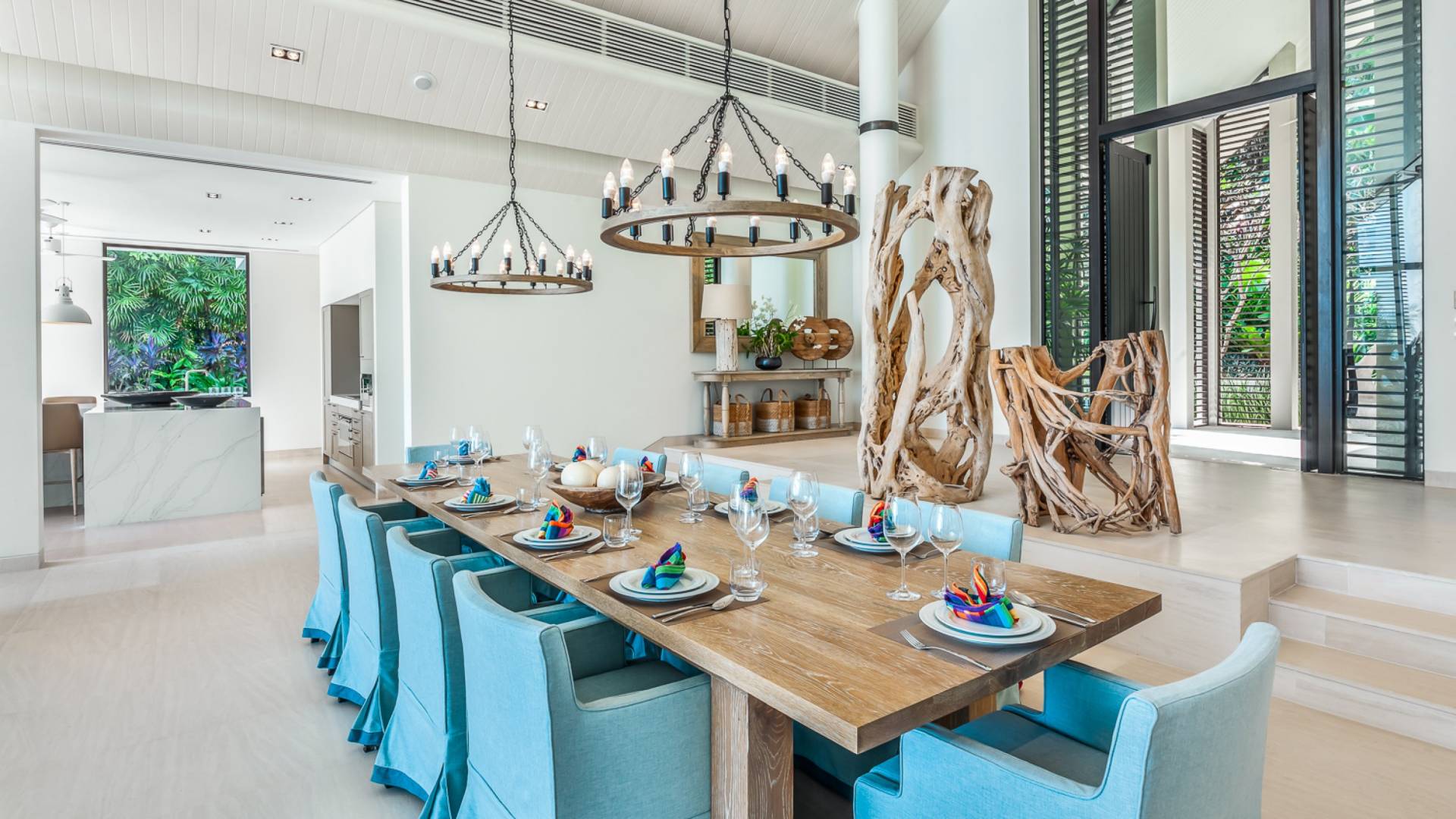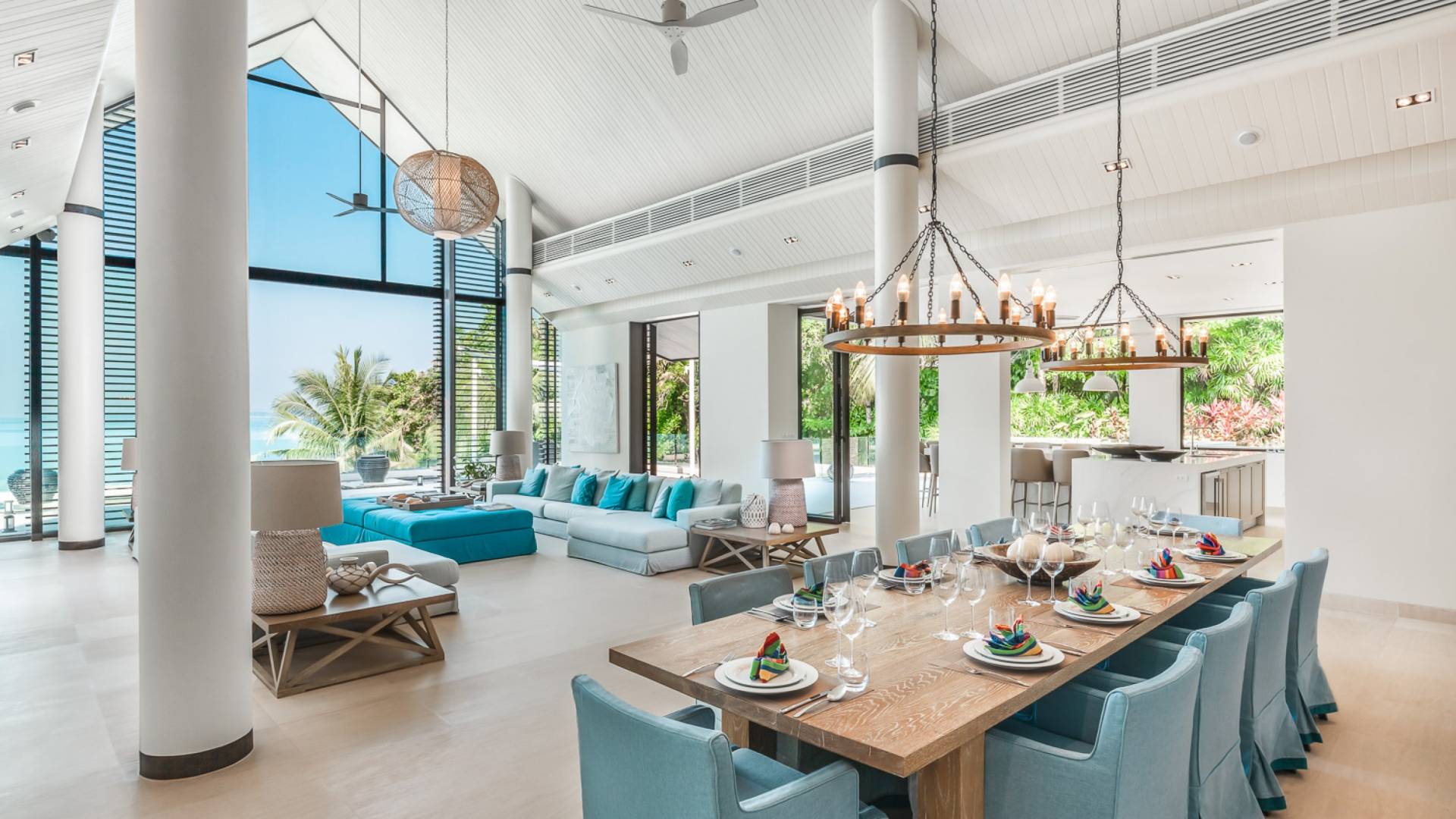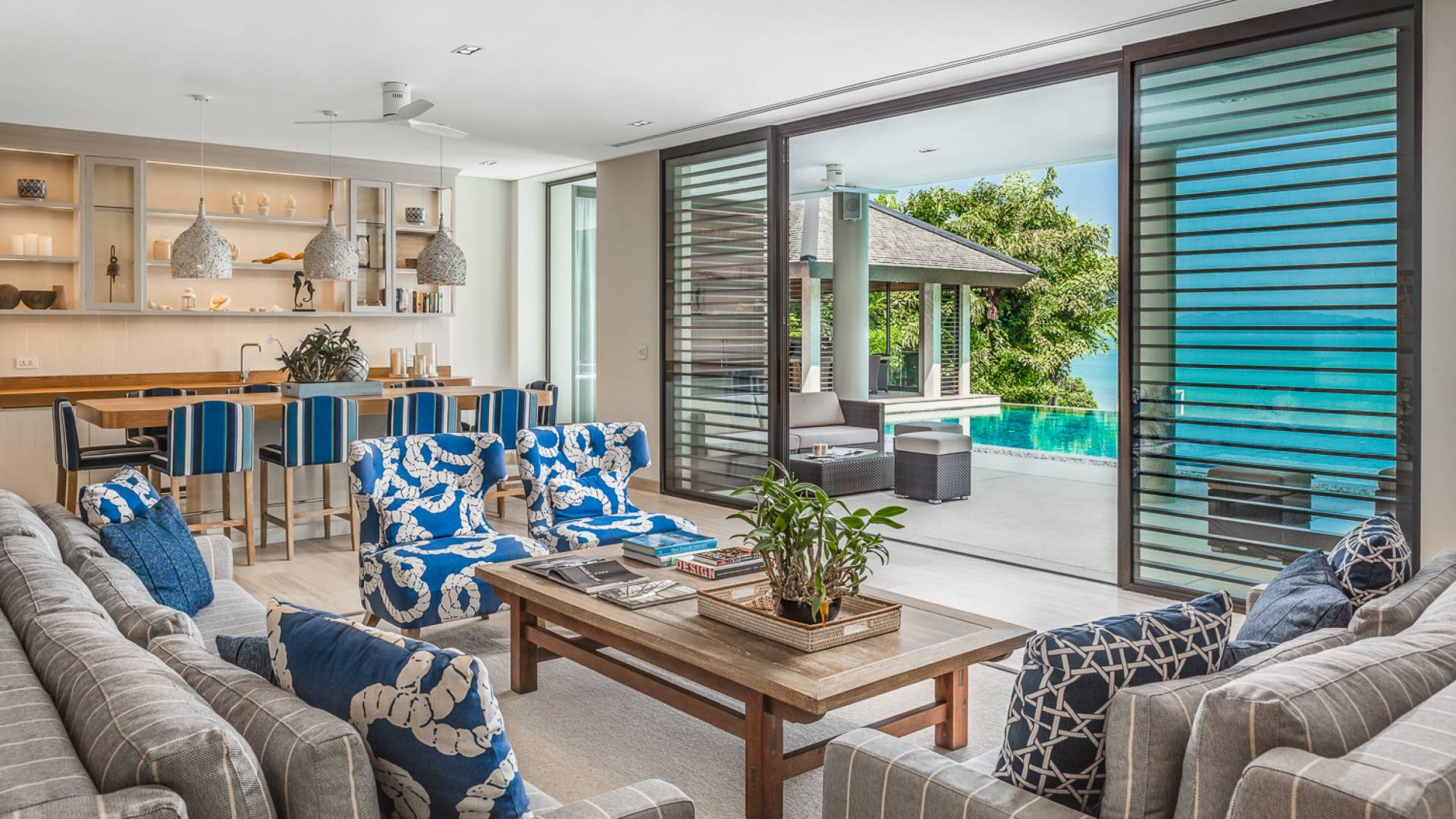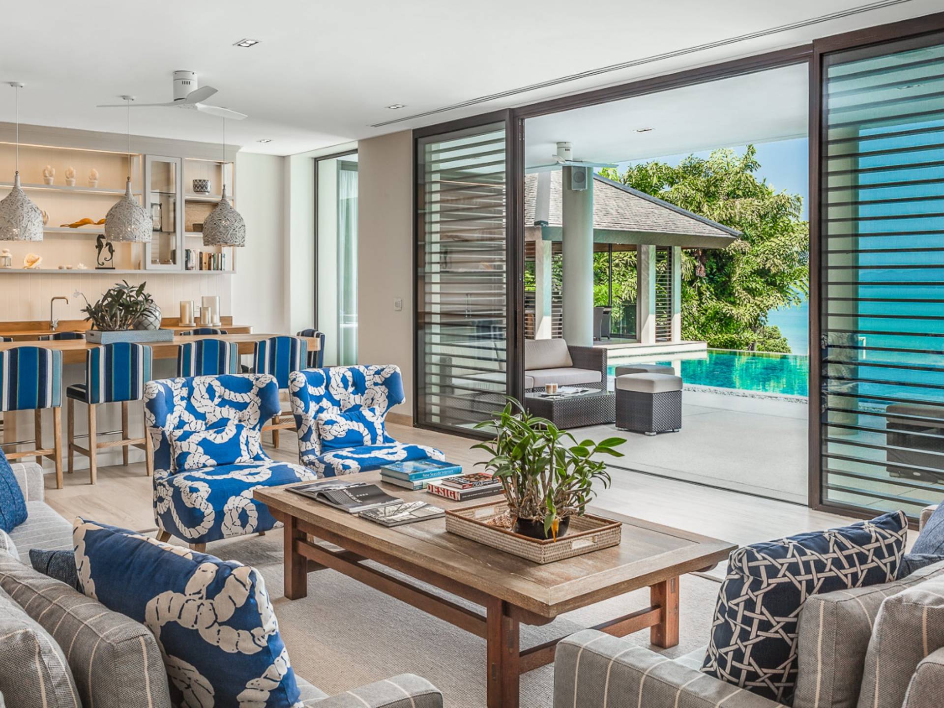Desde la entrada de la propiedad, una serie de escalones de piedra que atraviesan un exuberante jardín tropical lo llevan a las puertas principales de la villa. Al entrar en el edificio, inmediatamente te recibe la vista de la bahía de Phang Nga, perfectamente enmarcada por el perfil pentagonal de la sala. Encontrará una hermosa mesa de comedor y una sala de estar, generosamente amueblada con sofás suaves y cómodos. El diseño limpio y minimalista y los colores claros y alegres del lugar crean un ambiente cálido y acogedor que lo envolverá al instante. El impresionante techo abovedado brinda espacio vertical adicional al interior, y los candelabros que cuelgan de él agregan un toque elegante a la habitación.
