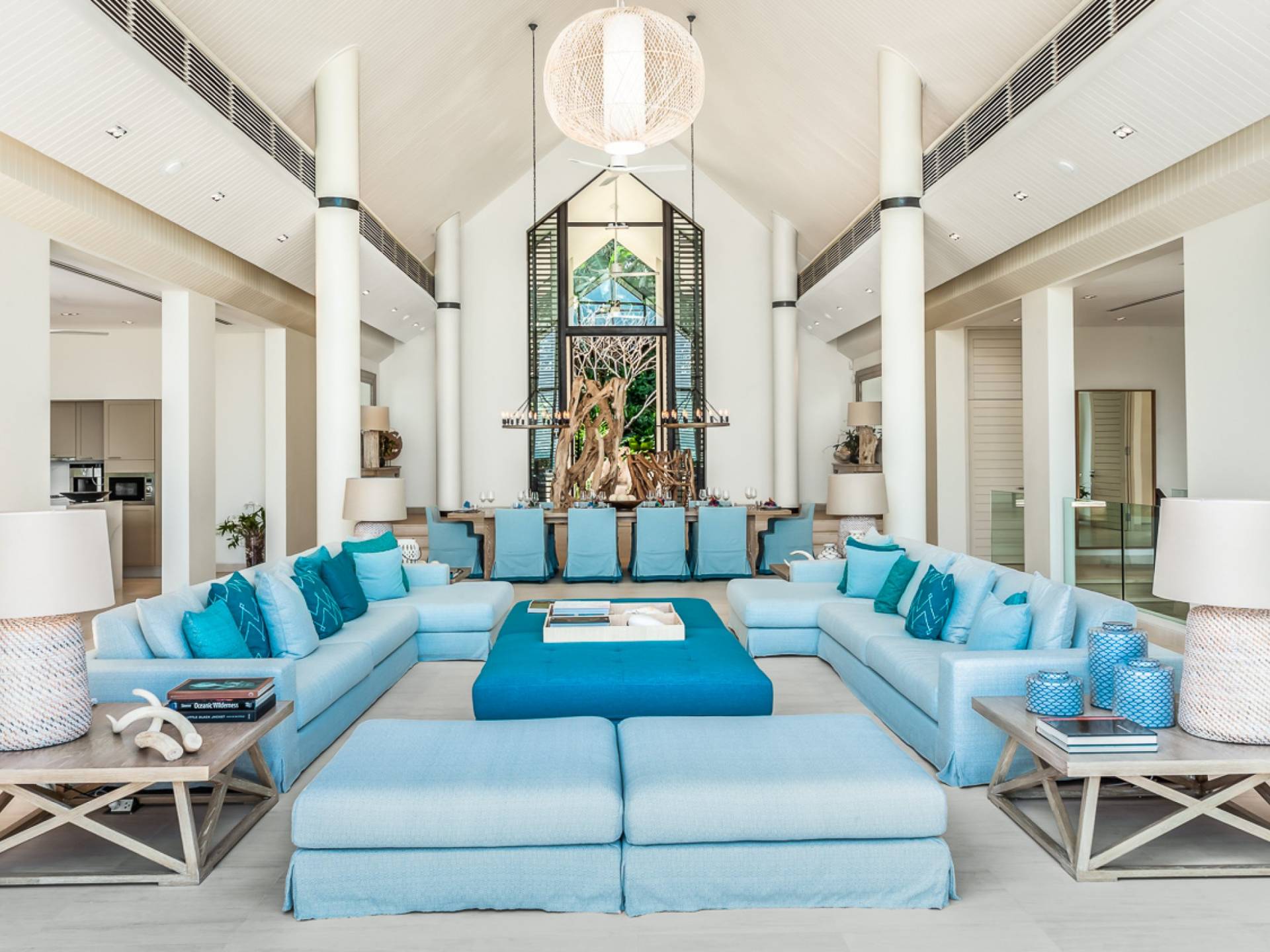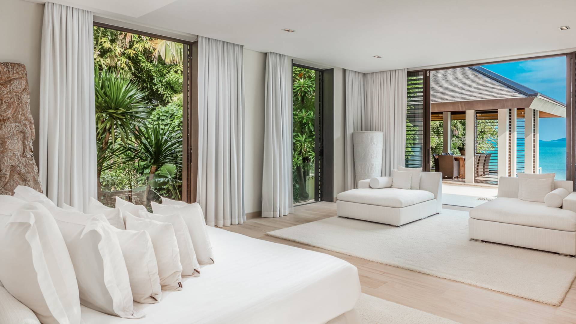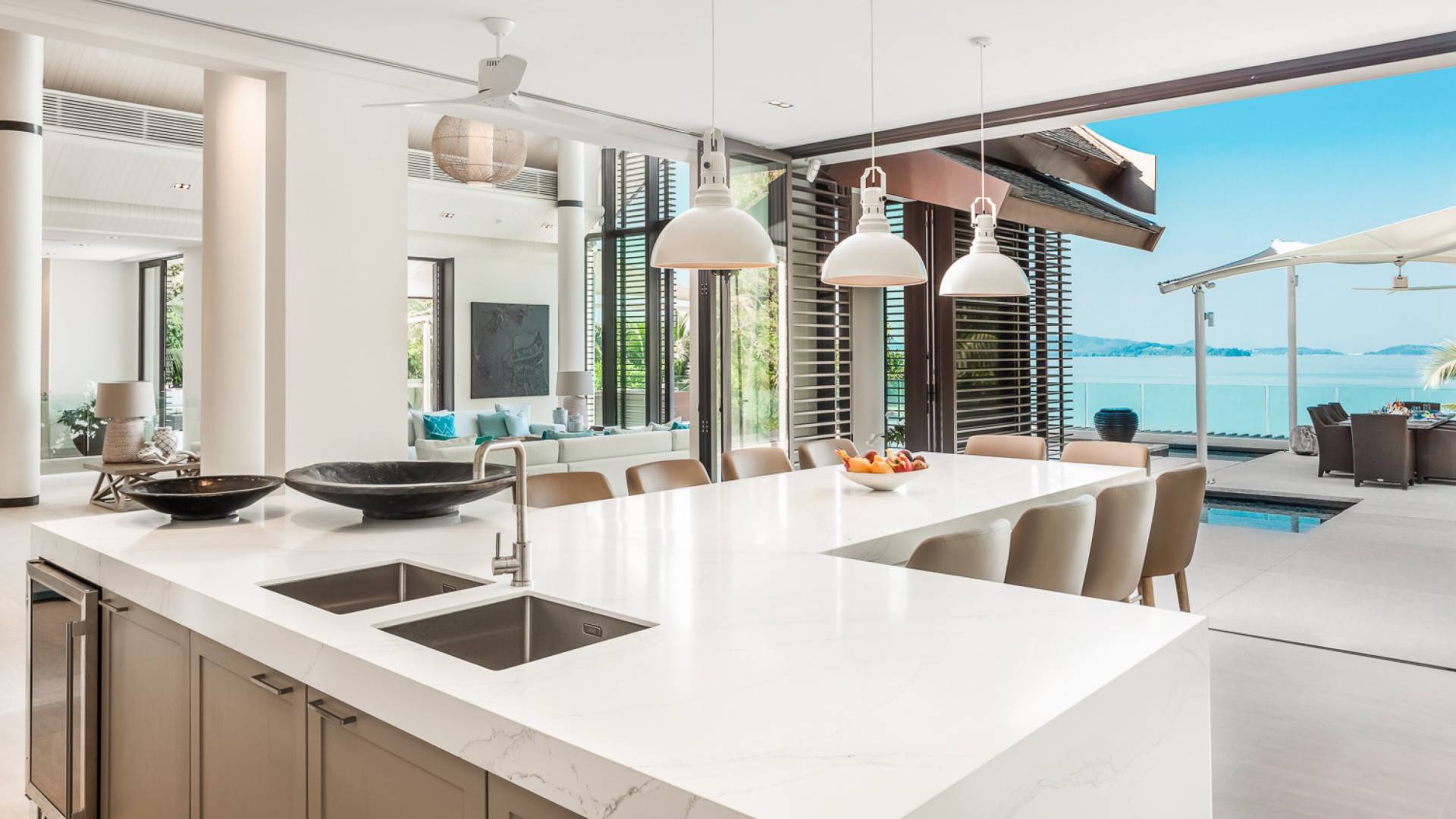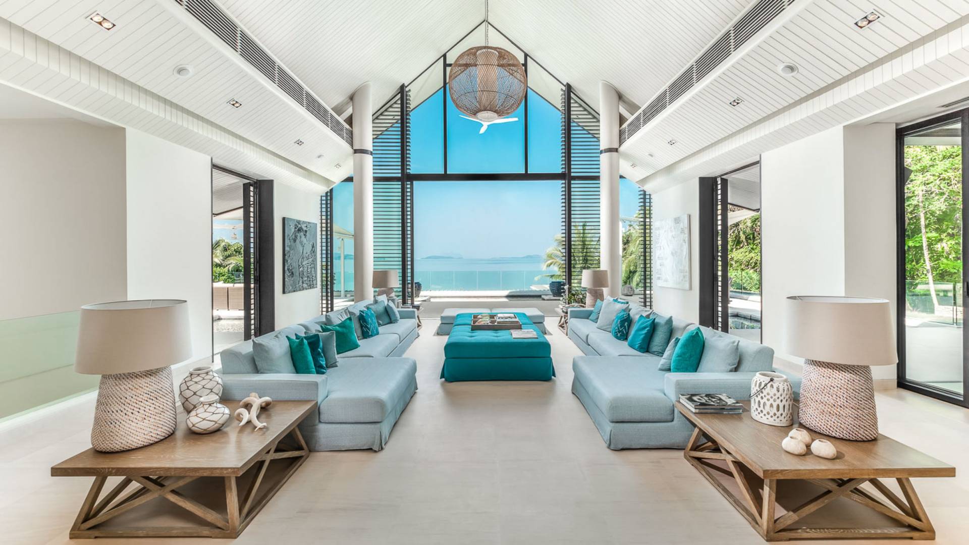 Desde la entrada de la propiedad, una serie de escalones de piedra que atraviesan un exuberante jardín tropical lo llevan a las puertas principales de la villa. Al entrar en el edificio, inmediatamente te recibe la vista de la bahía de Phang Nga, perfectamente enmarcada por el perfil pentagonal de la sala. Encontrará una hermosa mesa de comedor y una sala de estar, generosamente amueblada con sofás suaves y cómodos. El diseño limpio y minimalista y los colores claros y alegres del lugar crean un ambiente cálido y acogedor que lo envolverá al instante. El impresionante techo abovedado brinda espacio vertical adicional al interior, y los candelabros que cuelgan de él agregan un toque elegante a la habitación.
