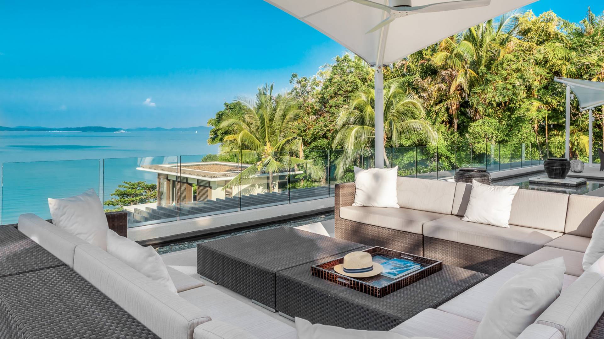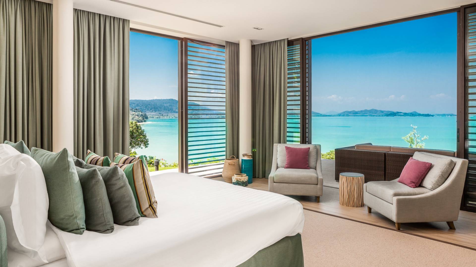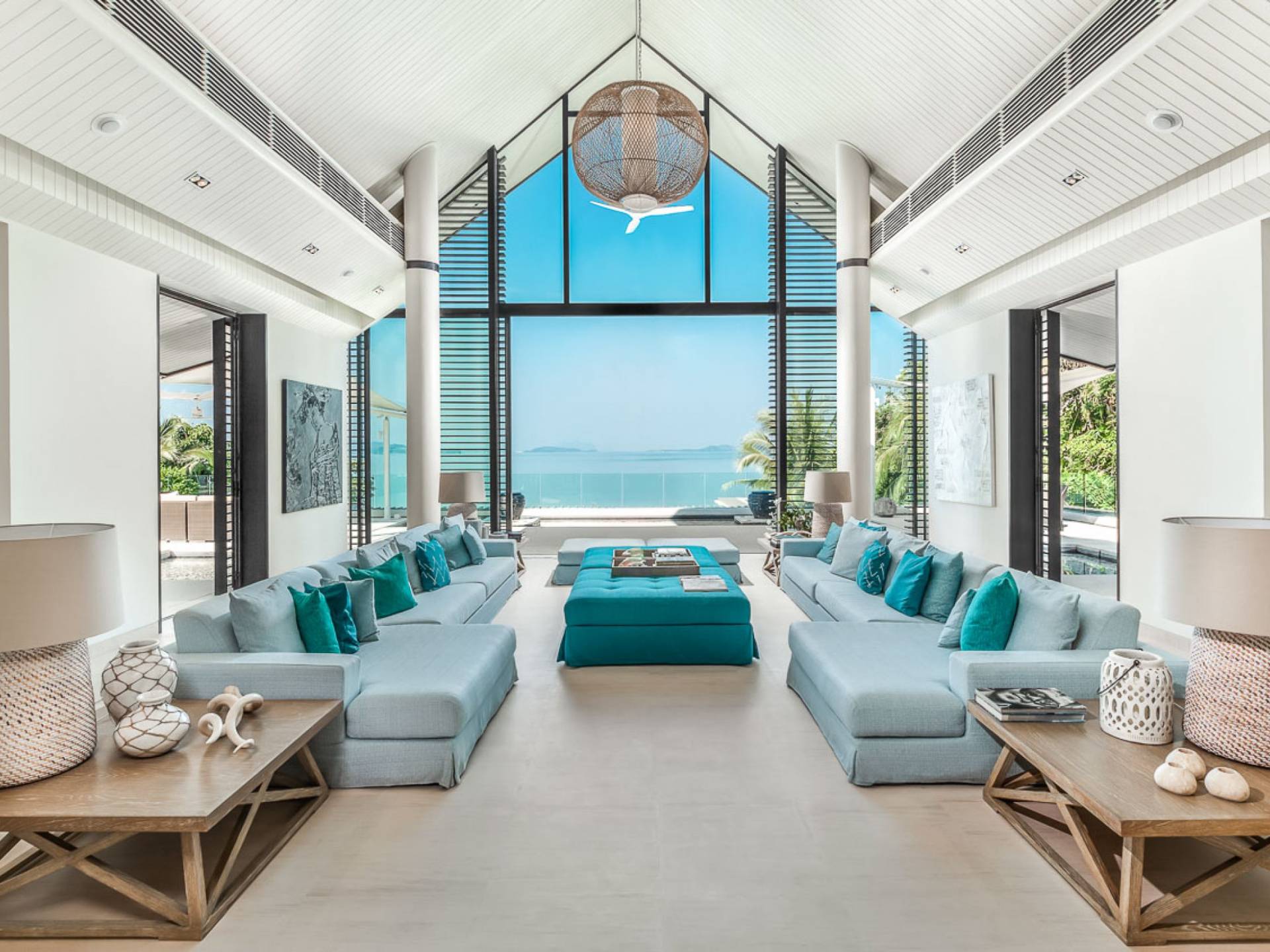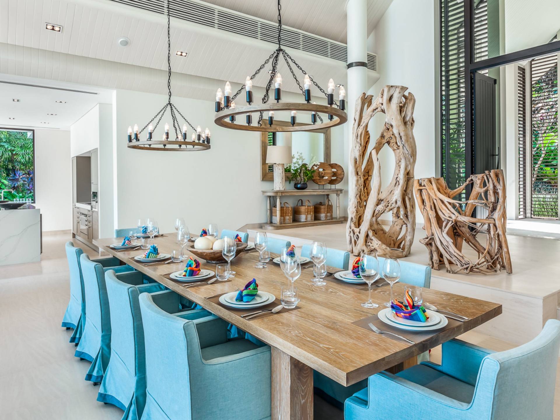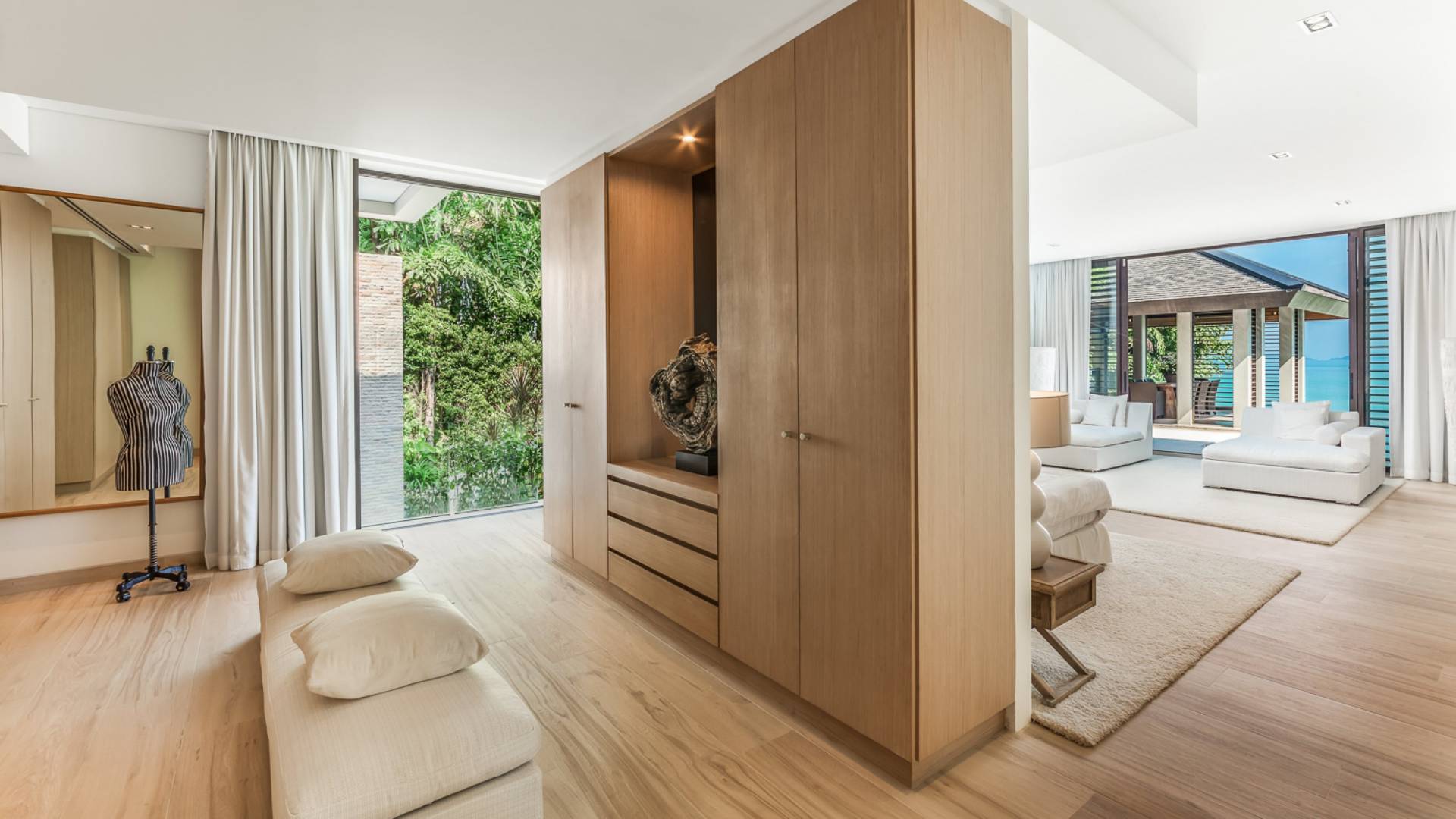 Desde la entrada de la propiedad, una serie de escalones de piedra que atraviesan un exuberante jardín tropical lo llevan a las puertas principales de la villa. Al entrar en el edificio, inmediatamente te recibe la vista de la bahía de Phang Nga, perfectamente enmarcada por el perfil pentagonal de la sala. Encontrará una hermosa mesa de comedor y una sala de estar, generosamente amueblada con sofás suaves y cómodos. El diseño limpio y minimalista y los colores claros y alegres del lugar crean un ambiente cálido y acogedor que lo envolverá al instante. El impresionante techo abovedado brinda espacio vertical adicional al interior, y los candelabros que cuelgan de él agregan un toque elegante a la habitación.