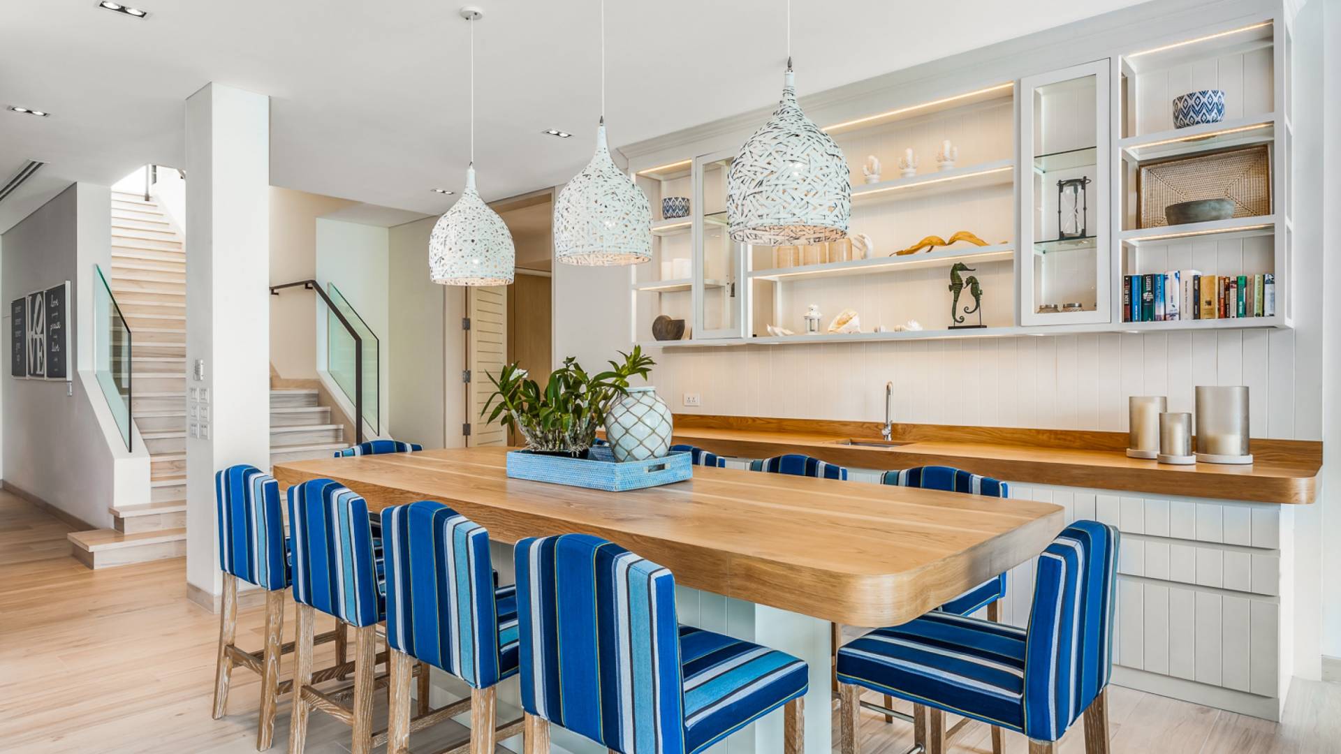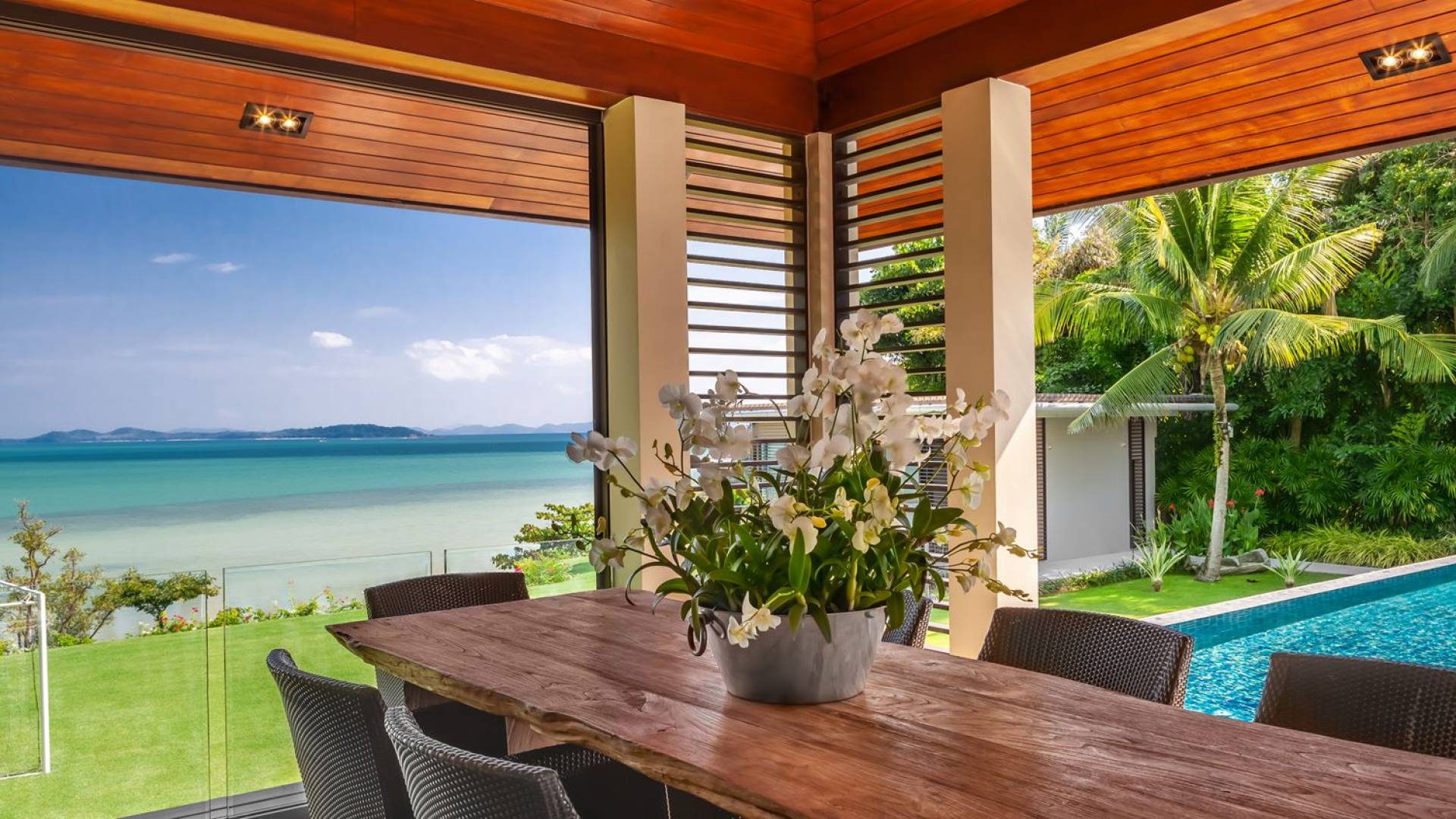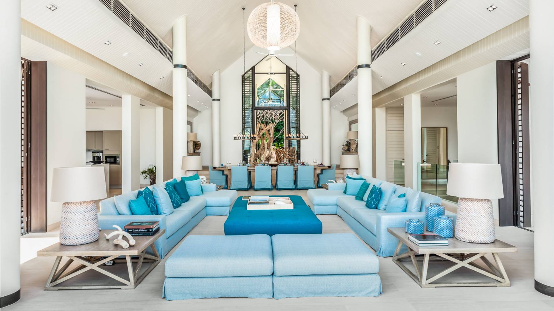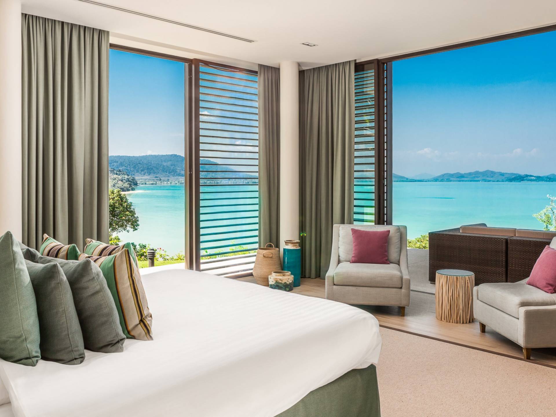 Desde la entrada de la propiedad, una serie de escalones de piedra que atraviesan un exuberante jardín tropical lo llevan a las puertas principales de la villa. Al entrar en el edificio, inmediatamente te recibe la vista de la bahía de Phang Nga, perfectamente enmarcada por el perfil pentagonal de la sala. Encontrará una hermosa mesa de comedor y una sala de estar, generosamente amueblada con sofás suaves y cómodos. El diseño limpio y minimalista y los colores claros y alegres del lugar crean un ambiente cálido y acogedor que lo envolverá al instante. El impresionante techo abovedado brinda espacio vertical adicional al interior, y los candelabros que cuelgan de él agregan un toque elegante a la habitación.