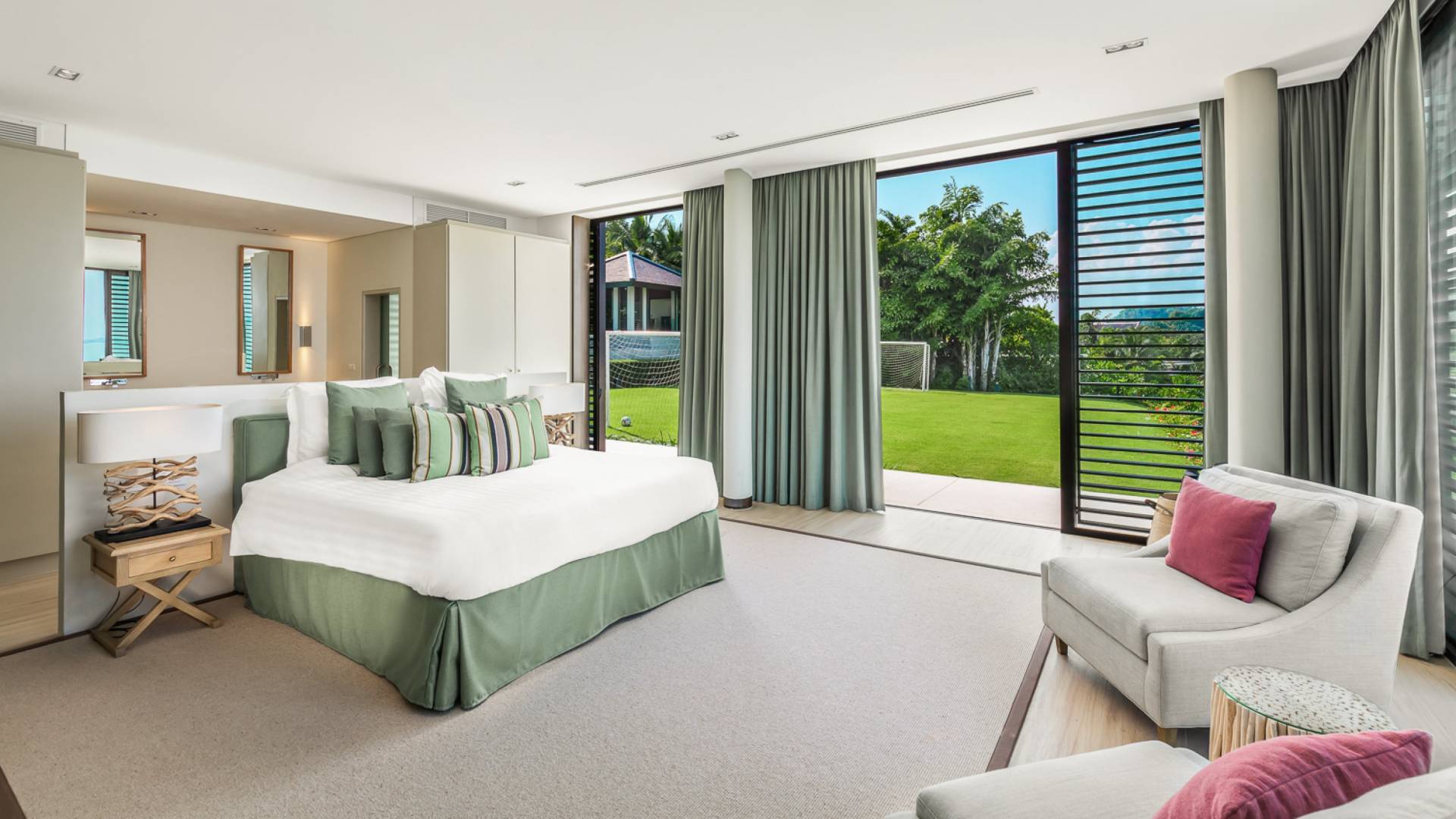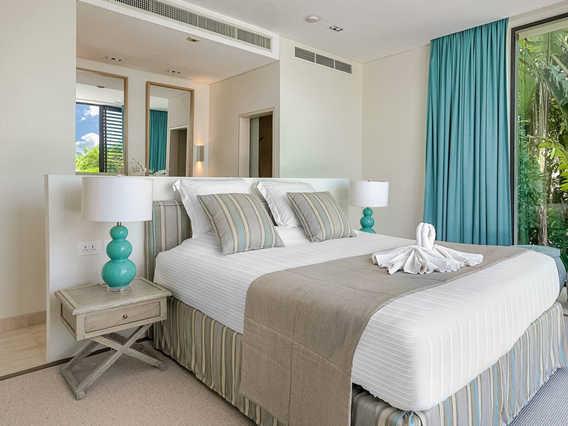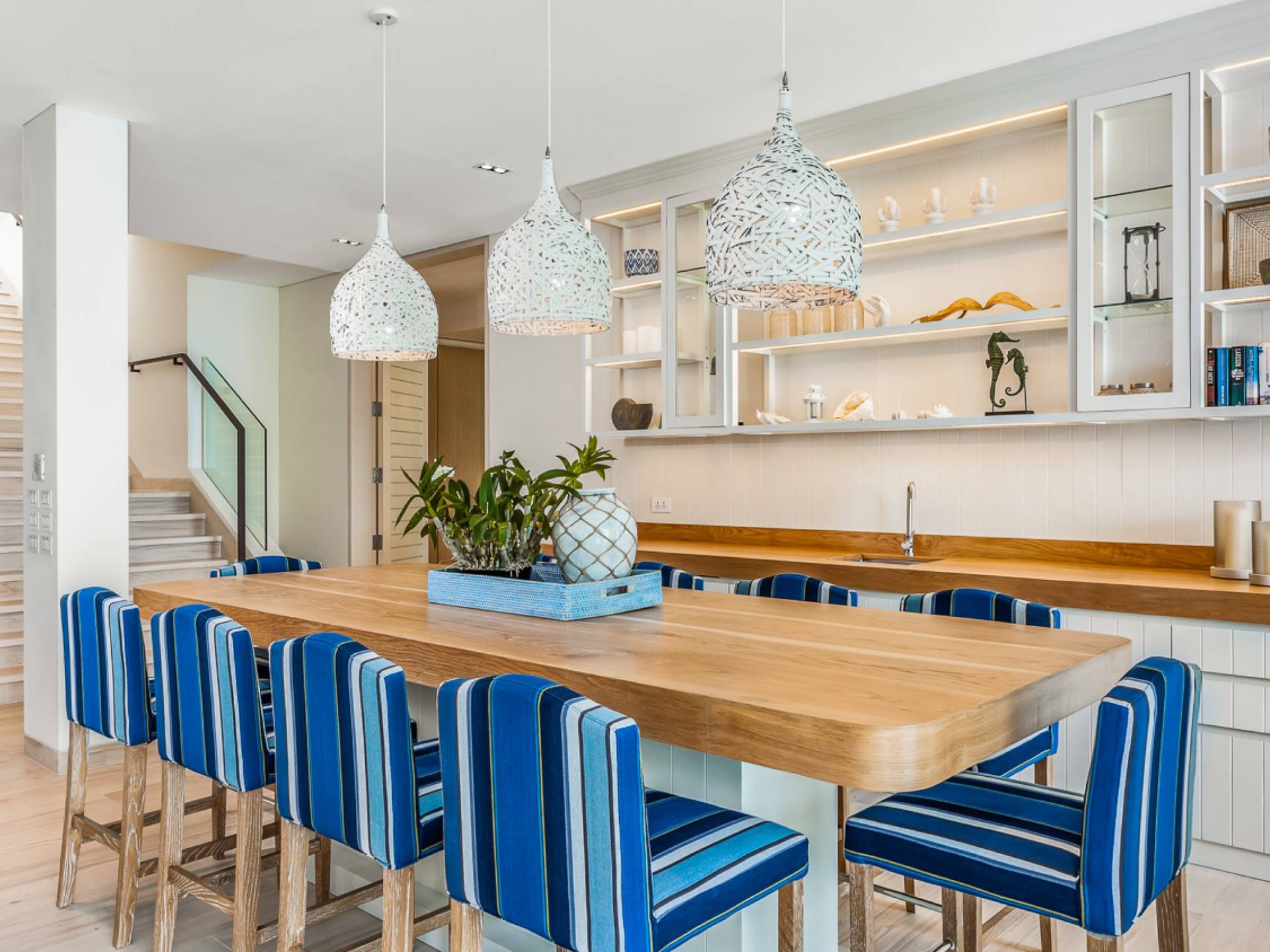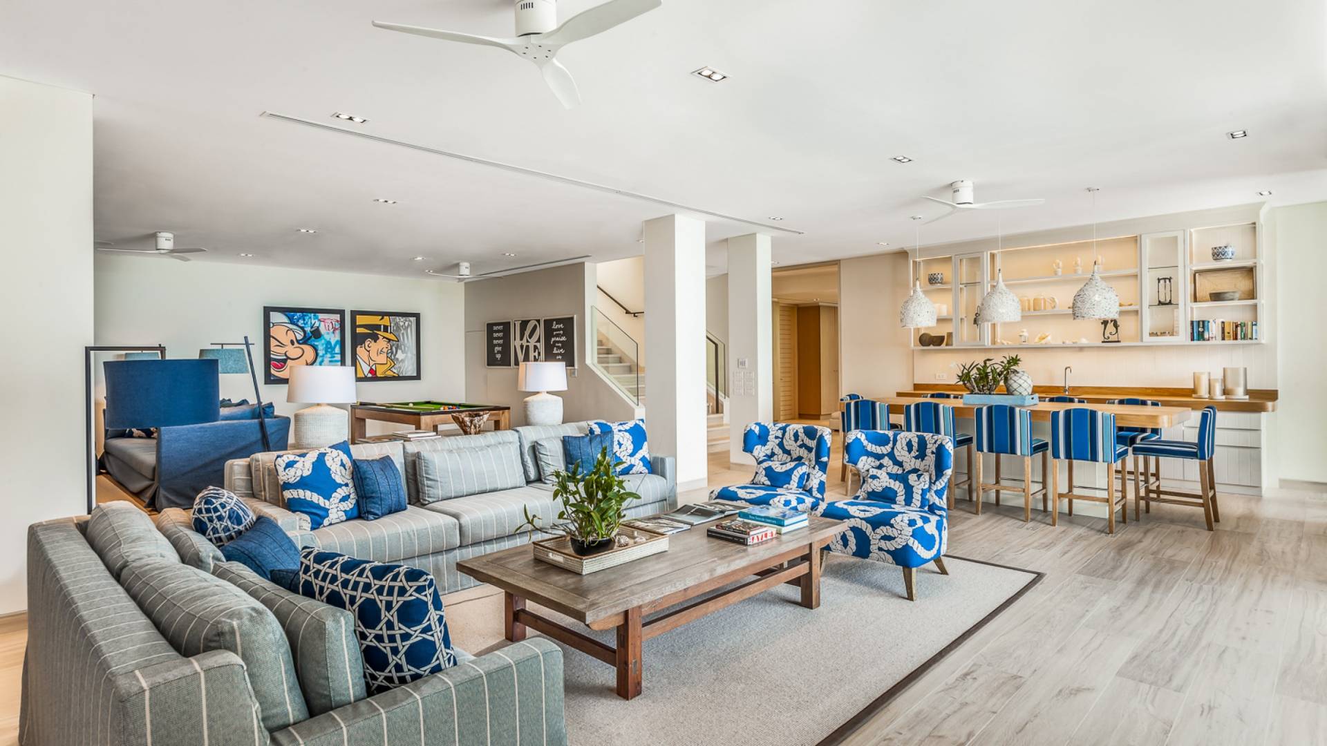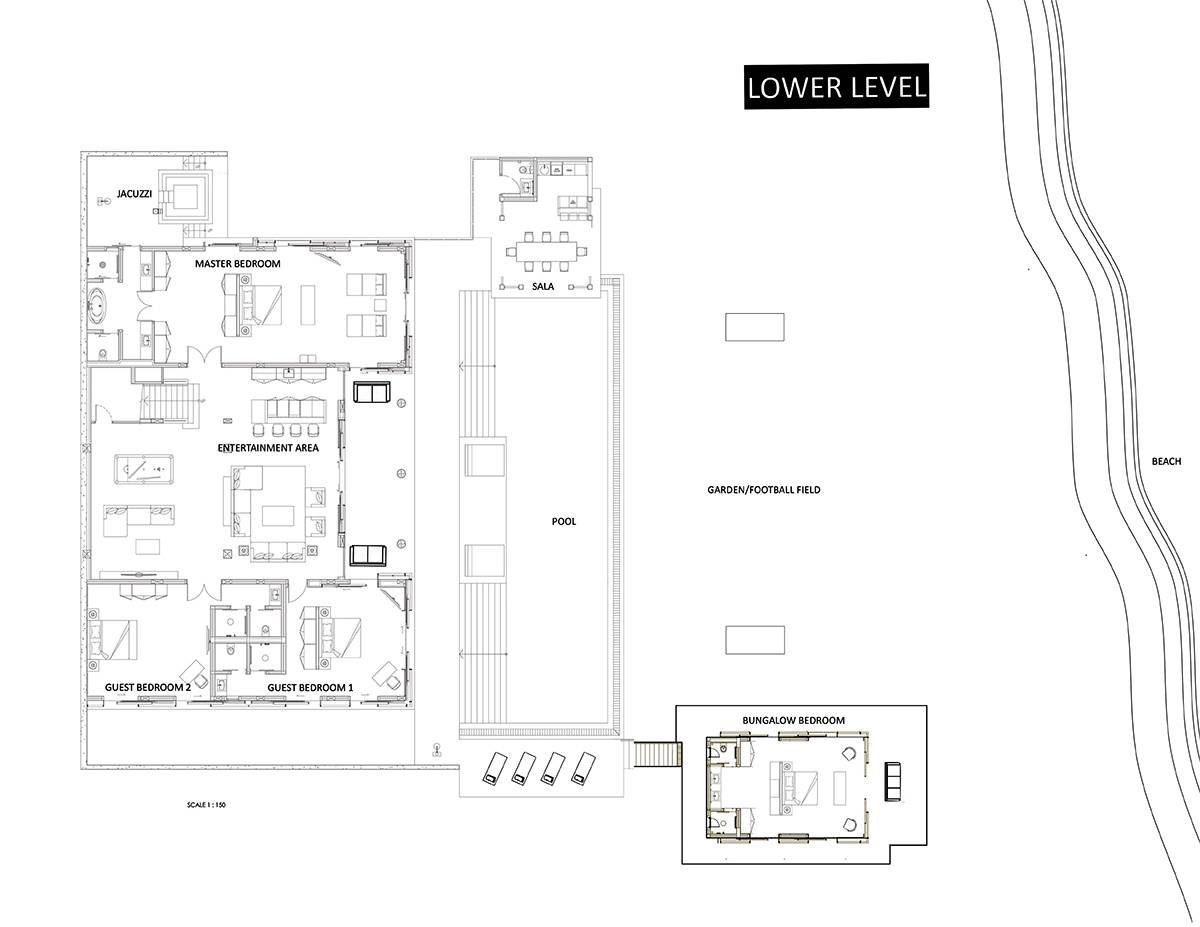 La villa tiene un total de 5 habitaciones, cada una con su propio baño privado. Una de las habitaciones está construida como un bungalow independiente a pocos metros de la casa principal y ofrece una vista aún más cercana de la bahía. Una piscina infinita de 25 m de largo se extiende por casi todo el ancho de la propiedad, y un jardín se extiende hasta el final de la propiedad con la playa. La villa también cuenta con un comedor y sala al aire libre, un bar junto a la piscina, un jacuzzi, una red de fútbol, kayaks y una sala de entretenimiento con mesa de billar, Xbox, juegos de mesa y Apple TV.