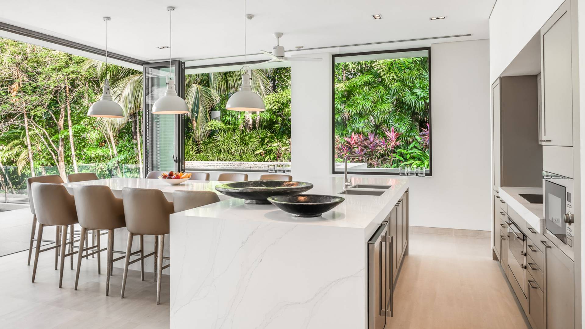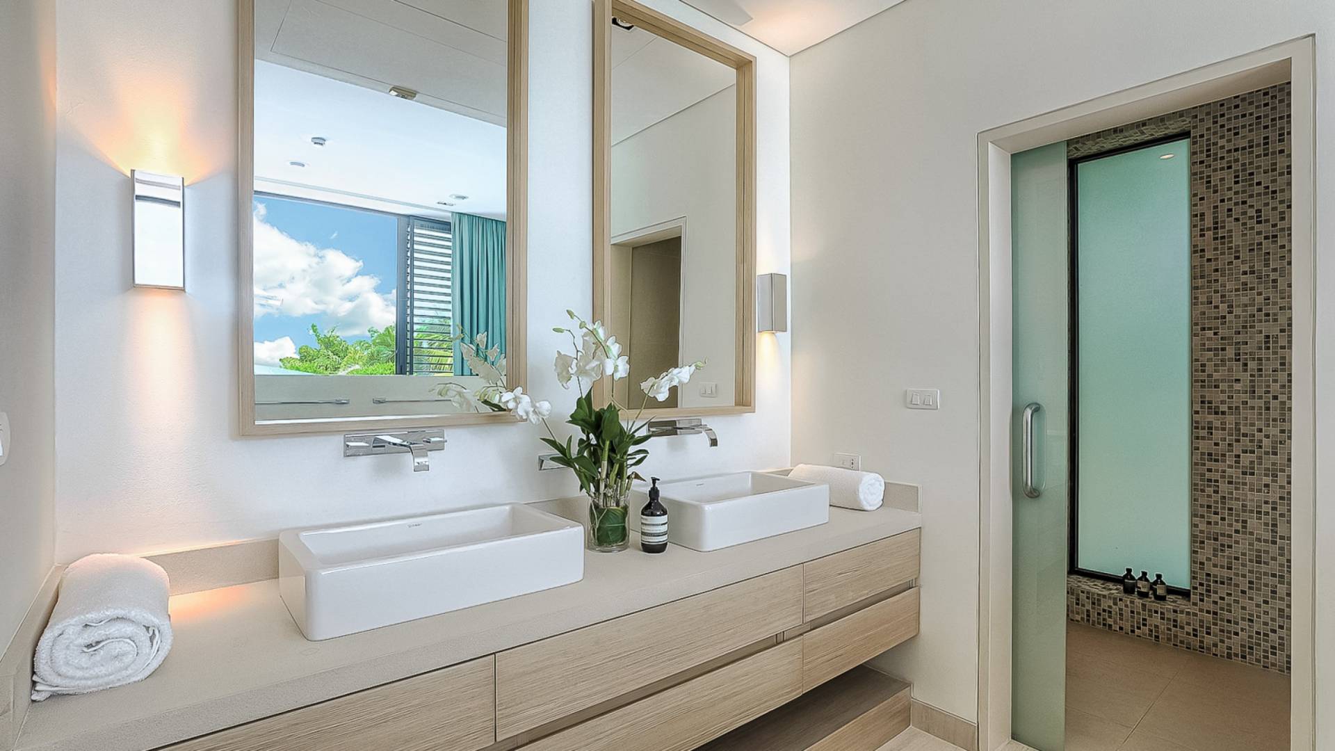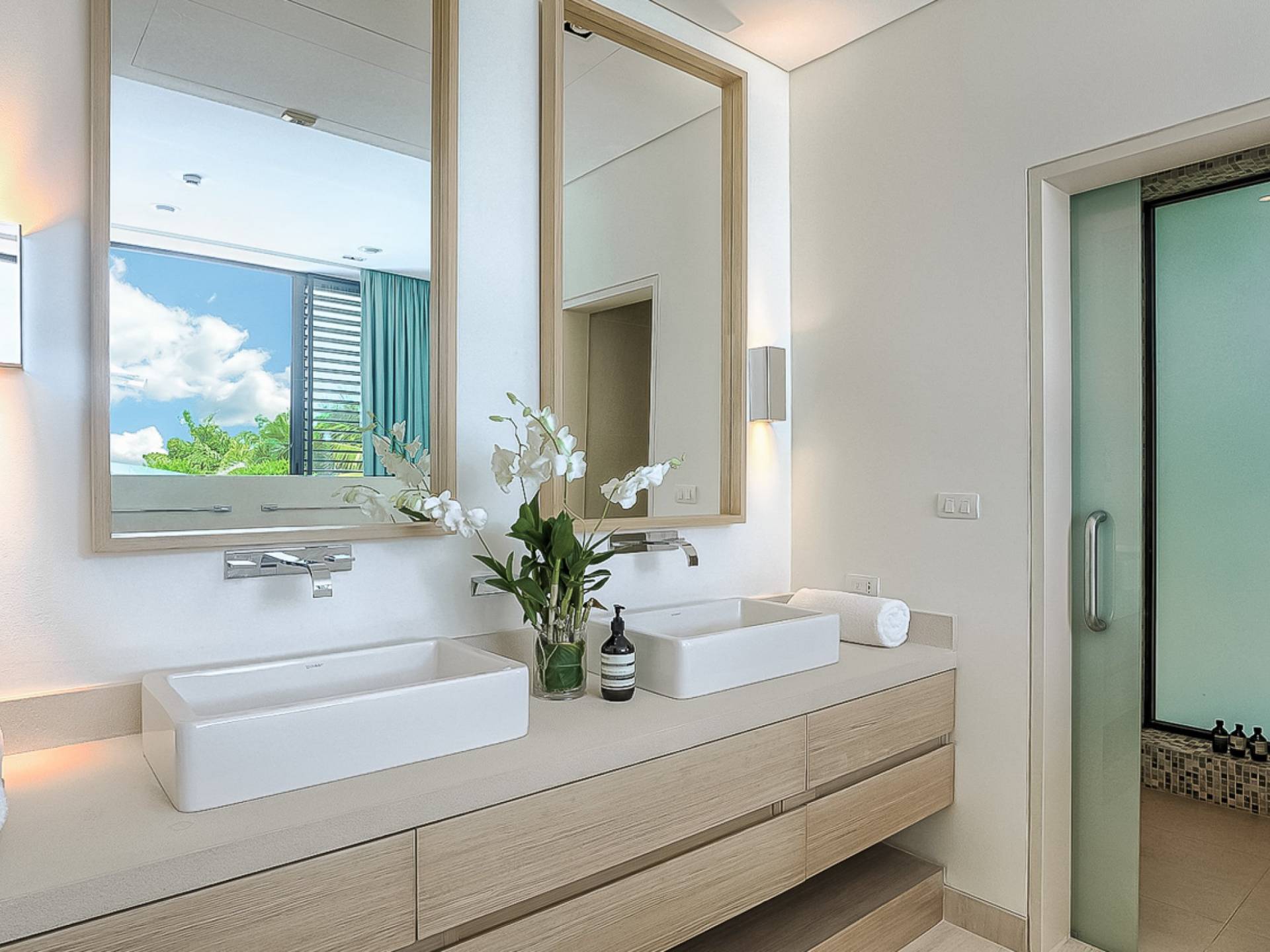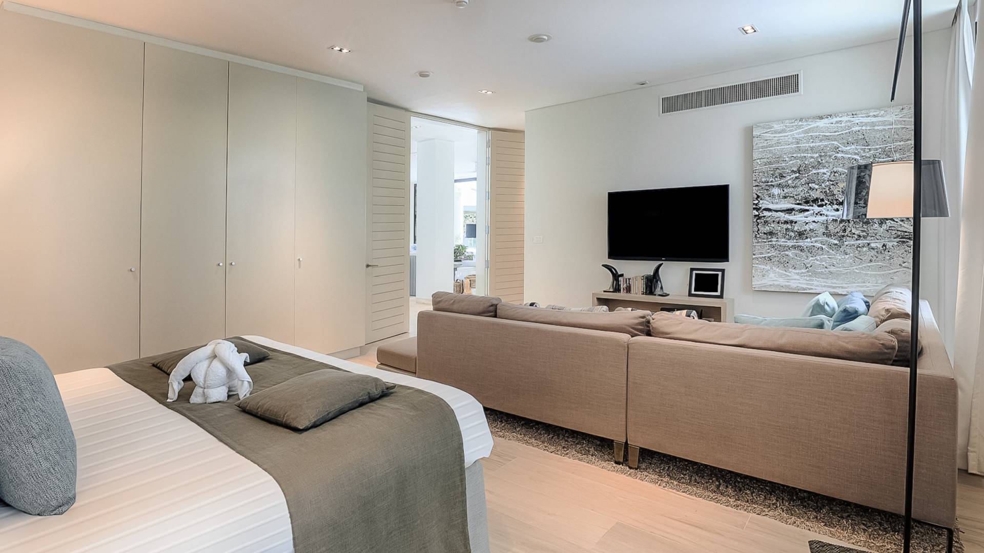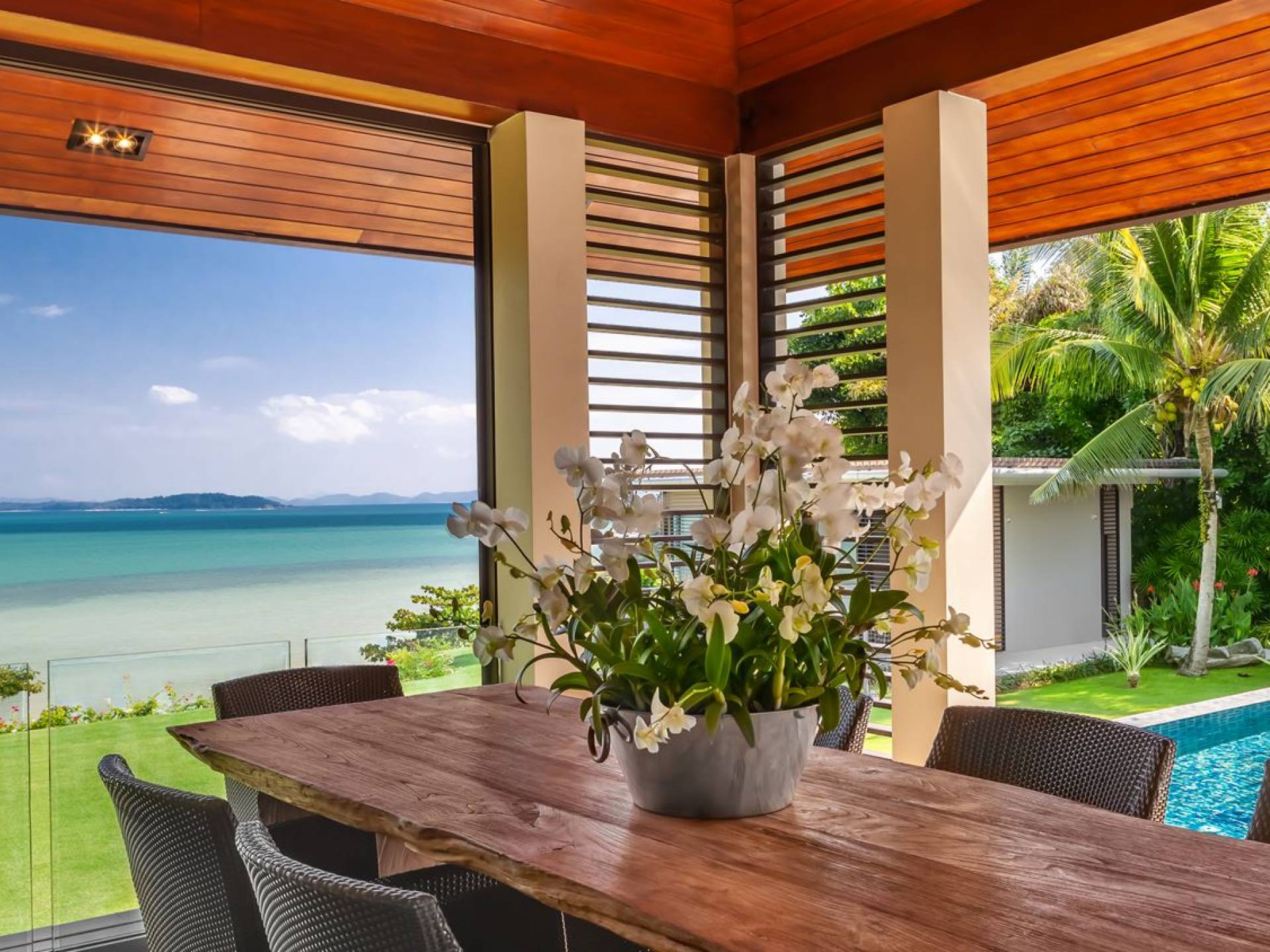 La villa tiene un total de 5 habitaciones, cada una con su propio baño privado. Una de las habitaciones está construida como un bungalow independiente a pocos metros de la casa principal y ofrece una vista aún más cercana de la bahía. Una piscina infinita de 25 m de largo se extiende por casi todo el ancho de la propiedad, y un jardín se extiende hasta el final de la propiedad con la playa. La villa también cuenta con un comedor y sala al aire libre, un bar junto a la piscina, un jacuzzi, una red de fútbol, kayaks y una sala de entretenimiento con mesa de billar, Xbox, juegos de mesa y Apple TV.
