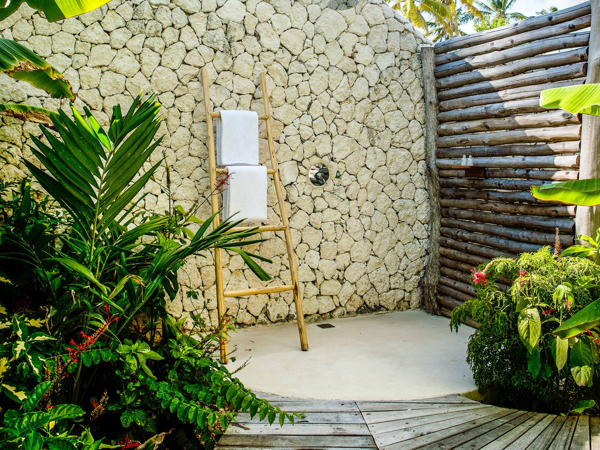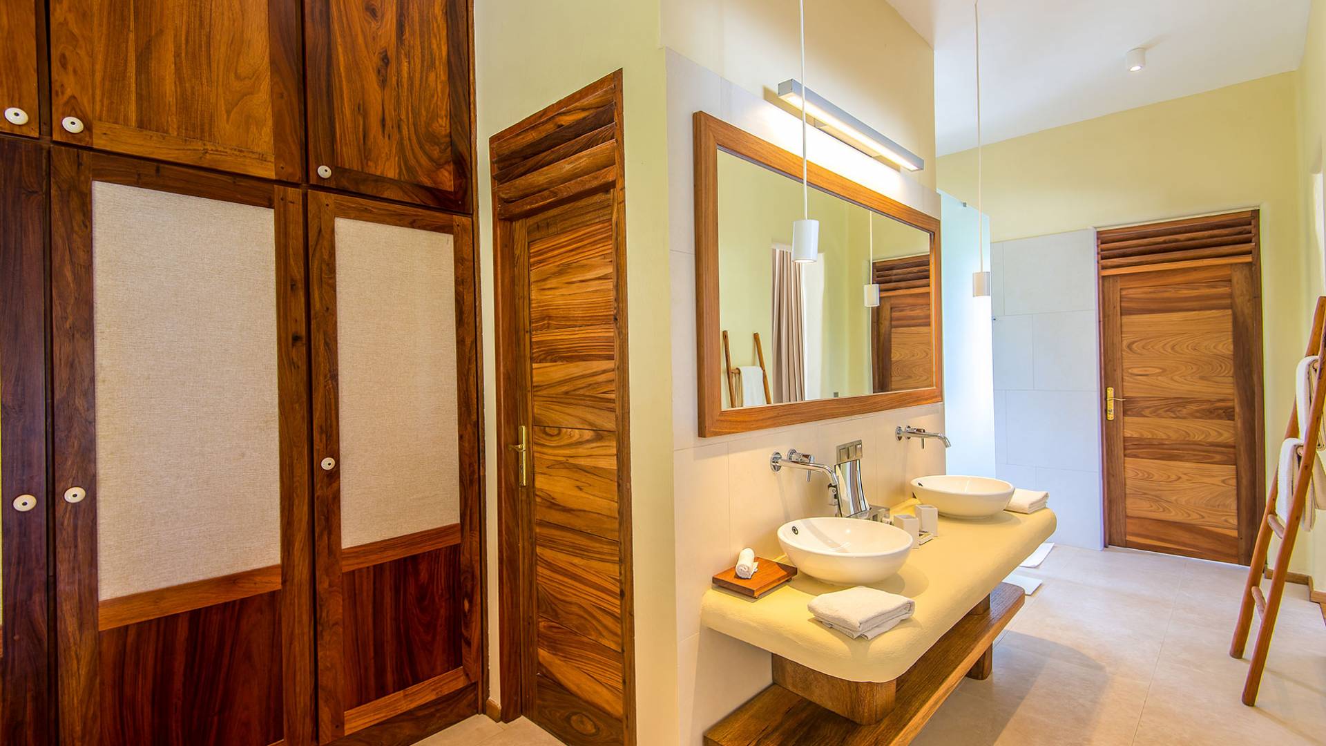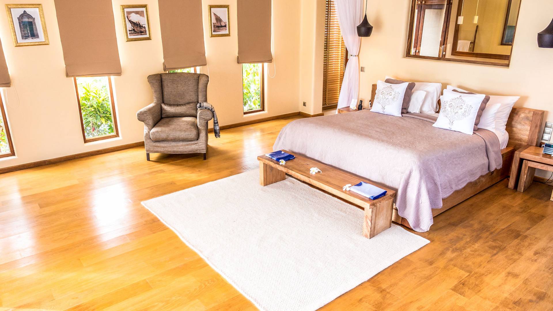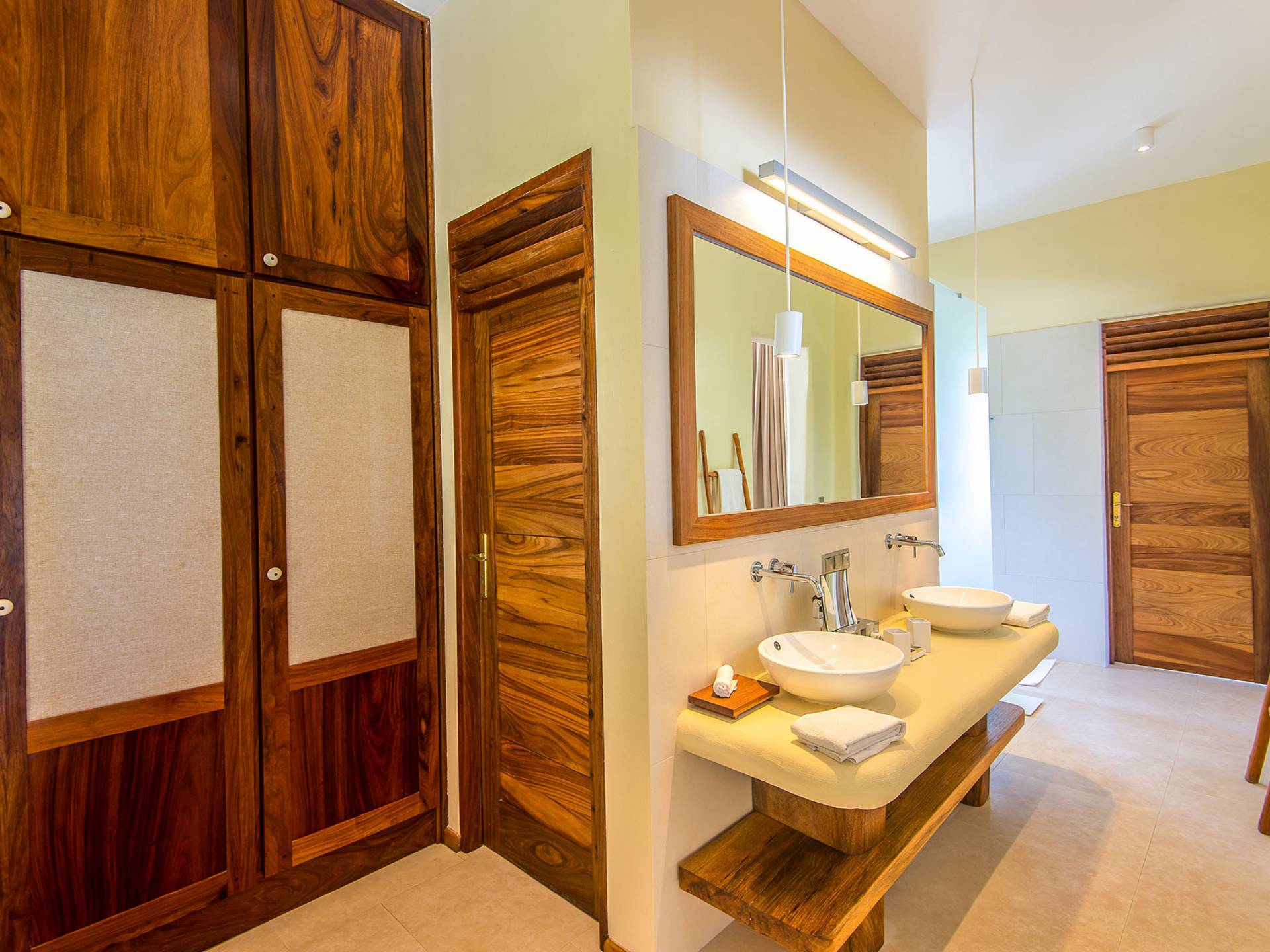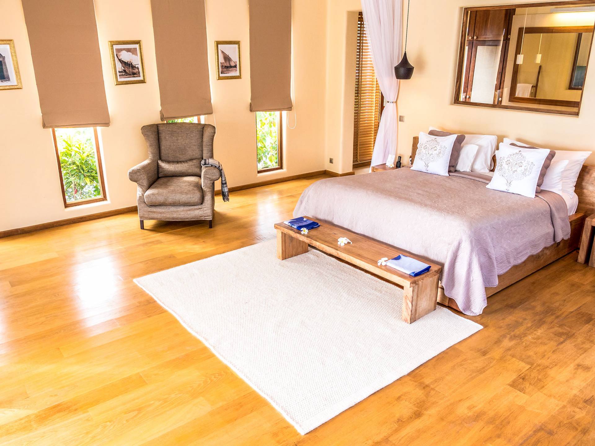 La villa frente a la playa está diseñada como dos edificios conectados por un camino de madera y una terraza. Un edificio es el dormitorio en suite de 55 m2 con cama king-size (que se puede convertir en dos camas individuales a pedido antes de la llegada), un baño con ducha de lluvia interior, dos lavabos, armario y baños separados. A una terraza en la azotea con una vista impresionante de la playa se accede por una escalera externa desde la unidad de dormitorio.