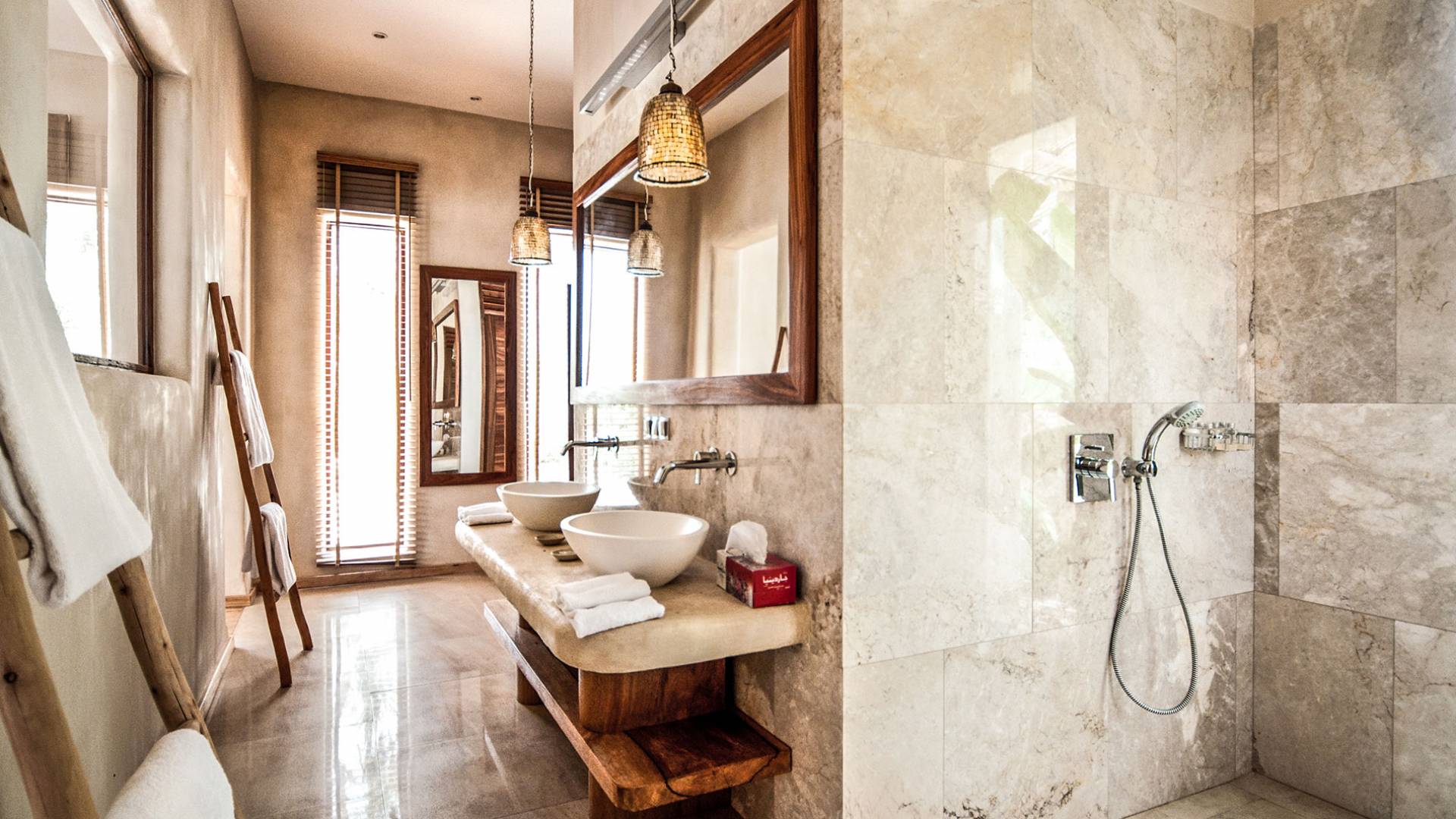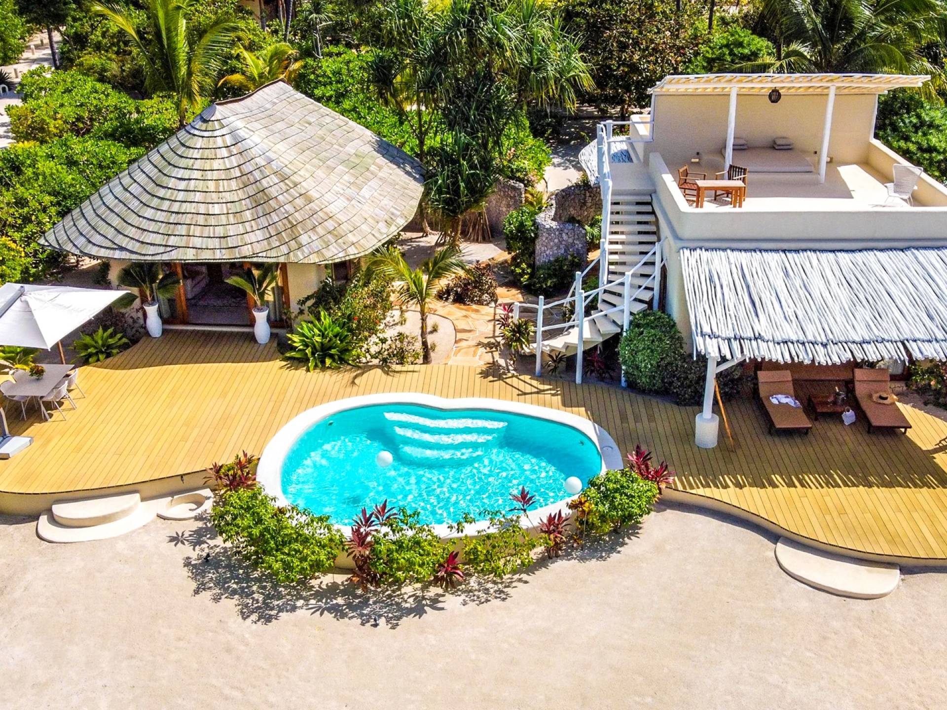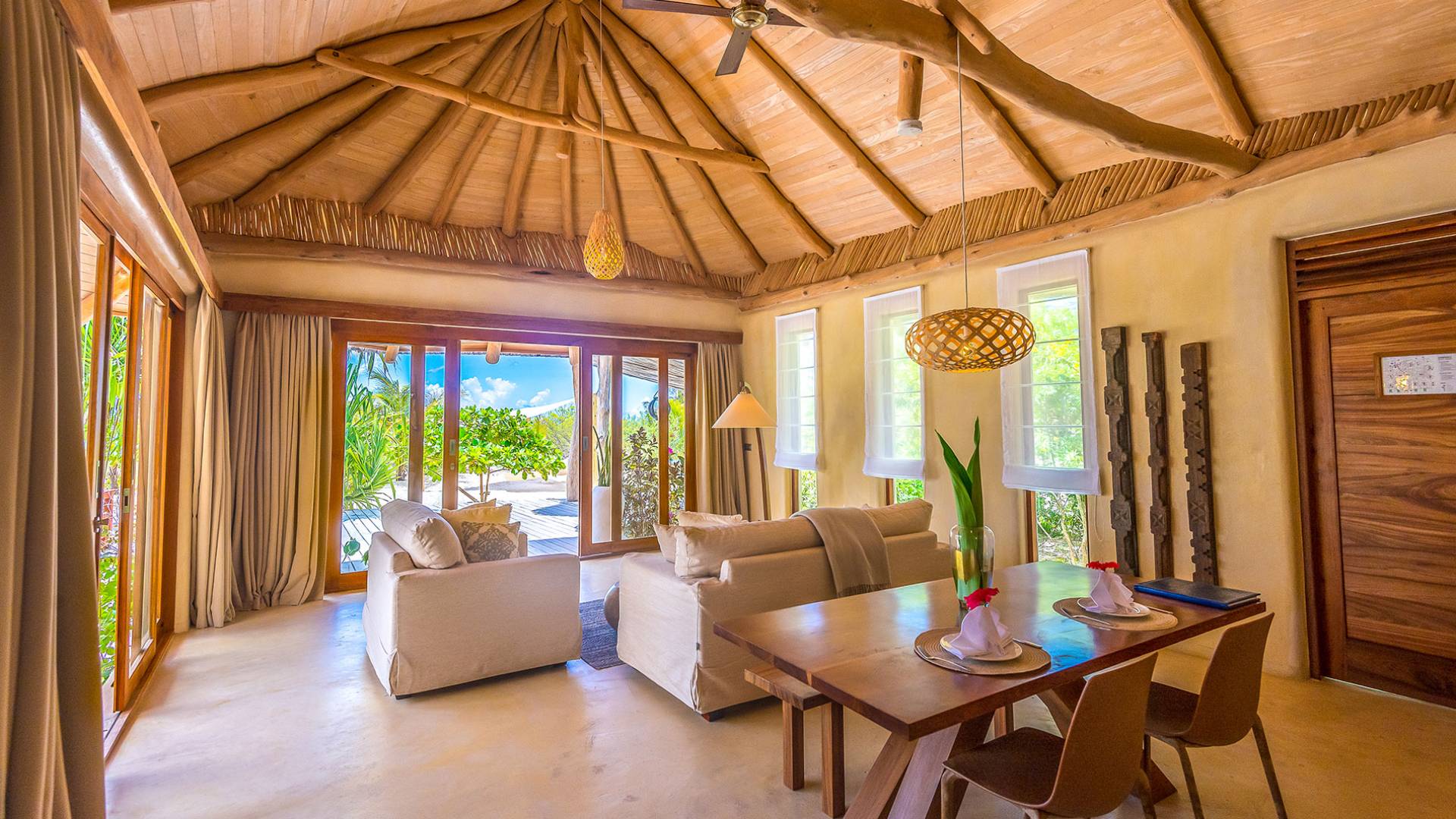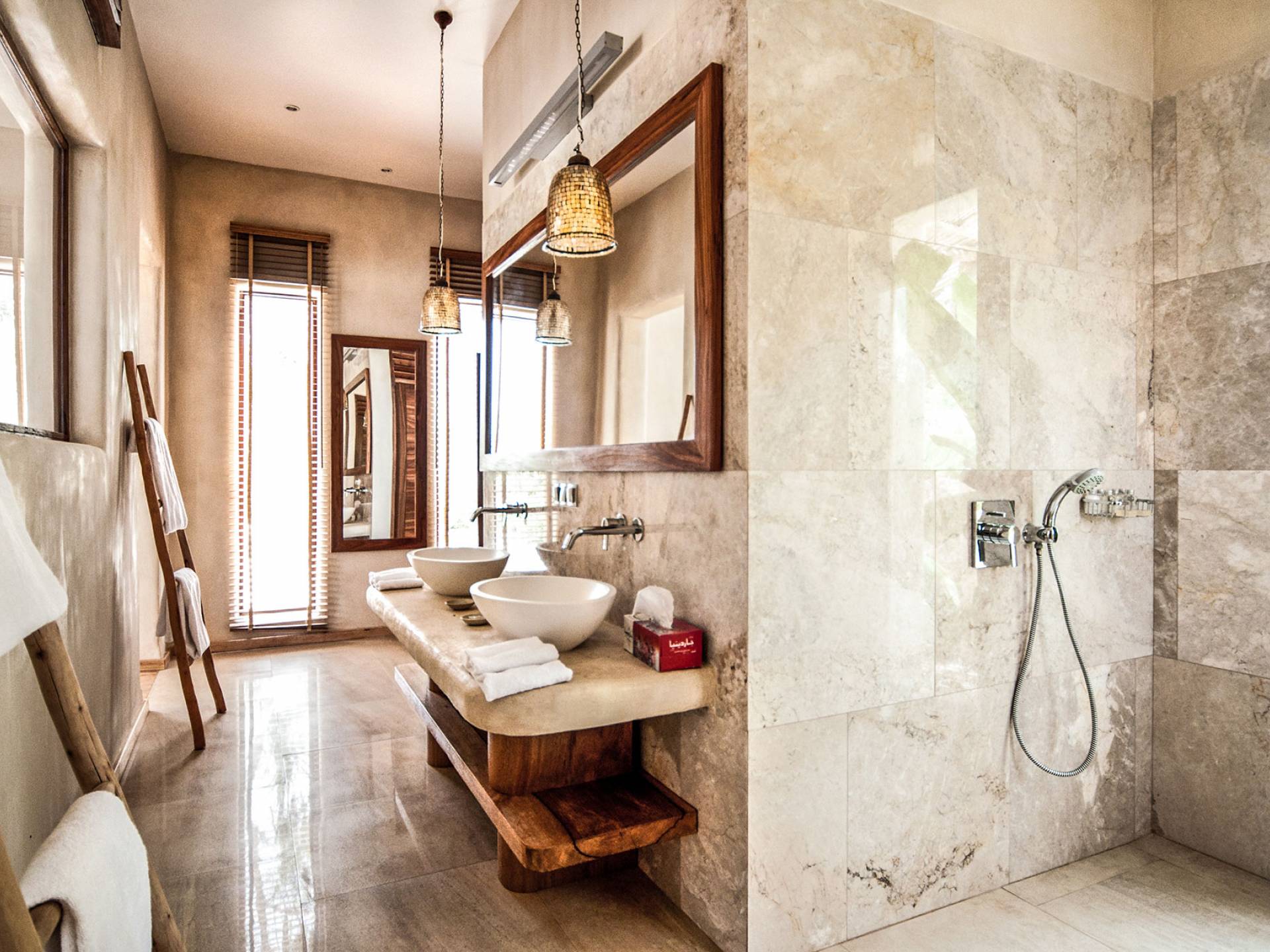 La villa frente a la playa está diseñada como dos edificios conectados por un camino de madera y una terraza. Un edificio es el dormitorio en suite de 55 m2 con cama king-size (que se puede convertir en dos camas individuales a pedido antes de la llegada), un baño con ducha de lluvia interior, dos lavabos, armario y baños separados. A una terraza en la azotea con una vista impresionante de la playa se accede por una escalera externa desde la unidad de dormitorio.