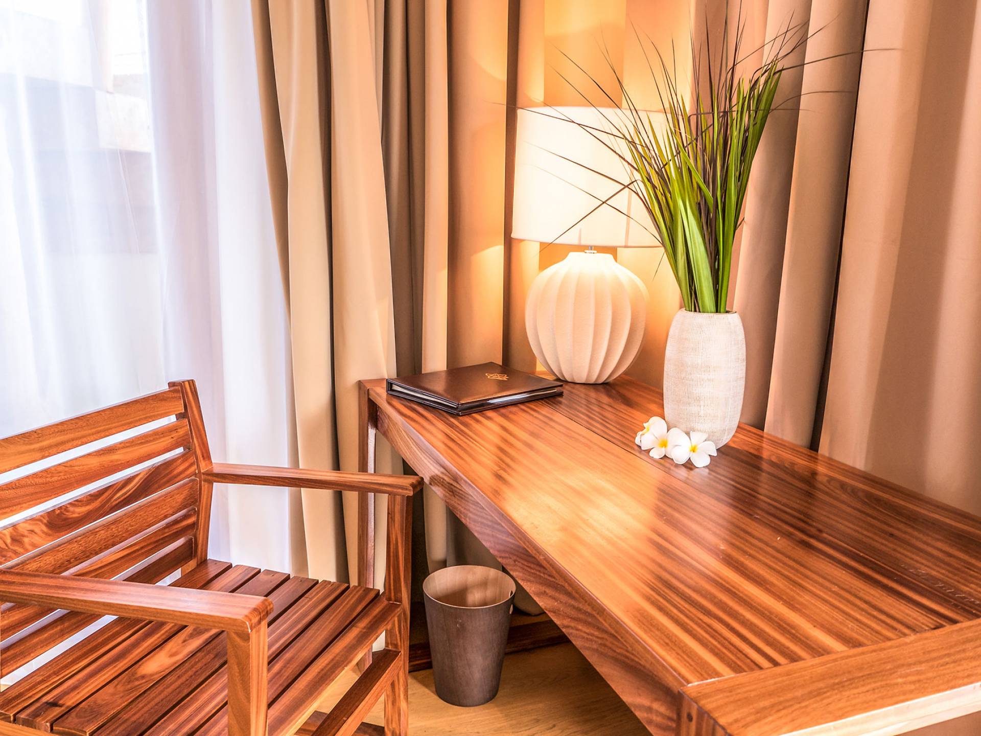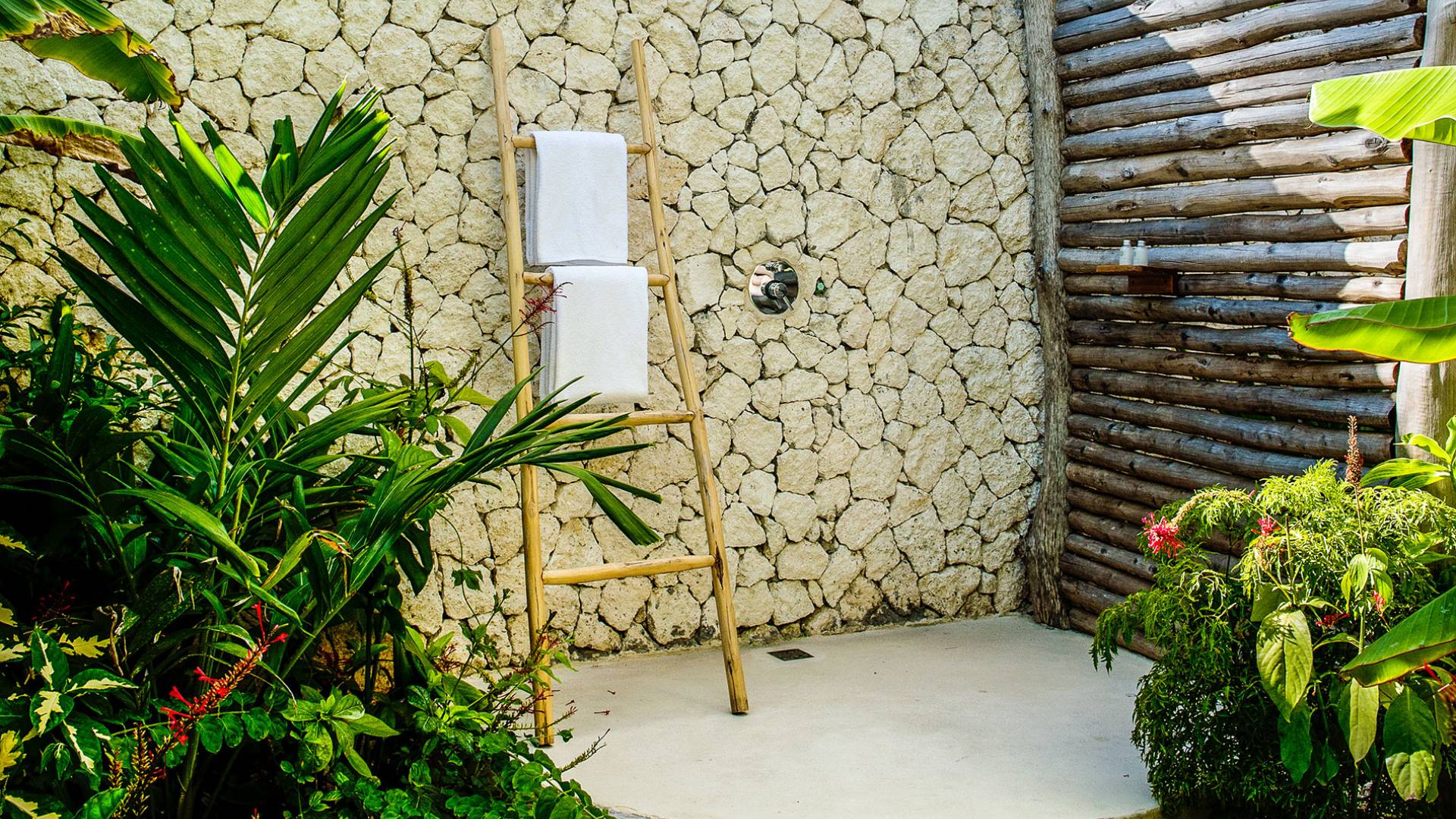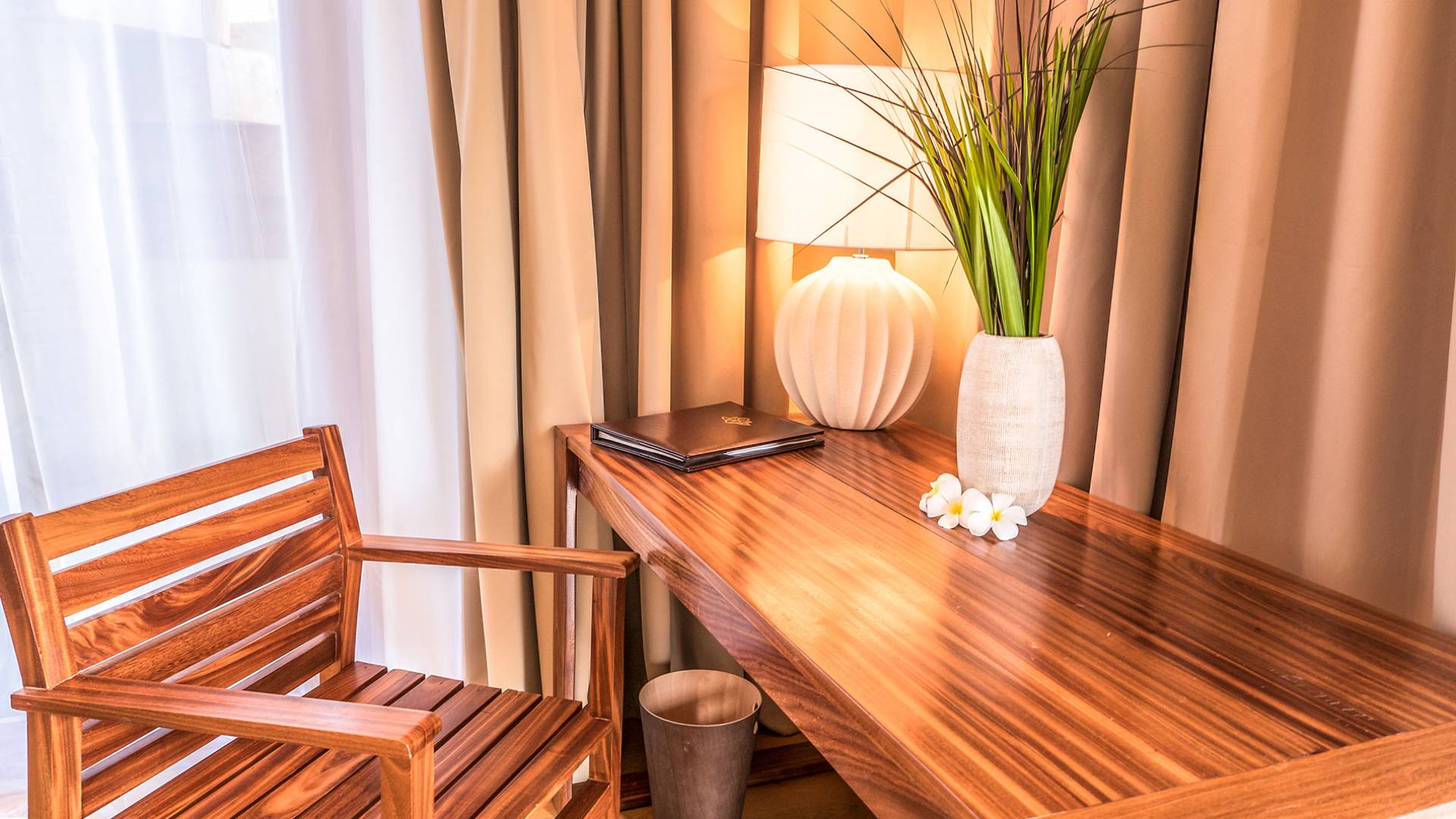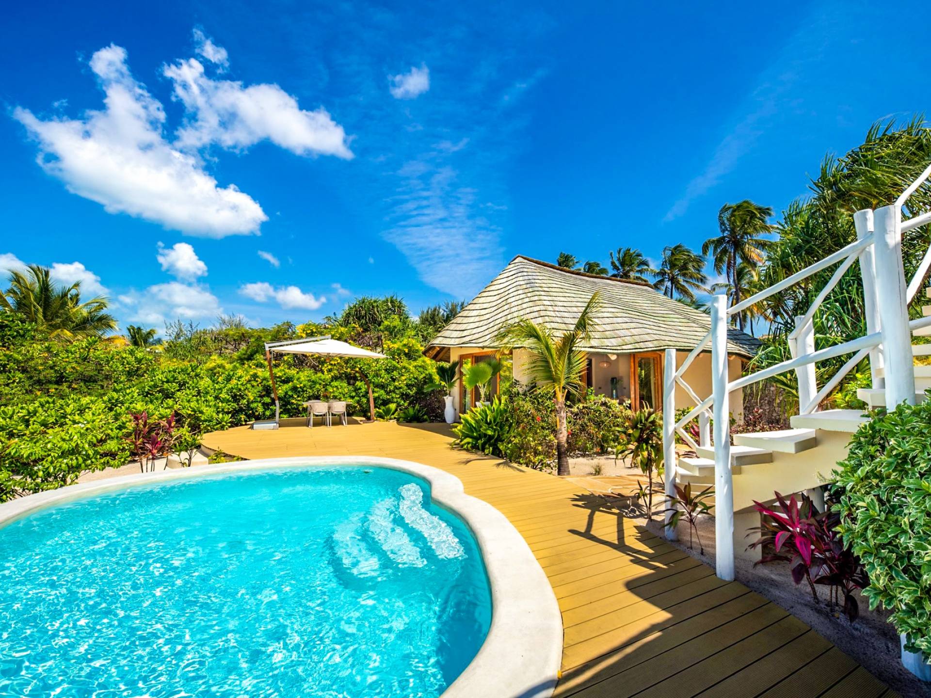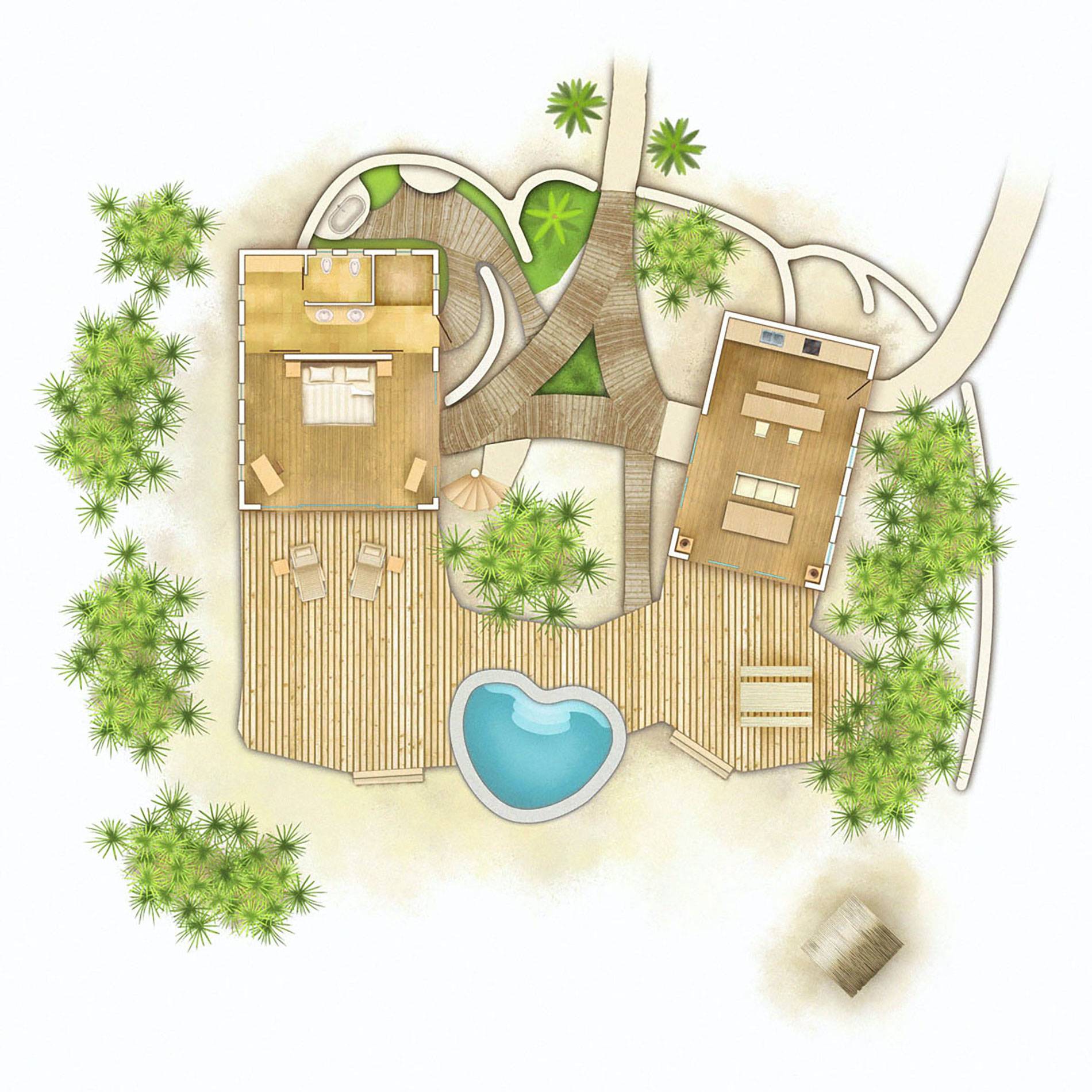 La villa frente a la playa está diseñada como dos edificios conectados por un camino de madera y una terraza. Un edificio es el dormitorio en suite de 55 m2 con cama king-size (que se puede convertir en dos camas individuales a pedido antes de la llegada), un baño con ducha de lluvia interior, dos lavabos, armario y baños separados. A una terraza en la azotea con una vista impresionante de la playa se accede por una escalera externa desde la unidad de dormitorio.
