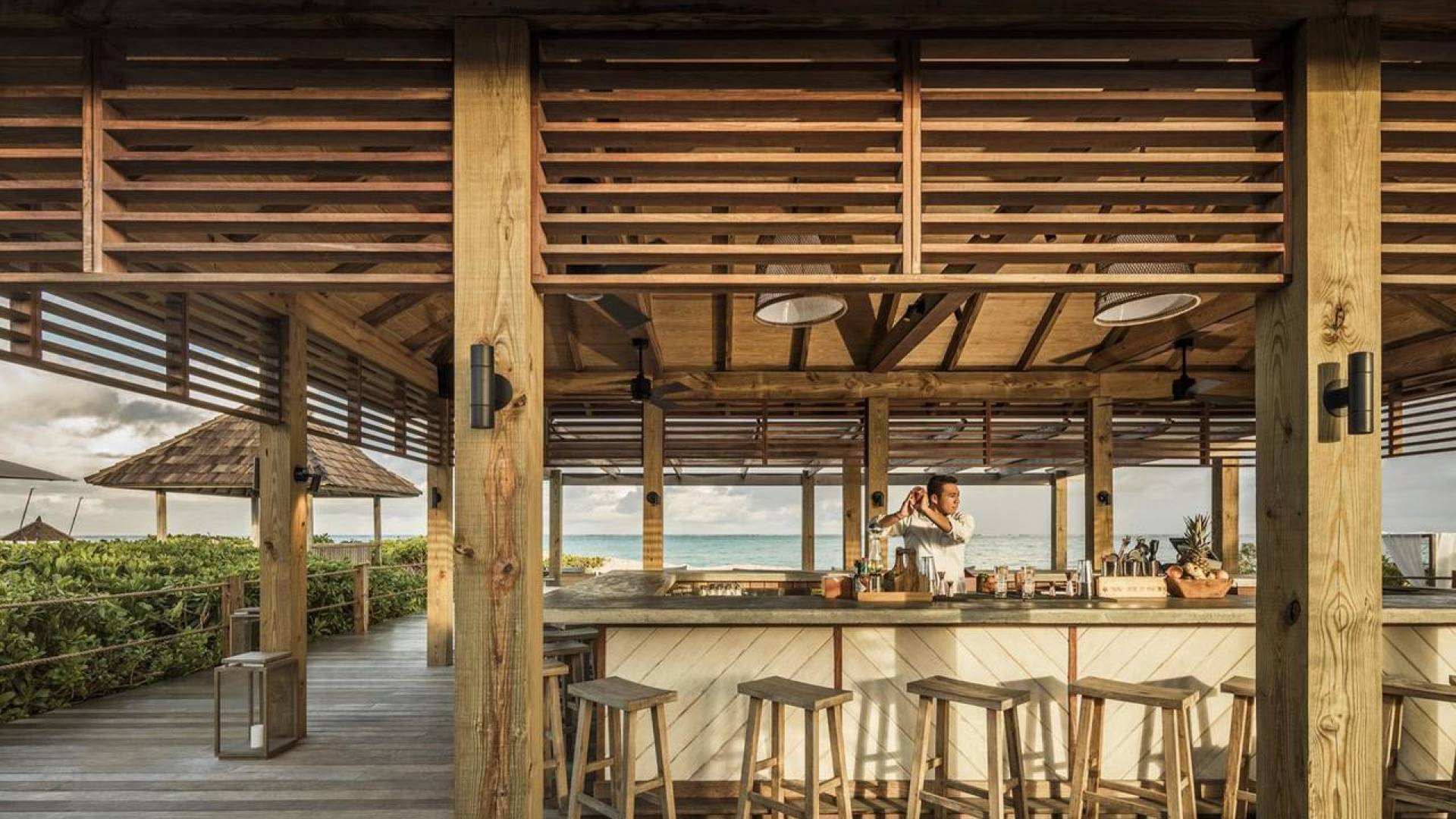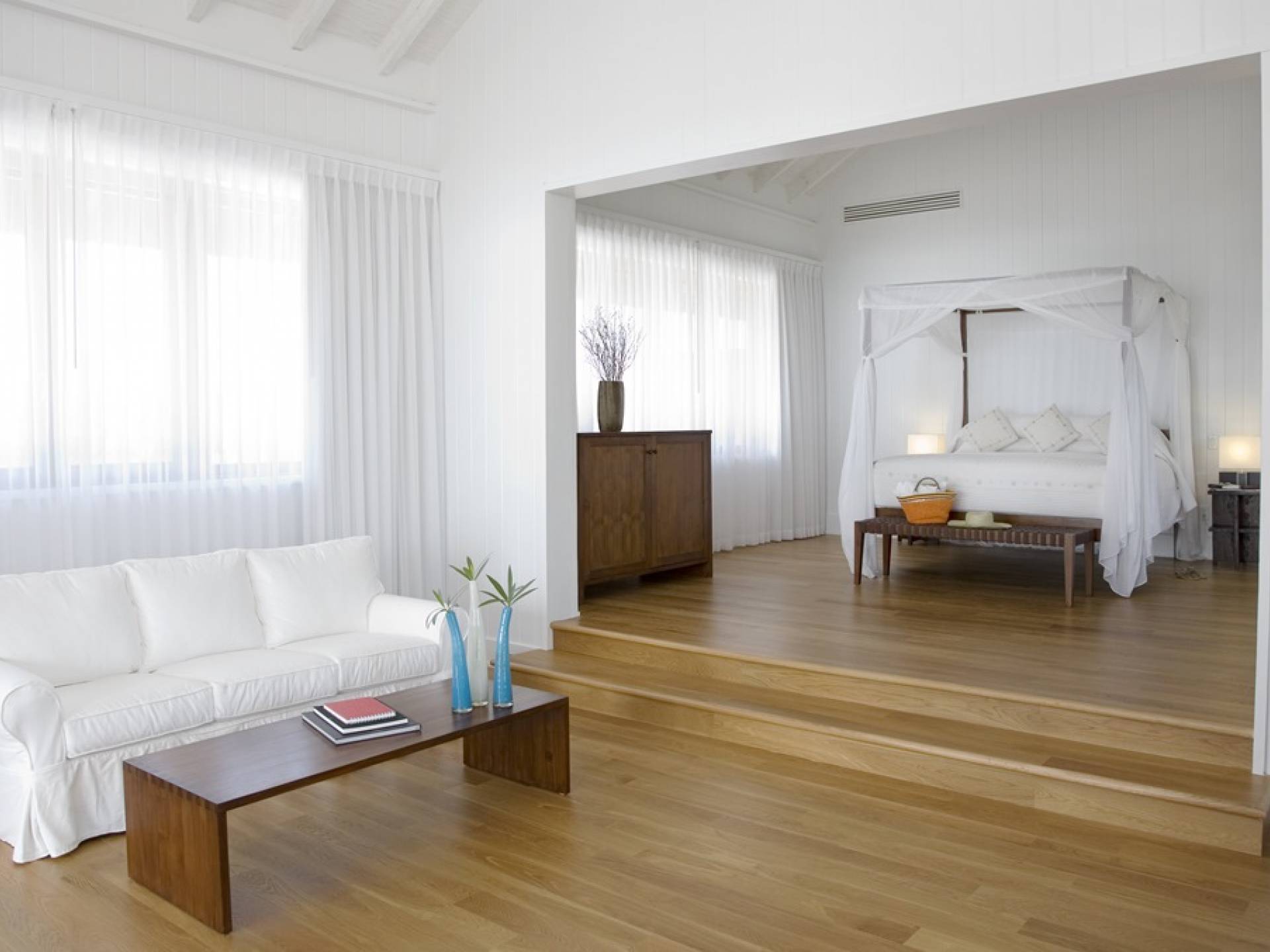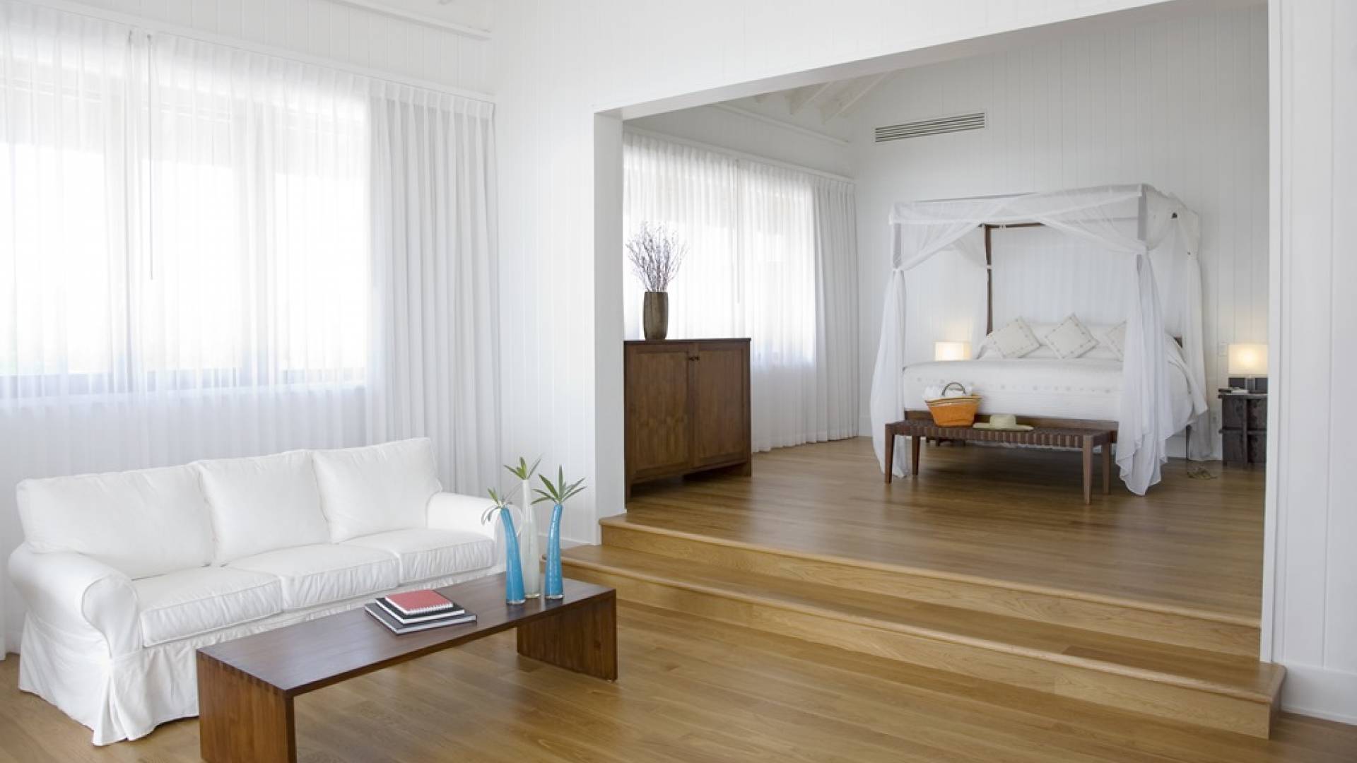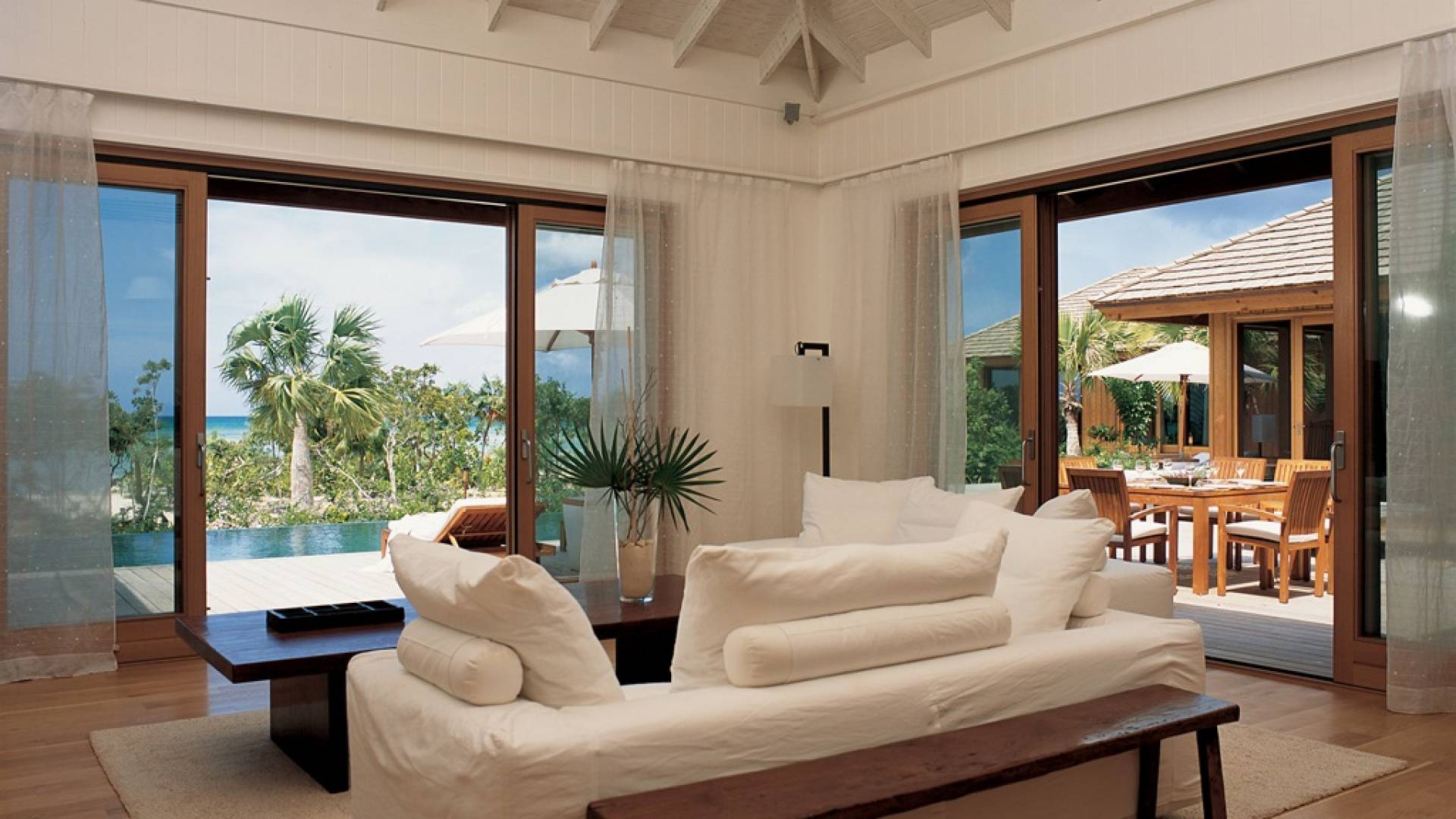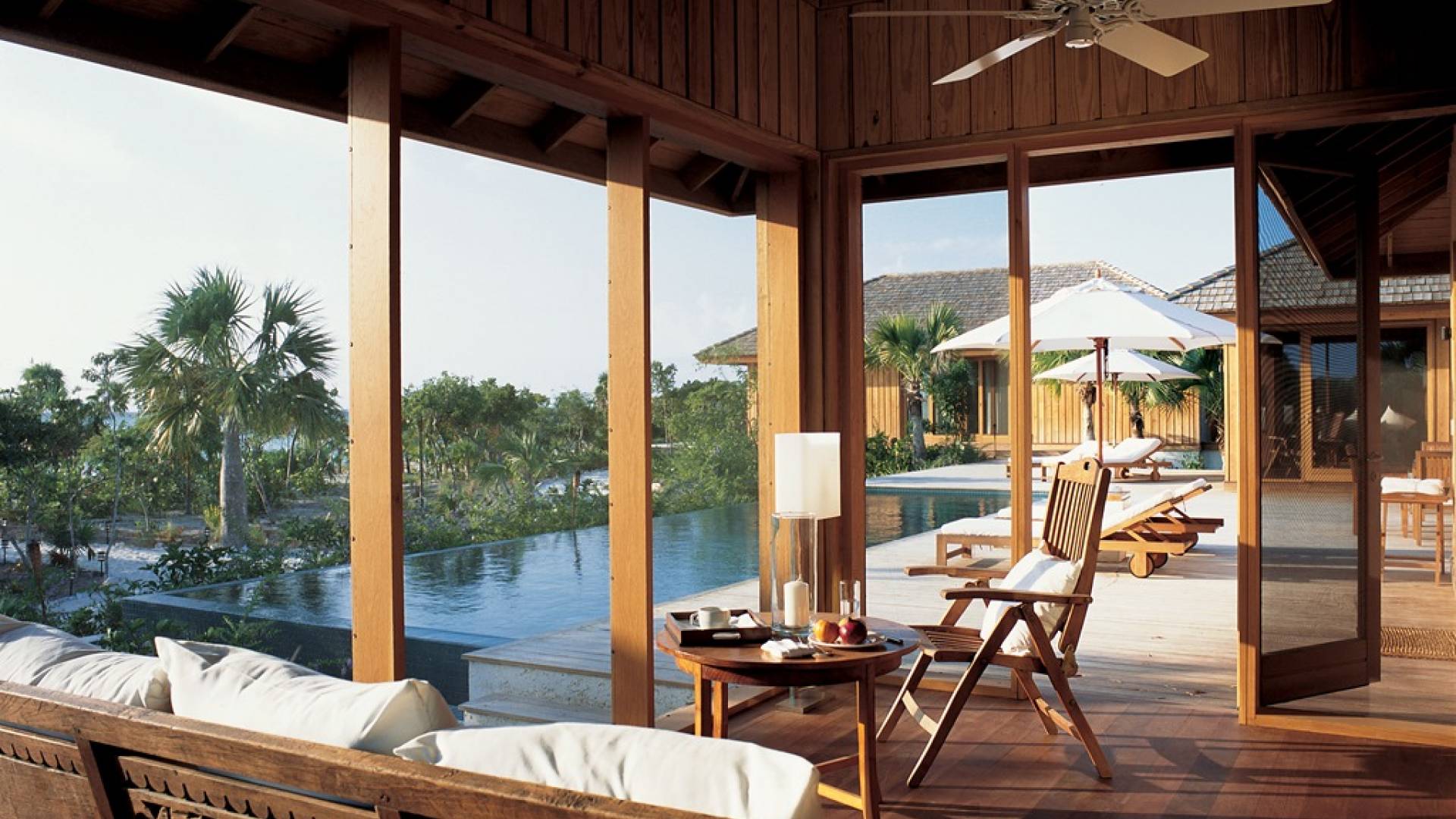 En el interior, el estilo ha sido fuertemente influenciado por los viajes de Brinkley en Asia: los interiores encalados tienen acabados de teca y roble, y una extensa colección de adornos y piezas de arte de madera tradicionales decoran el espacio. Cada habitación tiene una terraza privada con mosquitero con vista al mar, así como sus propias duchas interiores y exteriores. Un pabellón principal independiente está a pasos de la playa y cuenta con un sofá cama oscilante, un lugar ideal desde el que ver la puesta de sol.