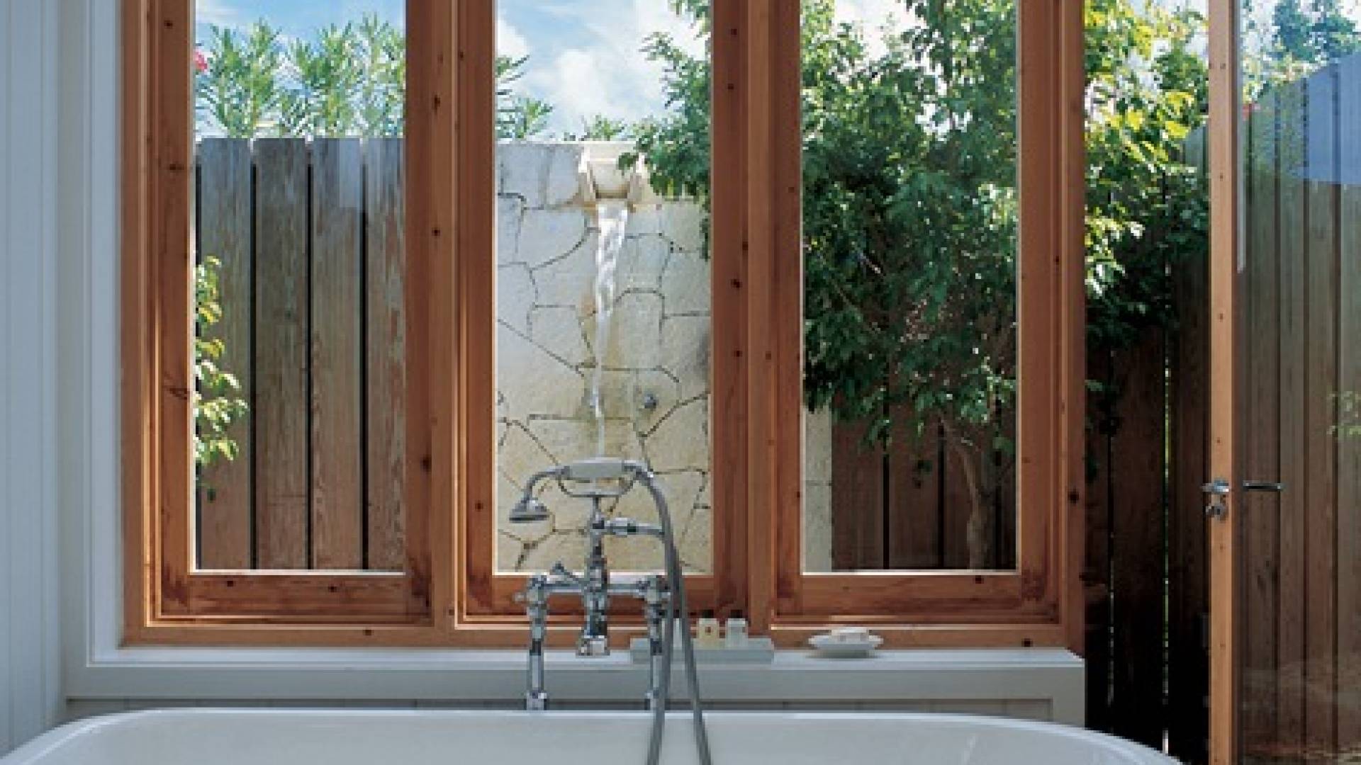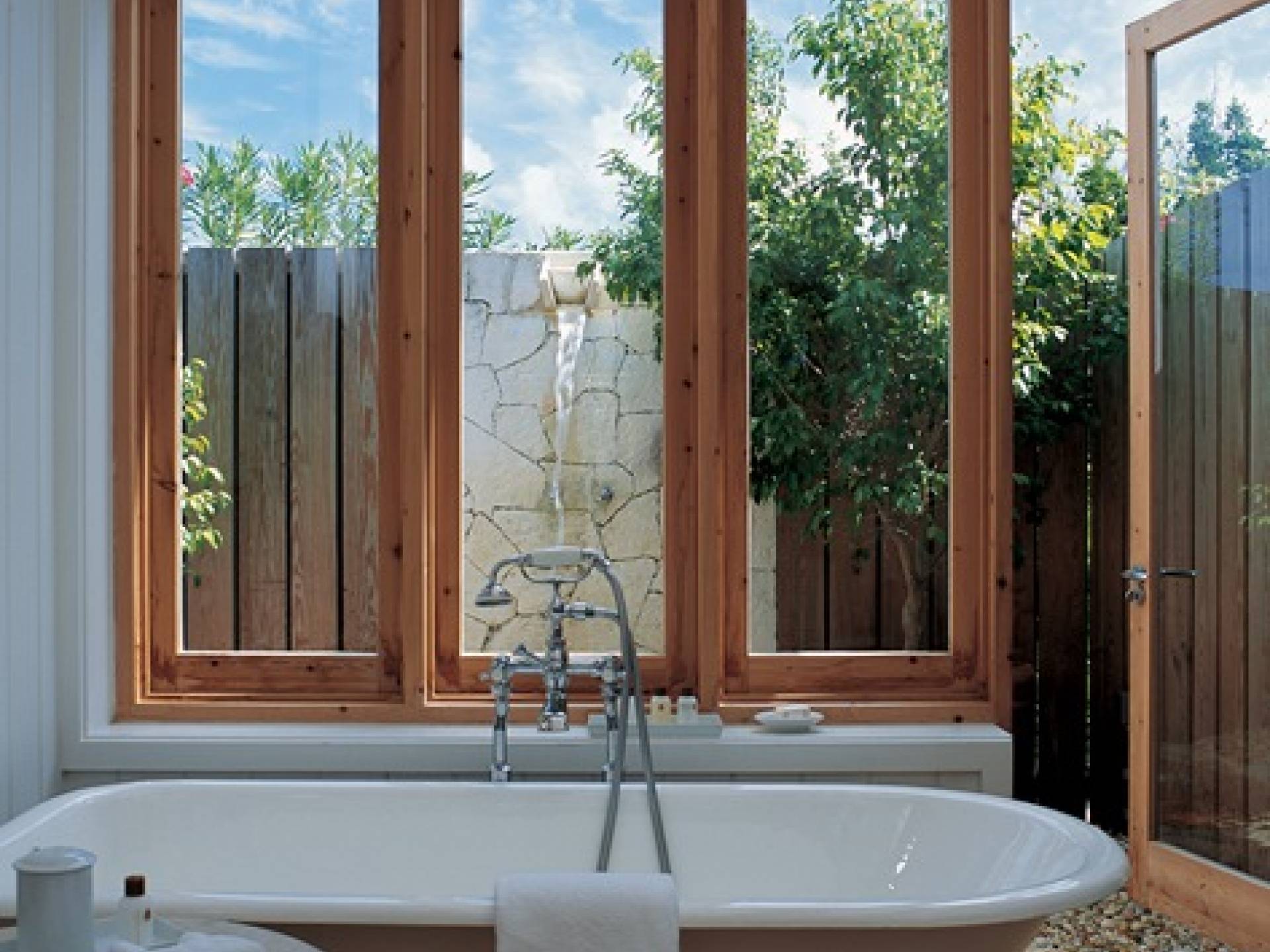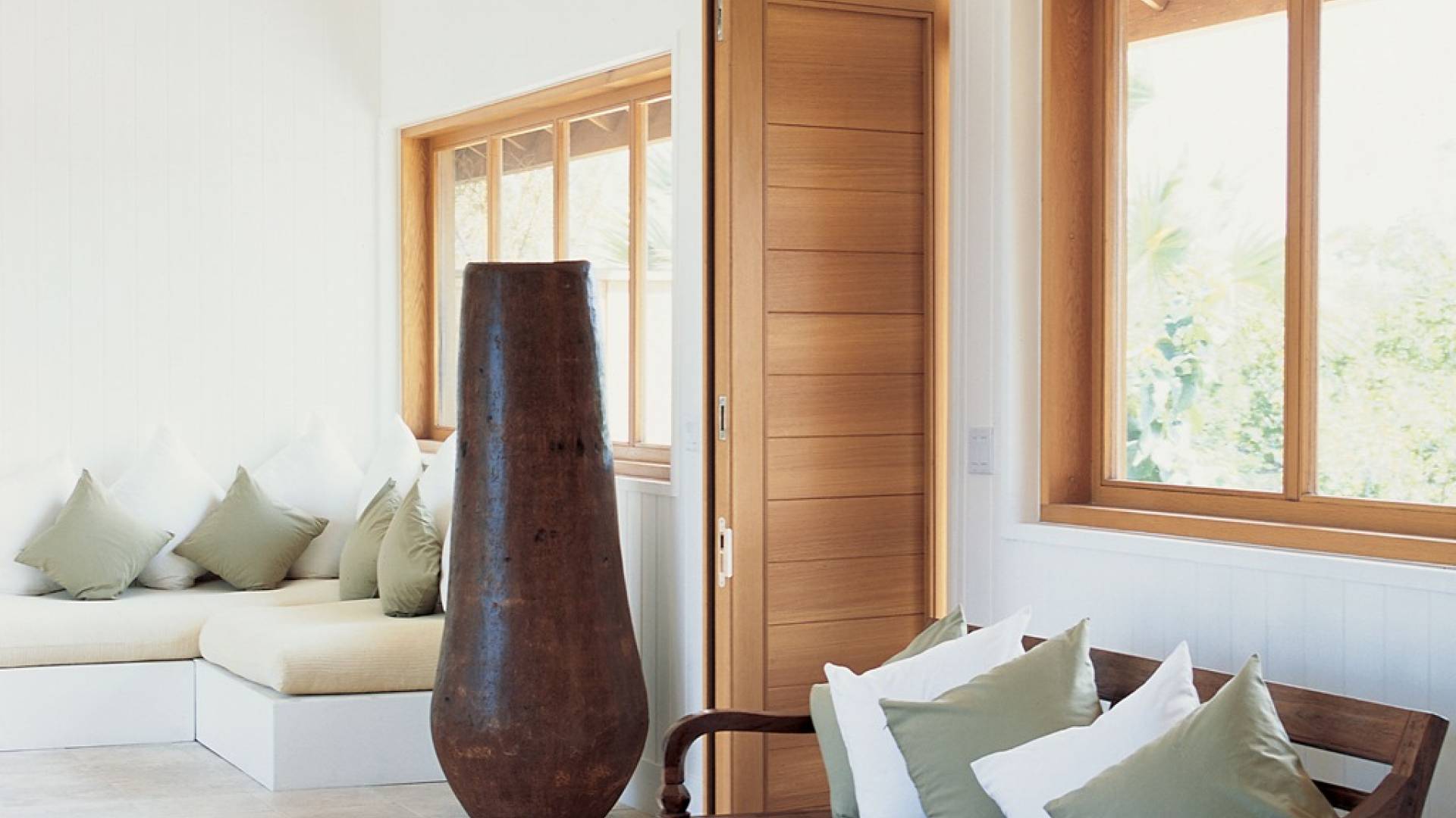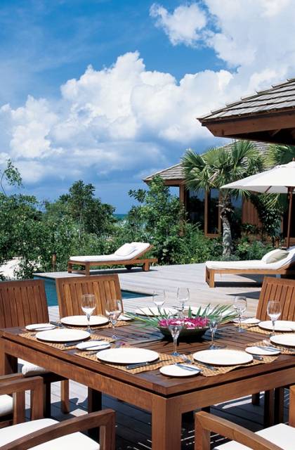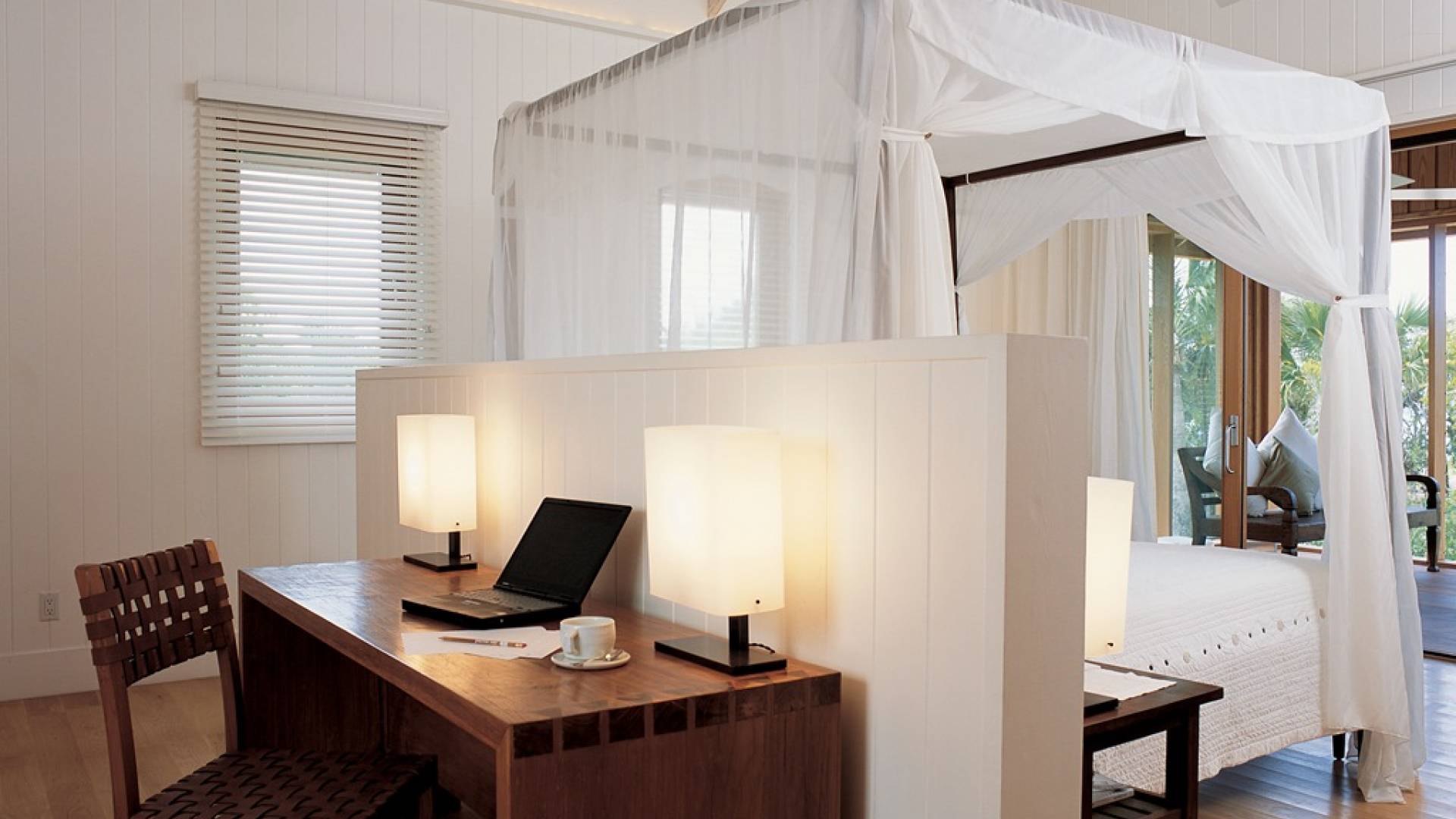 En el interior, el estilo ha sido fuertemente influenciado por los viajes de Brinkley en Asia: los interiores encalados tienen acabados de teca y roble, y una extensa colección de adornos y piezas de arte de madera tradicionales decoran el espacio. Cada habitación tiene una terraza privada con mosquitero con vista al mar, así como sus propias duchas interiores y exteriores. Un pabellón principal independiente está a pasos de la playa y cuenta con un sofá cama oscilante, un lugar ideal desde el que ver la puesta de sol.