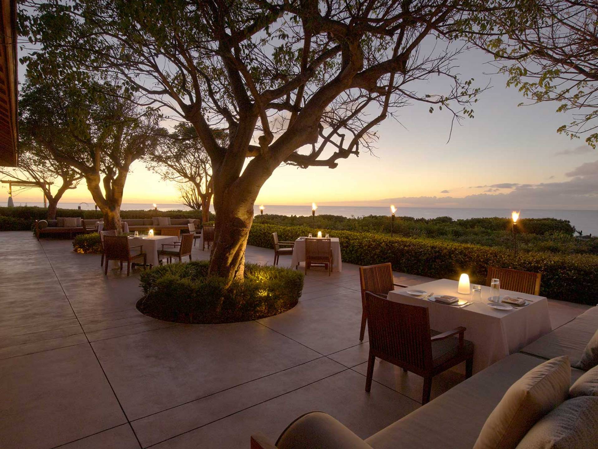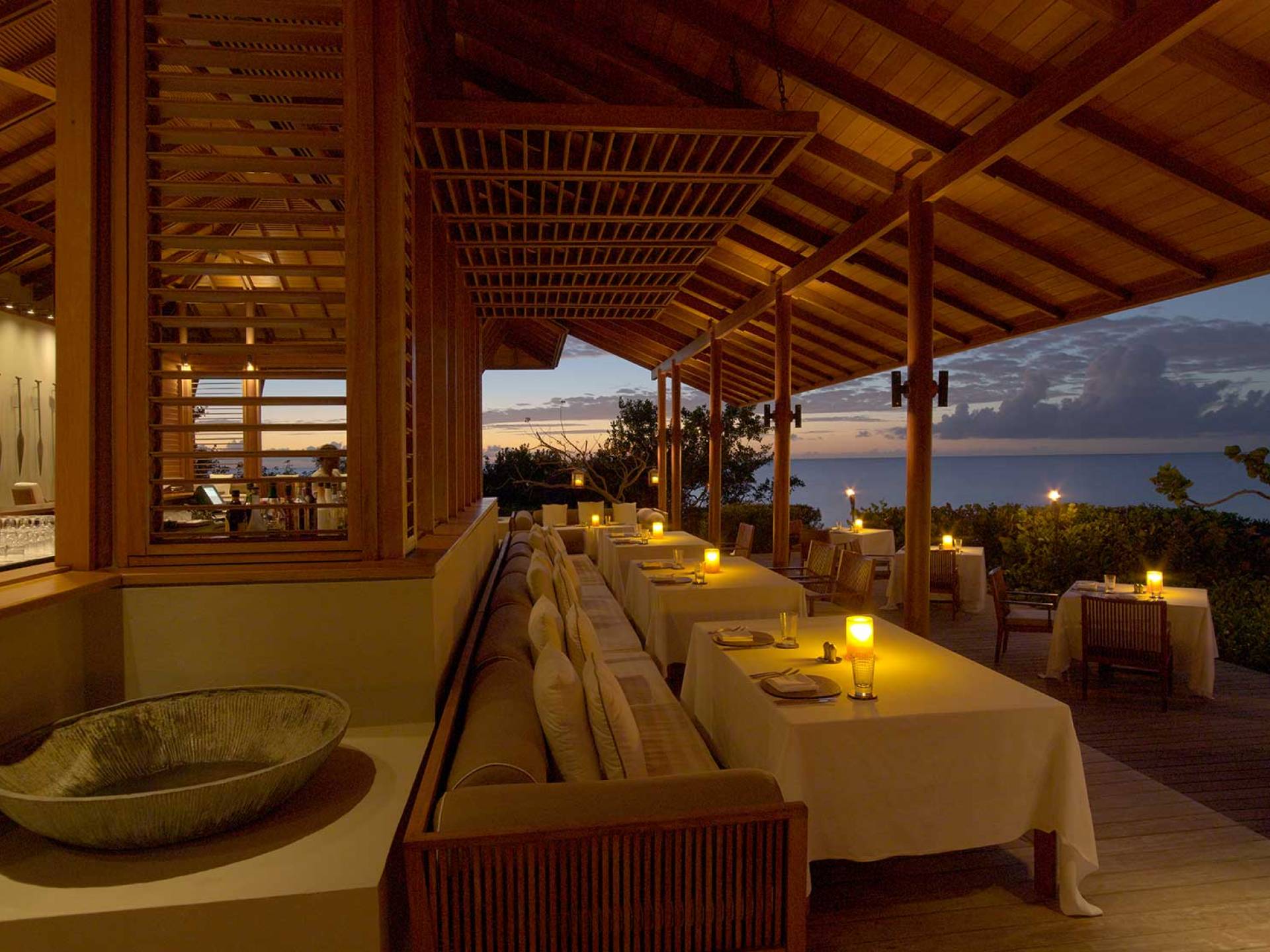 Comedor: en el restaurante, los huéspedes pueden cenar en el interior y con aire acondicionado o al aire libre en el estanque central. El marisco fresco, desde el pargo rojo hasta el atún y el mero, es el centro de atención, complementado con productos orgánicos del huerto acuapónico del complejo. El Beach Club sirve platos de comida cruda y cocina horneada en un horno de piedra.
