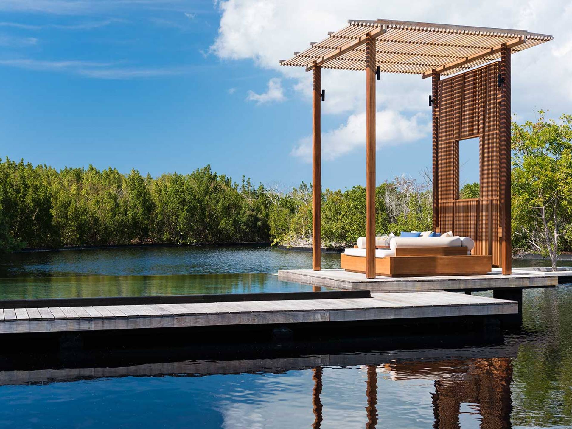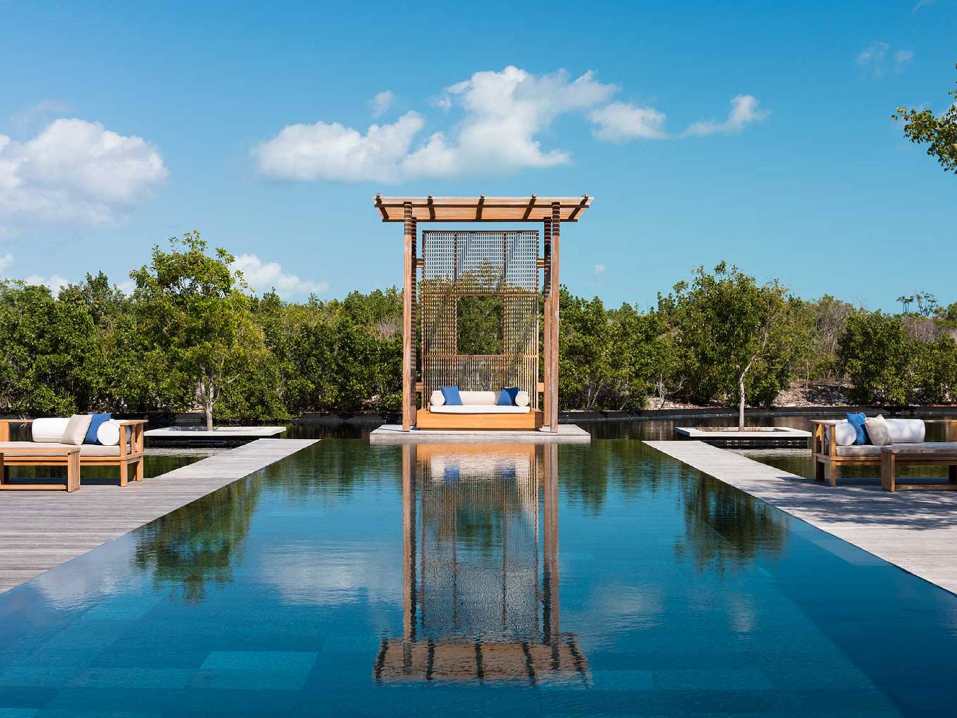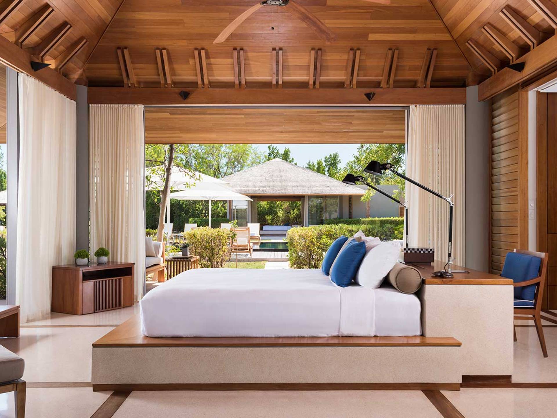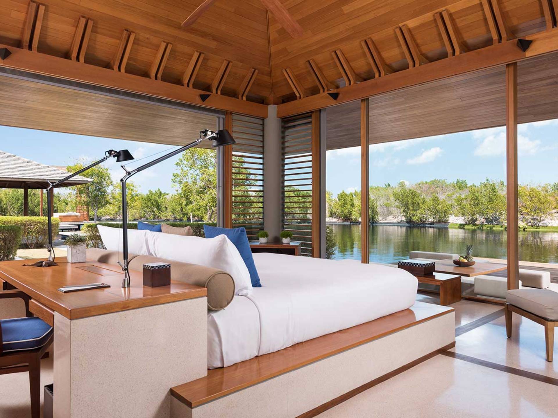 Con vistas a los estanques y jardines reflectantes, varios ofrecen vistas al mar, mientras que otros ofrecen acceso directo a la playa. Todos son atendidos por cocineros personales y amas de casa. Bienestar: ubicado alrededor de un estanque tranquilo, el spa de Amanyara incluye cuatro pabellones de tratamiento, un pabellón de relajación y una sala de yoga al aire libre. El gimnasio cuenta con un estudio de Pilates y equipos de entrenamiento cardiovascular y de resistencia. La Casa Club cuenta con cuatro canchas de tenis, una cancha polideportiva y una cancha de voleibol. Familia: desde paseos por la naturaleza hasta deportes energéticos en la playa, las ofertas de Amanyara se extienden a toda la familia. Disfruten de una serie de actividades juntos, y los niños pueden participar en sesiones personalizadas de fútbol, tenis, lacrosse, billar, yoga y pilates, bajo la supervisión de personal especialmente capacitado.