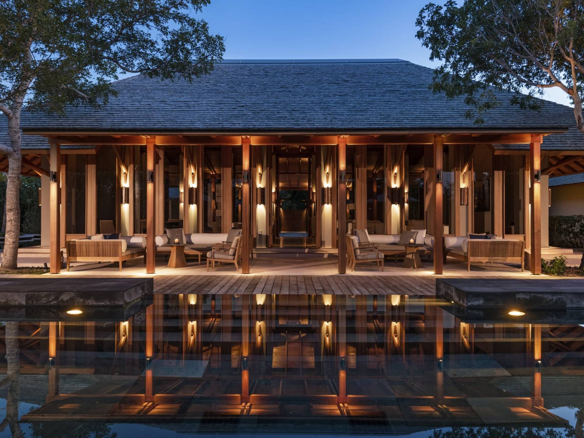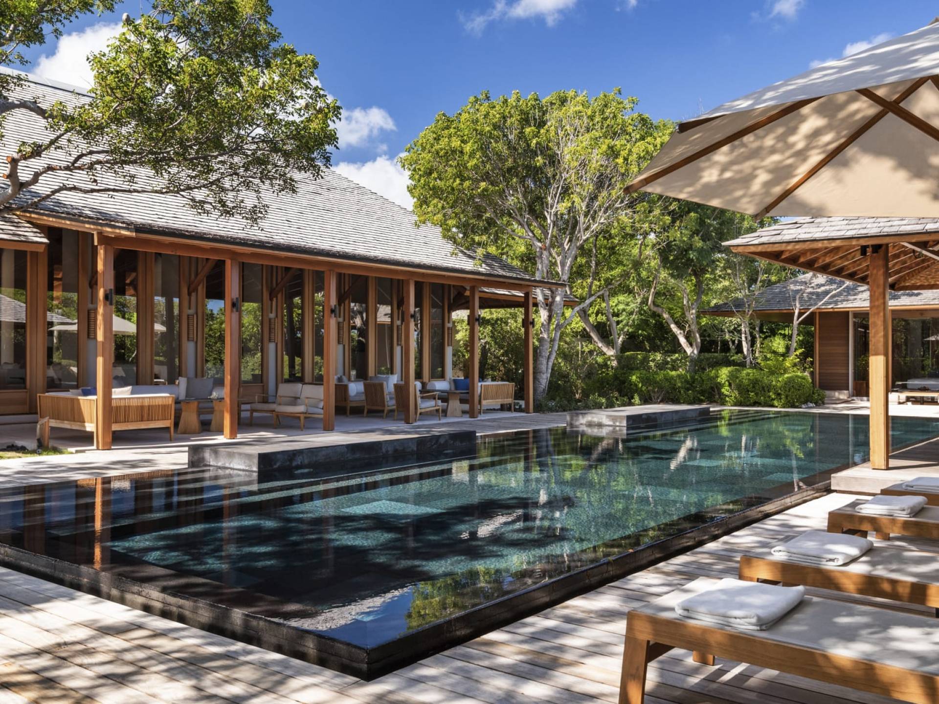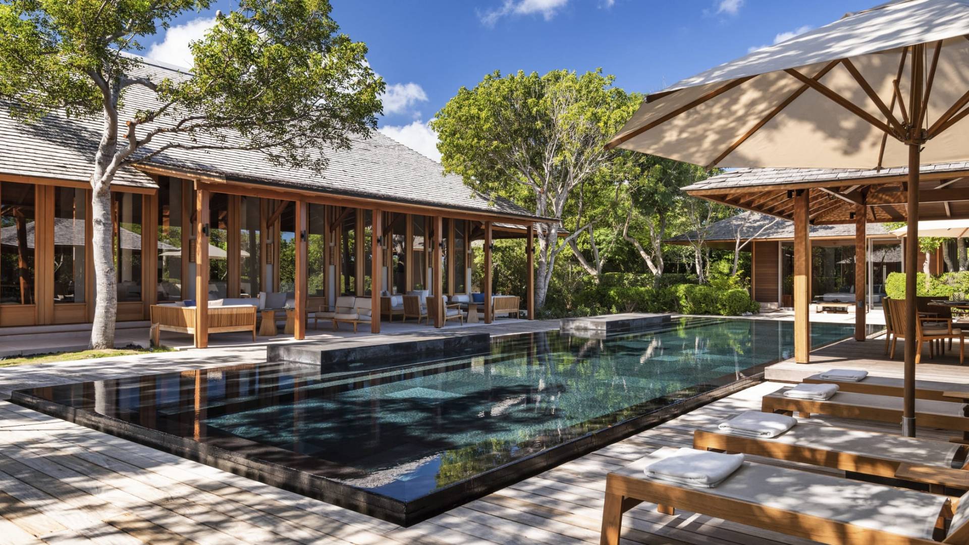 La Villa Tranquility de cuatro dormitorios cuenta con una piscina de borde infinito negro y amplias áreas de descanso y comedor.