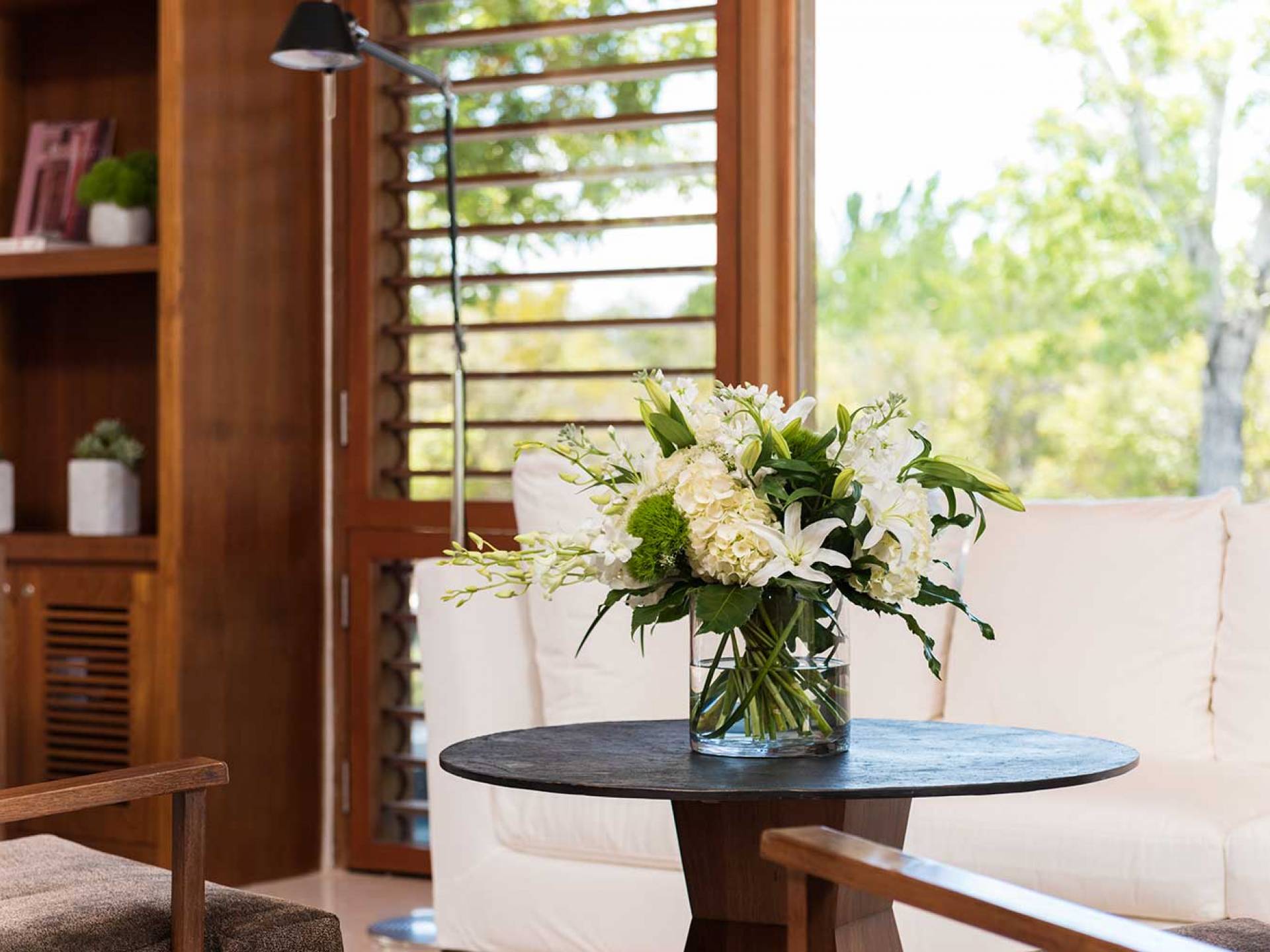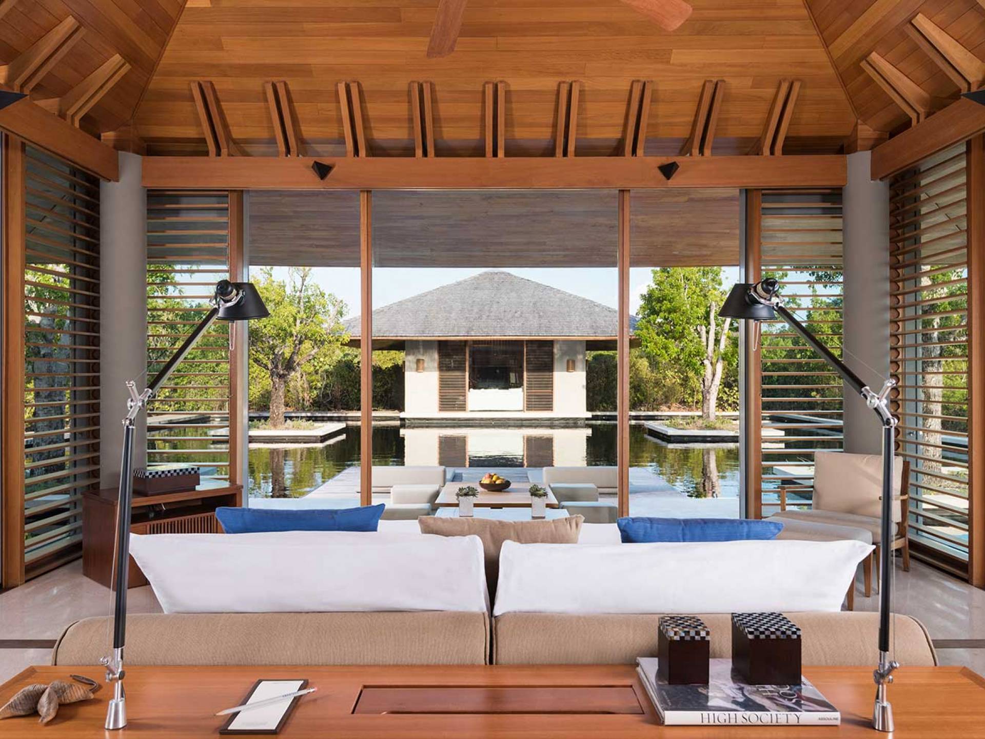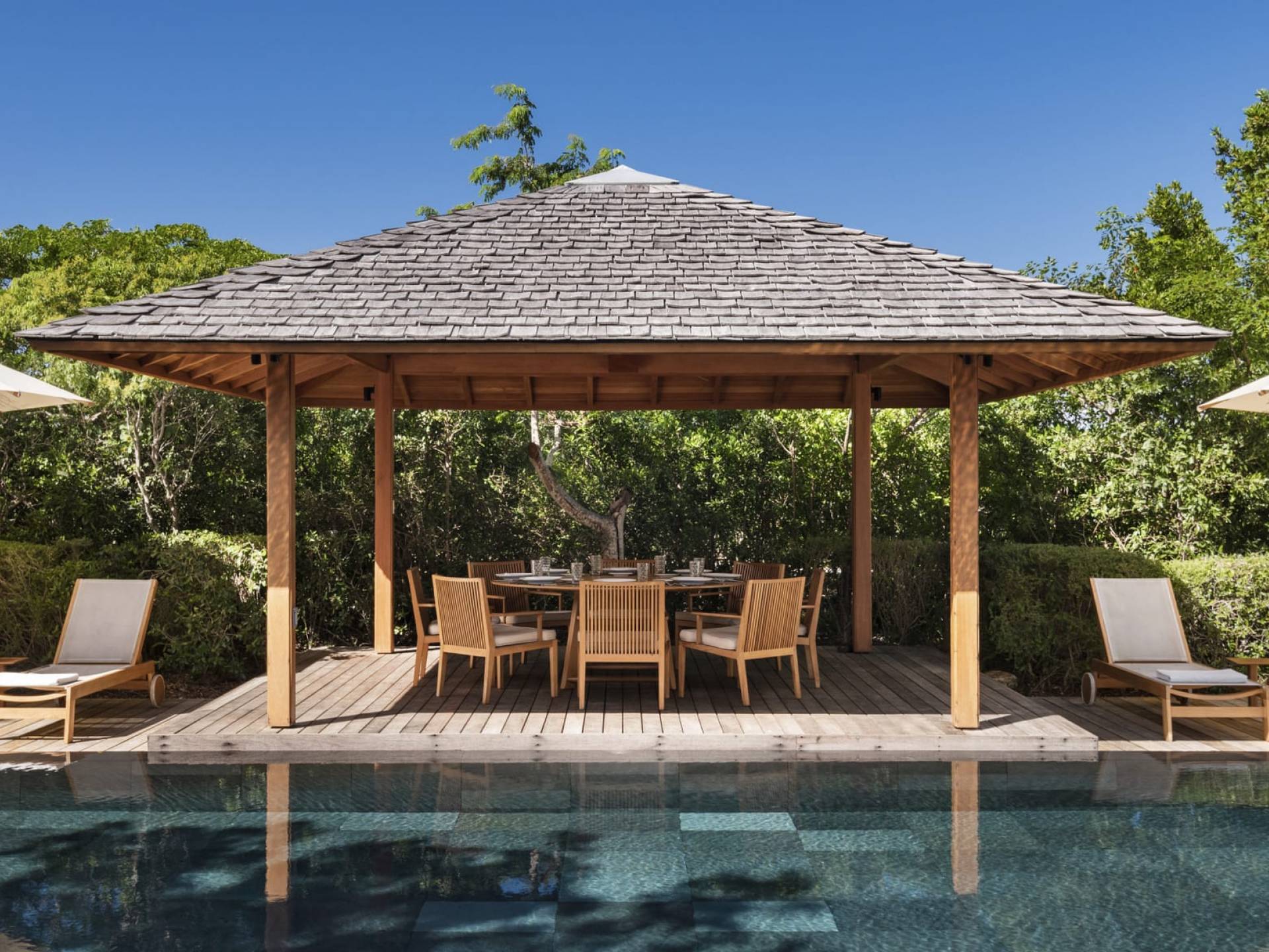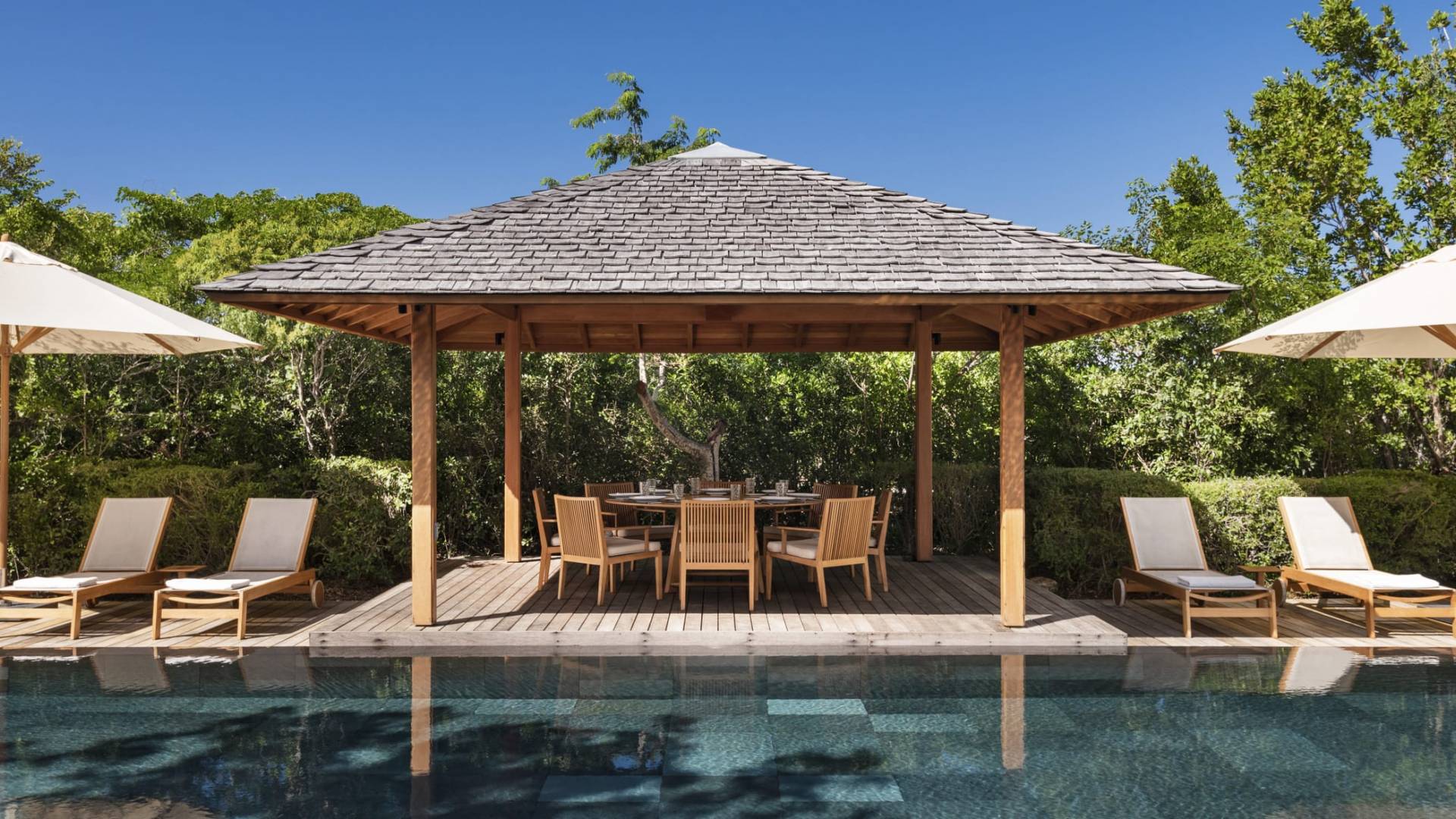 La Villa Tranquility de cuatro dormitorios cuenta con una piscina de borde infinito negro y amplias áreas de descanso y comedor.