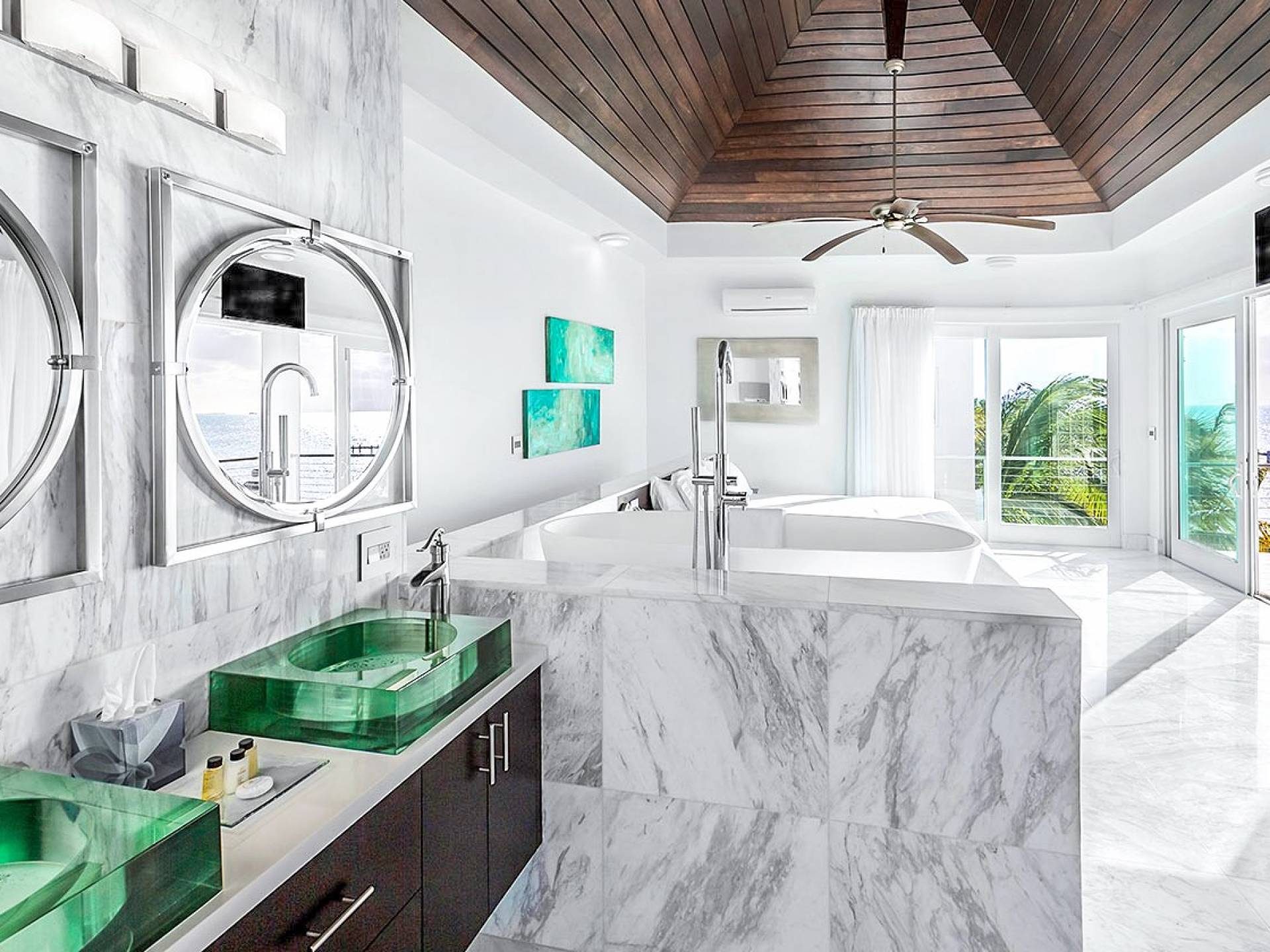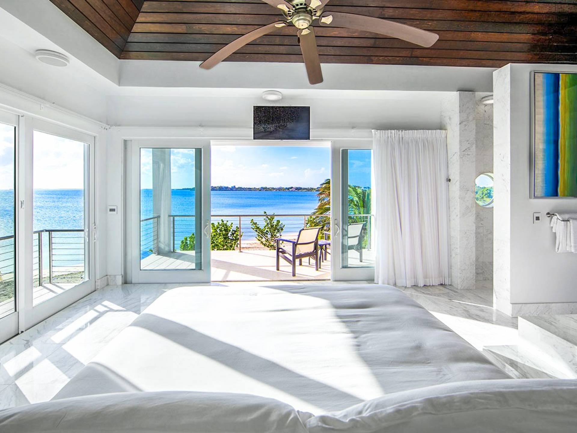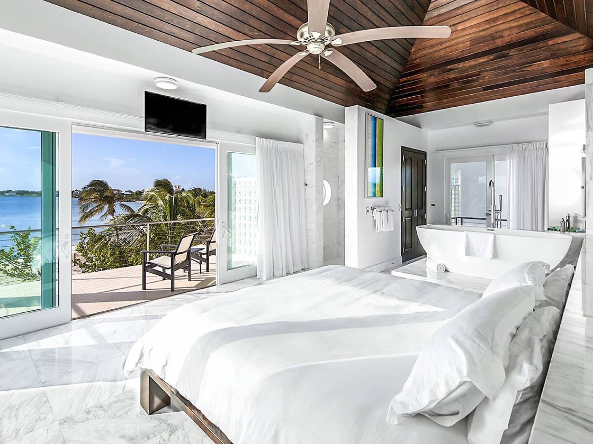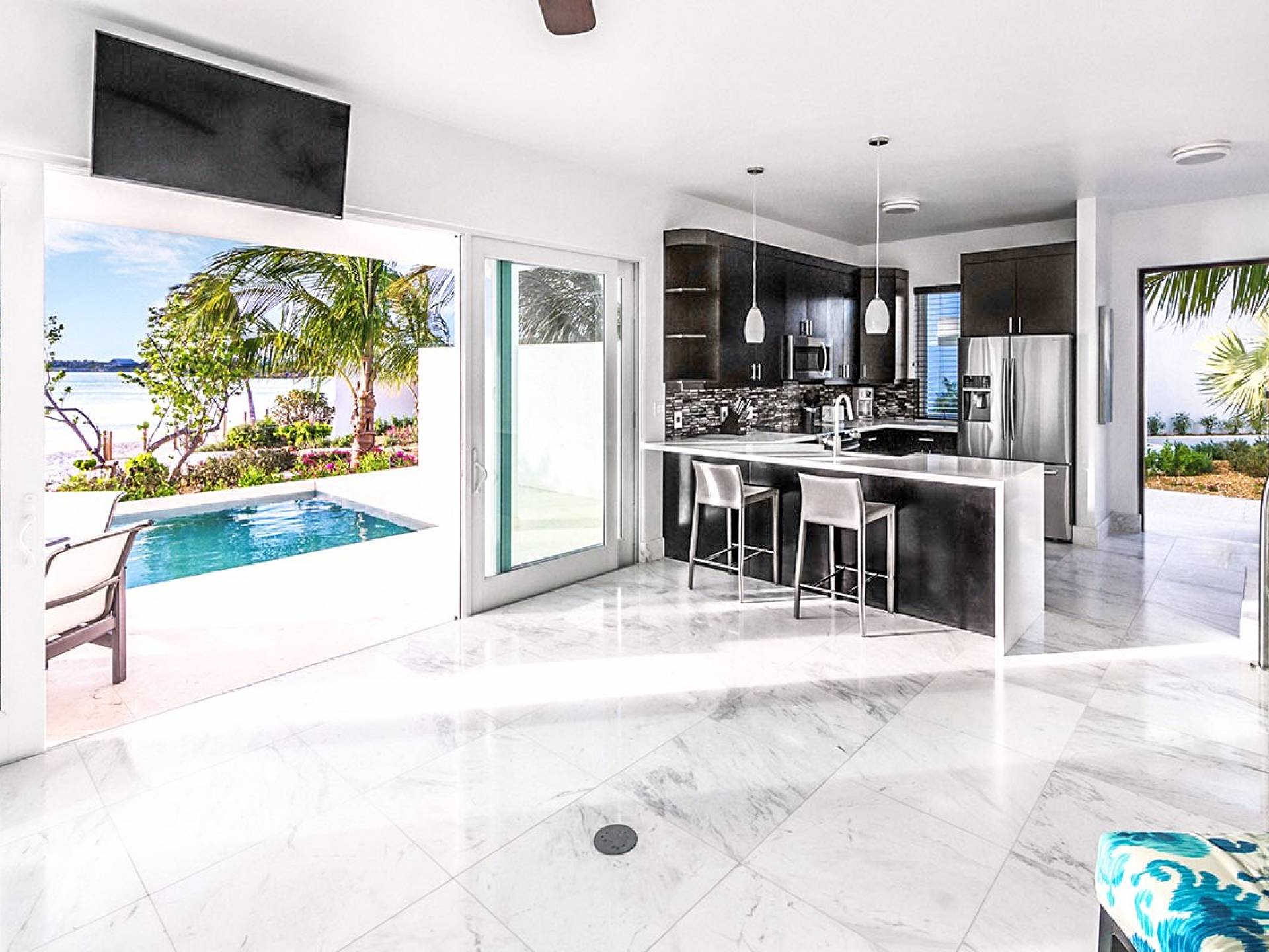 Villa Capri cuenta con dos niveles de espacio habitable, ambos pisos dominados por las increíbles vistas del agua turquesa y el cielo. La sala de estar a nivel de la playa, elegantemente decorada, cuenta con pisos de mármol de Carrera, muebles cómodos y contemporáneos y un televisor Google de 40 pulgadas con capacidad para Internet. La hermosa cocina de caoba está completamente amueblada y se complementa con una parrilla para barbacoa en el patio. El espectacular dormitorio principal de la planta superior cuenta con una cama king-size, baño en suite, bañera grande, techo alto con pico de madera de estilo balinés y muebles hechos a medida. El balcón del segundo piso junto a la habitación es el lugar perfecto para tomar su café de la mañana mientras disfruta de las espectaculares vistas o para relajarse al final del día con una bebida mientras disfruta de las mejores puestas de sol de la isla.