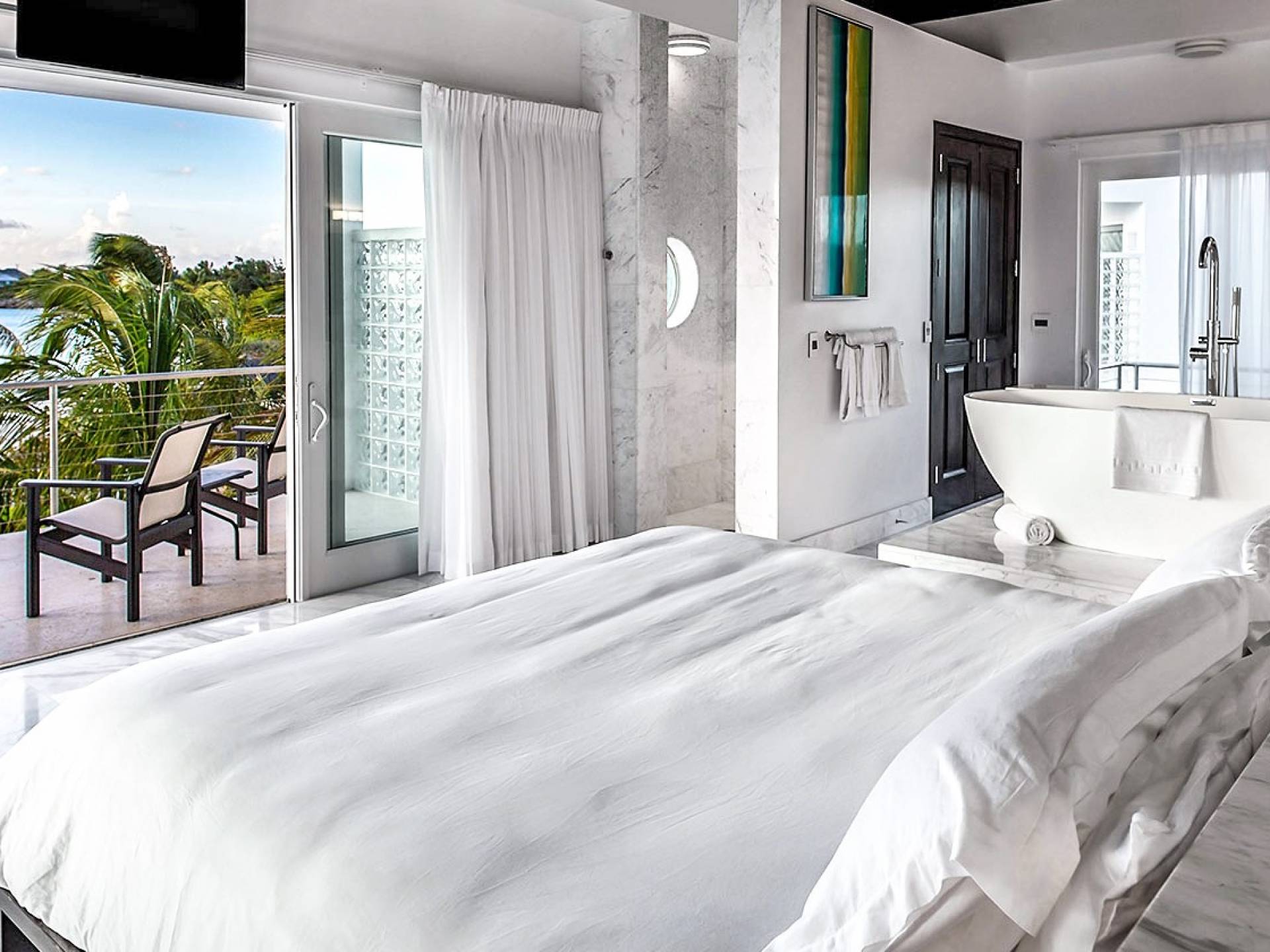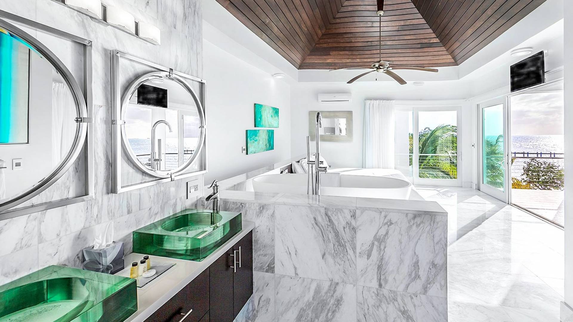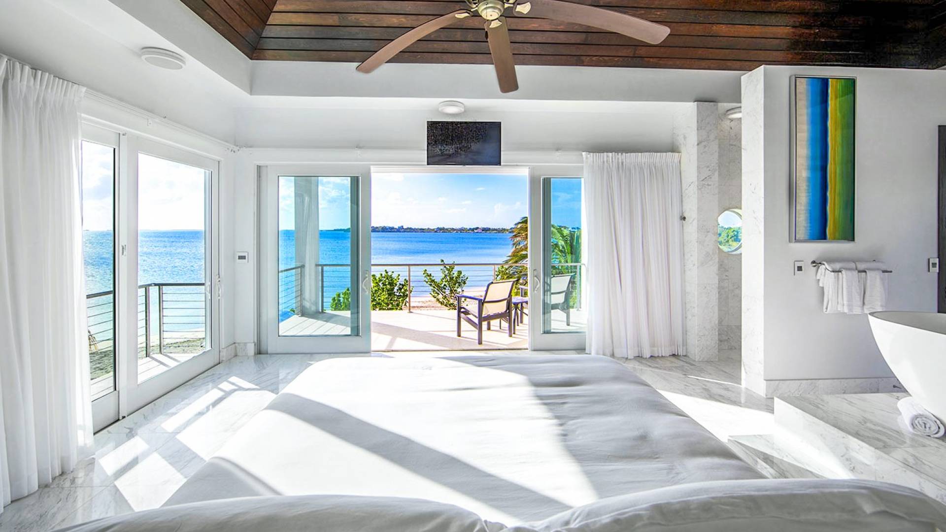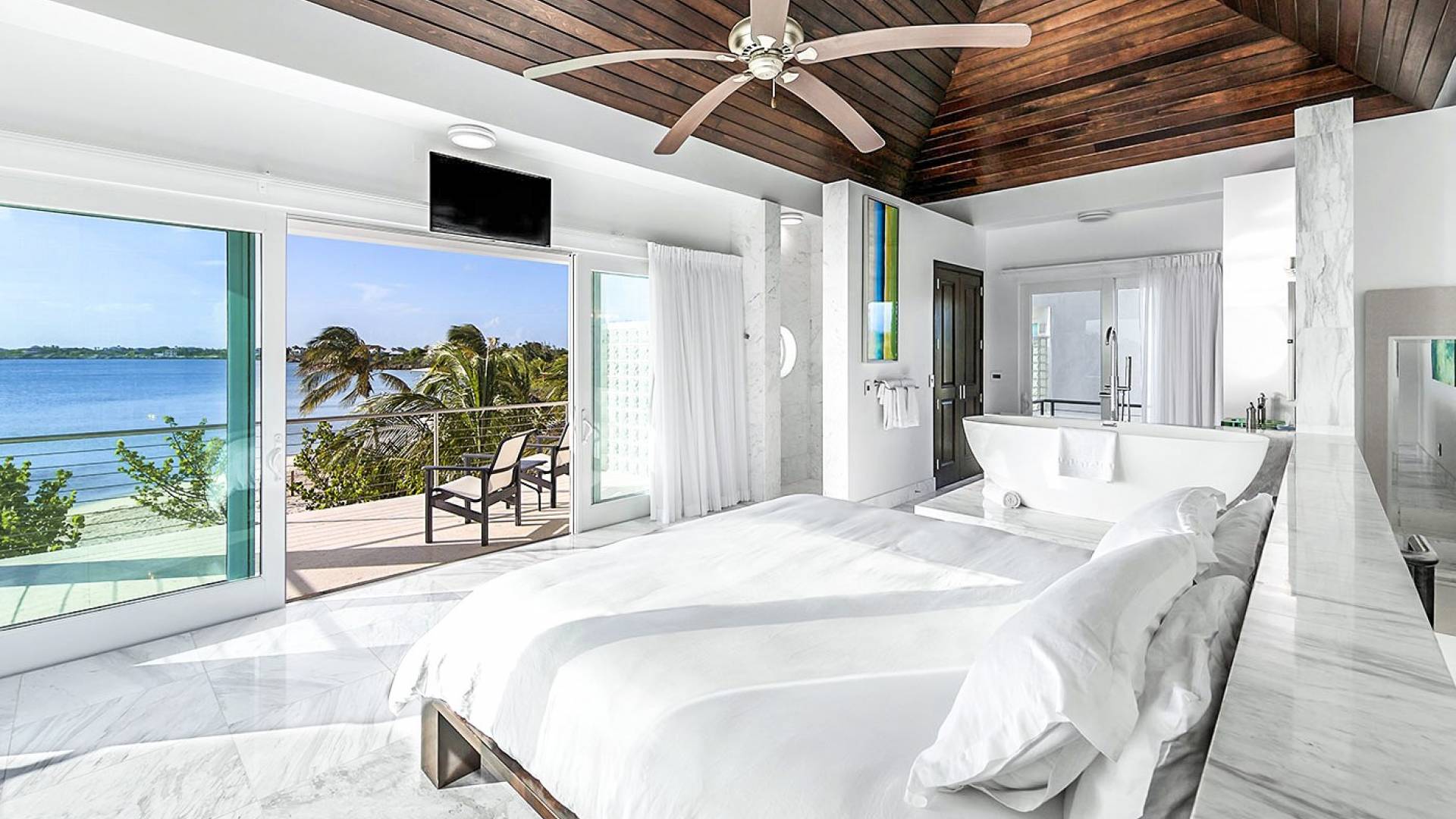 Villa Capri cuenta con dos niveles de espacio habitable, ambos pisos dominados por las increíbles vistas del agua turquesa y el cielo. La sala de estar a nivel de la playa, elegantemente decorada, cuenta con pisos de mármol de Carrera, muebles cómodos y contemporáneos y un televisor Google de 40 pulgadas con capacidad para Internet. La hermosa cocina de caoba está completamente amueblada y se complementa con una parrilla para barbacoa en el patio. El espectacular dormitorio principal de la planta superior cuenta con una cama king-size, baño en suite, bañera grande, techo alto con pico de madera de estilo balinés y muebles hechos a medida. El balcón del segundo piso junto a la habitación es el lugar perfecto para tomar su café de la mañana mientras disfruta de las espectaculares vistas o para relajarse al final del día con una bebida mientras disfruta de las mejores puestas de sol de la isla.