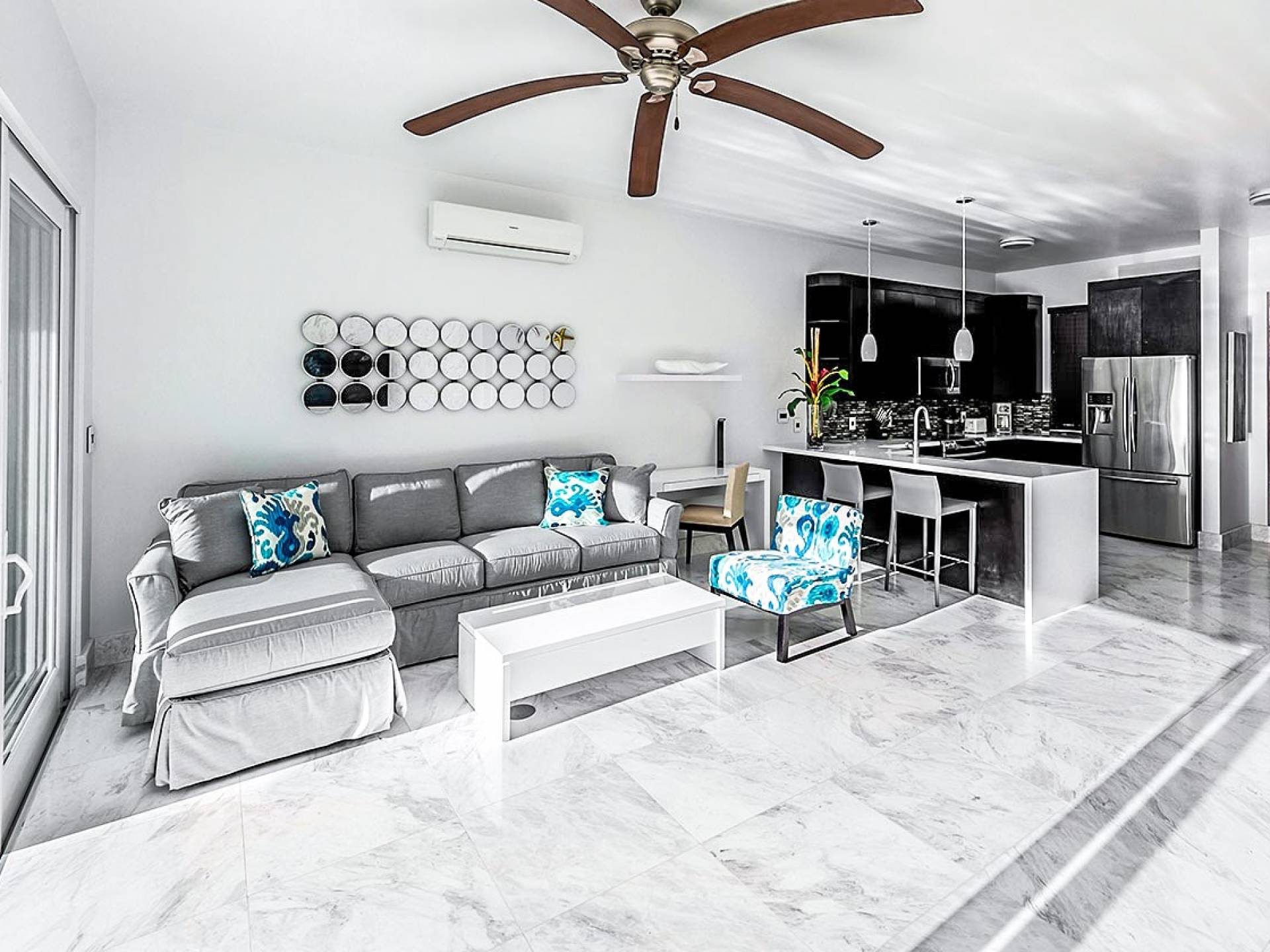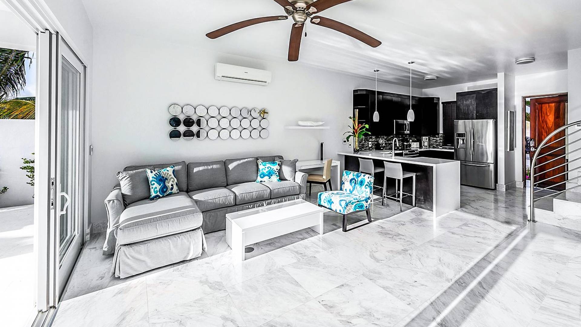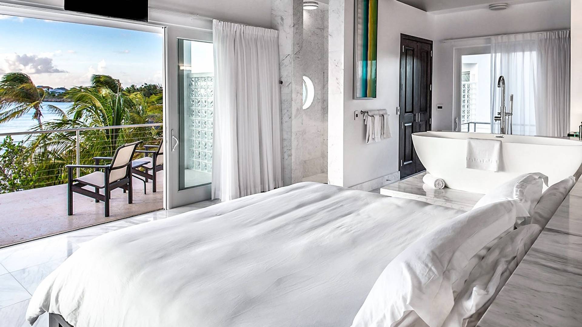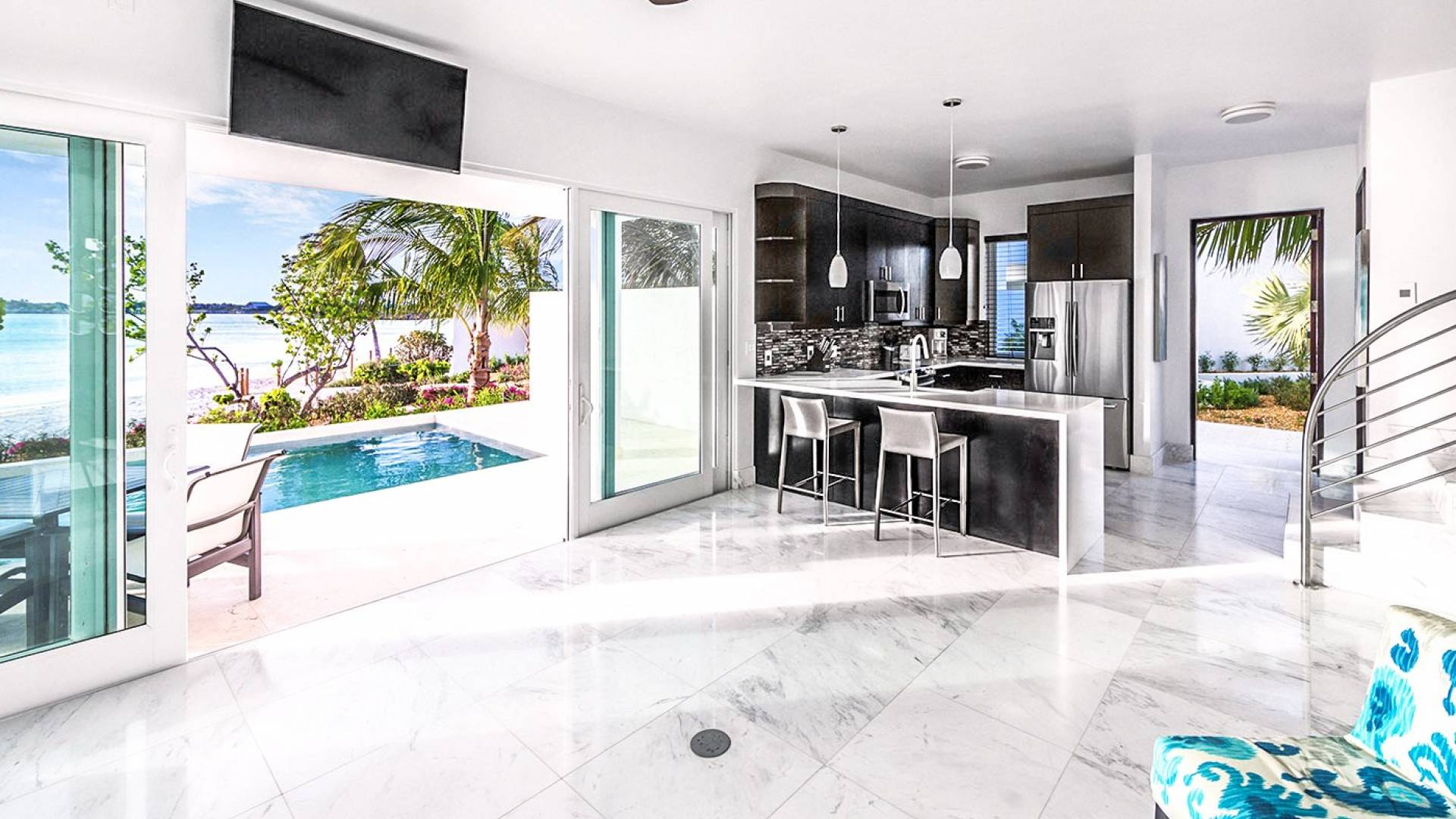 Villa Capri cuenta con dos niveles de espacio habitable, ambos pisos dominados por las increíbles vistas del agua turquesa y el cielo. La sala de estar a nivel de la playa, elegantemente decorada, cuenta con pisos de mármol de Carrera, muebles cómodos y contemporáneos y un televisor Google de 40 pulgadas con capacidad para Internet. La hermosa cocina de caoba está completamente amueblada y se complementa con una parrilla para barbacoa en el patio. El espectacular dormitorio principal de la planta superior cuenta con una cama king-size, baño en suite, bañera grande, techo alto con pico de madera de estilo balinés y muebles hechos a medida. El balcón del segundo piso junto a la habitación es el lugar perfecto para tomar su café de la mañana mientras disfruta de las espectaculares vistas o para relajarse al final del día con una bebida mientras disfruta de las mejores puestas de sol de la isla.