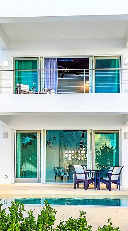 Villa Capri es parte de un trío de alquileres de vacaciones de lujo de un dormitorio bellamente diseñados en Sapodilla Bay, en Providenciales, Turks y Caicos. Sapodilla Bay es conocida por su playa de arena blanca, marea suave y aguas cristalinas. Para el viajero exigente que prefiere la soledad y la relajación de una villa privada a la competencia por una silla de playa en un resort, esta villa es la respuesta perfecta. Villa Capri cuenta con una decoración contemporánea en dos niveles de espacio habitable, una gran piscina privada con un patio al aire libre y está a solo unos pasos de la prístina playa de arena. Vista desde el agua, Capri es la villa central de las tres.