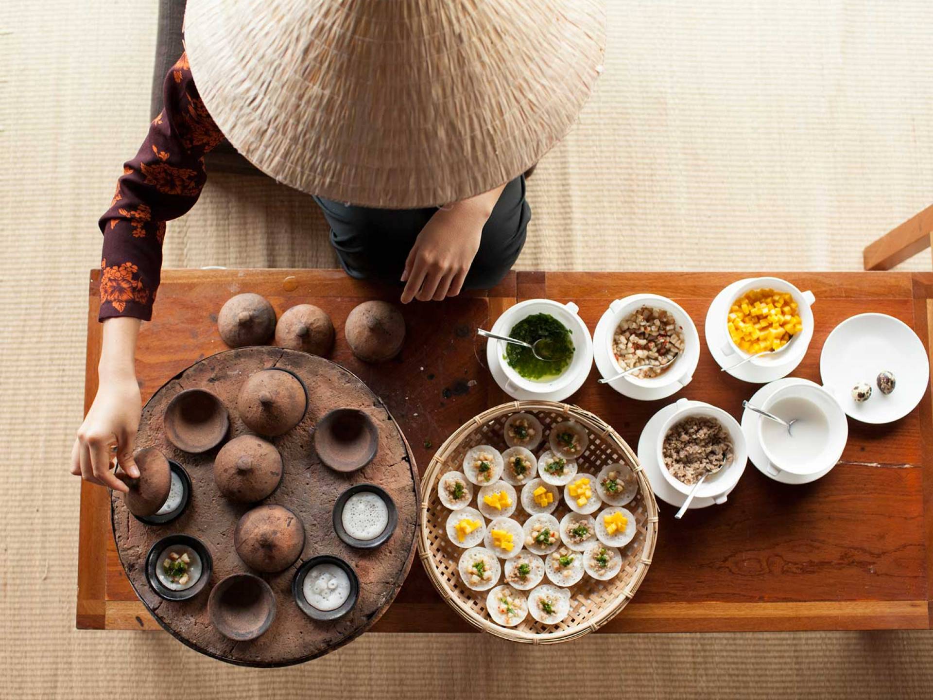 El restaurante del complejo de cinco estrellas está abierto para huéspedes y no residentes. La comida vietnamita es considerada una de las cocinas más saludables y sabrosas del mundo, admirada por sus ingredientes frescos y el uso selectivo de hierbas y especias. El pescado fresco ocupa un lugar destacado en los menús de Amanoi, que se entrega a diario directamente de los barcos de pesca locales, mientras que las hierbas y verduras se seleccionan a mano del huerto orgánico del complejo.