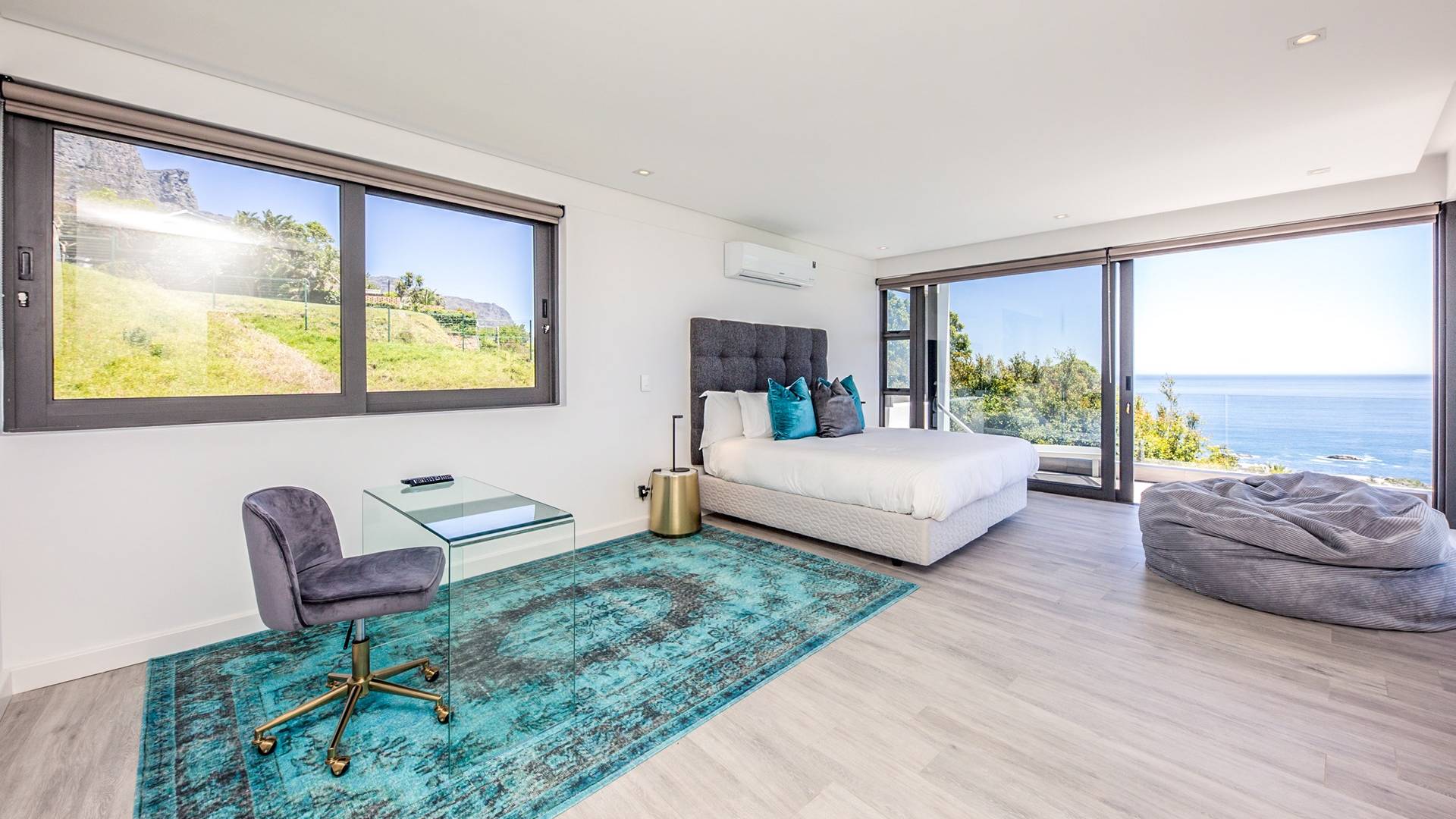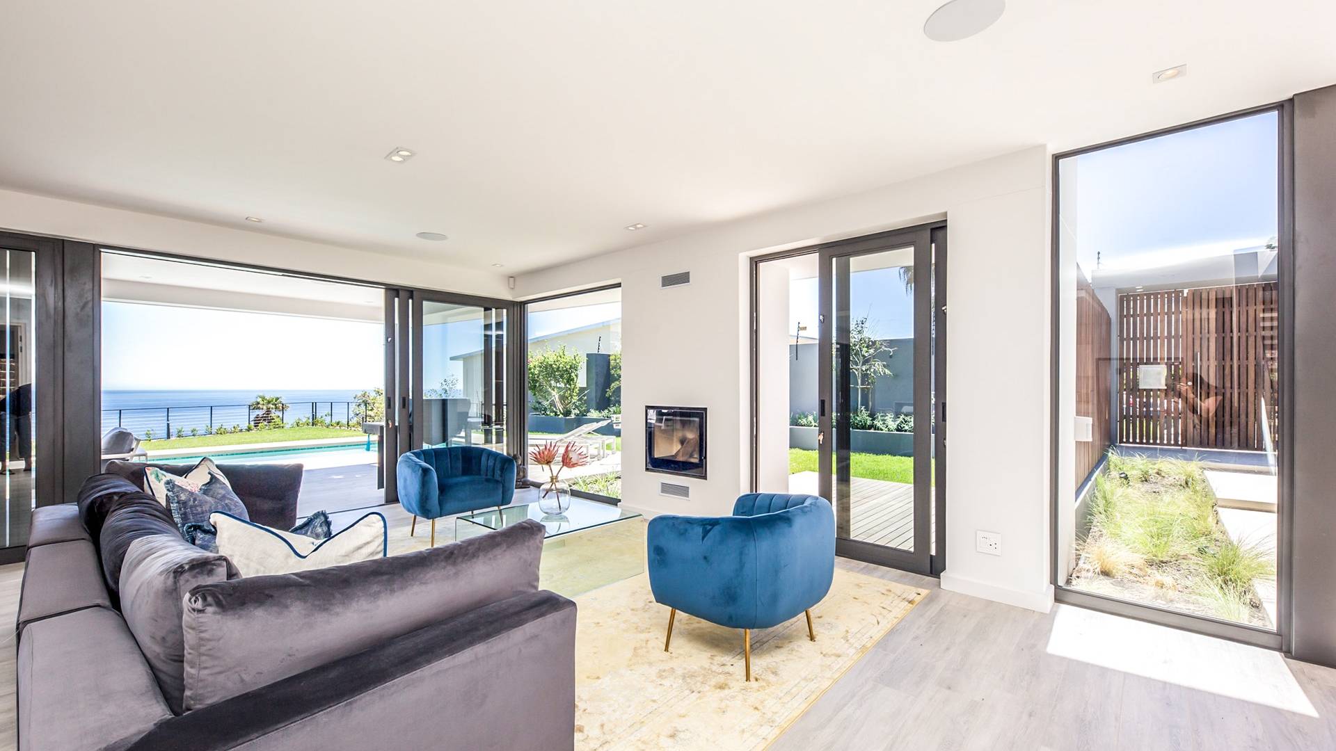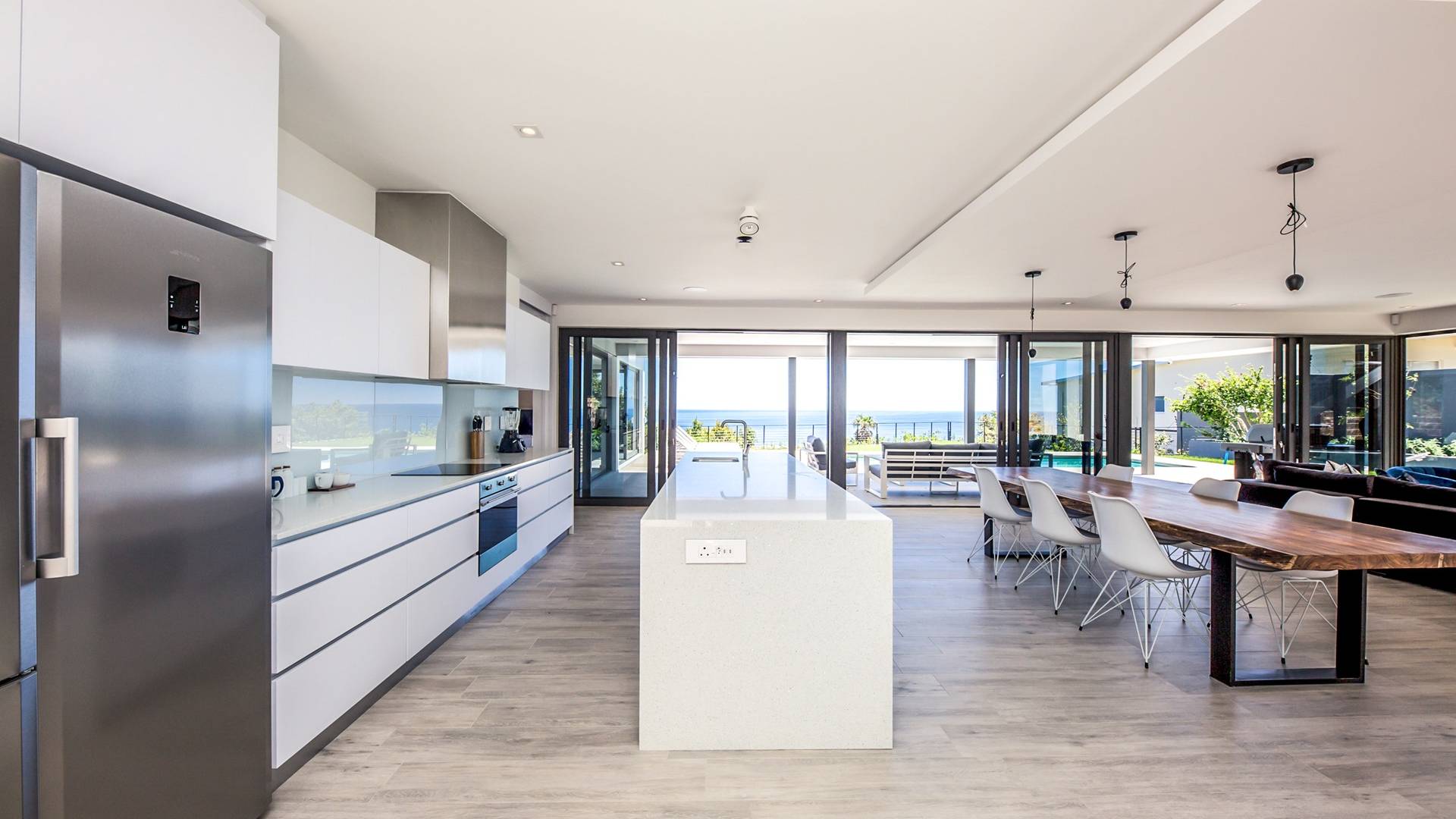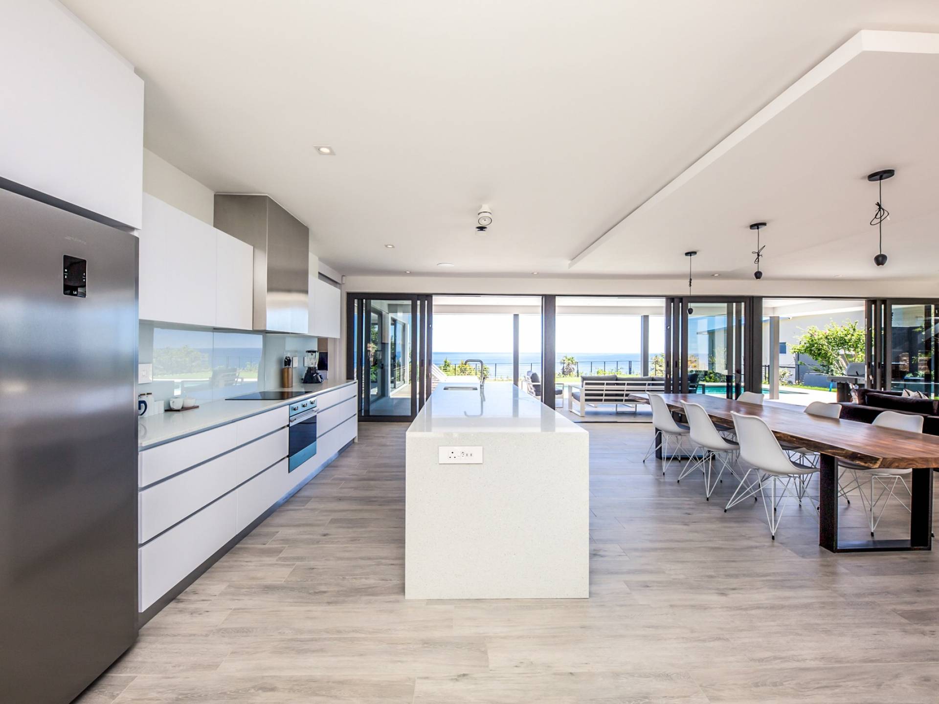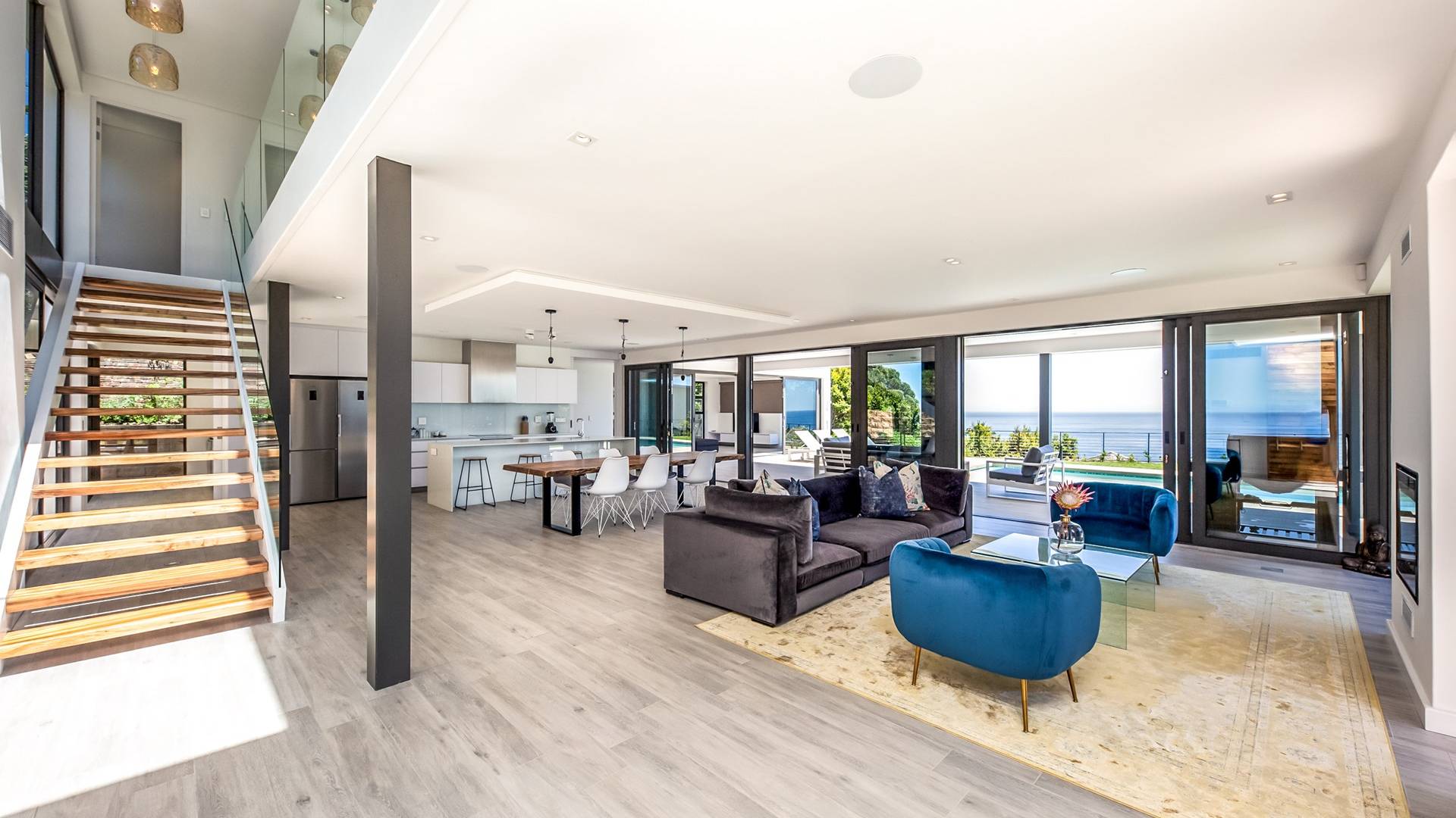 L'espace salon, salle à manger et cuisine décloisonné du rez-de-chaussée comprend d'immenses portes coulissantes qui s'ouvrent sur le patio et un grand jardin avec piscine privée. Les vues d'ici sont incroyables. A l'étage se trouvent les chambres et les salles de bains, également avec une vue imprenable sur l'océan Atlantique et les 12 apôtres. Détendez-vous dans cette incroyable villa de vacances au Cap.