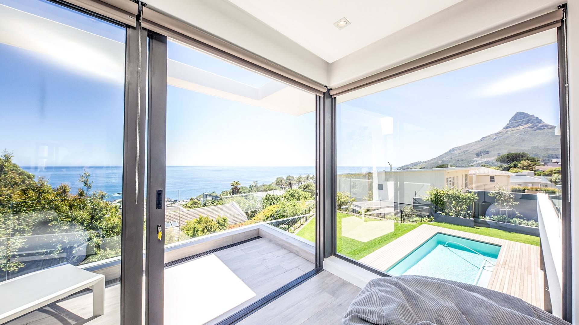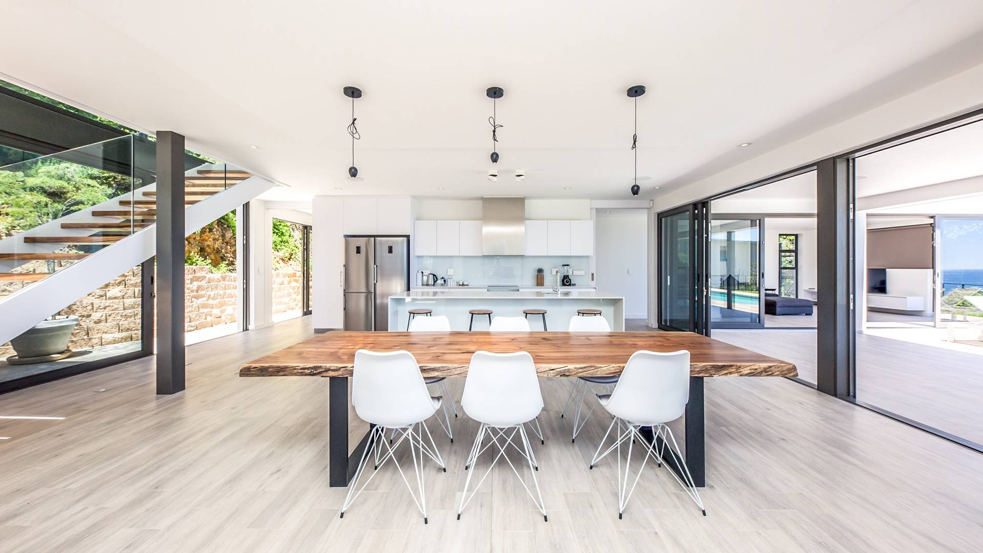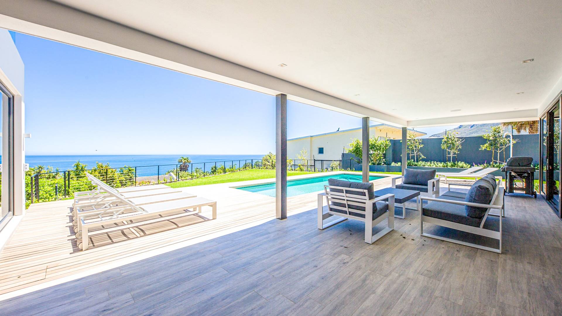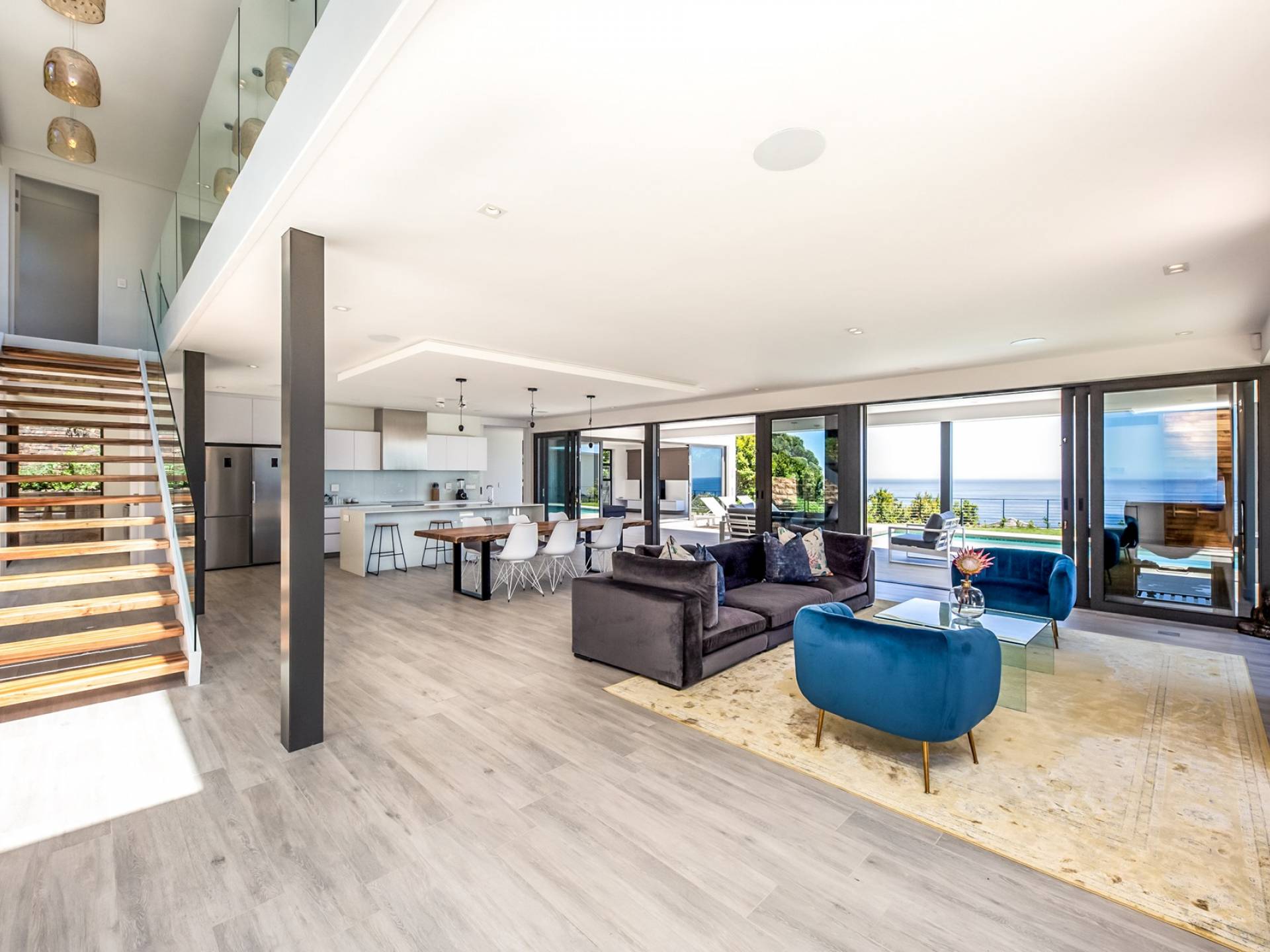 L'espace salon, salle à manger et cuisine décloisonné du rez-de-chaussée comprend d'immenses portes coulissantes qui s'ouvrent sur le patio et un grand jardin avec piscine privée. Les vues d'ici sont incroyables. A l'étage se trouvent les chambres et les salles de bains, également avec une vue imprenable sur l'océan Atlantique et les 12 apôtres. Détendez-vous dans cette incroyable villa de vacances au Cap.