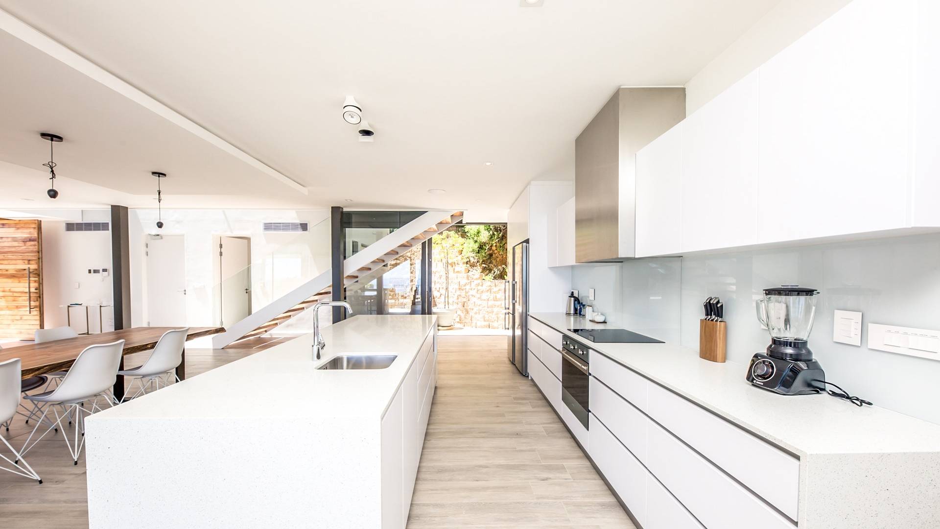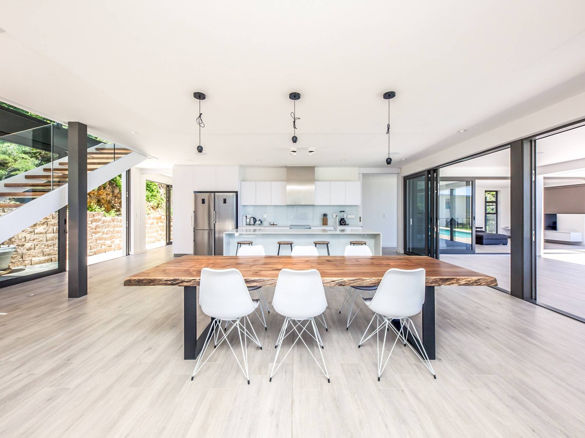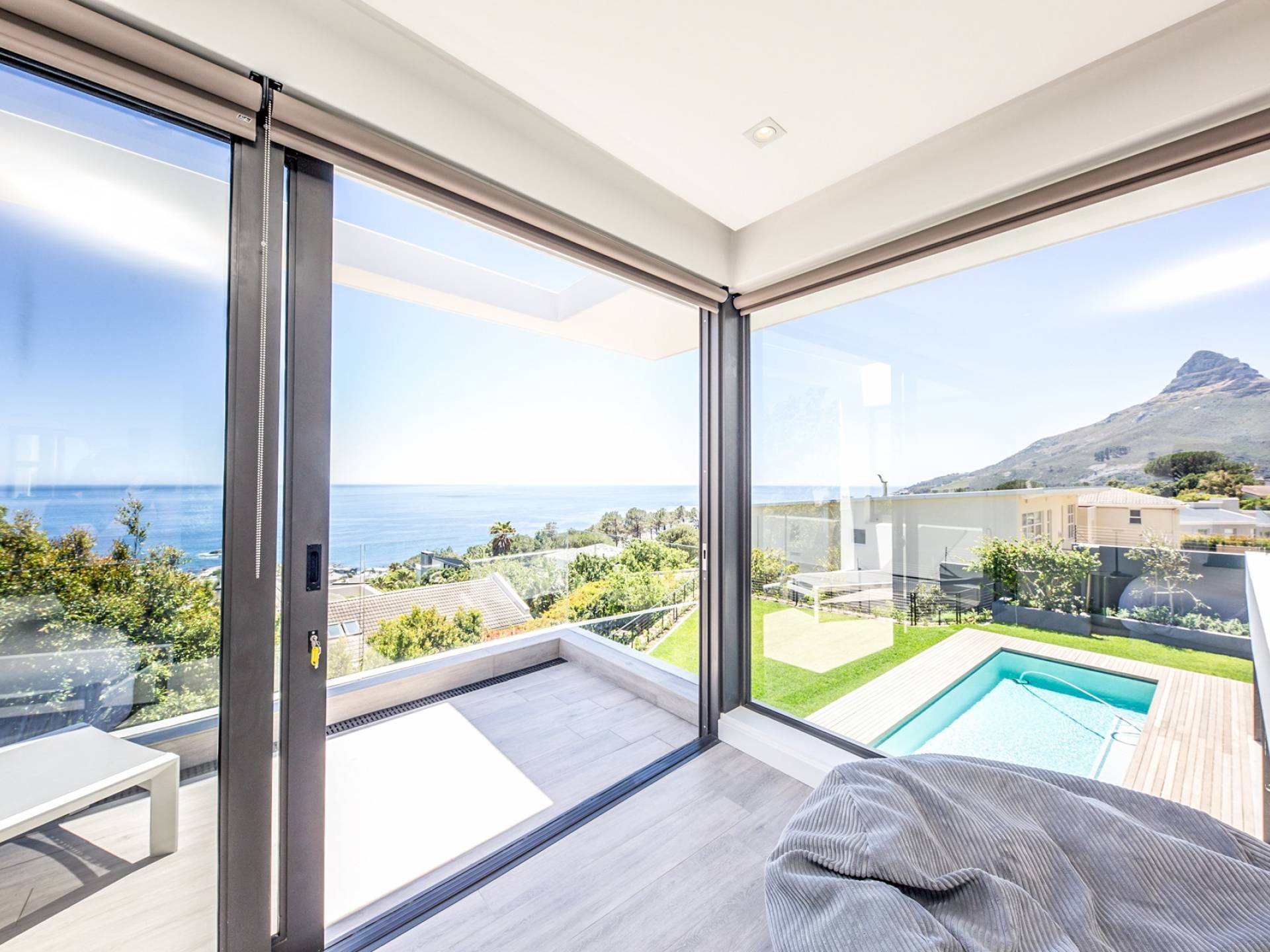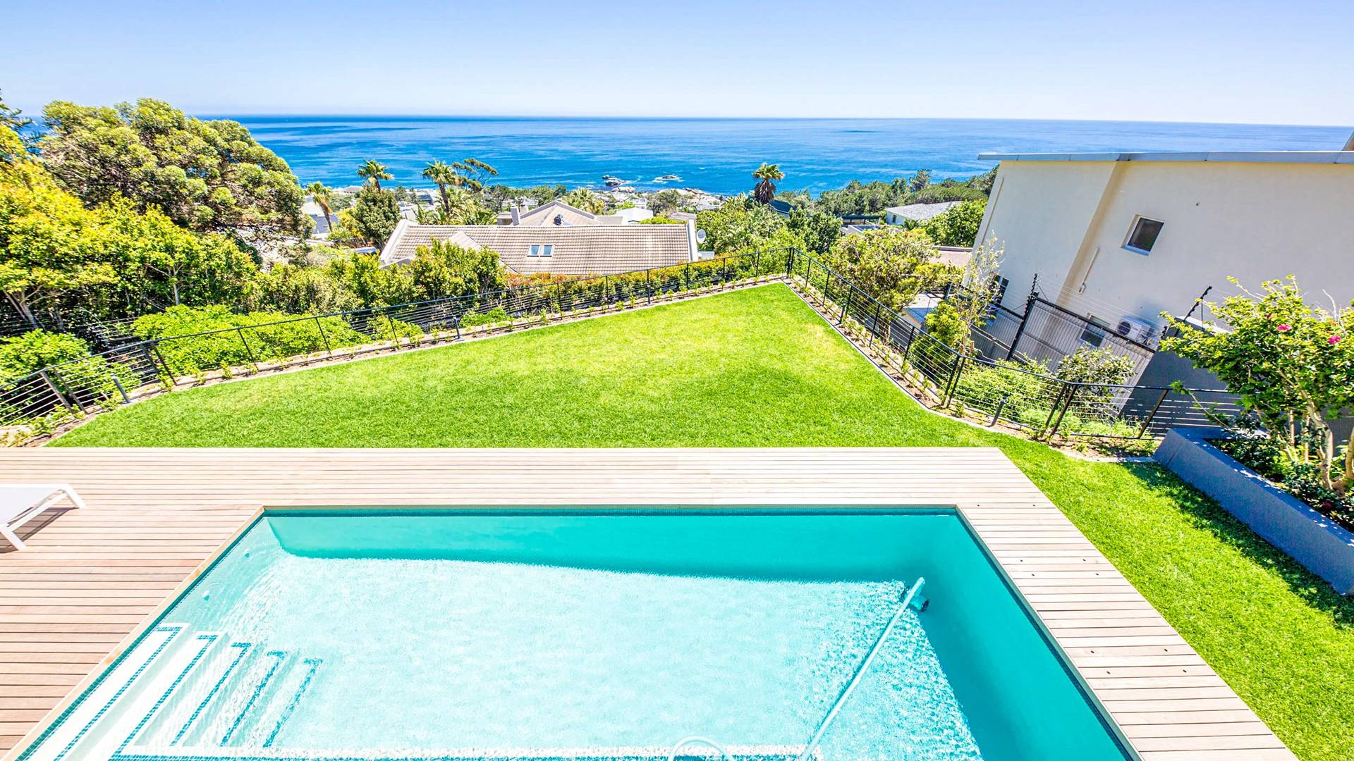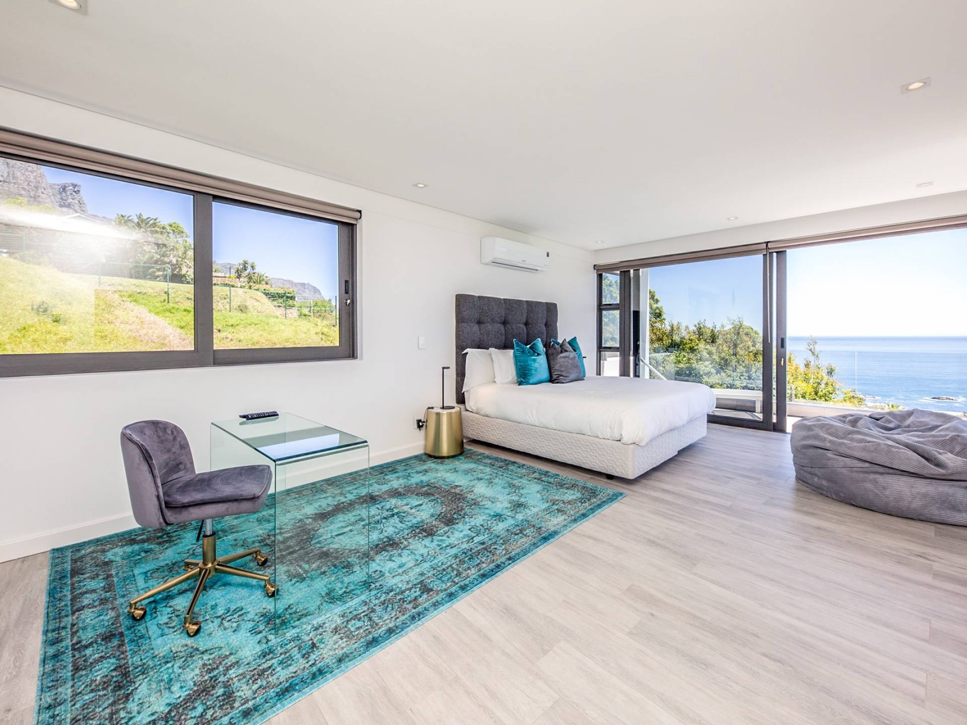 L'espace salon, salle à manger et cuisine décloisonné du rez-de-chaussée comprend d'immenses portes coulissantes qui s'ouvrent sur le patio et un grand jardin avec piscine privée. Les vues d'ici sont incroyables. A l'étage se trouvent les chambres et les salles de bains, également avec une vue imprenable sur l'océan Atlantique et les 12 apôtres. Détendez-vous dans cette incroyable villa de vacances au Cap.