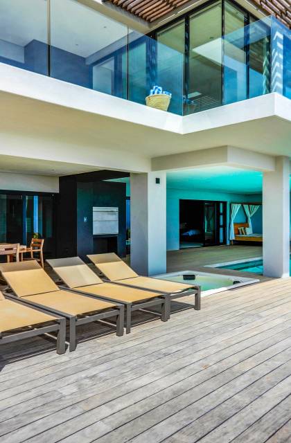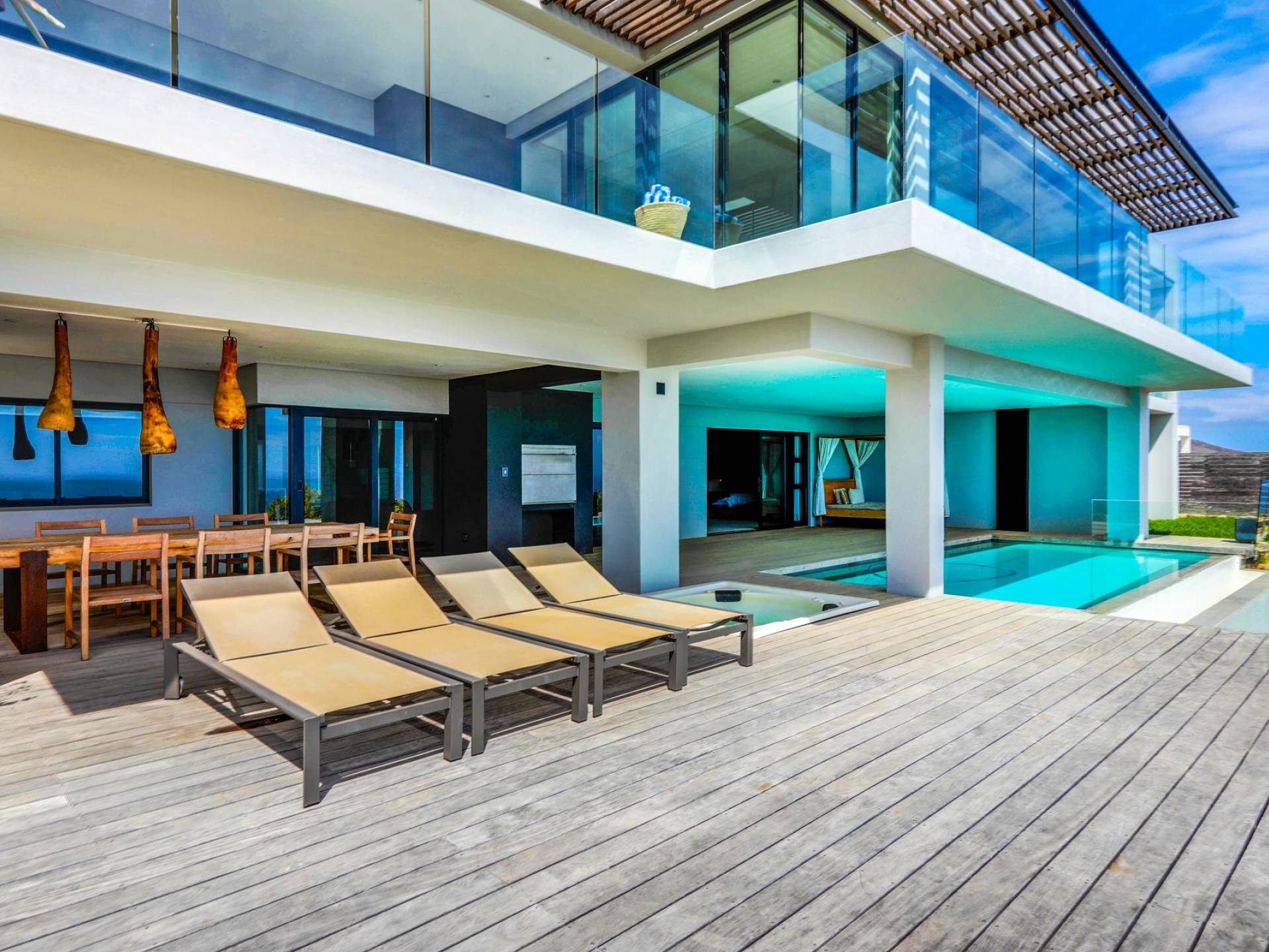 La cuisine est équipée d'appareils électroménagers haut de gamme, dont un four Miele et une machine à café. Il dispose également d'un refroidisseur à vin, d'un bar à petit-déjeuner et d'une arrière-cuisine séparée. La salle à manger offre des sièges pour 8 personnes et il y a aussi un bar à boissons avec des sièges pour quatre. Le salon dispose de grands canapés confortables, d'un foyer au gaz, d'une télévision et d'un accès extérieur au patio. Il y a un deuxième salon TV qui dispose d'une petite kitchenette et d'un accès à une salle de bain. À l'extérieur, une piscine à débordement ainsi qu'un jacuzzi, une salle à manger pour 5 personnes, des chaises longues et un barbecue au feu de bois.
