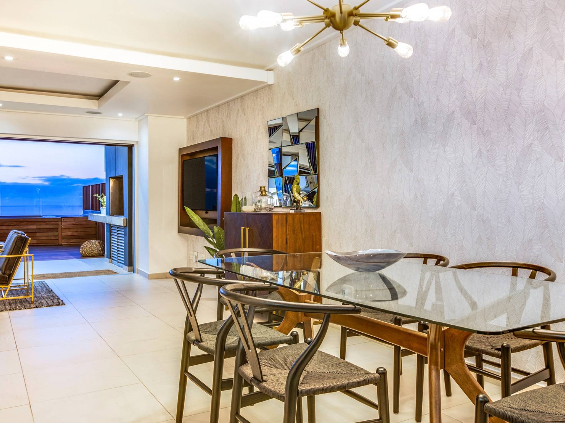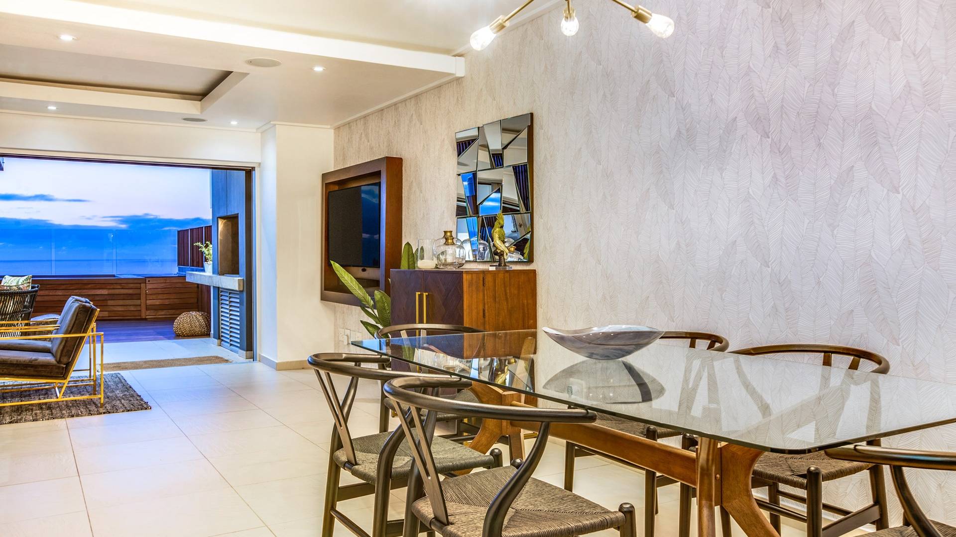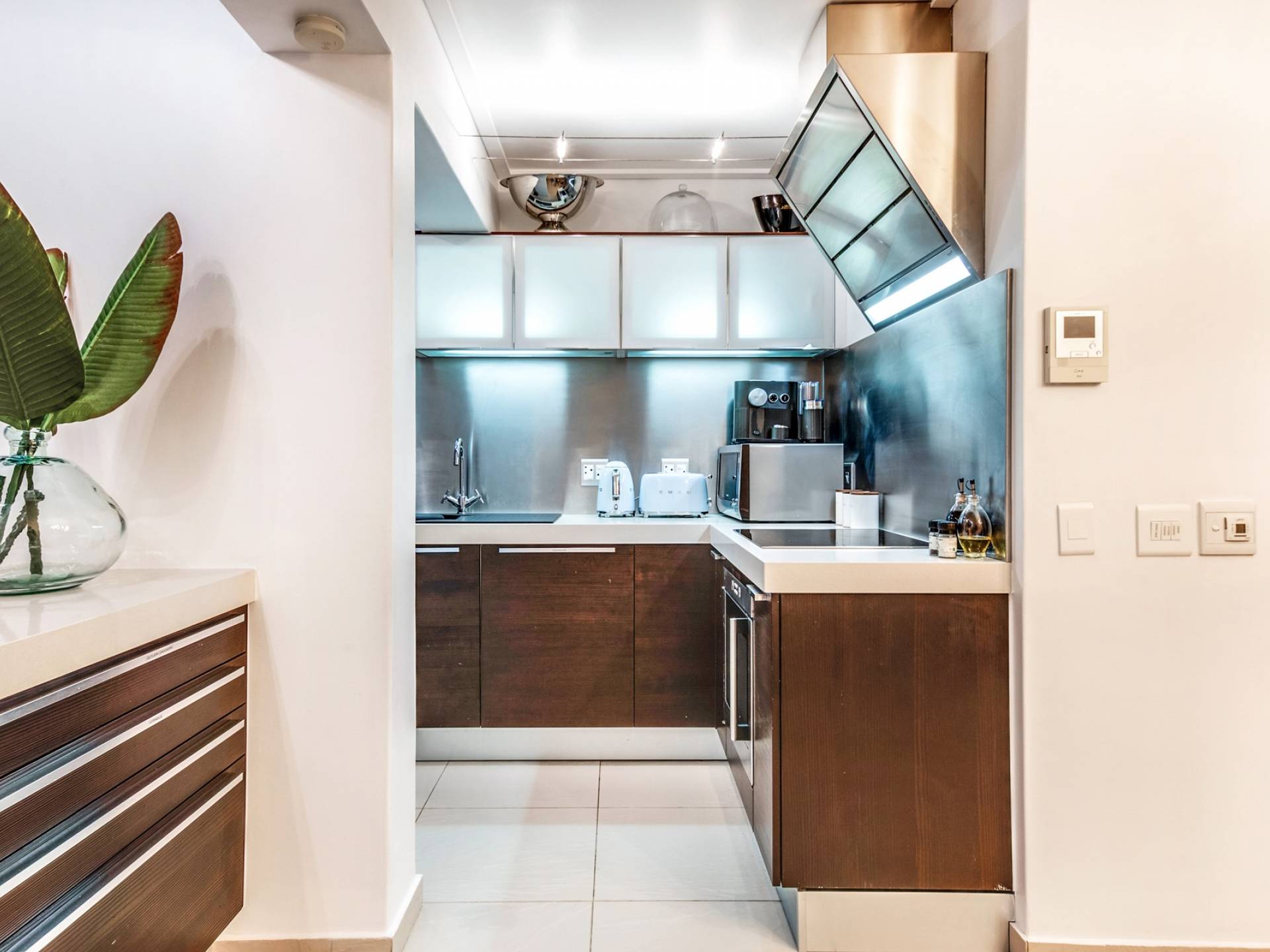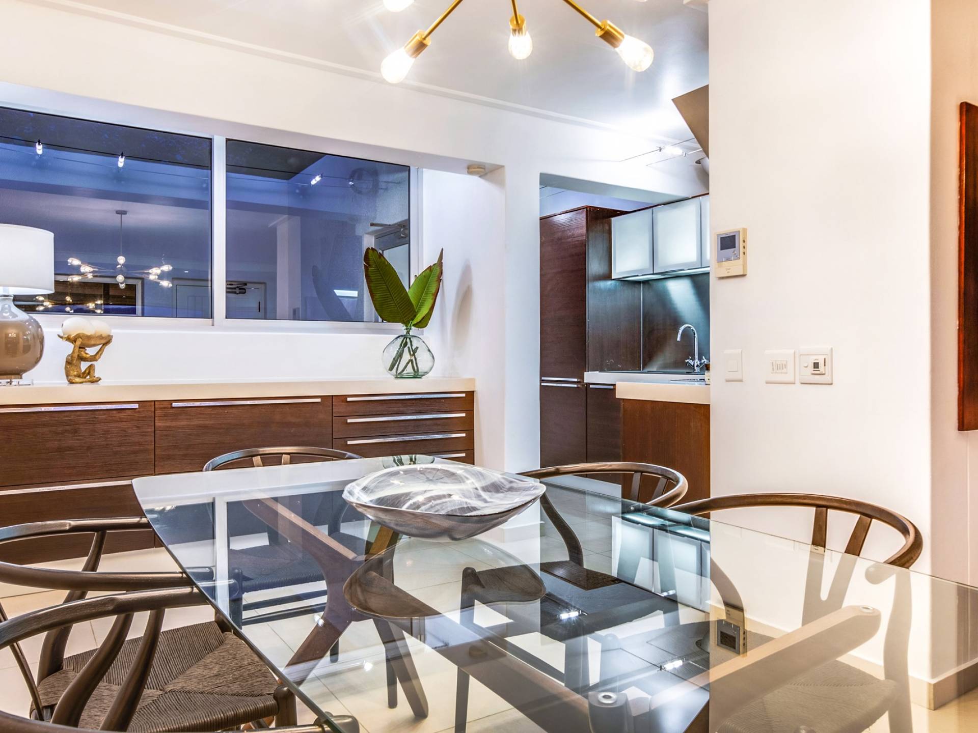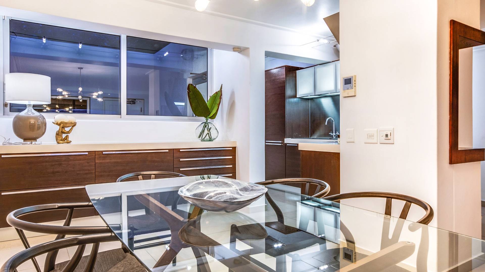 Le niveau inférieur est une salle à manger et un salon décloisonnés qui donnent sur le grand balcon avec une vue imprenable sur la mer, une piscine et des sièges extérieurs. La cuisine bien équipée se trouve à l'arrière de ce niveau et mène à la salle à manger. Il y a aussi des toilettes invités. A l'étage, vous trouverez 3 chambres toutes climatisées. La chambre principale dispose d'un balcon privé avec vue sur la mer et de sièges. La chambre en suite est à aire ouverte (avec toilettes fermées). Les chambres 2 et 3 sont plus petites, offrent une vue sur la montagne et partagent une salle de bain. En raison de la proximité de cet appartement avec les voisins, cet appartement n'autorise aucune fête.