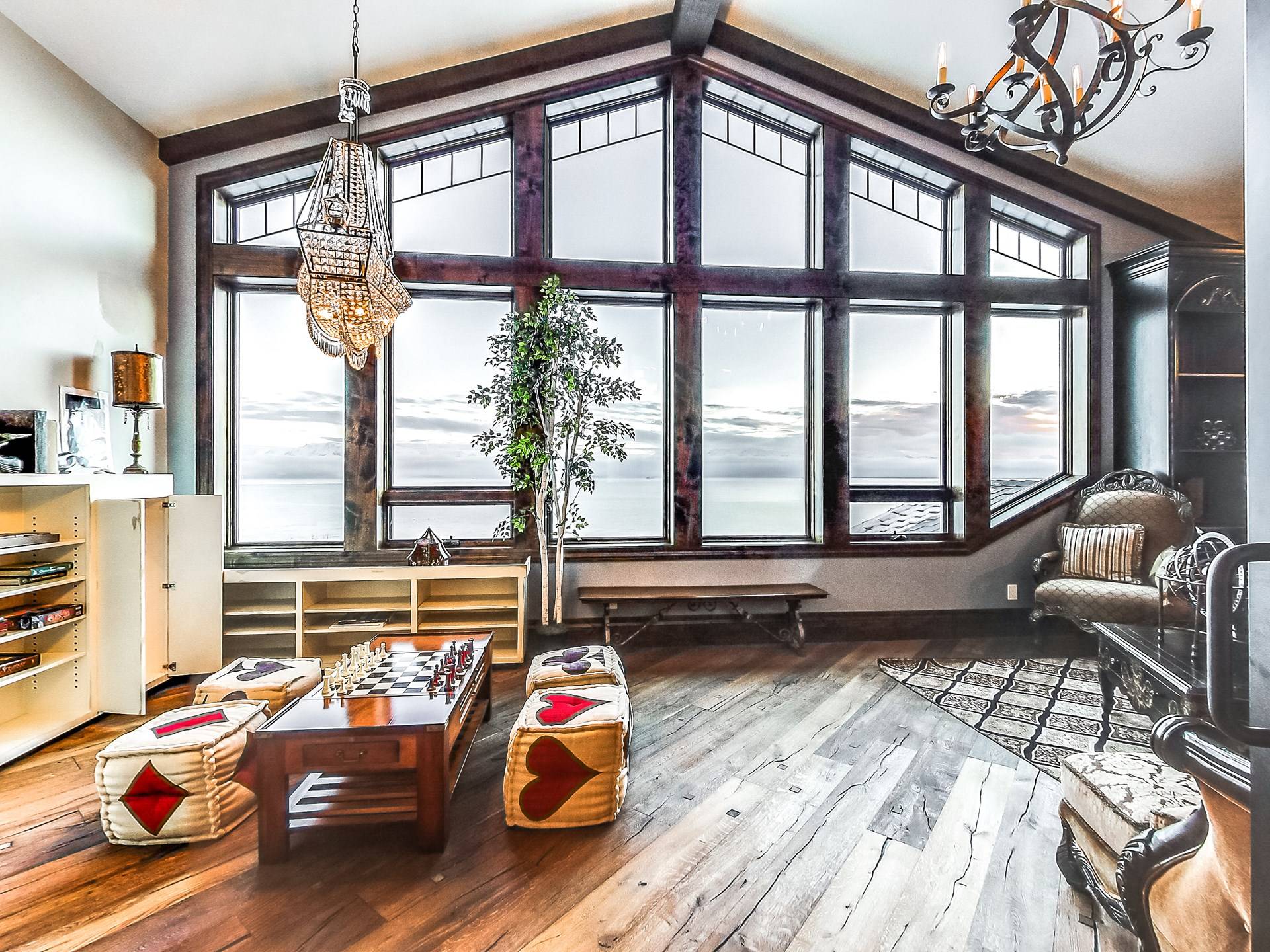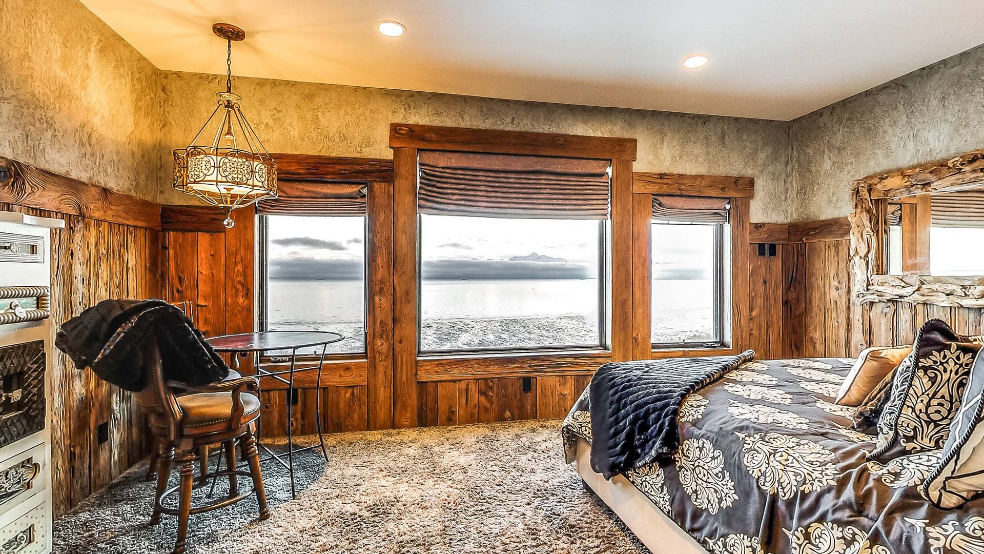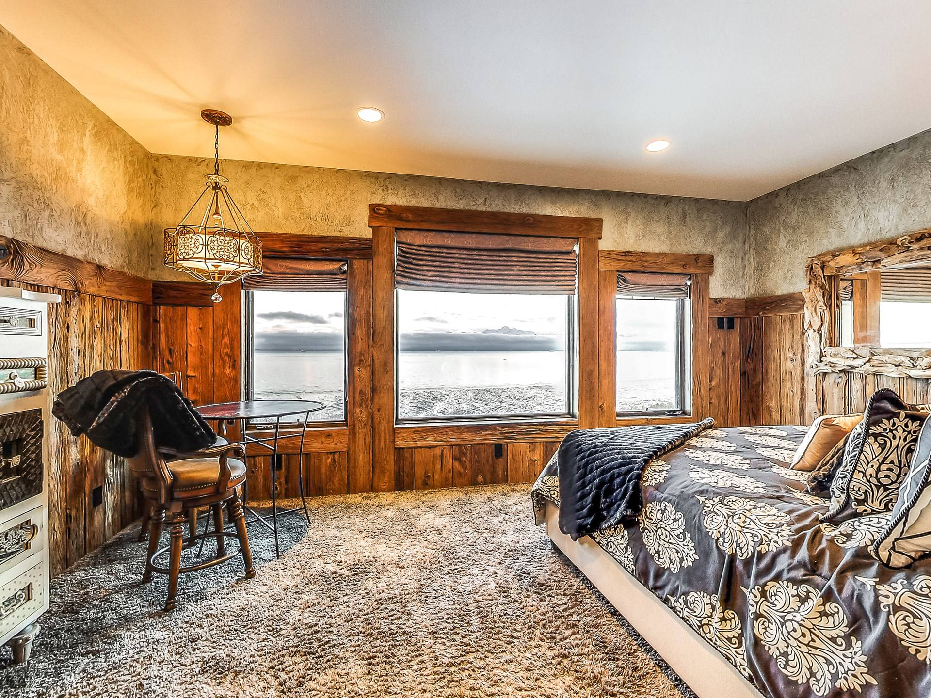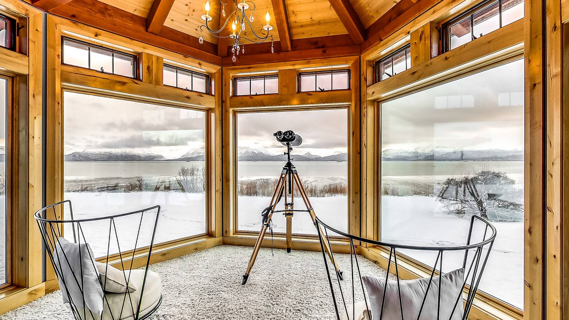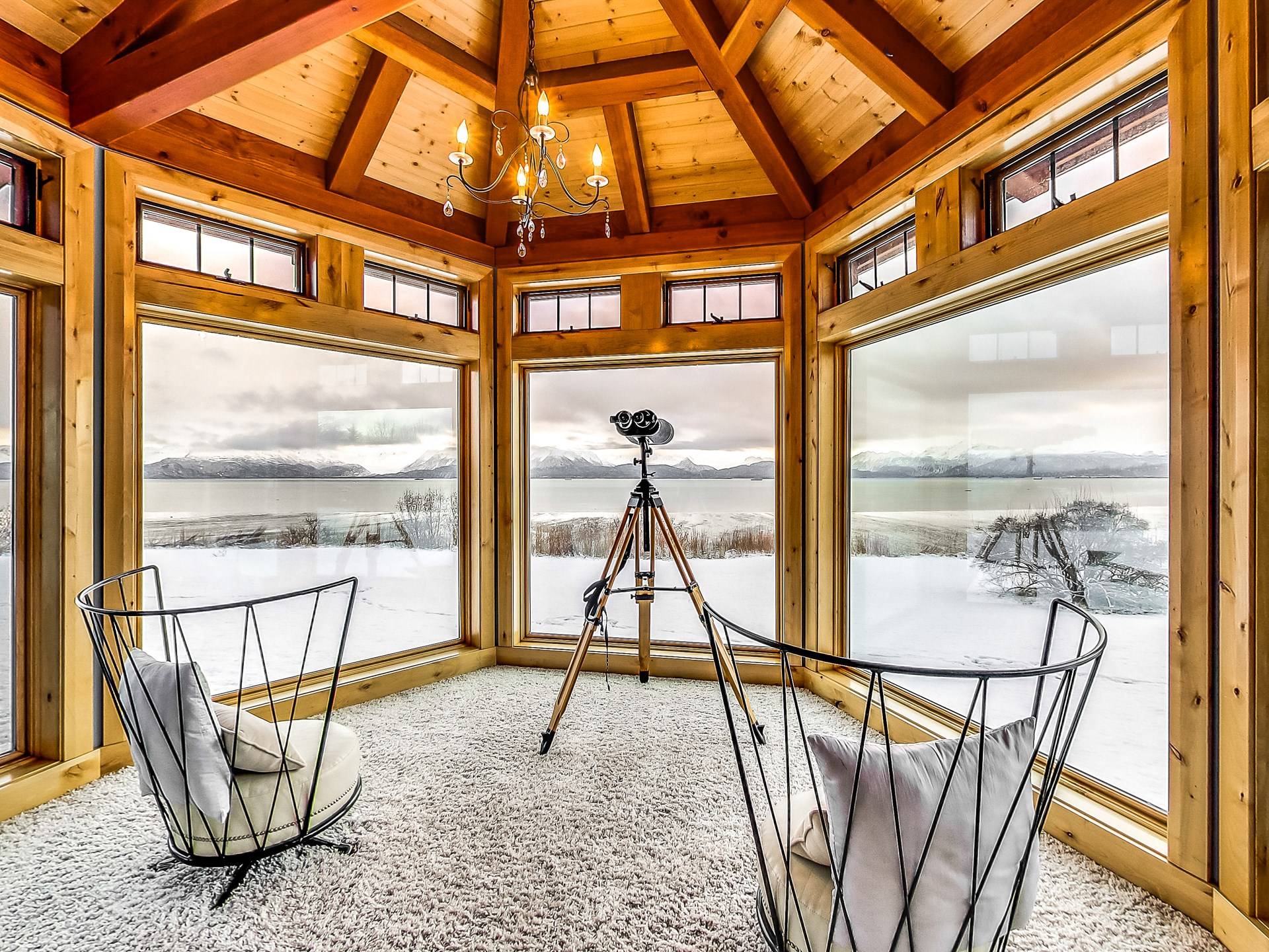 Promenez-vous dans la somptueuse bibliothèque perchée au-dessus de l'océan pour lire un livre. Observez la faune de l'Alaska à travers le télescope géant dans des phoques ressemblant à une véranda à 270 degrés prenant le soleil sur les rochers en contrebas. Profitez de la cuisine dans une fabuleuse cuisine gastronomique; blottissez-vous devant l'une des 4 cheminées pour S'mores, préparez des pizzas maison dans le four à pizza extérieur au feu de bois. Ou vous pouvez simplement vous détendre sur la terrasse privée de 3000 pieds carrés juste au-dessus d'un paradis en bord de mer avec une vue inoubliable sur les eaux de la baie de Kachemak et les montagnes merveilleuses et les glaciers immaculés qui l'entourent.