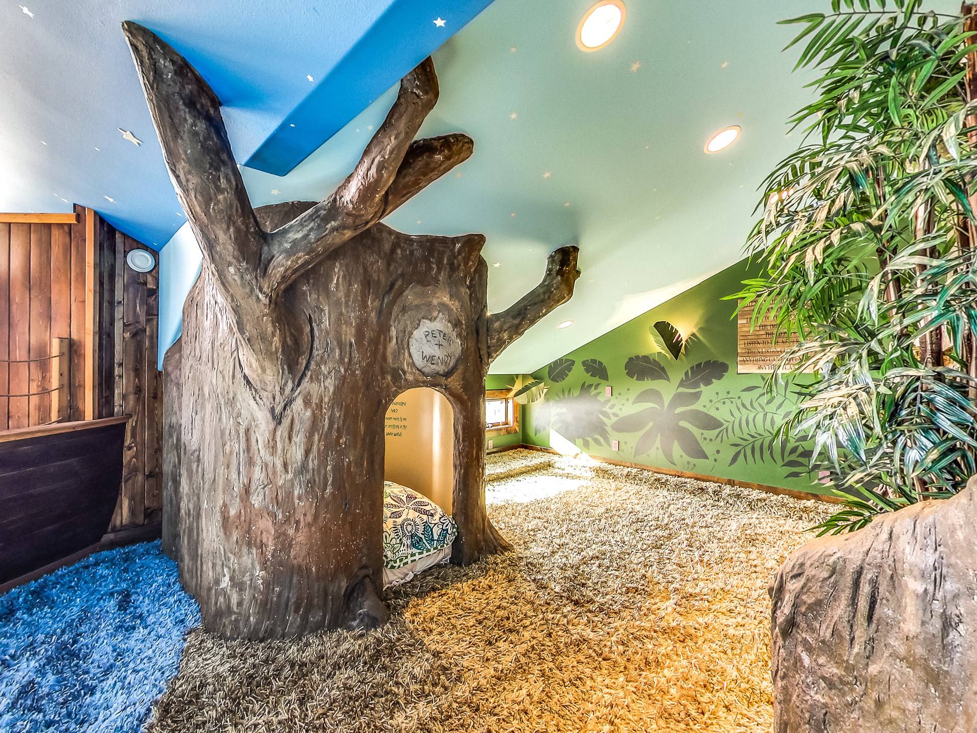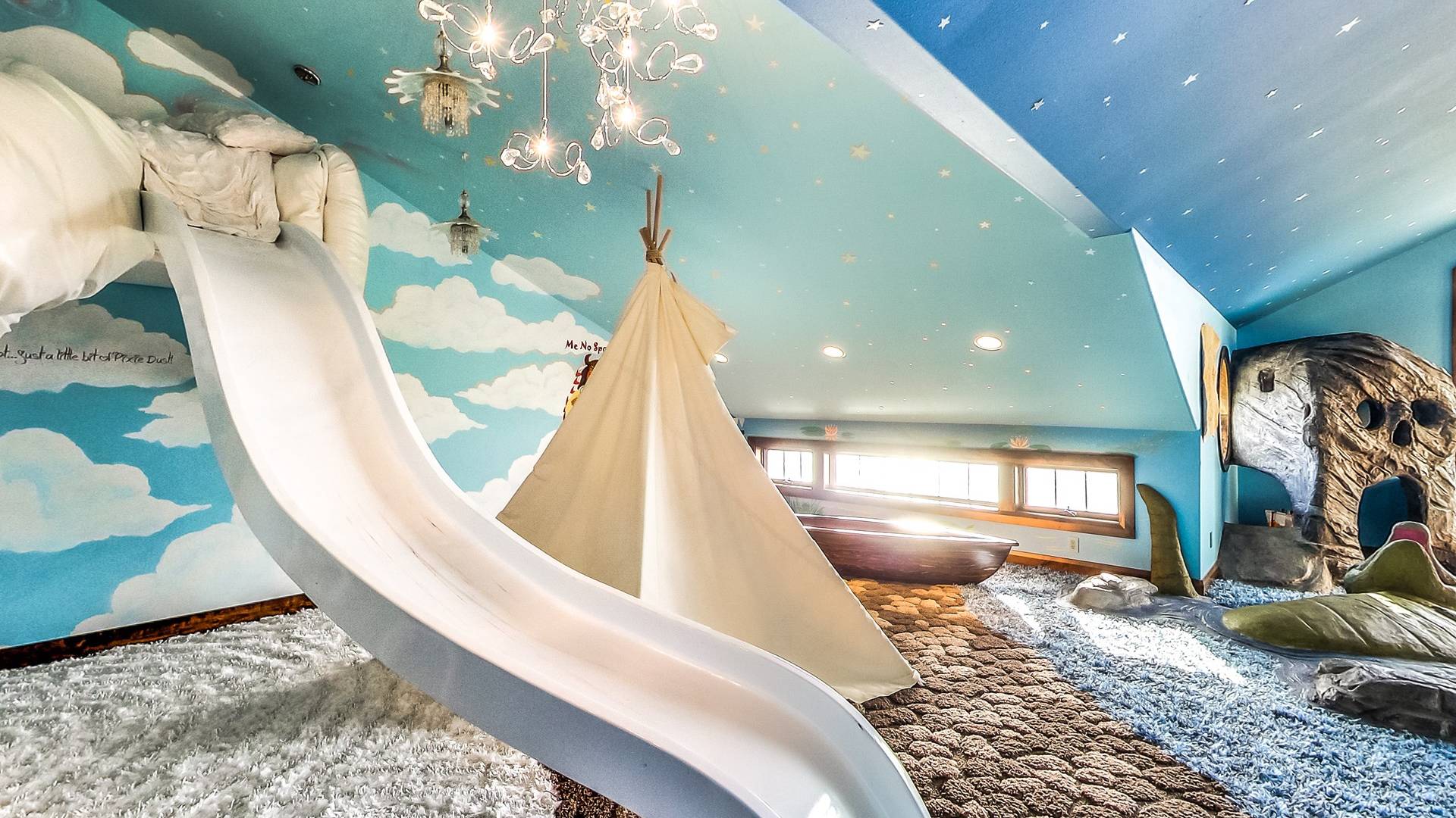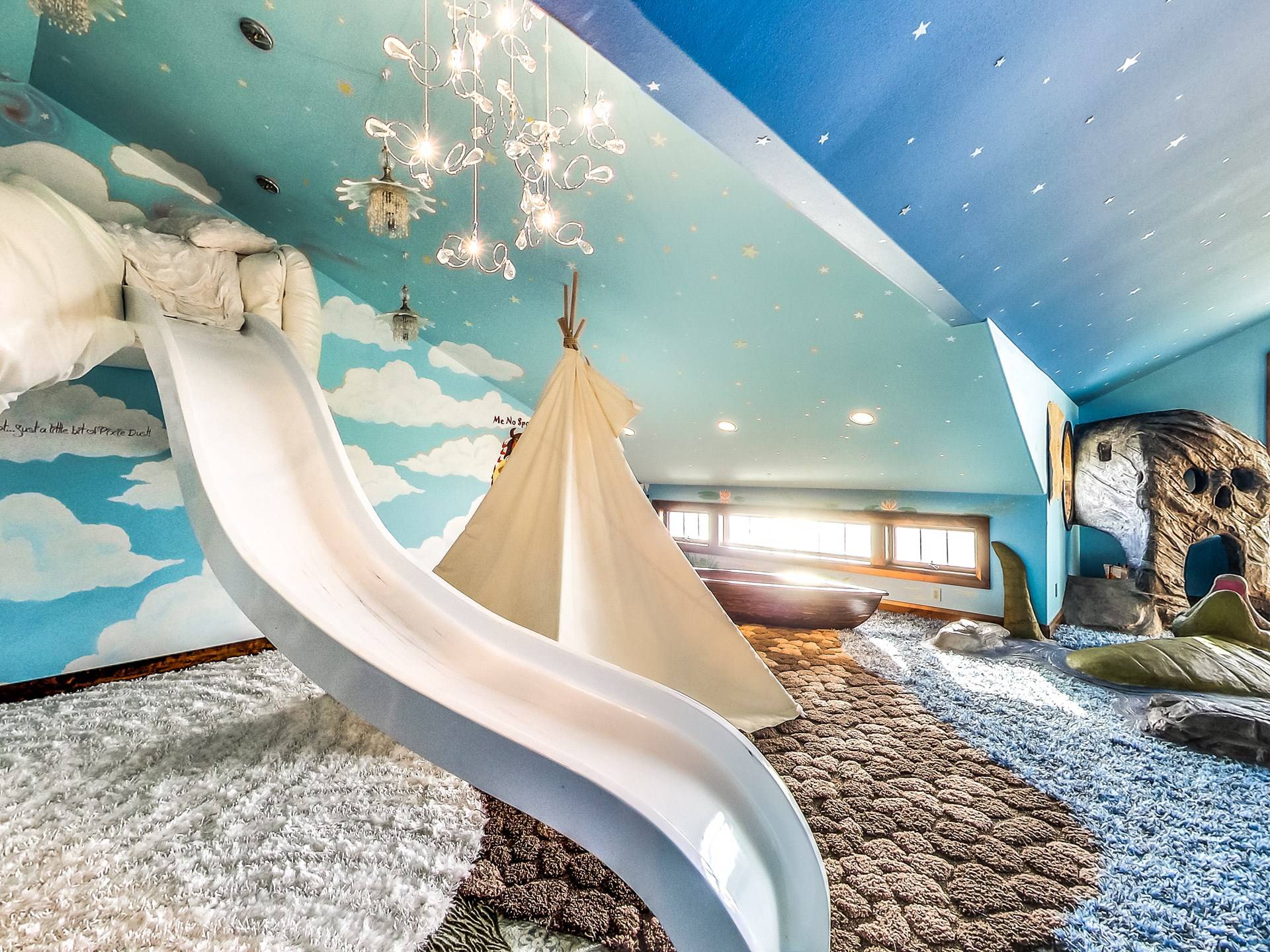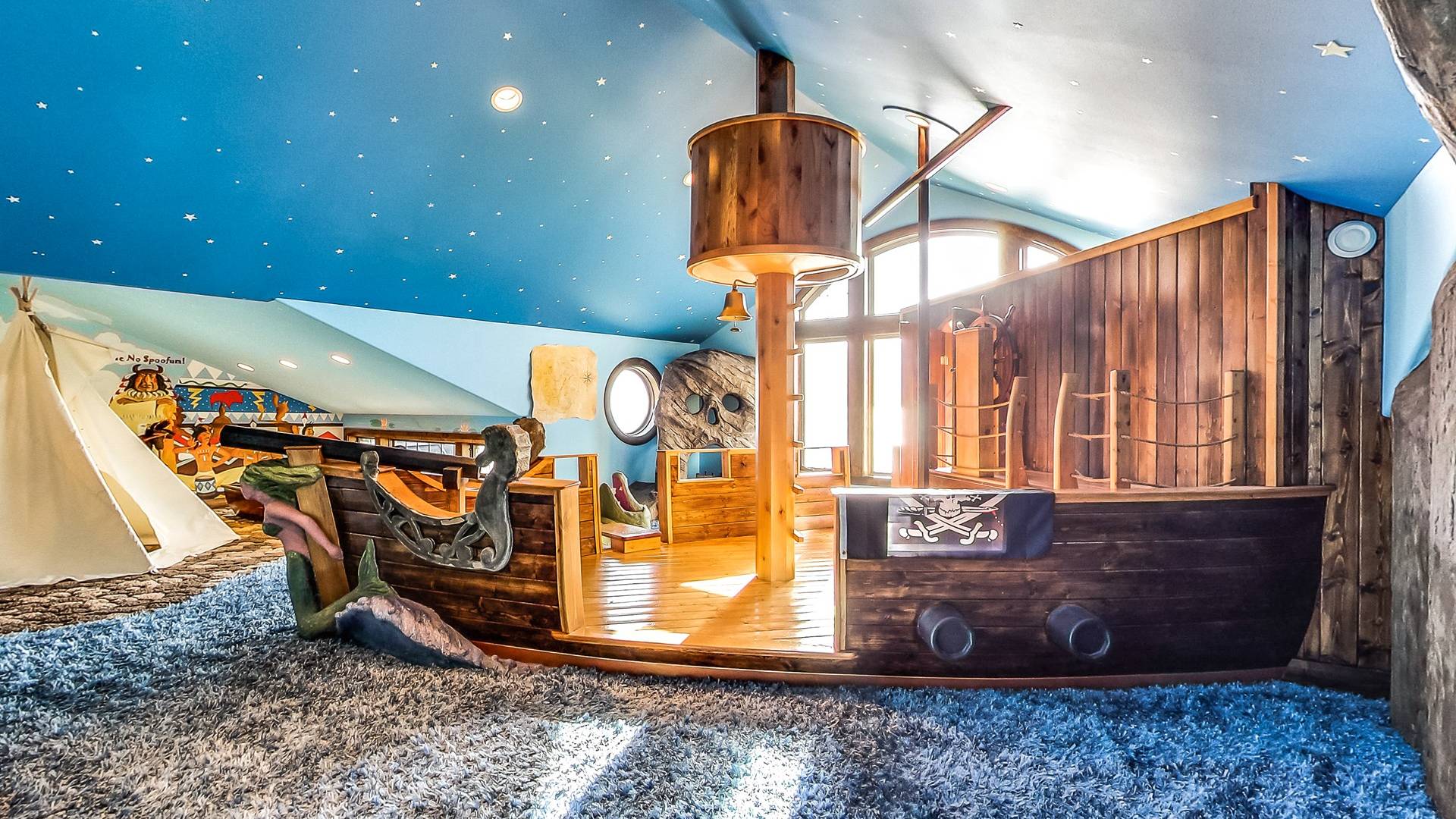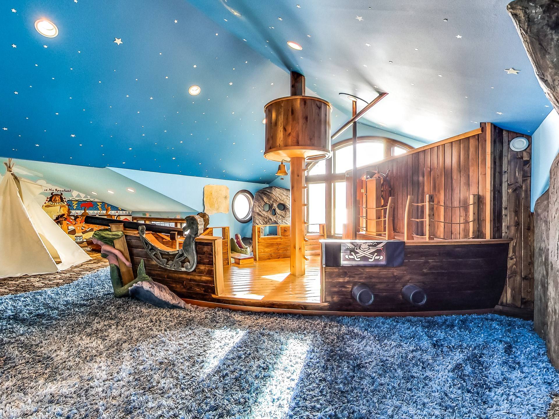 Les enfants, petits et grands, peuvent grimper, glisser, rêver et jouer dans un Neverland de 2 000 pieds carrés avec bateau pirate. Prenez soin de vous dans votre propre aile SPA privée qui comprend une piscine intérieure, un hammam, un bain turc, une salle de massage et un sauna infrarouge. Jouez au jeu de palets ou au baby-foot dans la salle de jeux spacieuse. Assistez à un film dans un immense théâtre personnalisé (avec un passage secret vers un magasin de bonbons).