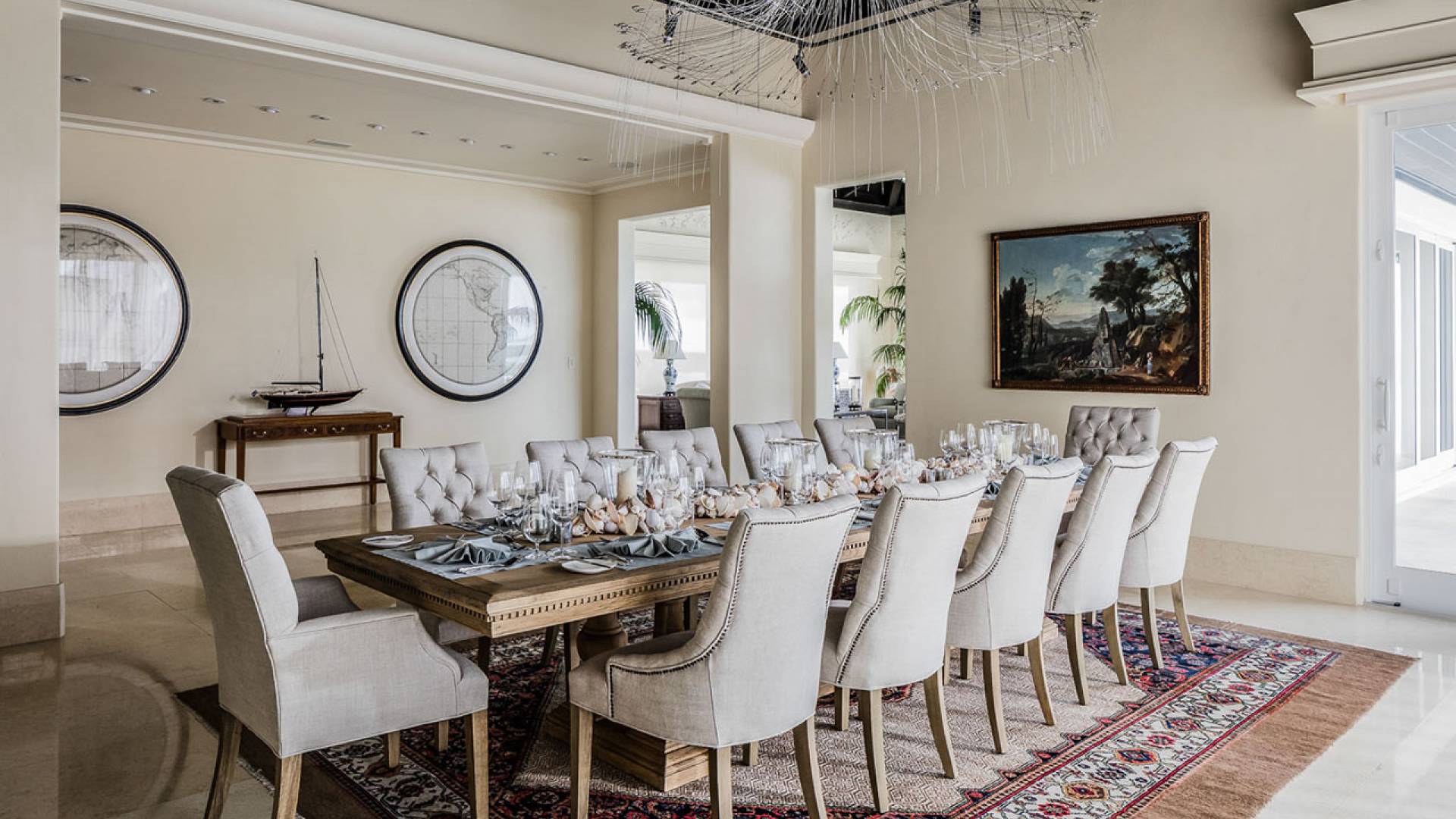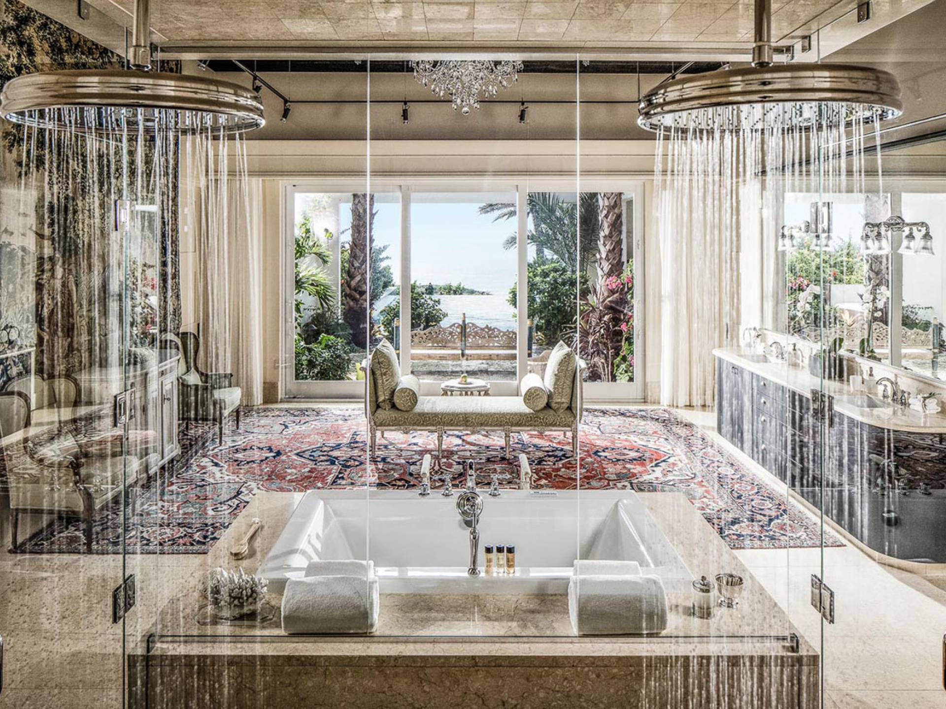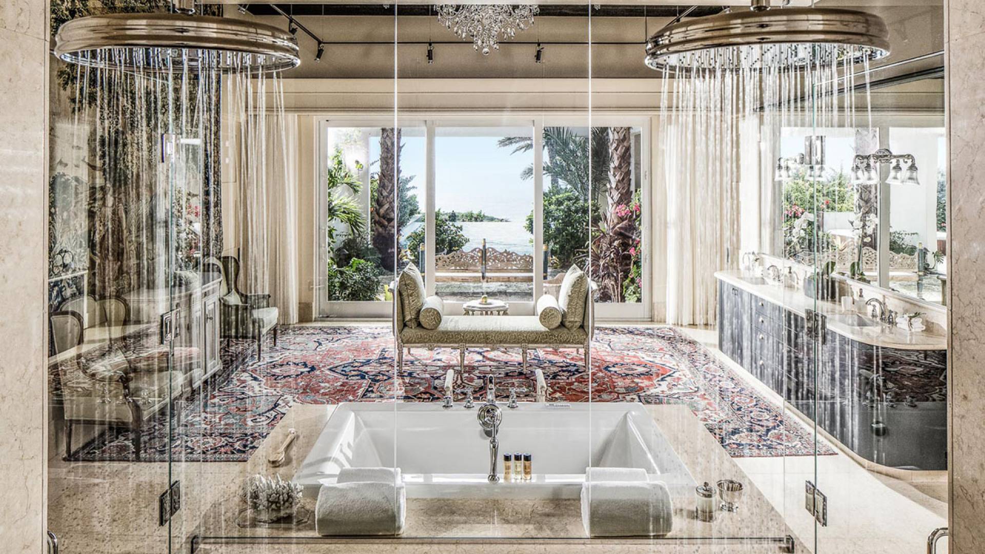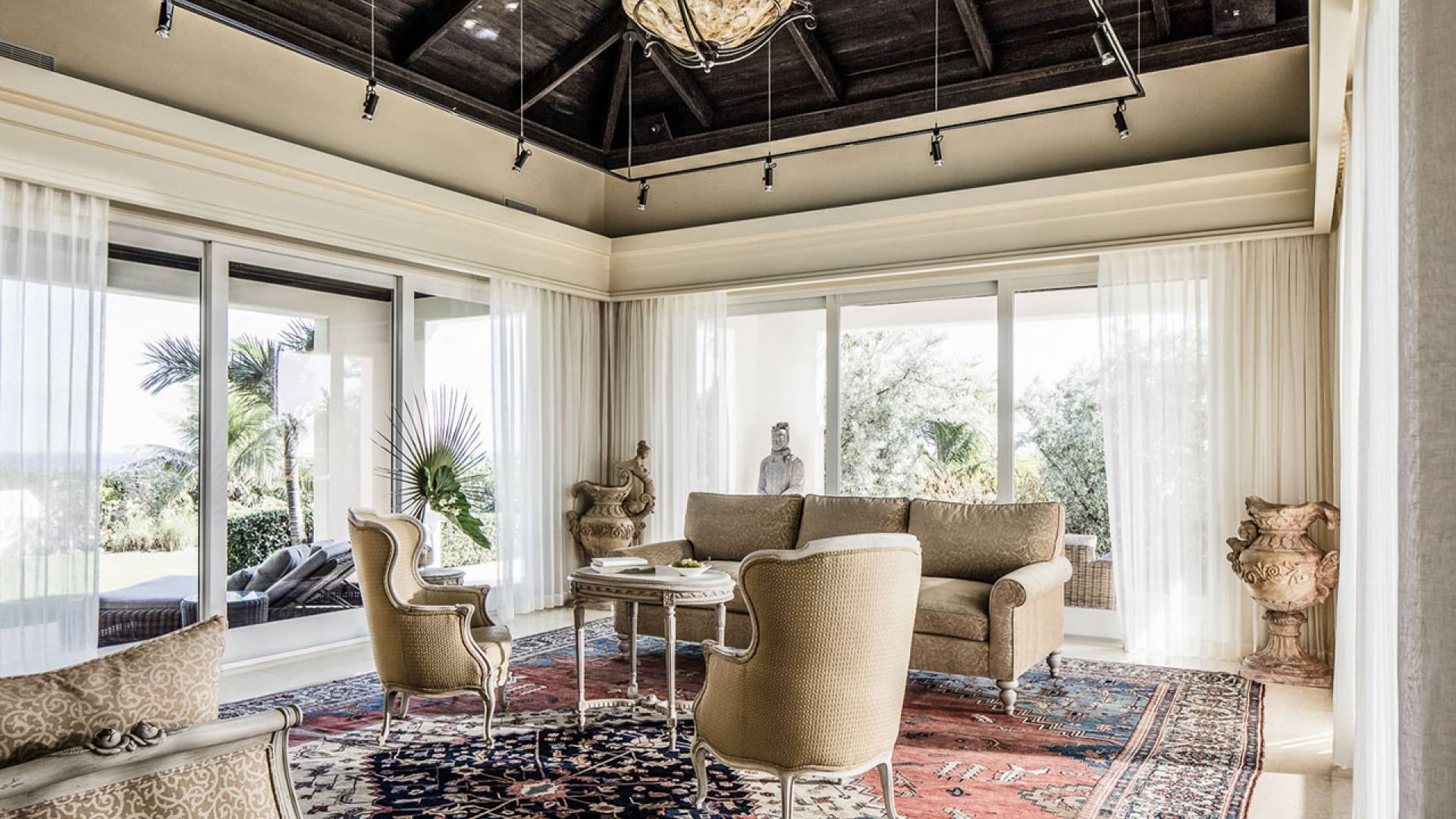 Le décor rococo éclectique et fantaisiste de la villa offre un cadre haut de gamme mais détendu pour les réunions de groupe, du grand conservatoire avec ses vues à couper le souffle et son piano Steinway à l'intimité de la salle de cinéma de luxe de 12 places. La villa est l'un des pôles d'activité de l'île en raison de ses nombreuses installations. L'hébergement de cette villa comprend une suite principale de 2 300 pieds carrés (214 m²) avec une tour d'observation, un jardin privé, un dressing, un salon et une salle de bain spacieuse. Les trois suites d'invités de 62 m² disposent chacune d'une cour et d'une terrasse privées.