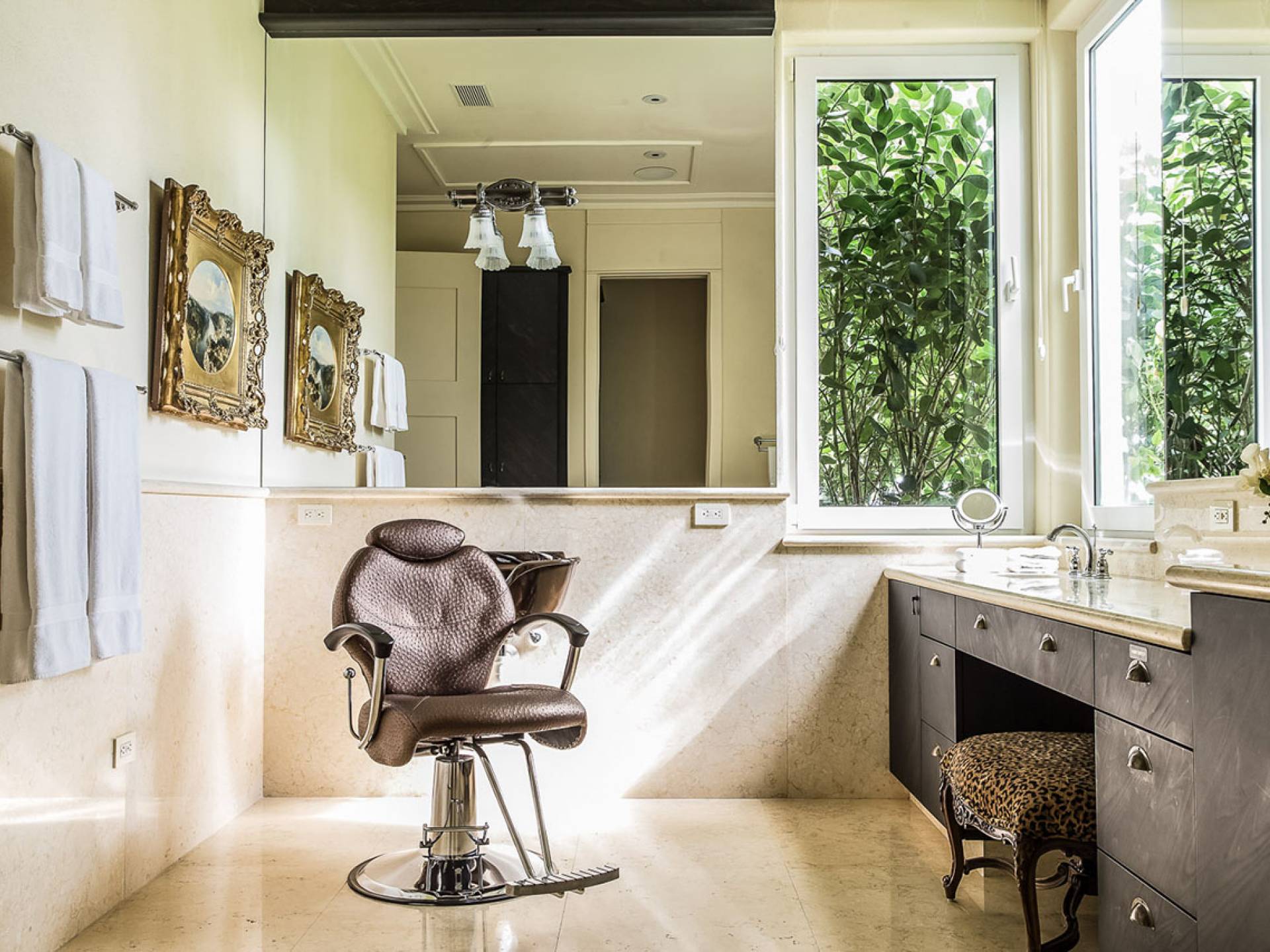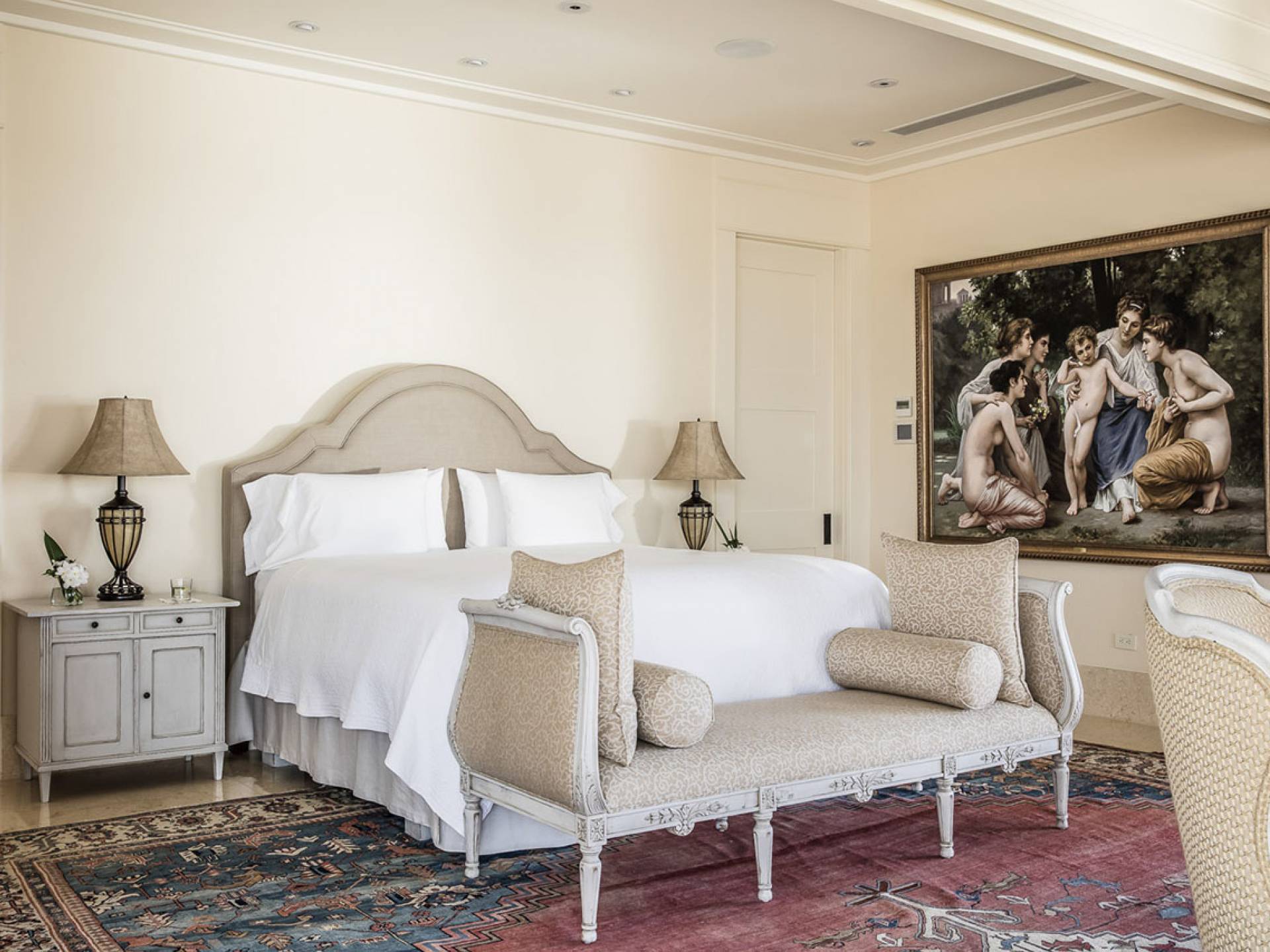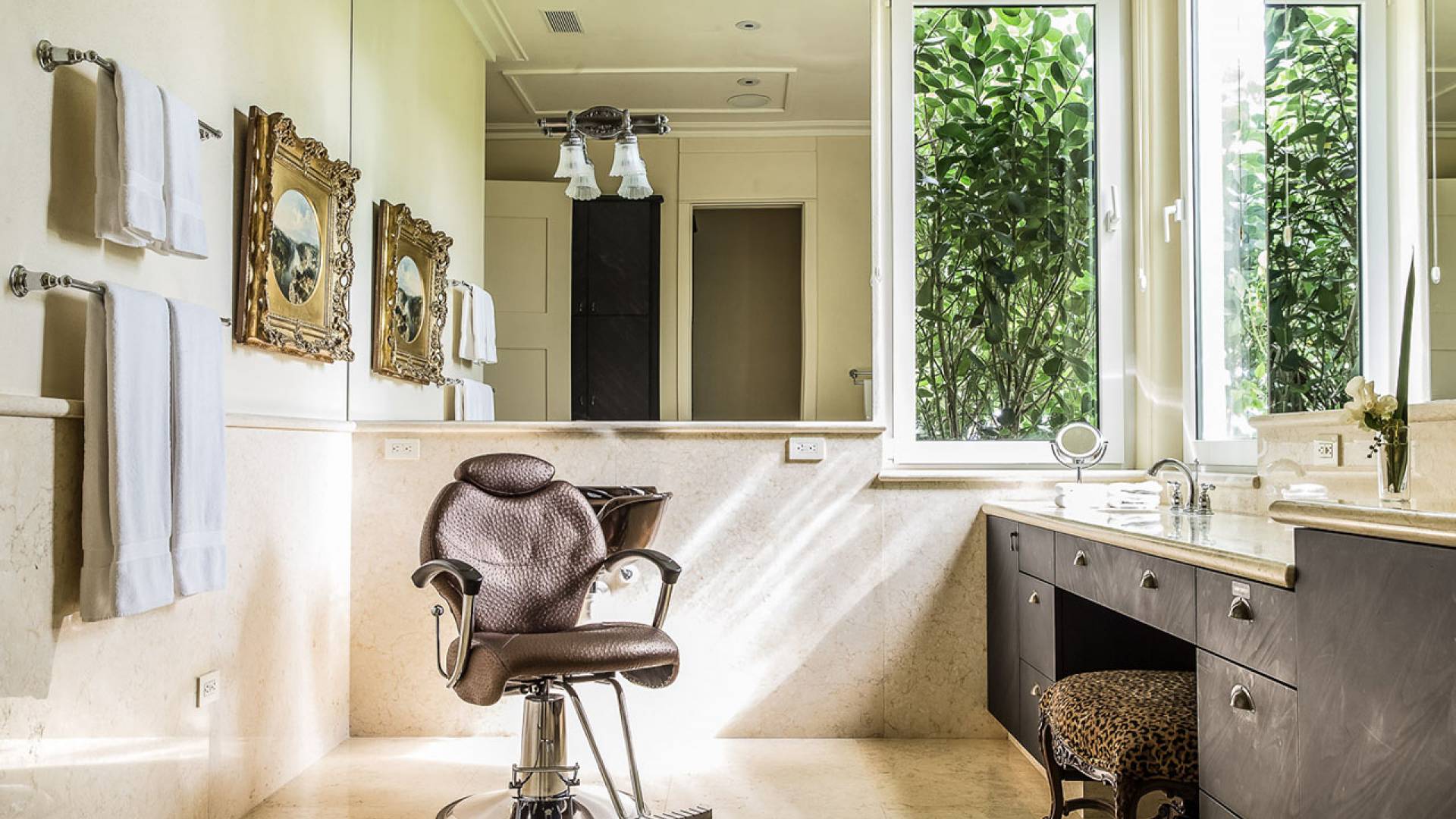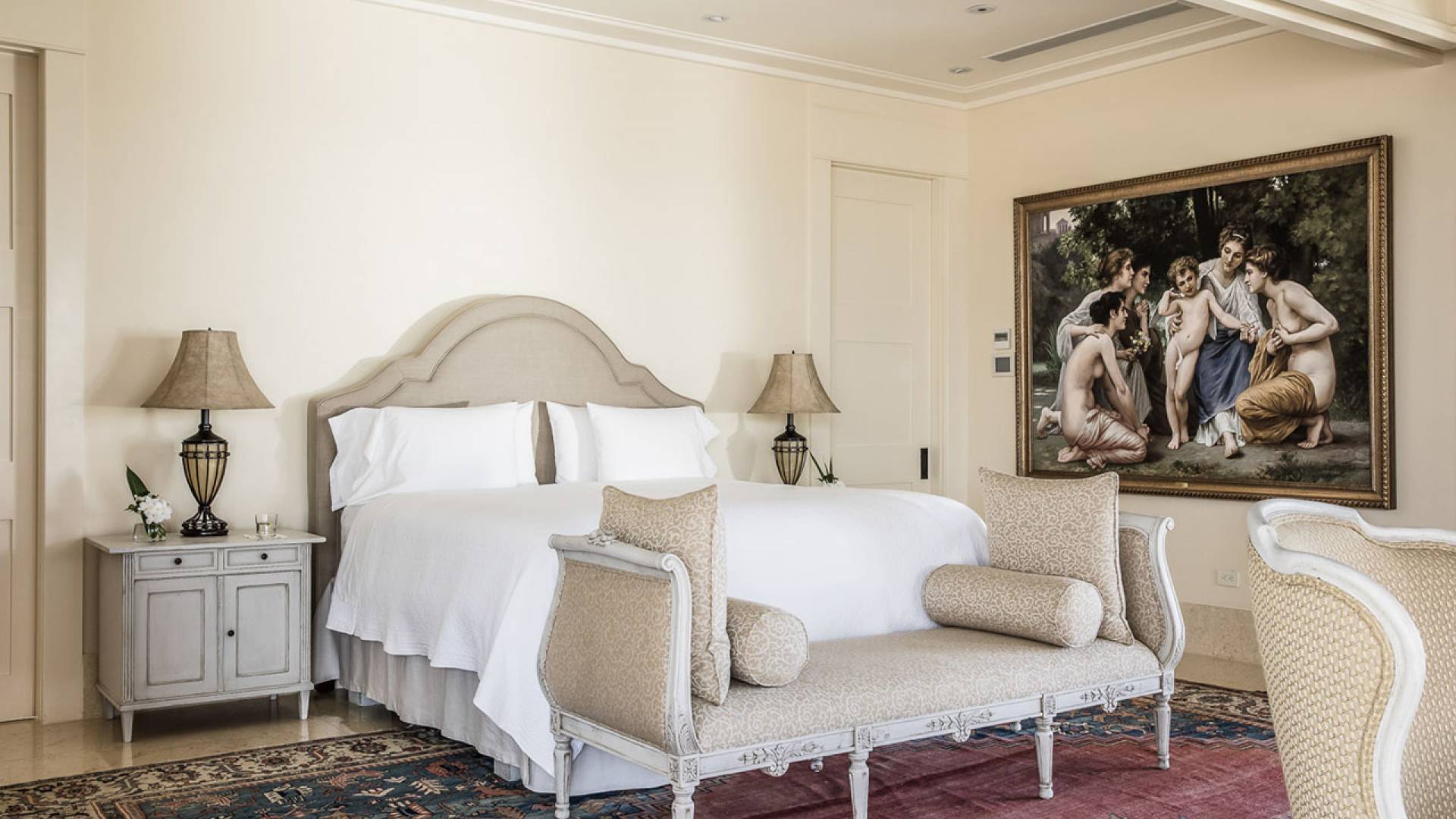 Le décor rococo éclectique et fantaisiste de la villa offre un cadre haut de gamme mais détendu pour les réunions de groupe, du grand conservatoire avec ses vues à couper le souffle et son piano Steinway à l'intimité de la salle de cinéma de luxe de 12 places. La villa est l'un des pôles d'activité de l'île en raison de ses nombreuses installations. L'hébergement de cette villa comprend une suite principale de 2 300 pieds carrés (214 m²) avec une tour d'observation, un jardin privé, un dressing, un salon et une salle de bain spacieuse. Les trois suites d'invités de 62 m² disposent chacune d'une cour et d'une terrasse privées.