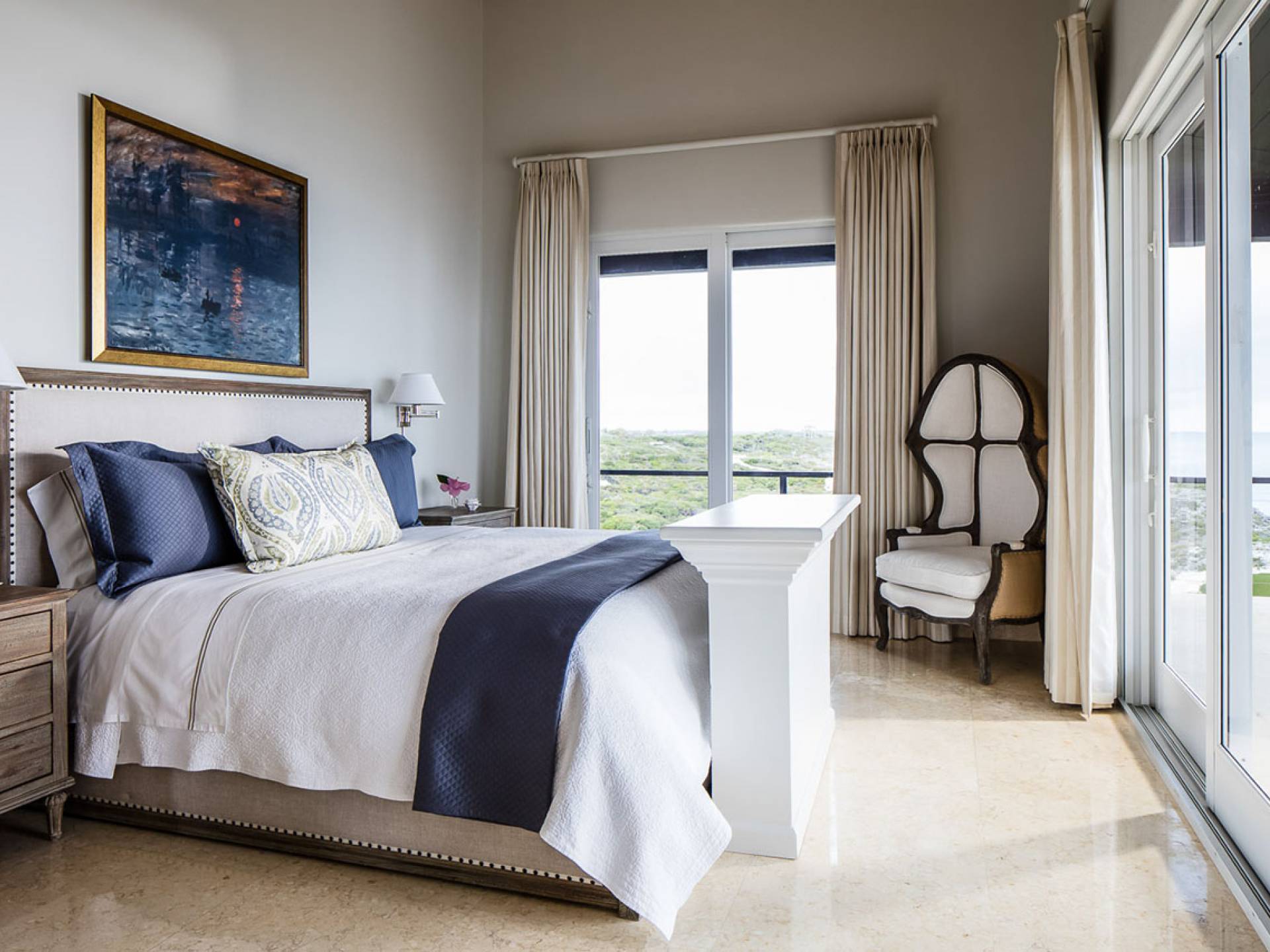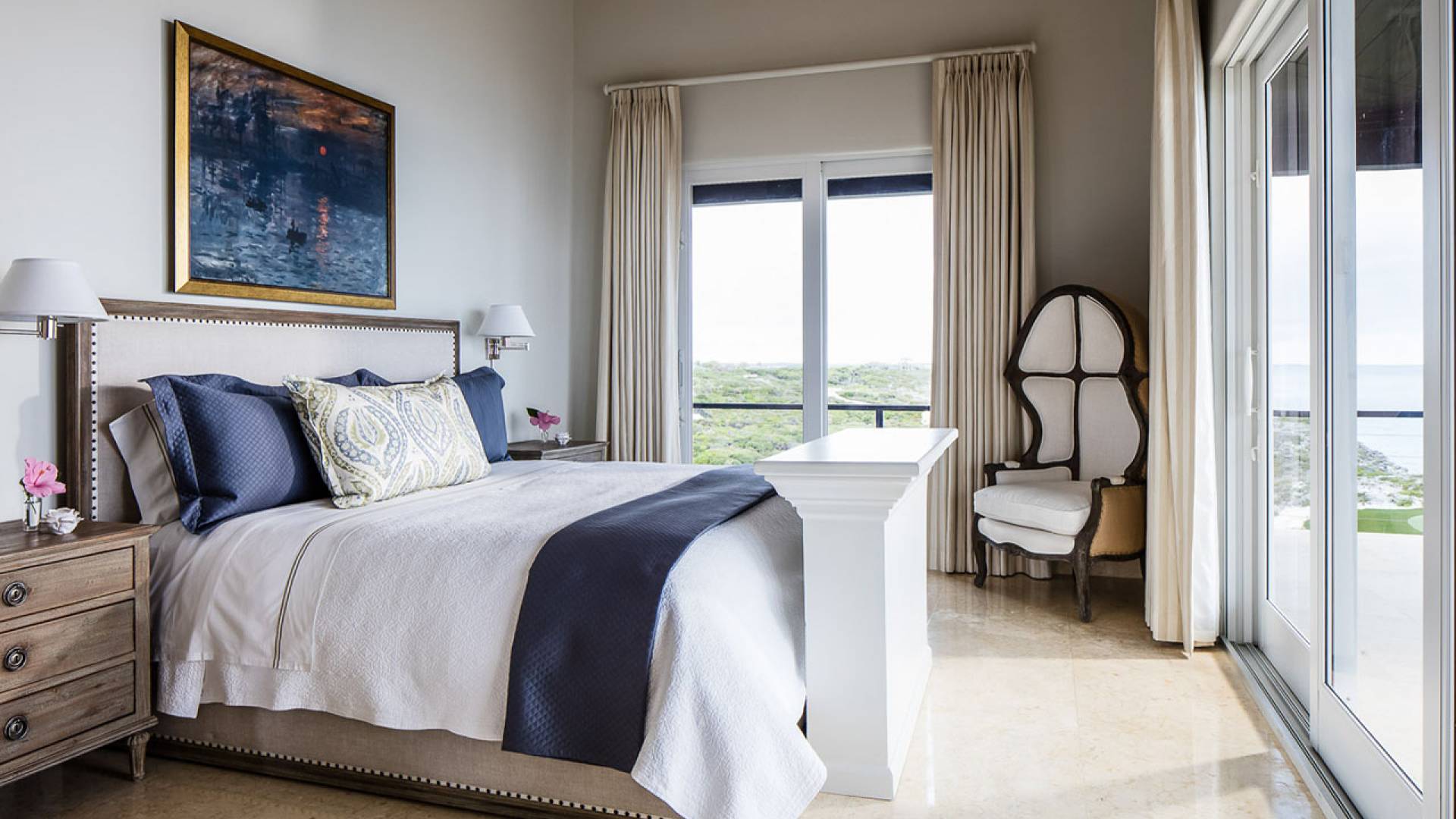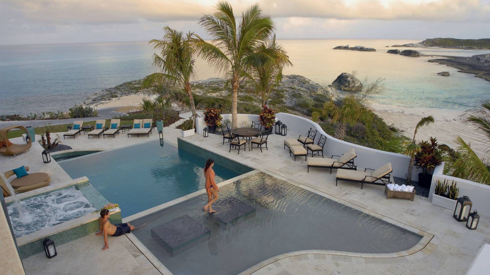 Depuis sa position élevée donnant sur le détroit d'Exuma, East Cove peut accueillir six à huit personnes dans quatre chambres. Un décor moderne-traditionnel est complété par le vaste salon au bord de la piscine de la villa. Les suites de 546 pieds carrés (51 m²) et 413 pieds carrés (38 m²) de la villa mènent à des balcons enveloppants avec des sièges supplémentaires. Les deux chambres d'hôtes de 352 pieds carrés (33 m²) ont des lits queen-size et des mezzanines pour une personne qui sont parfaites pour les enfants ; ils partagent une salle de bain hollywoodienne.