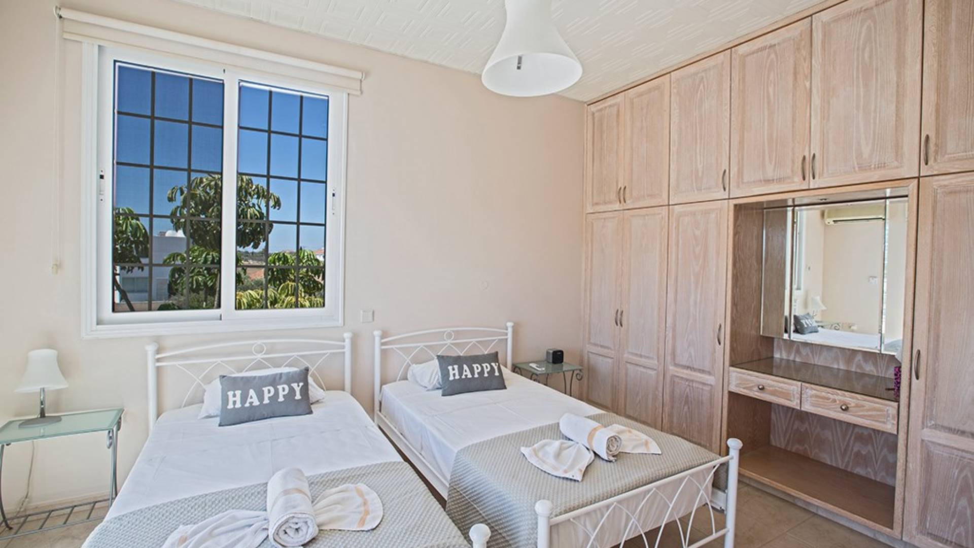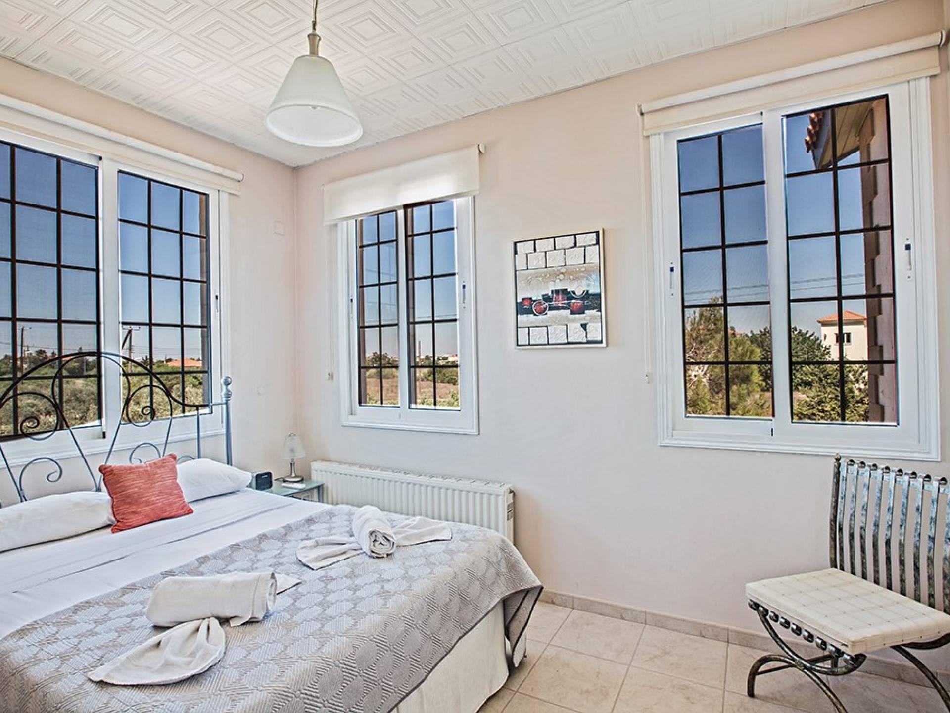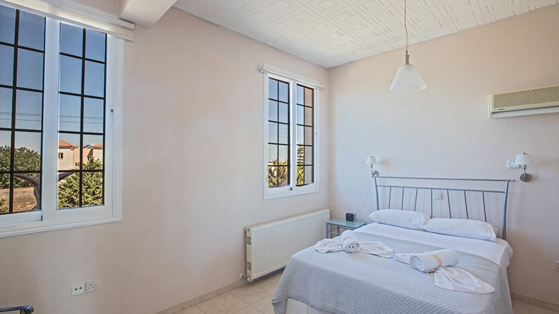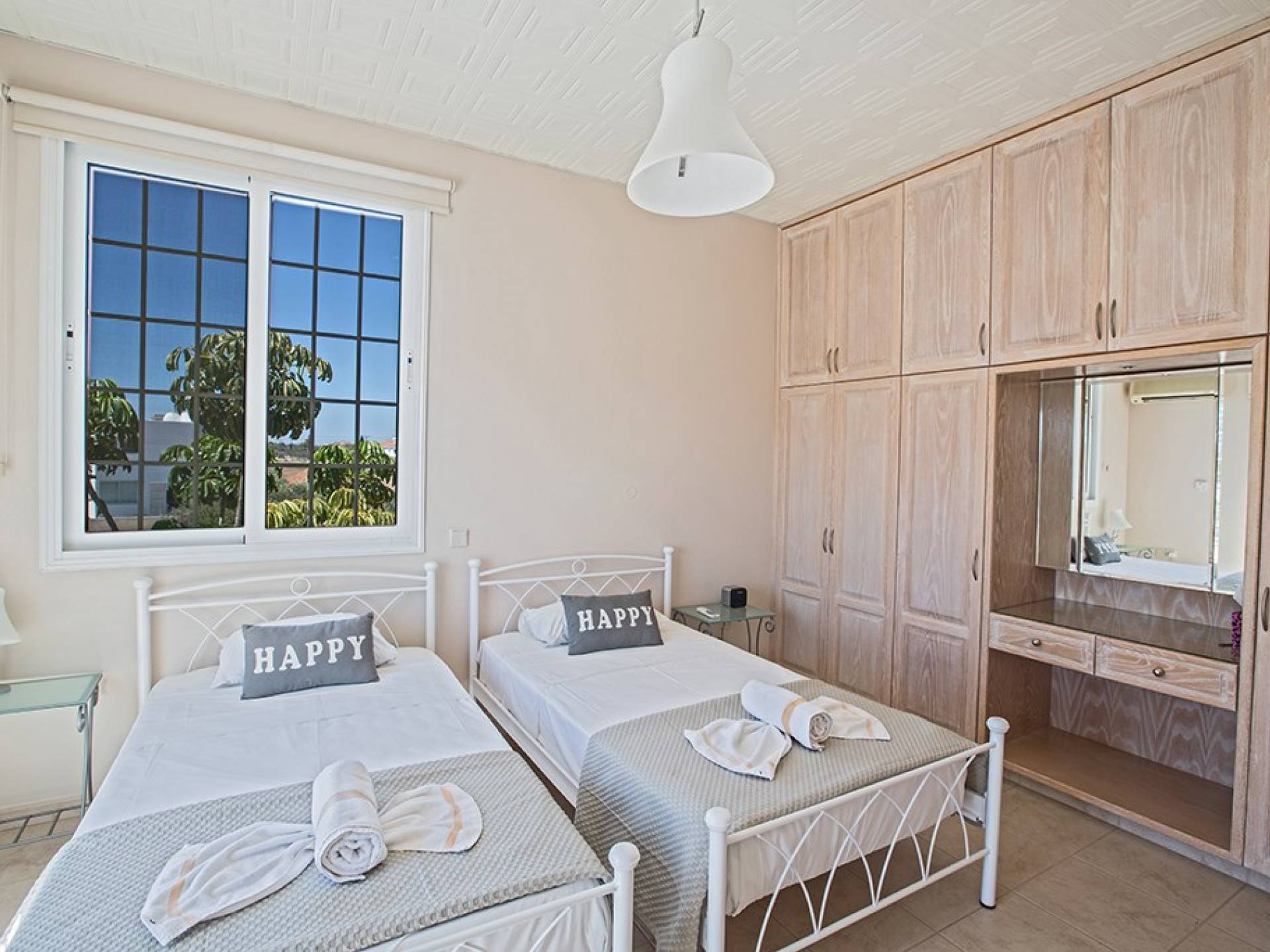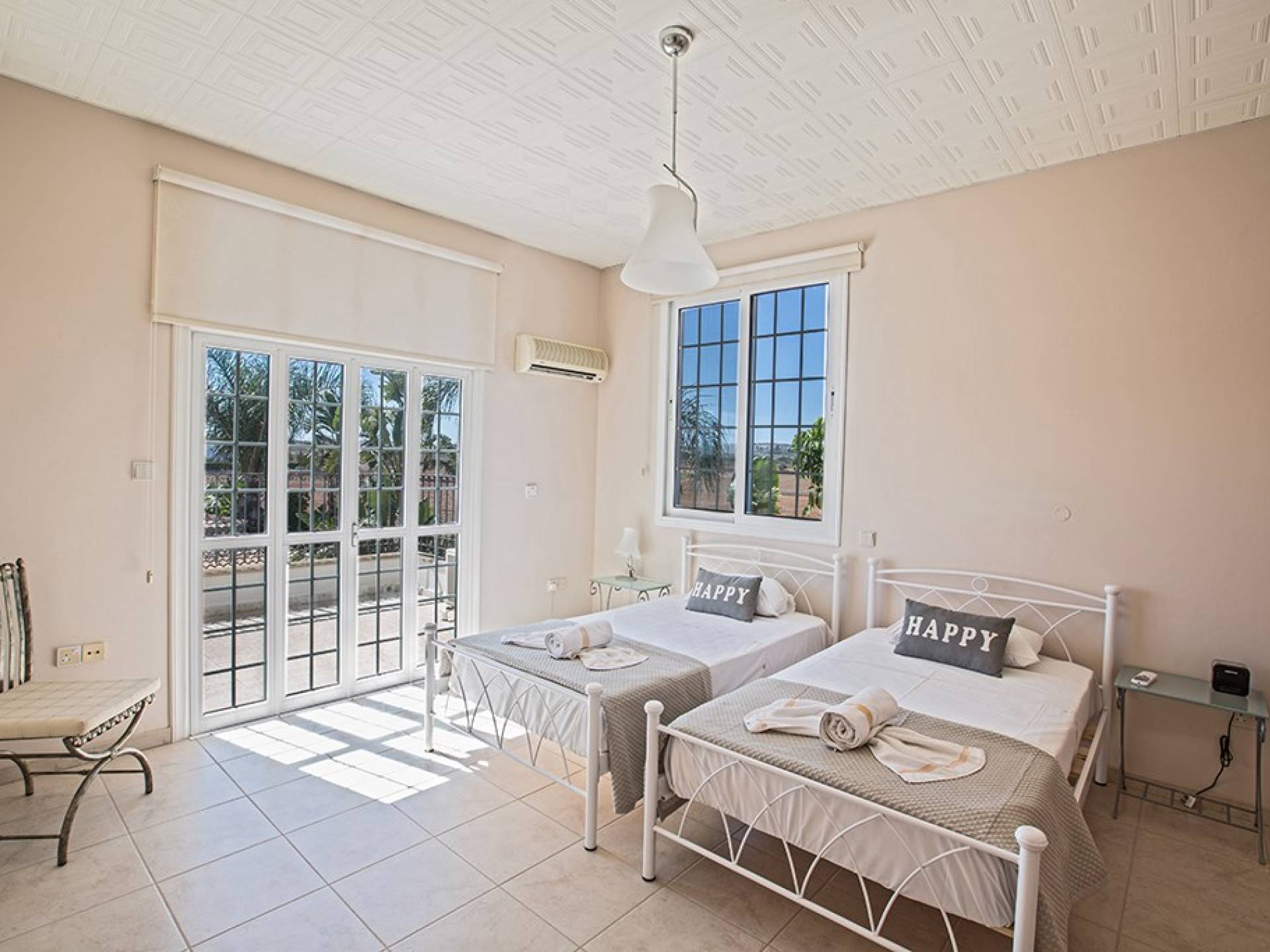 La villa principale dispose de quatre chambres doubles au premier étage. La première chambre a des lits jumeaux avec placards, une coiffeuse, deux tables de chevet et des portes-fenêtres s'ouvrant sur une grande véranda. La deuxième chambre, avec une salle de bain attenante, dispose d'un lit double, d'armoires encastrées, d'une coiffeuse, d'une table de chevet et de portes-fenêtres s'ouvrant sur une grande véranda. La troisième chambre a un lit double, des armoires encastrées, une coiffeuse et une table de chevet. La quatrième chambre a un lit king-size, des armoires encastrées, une coiffeuse et une table de chevet. Toutes les chambres ont leur propre sèche-cheveux.