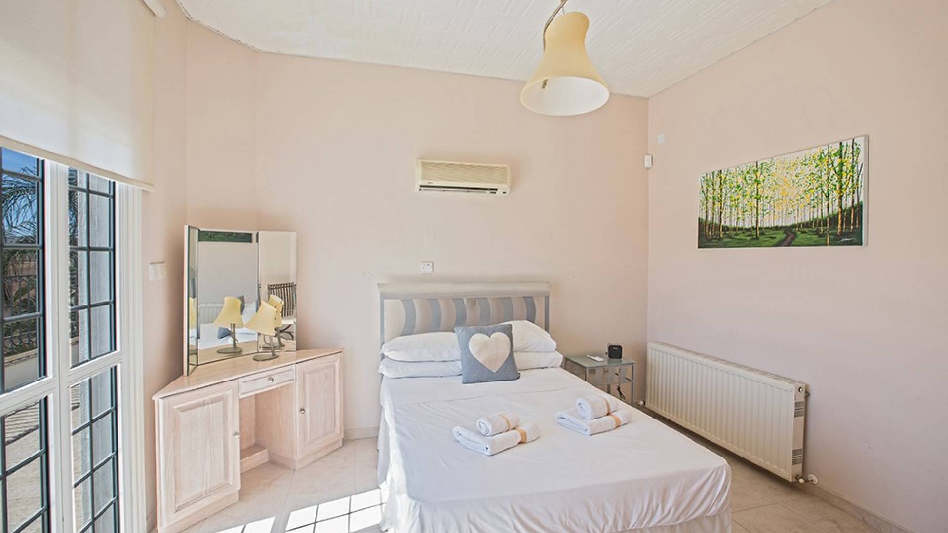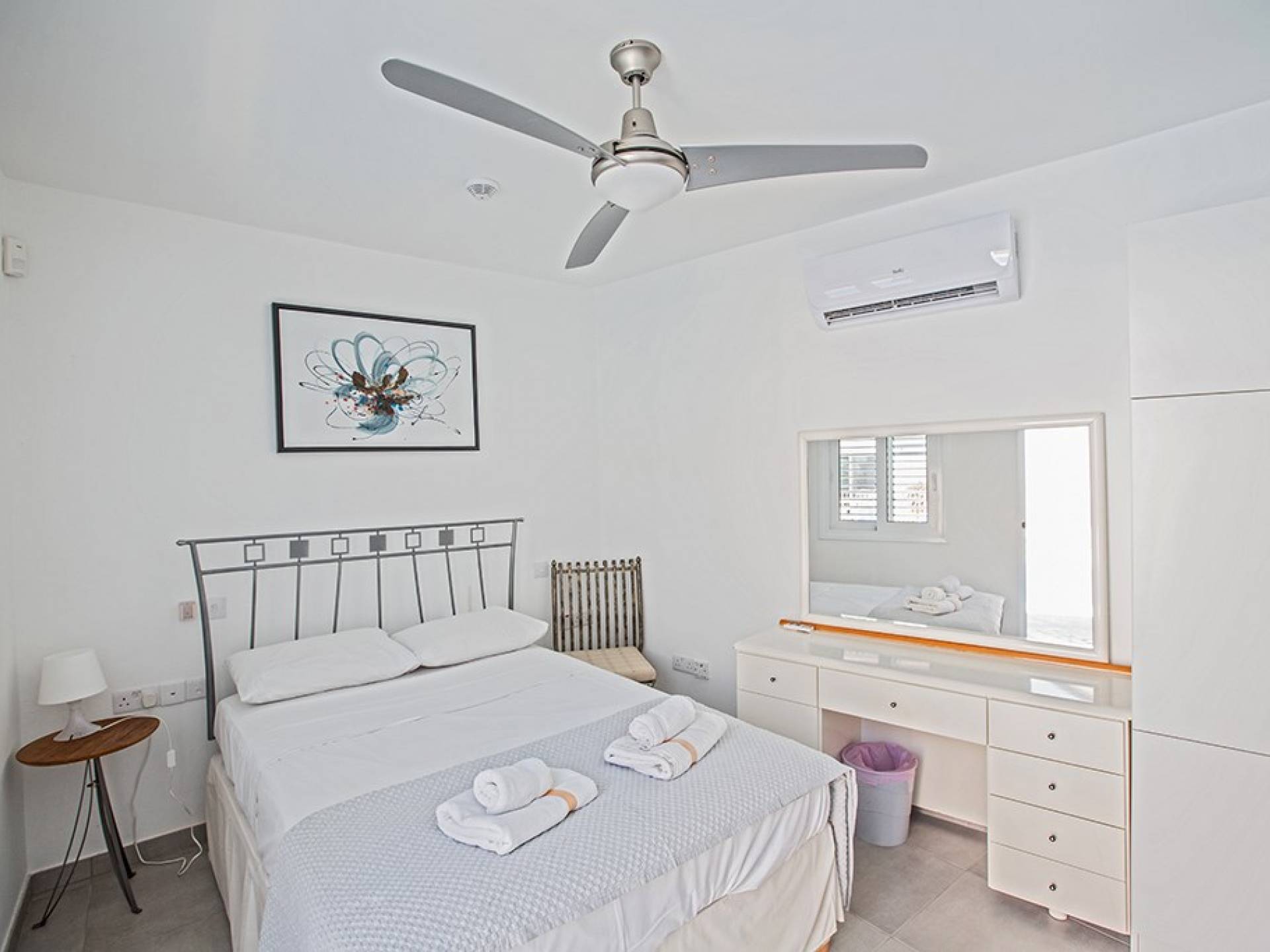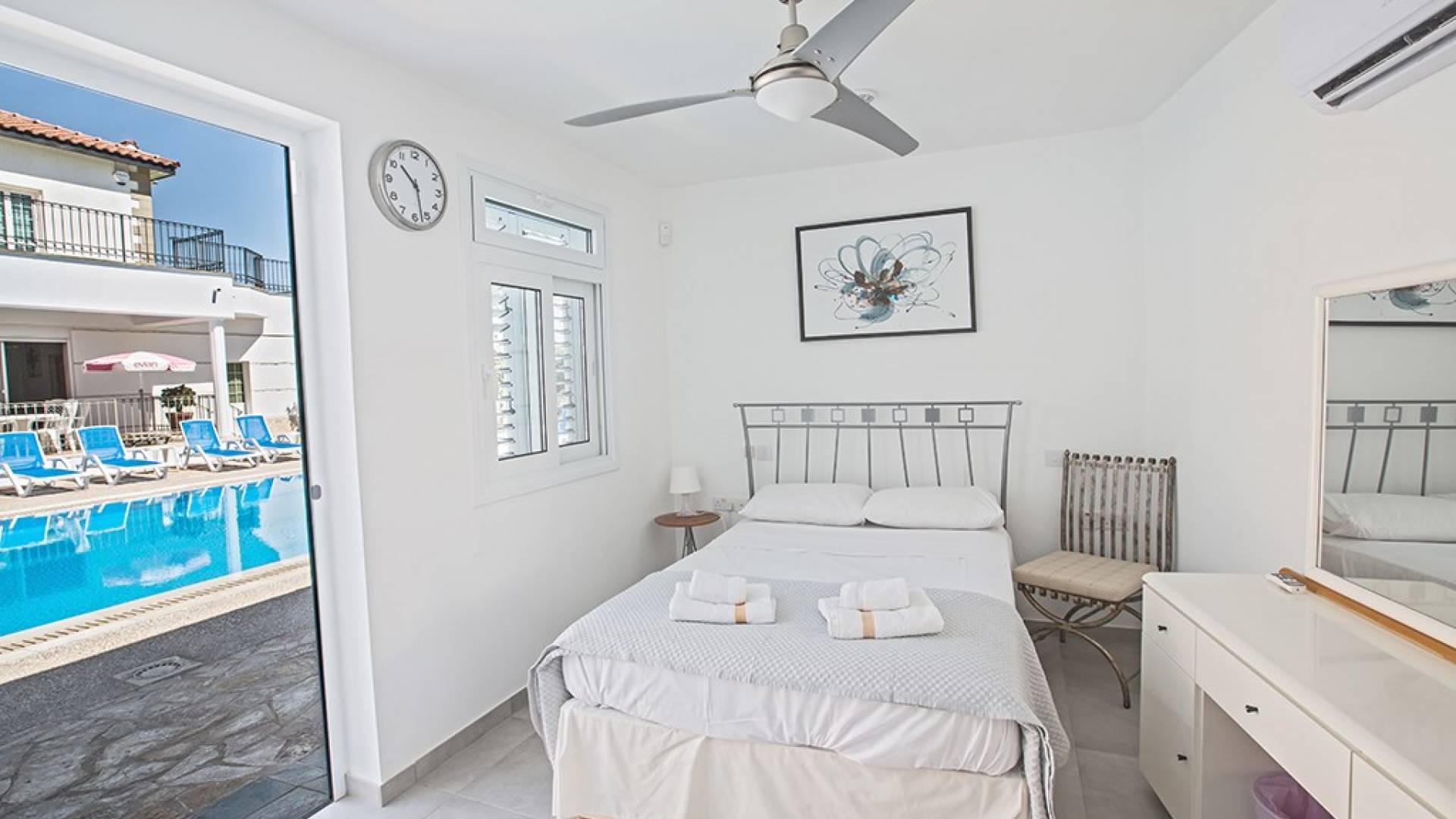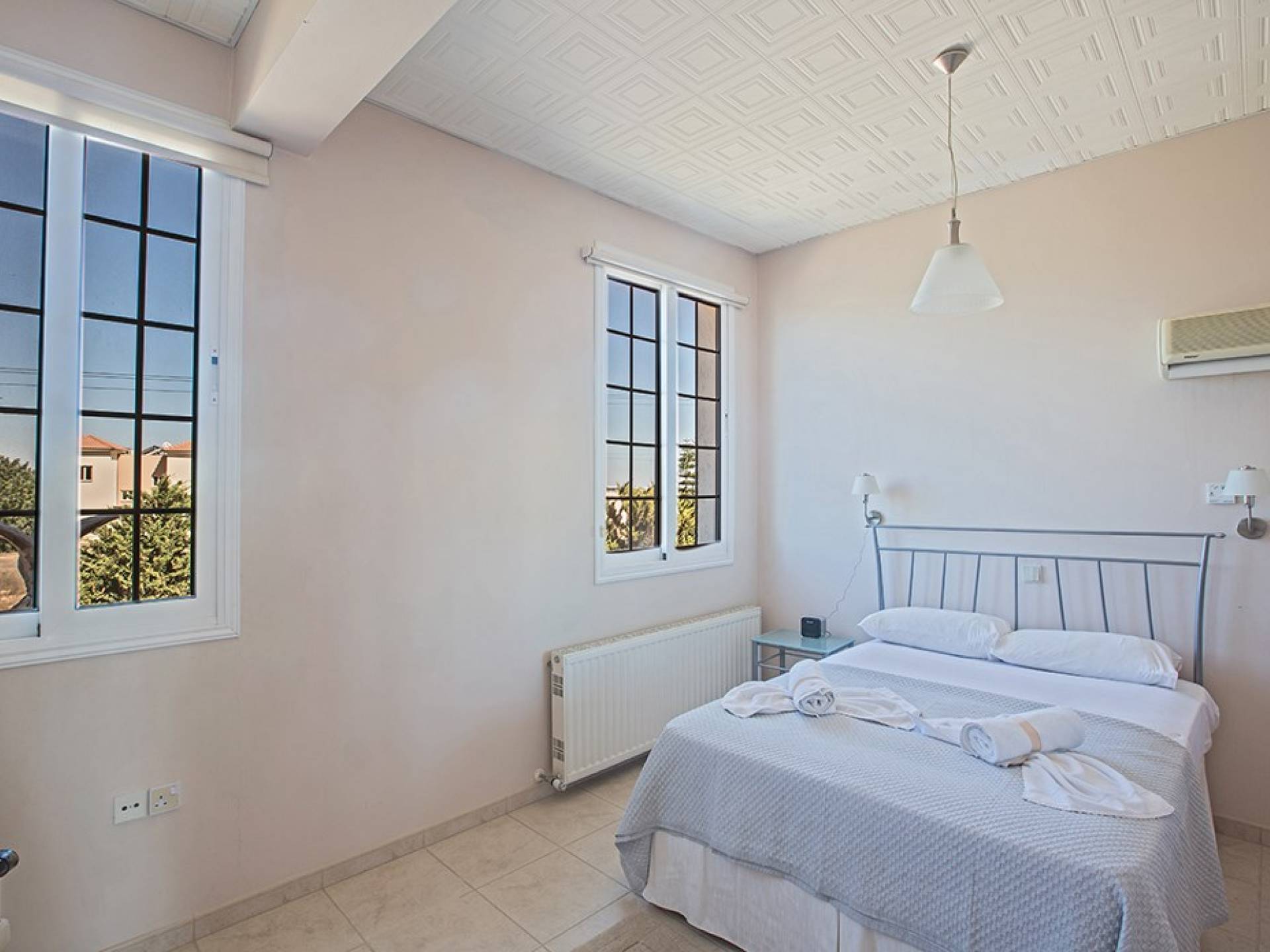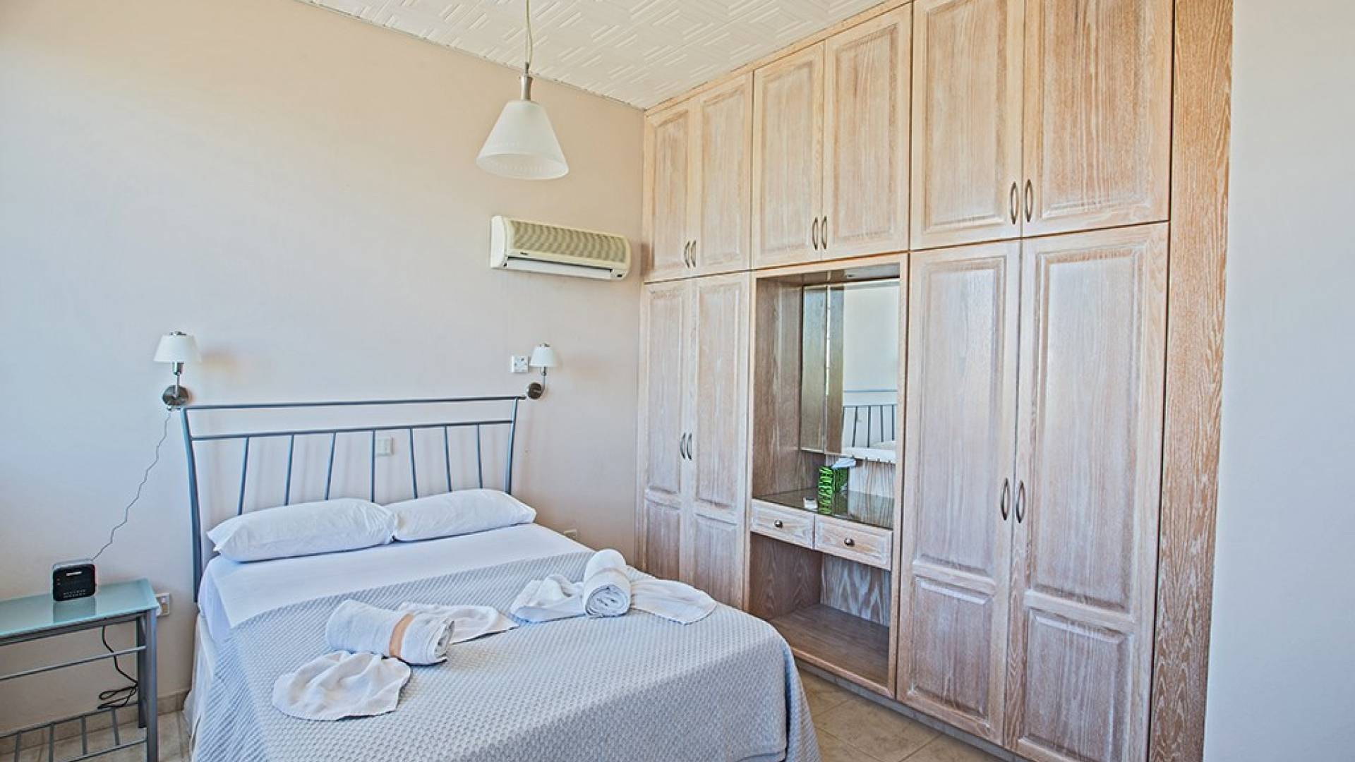 La villa principale dispose de quatre chambres doubles au premier étage. La première chambre a des lits jumeaux avec placards, une coiffeuse, deux tables de chevet et des portes-fenêtres s'ouvrant sur une grande véranda. La deuxième chambre, avec une salle de bain attenante, dispose d'un lit double, d'armoires encastrées, d'une coiffeuse, d'une table de chevet et de portes-fenêtres s'ouvrant sur une grande véranda. La troisième chambre a un lit double, des armoires encastrées, une coiffeuse et une table de chevet. La quatrième chambre a un lit king-size, des armoires encastrées, une coiffeuse et une table de chevet. Toutes les chambres ont leur propre sèche-cheveux.