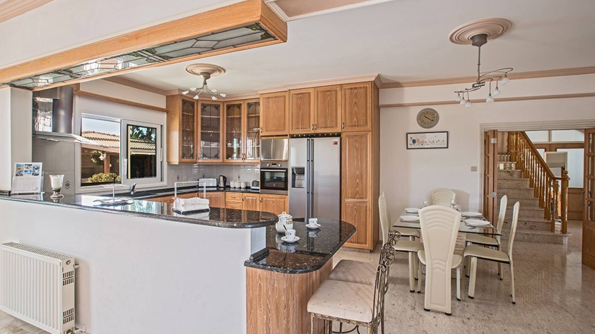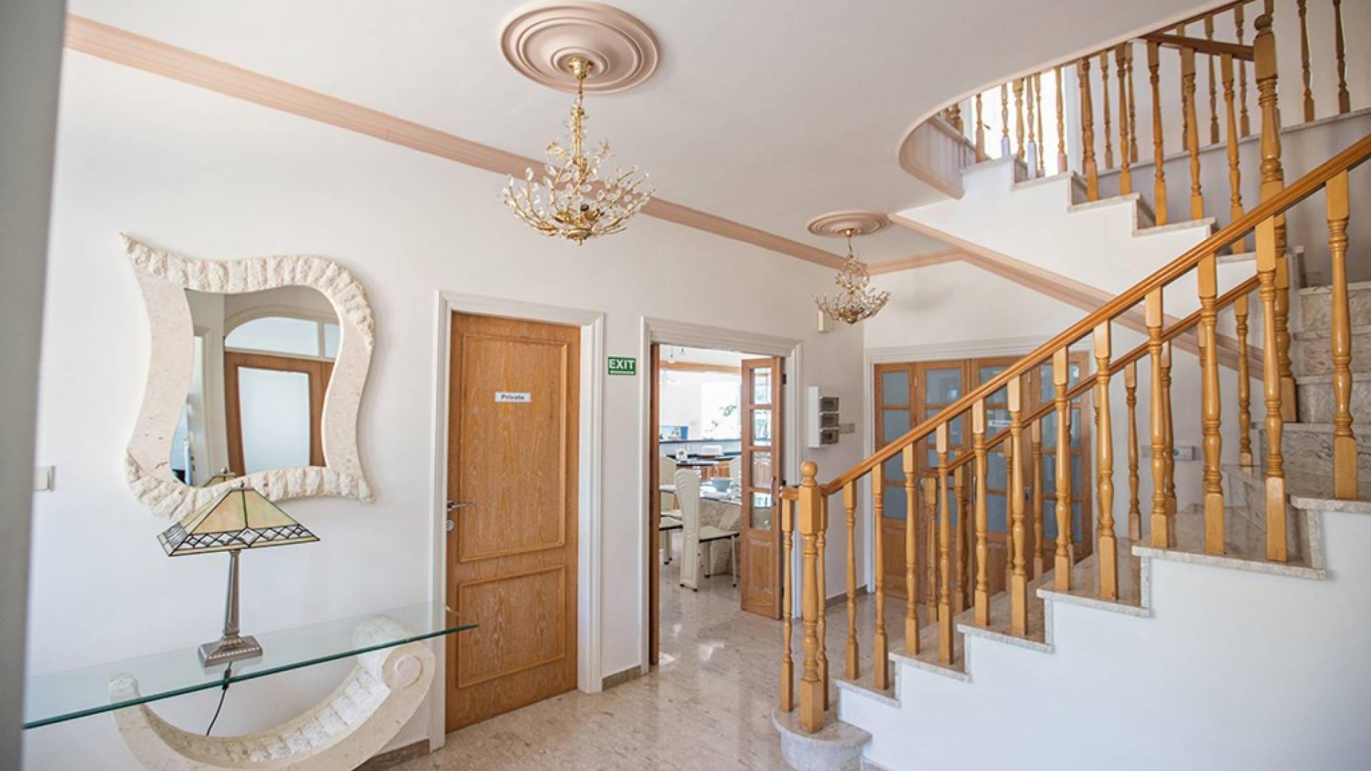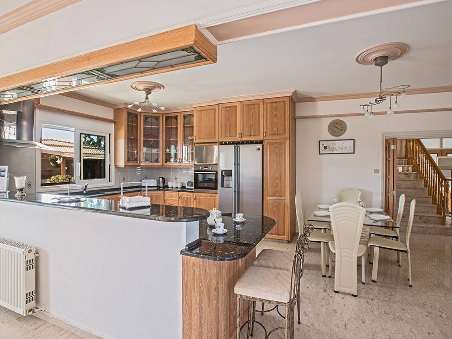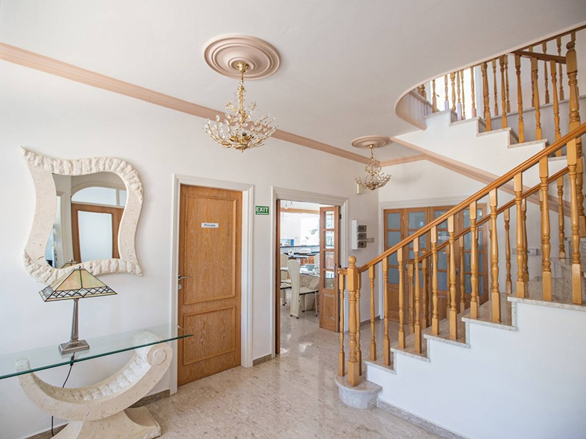Du hall spacieux de la villa principale se trouve la salle de réception ouverte donnant sur une grande véranda, une cuisine/salle à manger entièrement aménagée et équipée avec un réfrigérateur/congélateur de style américain, un four électrique, un four micro-ondes, une plaque de cuisson et une hotte aspirante . La machine à laver et le lave-vaisselle se trouvent dans la buanderie, à côté de la cuisine. En plus d'un vestiaire, le rez-de-chaussée dispose également de sa propre salle de sport.