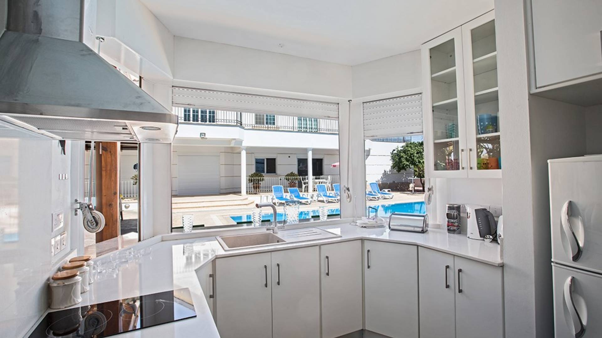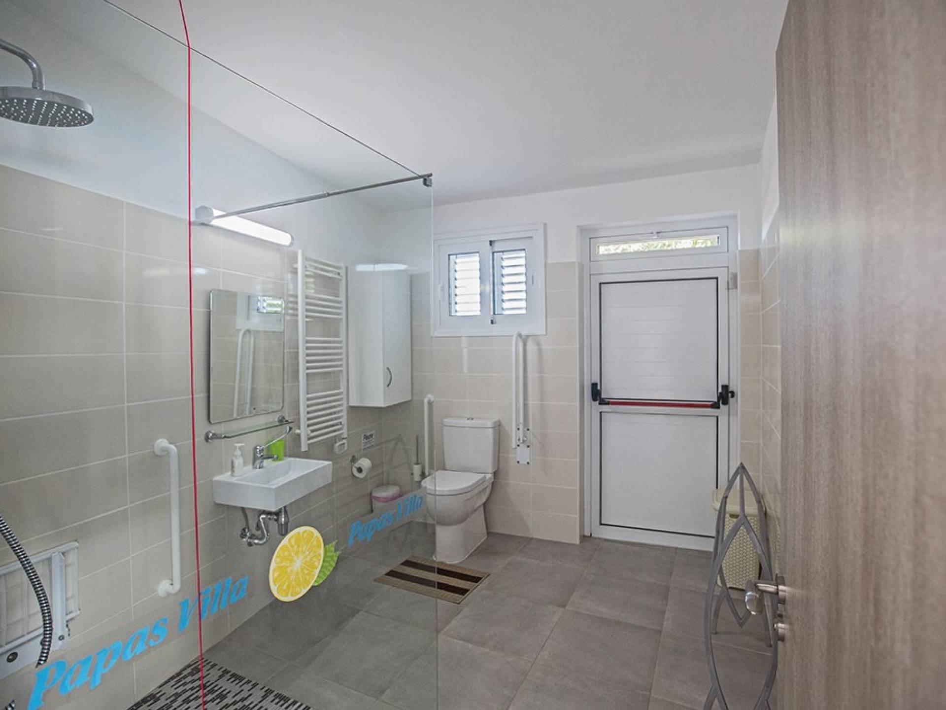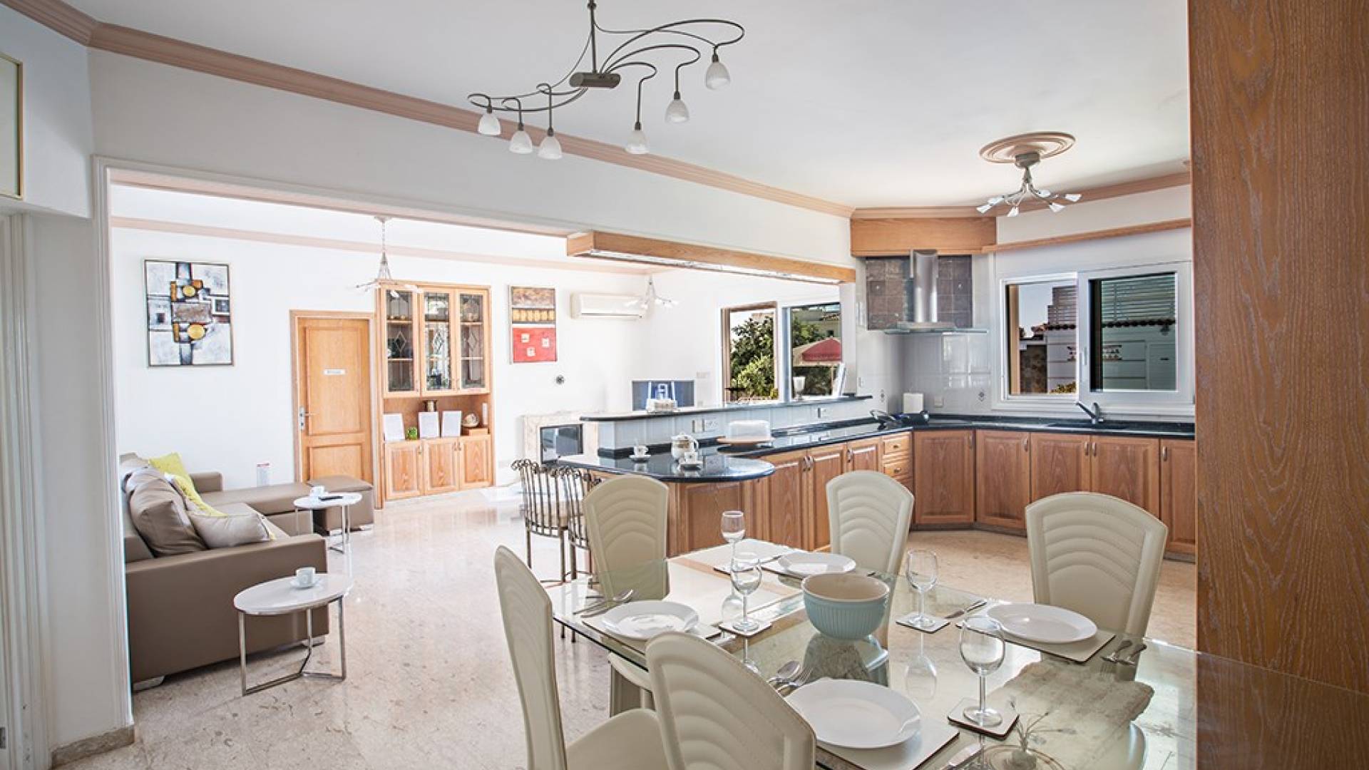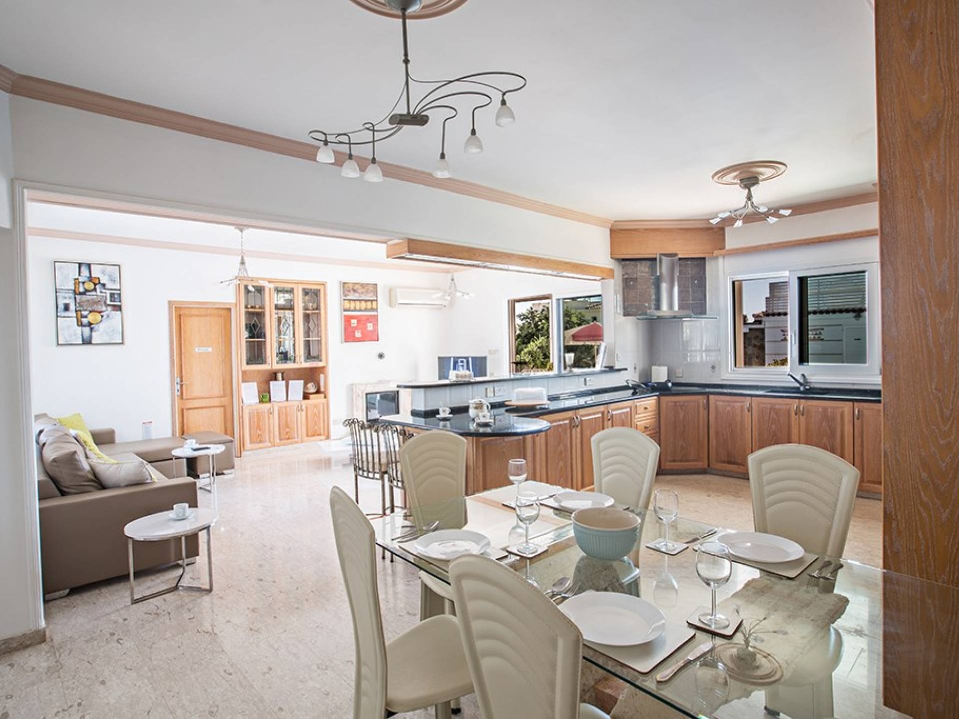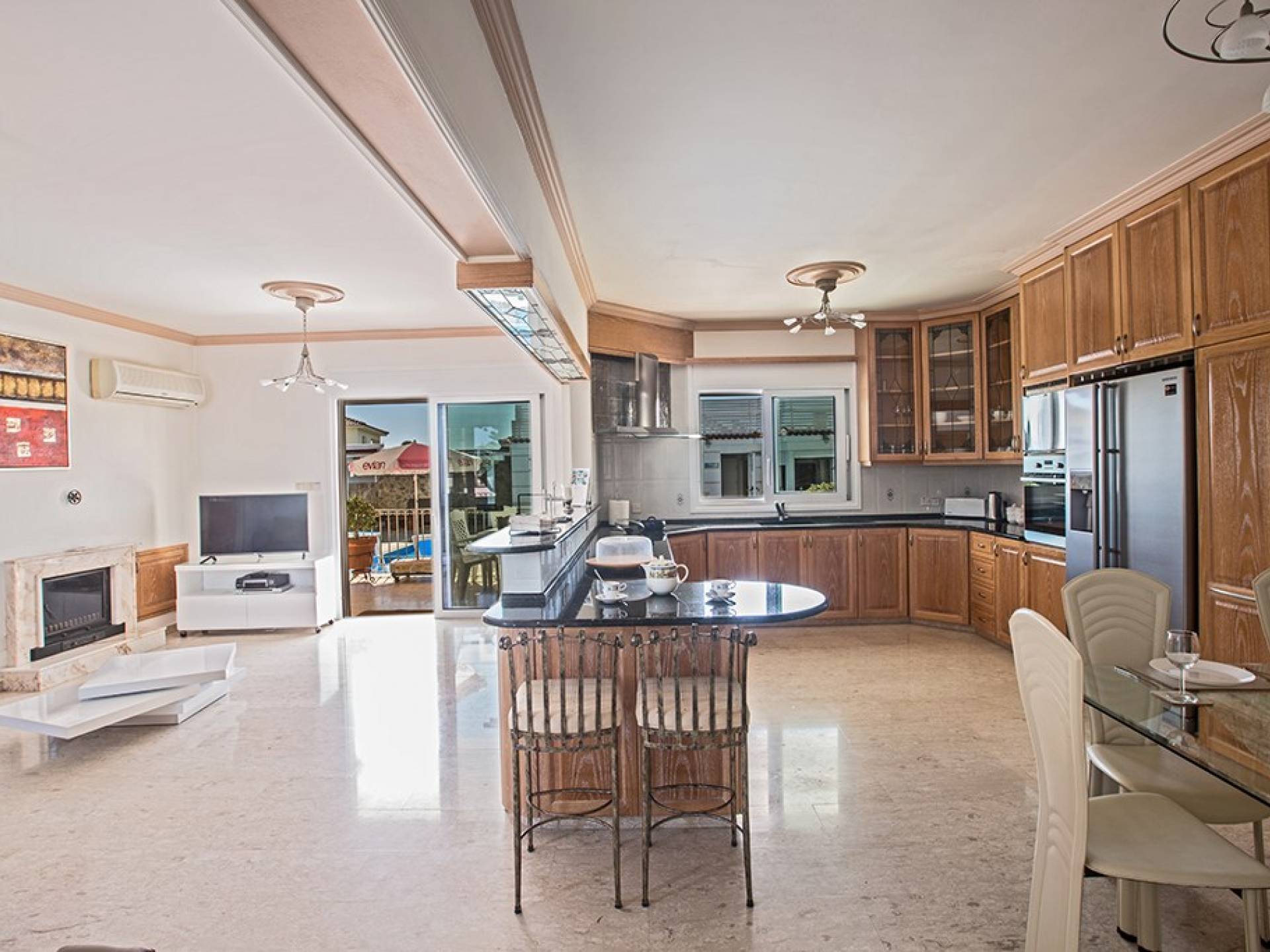 Du hall spacieux de la villa principale se trouve la salle de réception ouverte donnant sur une grande véranda, une cuisine/salle à manger entièrement aménagée et équipée avec un réfrigérateur/congélateur de style américain, un four électrique, un four micro-ondes, une plaque de cuisson et une hotte aspirante . La machine à laver et le lave-vaisselle se trouvent dans la buanderie, à côté de la cuisine. En plus d'un vestiaire, le rez-de-chaussée dispose également de sa propre salle de sport.