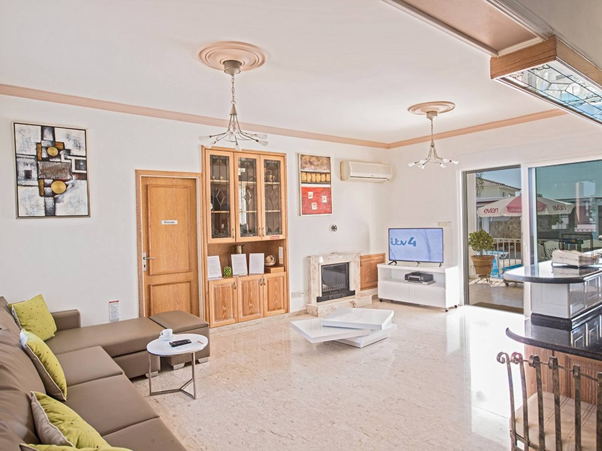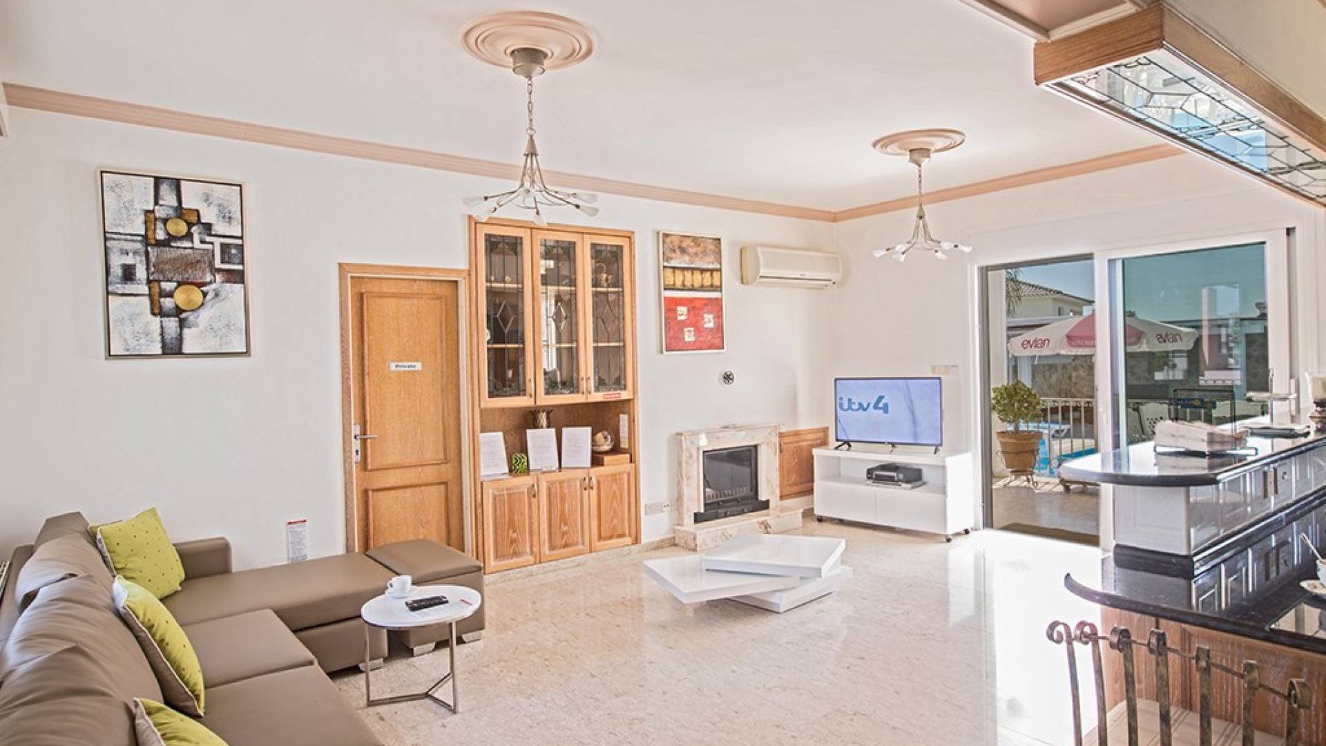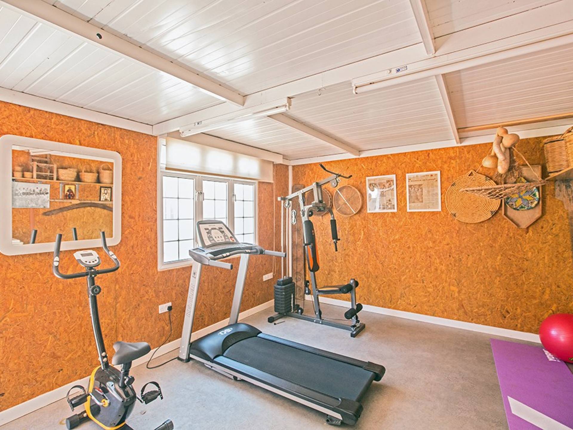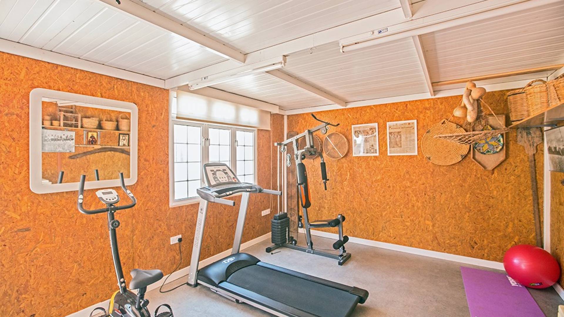 Du hall spacieux de la villa principale se trouve la salle de réception ouverte donnant sur une grande véranda, une cuisine/salle à manger entièrement aménagée et équipée avec un réfrigérateur/congélateur de style américain, un four électrique, un four micro-ondes, une plaque de cuisson et une hotte aspirante . La machine à laver et le lave-vaisselle se trouvent dans la buanderie, à côté de la cuisine. En plus d'un vestiaire, le rez-de-chaussée dispose également de sa propre salle de sport.