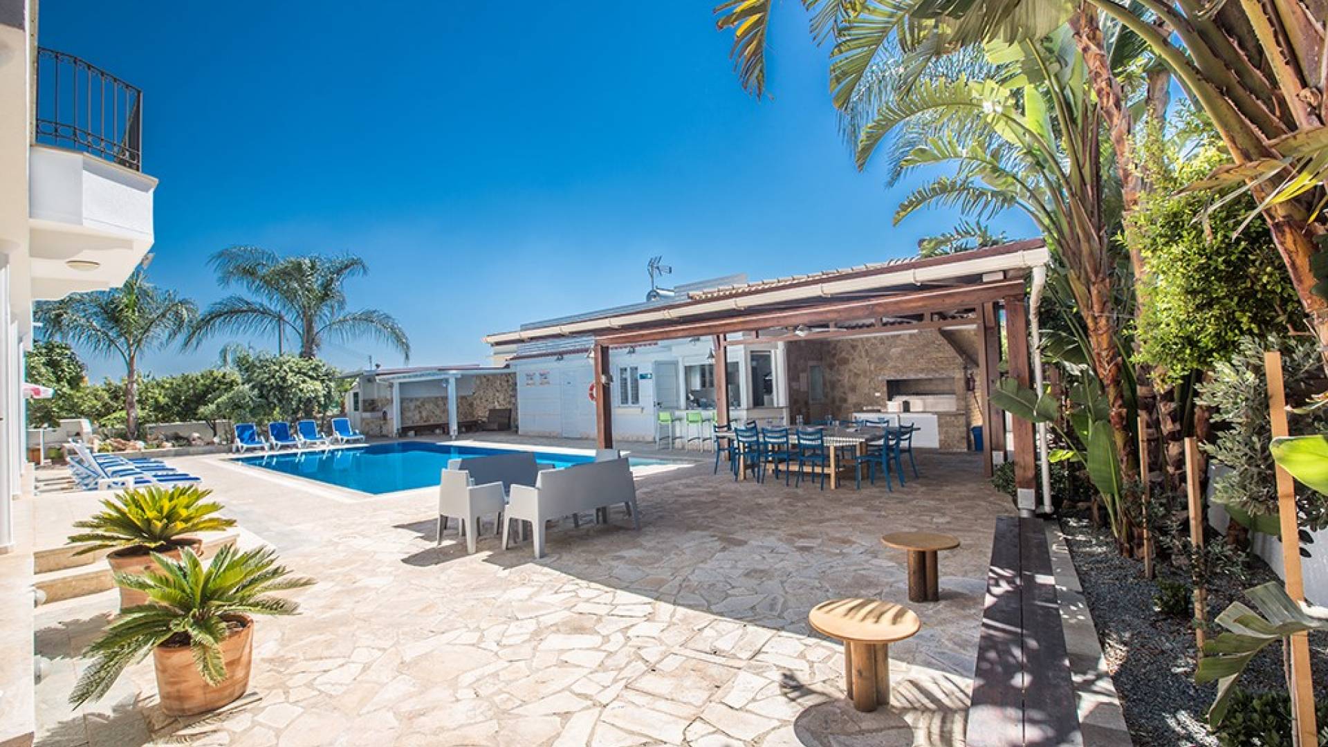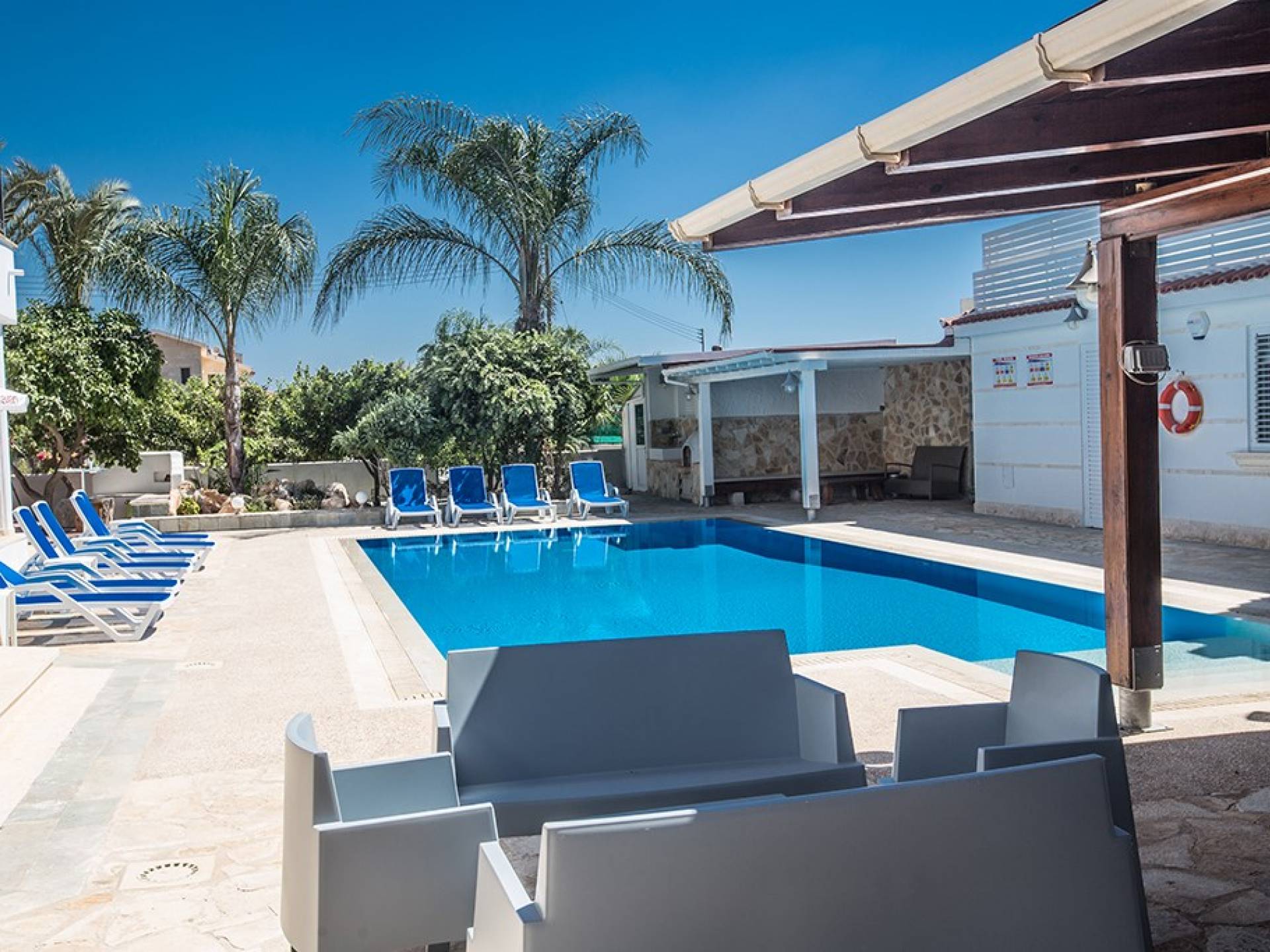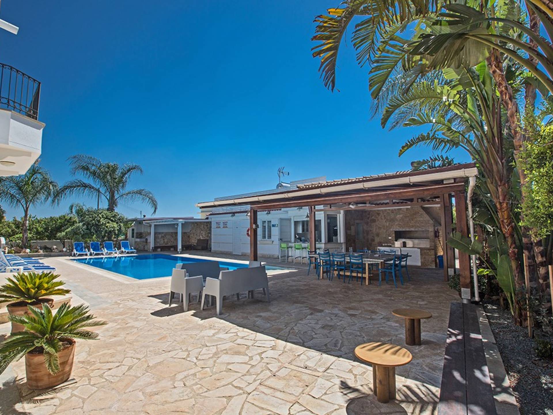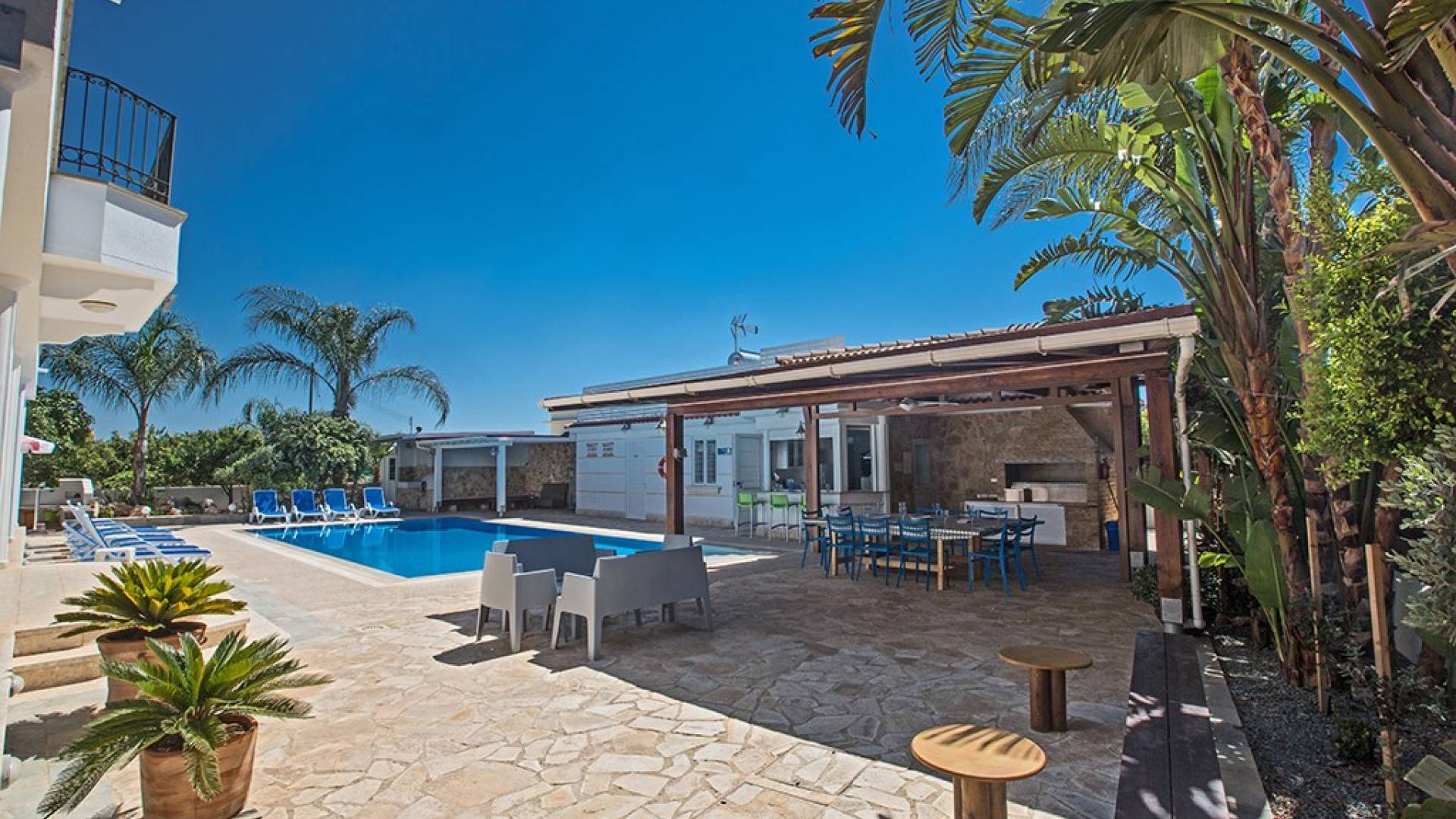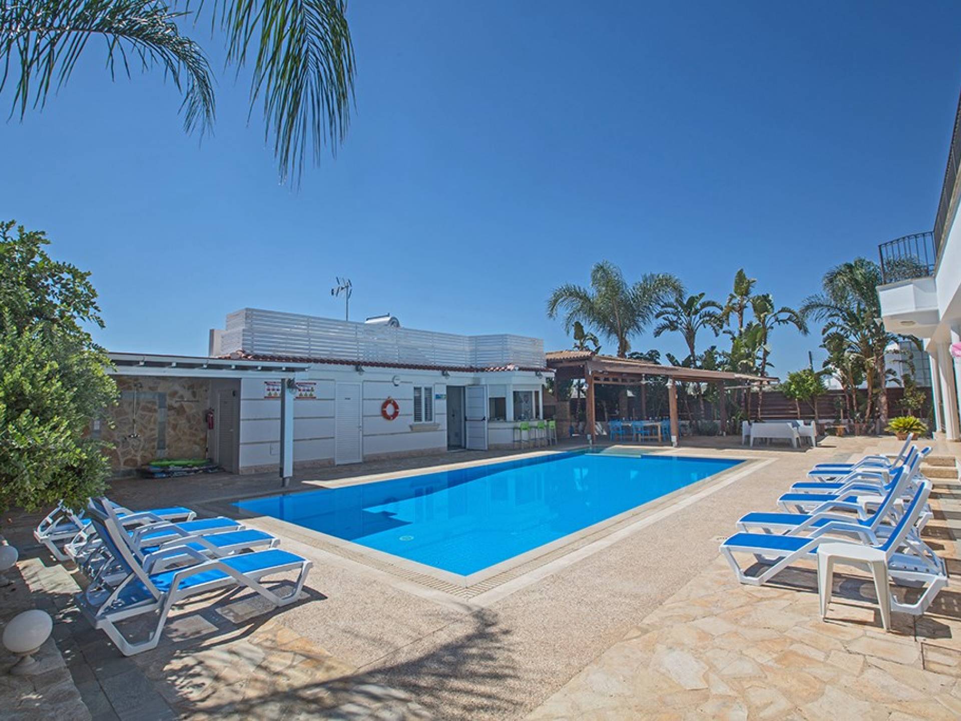 À l'arrière de la propriété se trouve une piscine sans vis à vis, un grand kiosque avec un bar pour les repas en plein air, un autre kiosque avec des sièges, un jardin de rocaille, une table de ping-pong et un coin salon de style île grecque sous le l'ombre des pamplemoussiers et pomelos. Au bord de la piscine se trouve un appartement d'une chambre à accès indépendant comprenant une chambre double, une salle de douche/humide et une cuisine/bar. Cet appartement au rez-de-chaussée est accessible aux fauteuils roulants et a été spécialement conçu avec des équipements supplémentaires tels que des mains courantes de soutien et un siège rabattable dans la salle de douche.