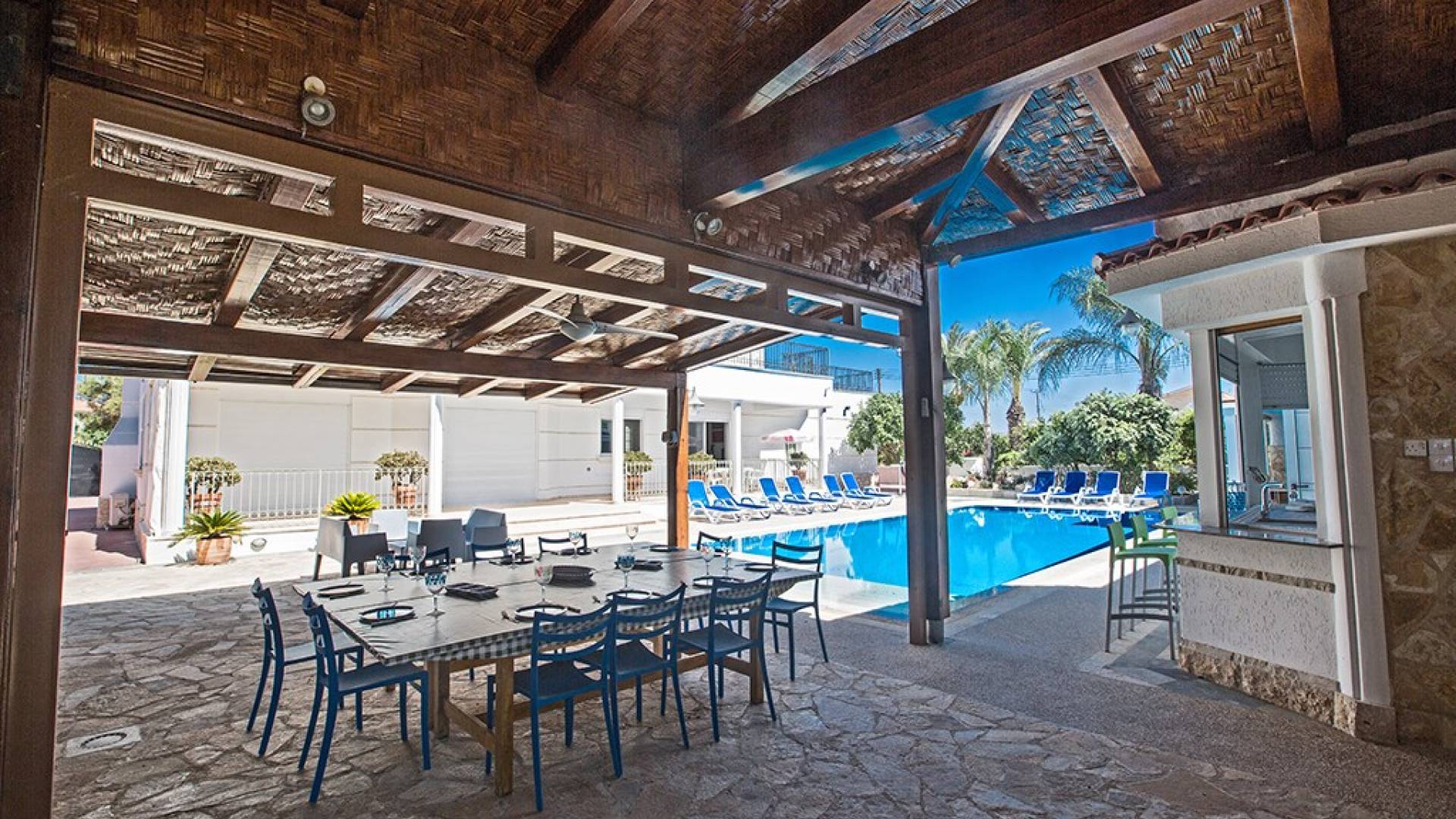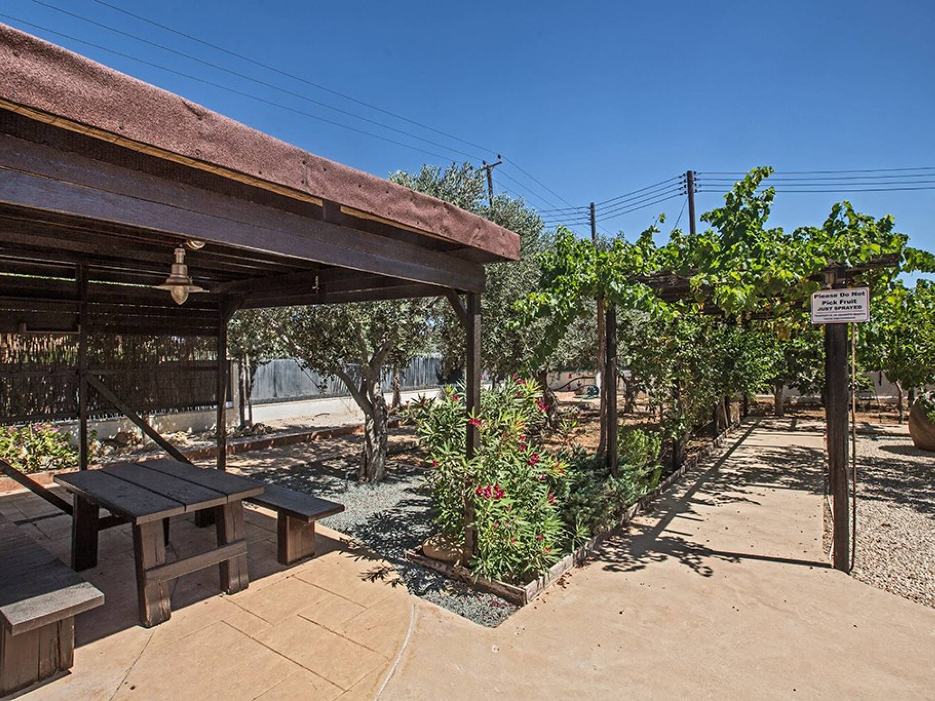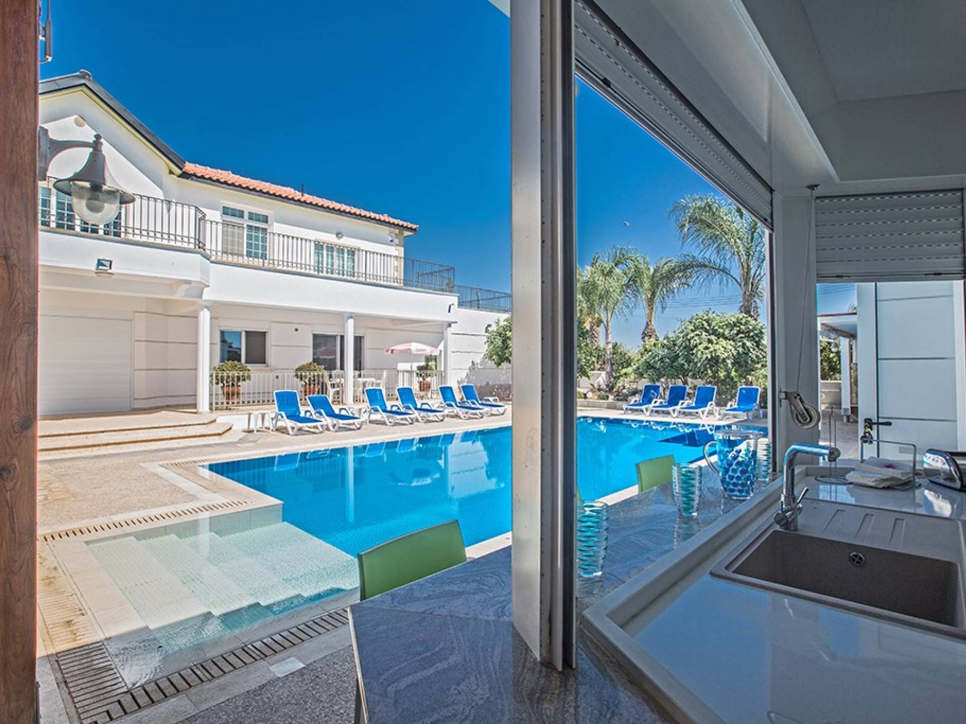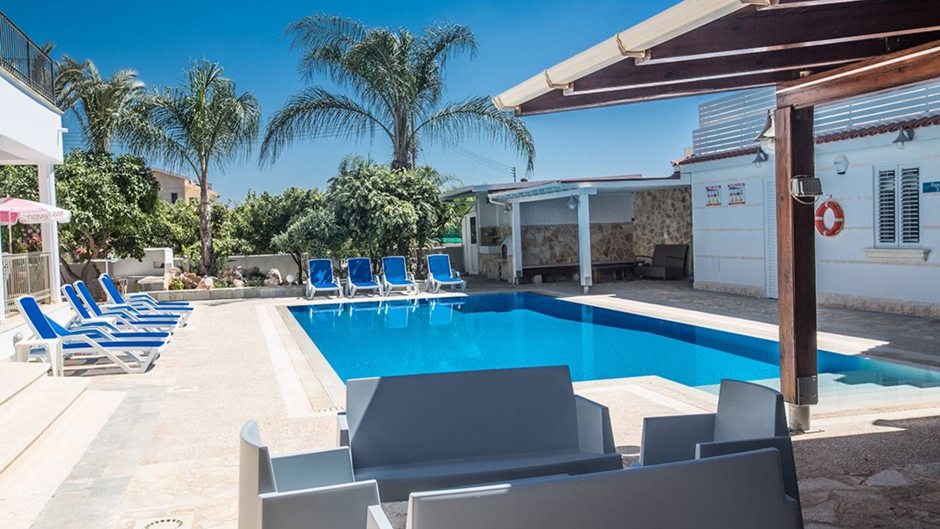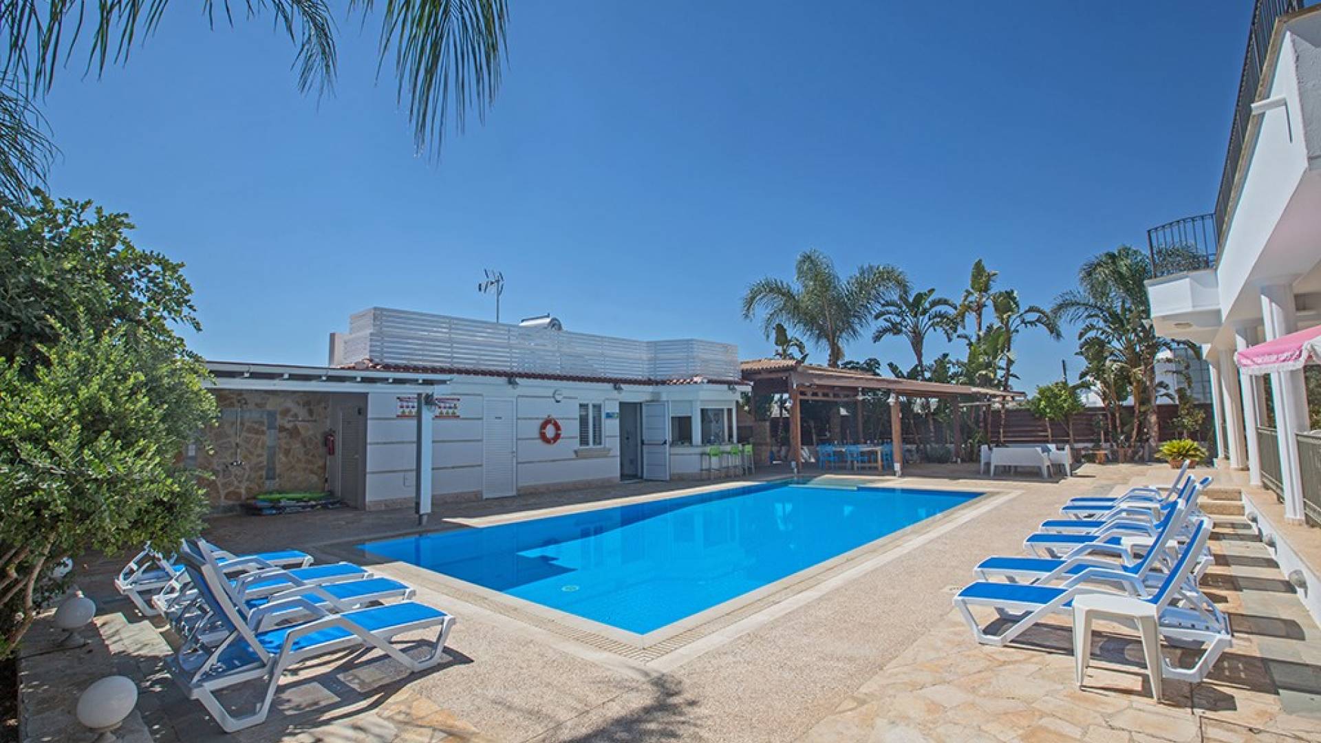 À l'arrière de la propriété se trouve une piscine sans vis à vis, un grand kiosque avec un bar pour les repas en plein air, un autre kiosque avec des sièges, un jardin de rocaille, une table de ping-pong et un coin salon de style île grecque sous le l'ombre des pamplemoussiers et pomelos. Au bord de la piscine se trouve un appartement d'une chambre à accès indépendant comprenant une chambre double, une salle de douche/humide et une cuisine/bar. Cet appartement au rez-de-chaussée est accessible aux fauteuils roulants et a été spécialement conçu avec des équipements supplémentaires tels que des mains courantes de soutien et un siège rabattable dans la salle de douche.