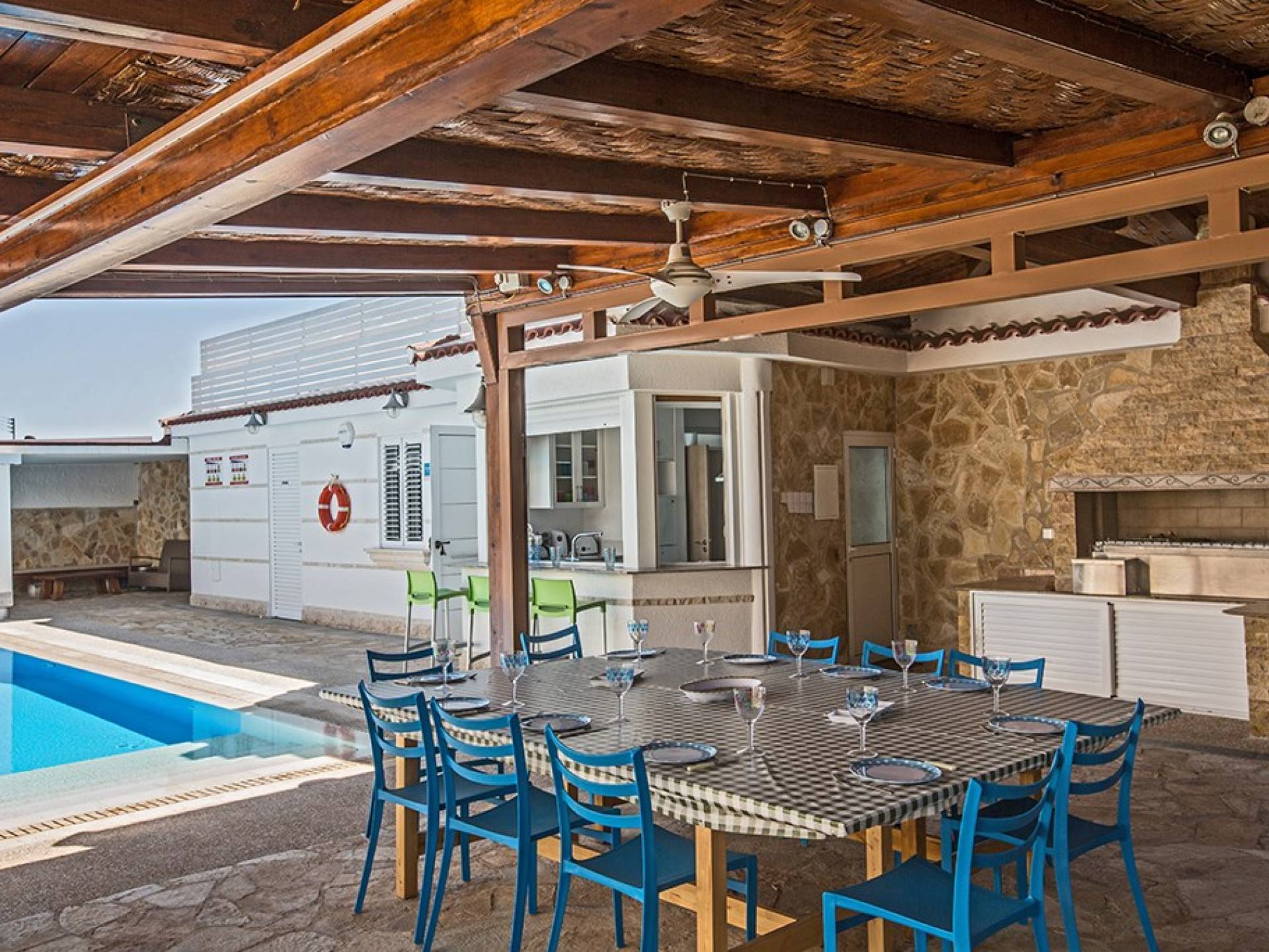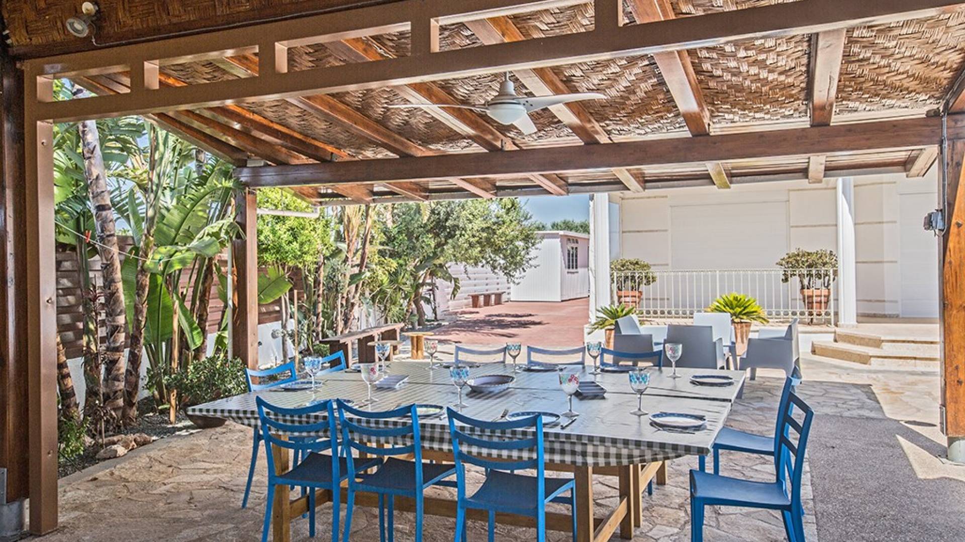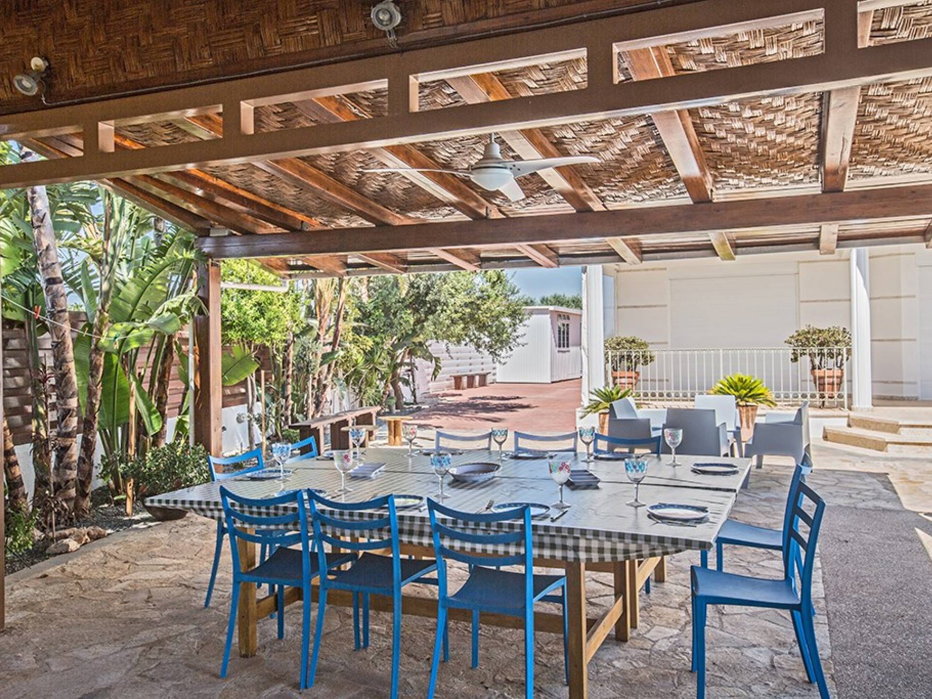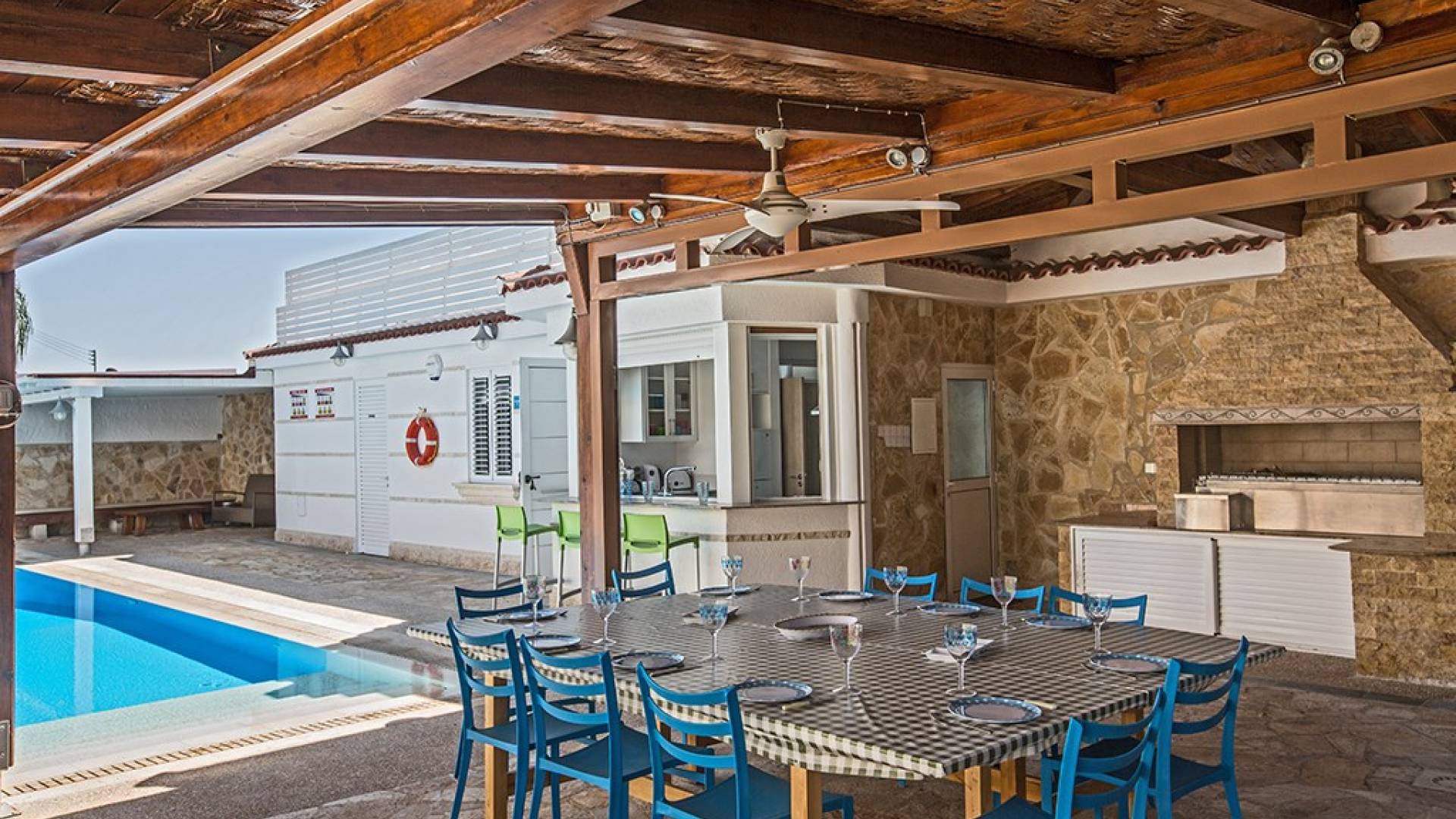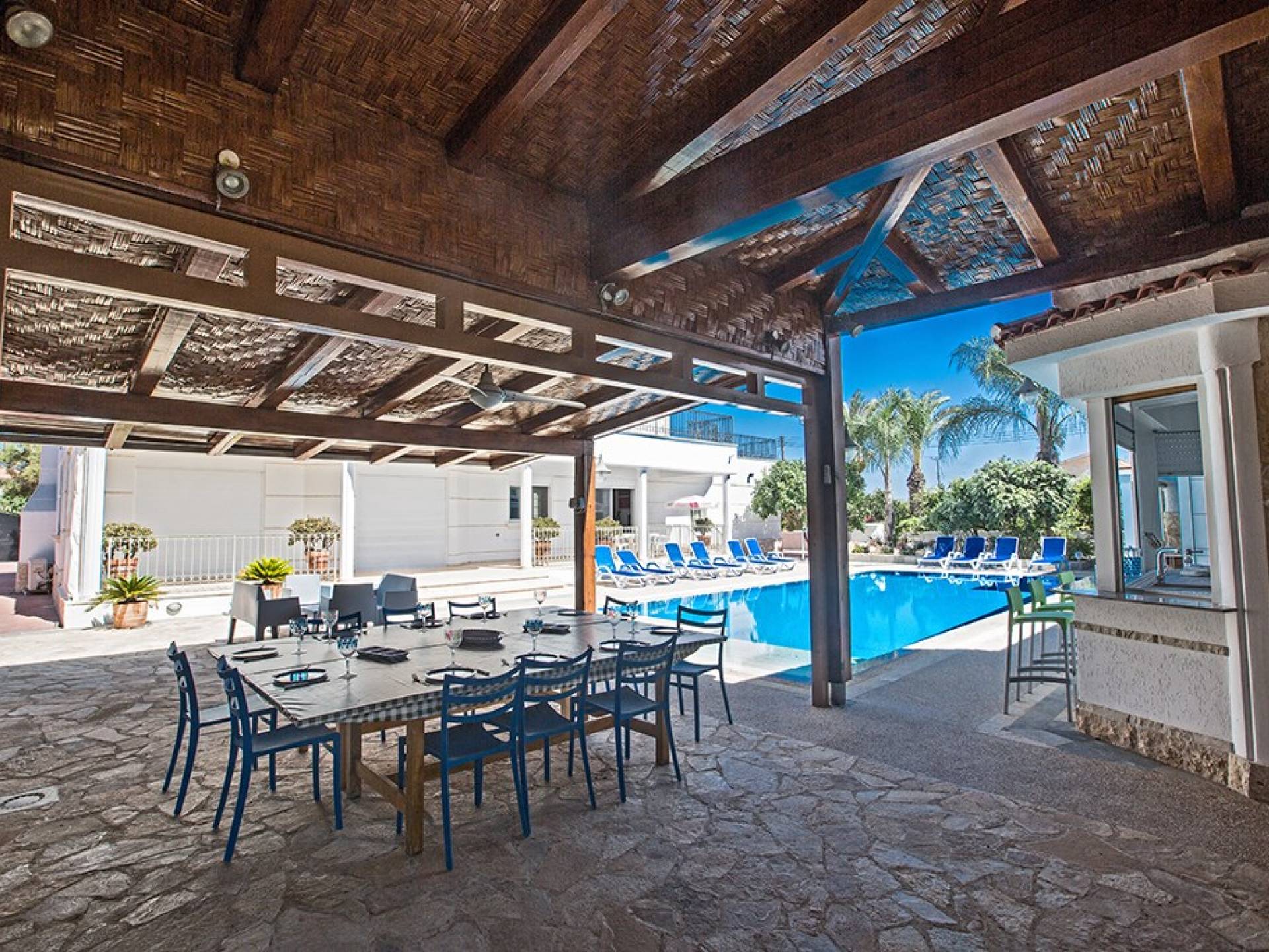 À l'arrière de la propriété se trouve une piscine sans vis à vis, un grand kiosque avec un bar pour les repas en plein air, un autre kiosque avec des sièges, un jardin de rocaille, une table de ping-pong et un coin salon de style île grecque sous le l'ombre des pamplemoussiers et pomelos. Au bord de la piscine se trouve un appartement d'une chambre à accès indépendant comprenant une chambre double, une salle de douche/humide et une cuisine/bar. Cet appartement au rez-de-chaussée est accessible aux fauteuils roulants et a été spécialement conçu avec des équipements supplémentaires tels que des mains courantes de soutien et un siège rabattable dans la salle de douche.