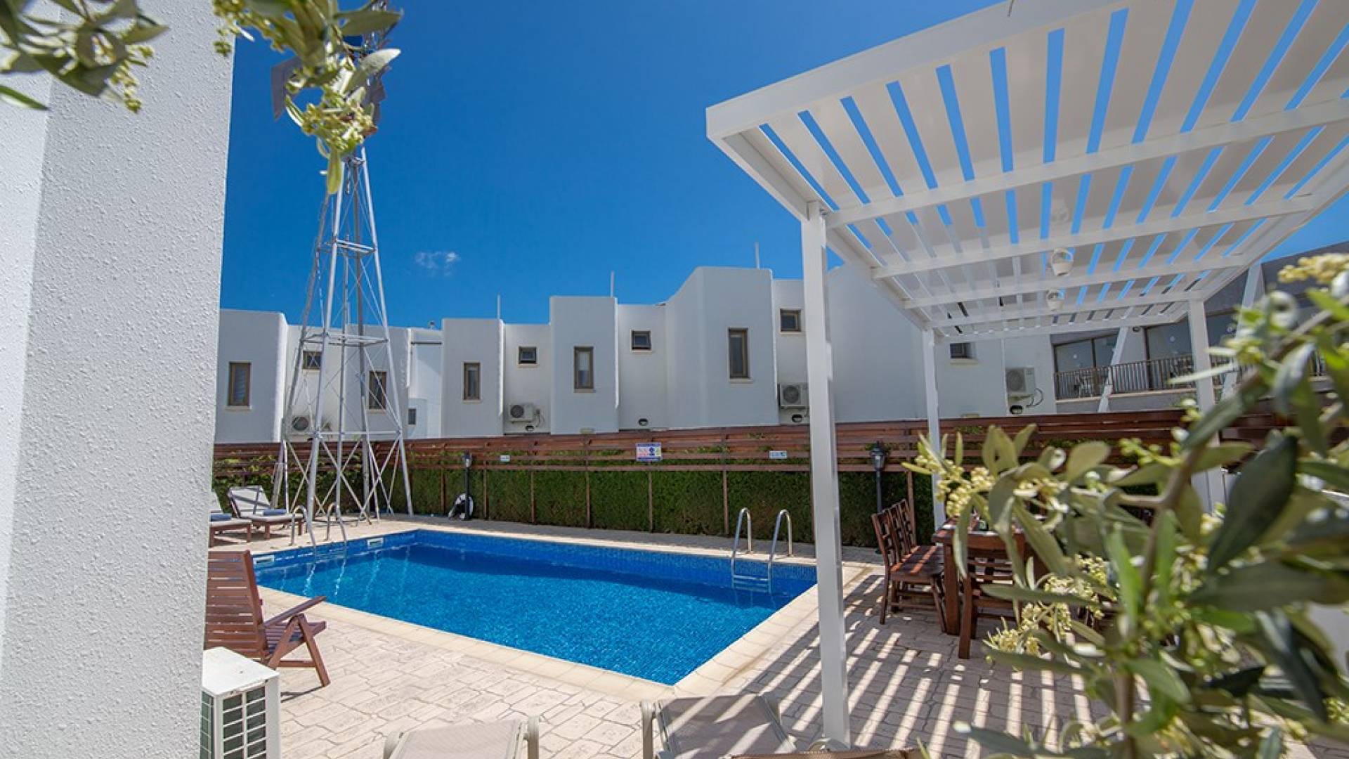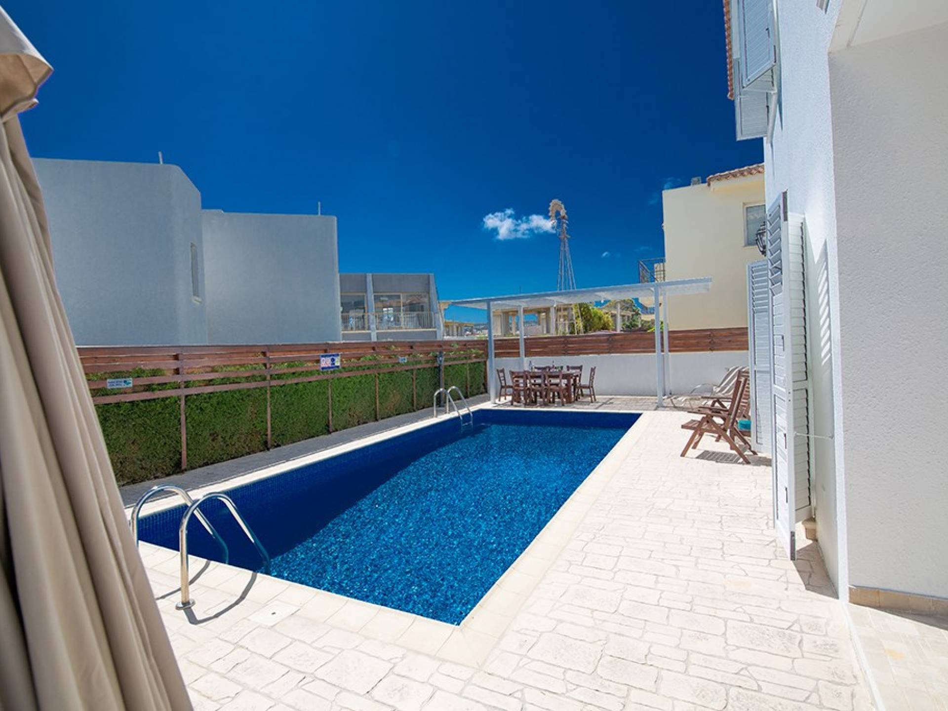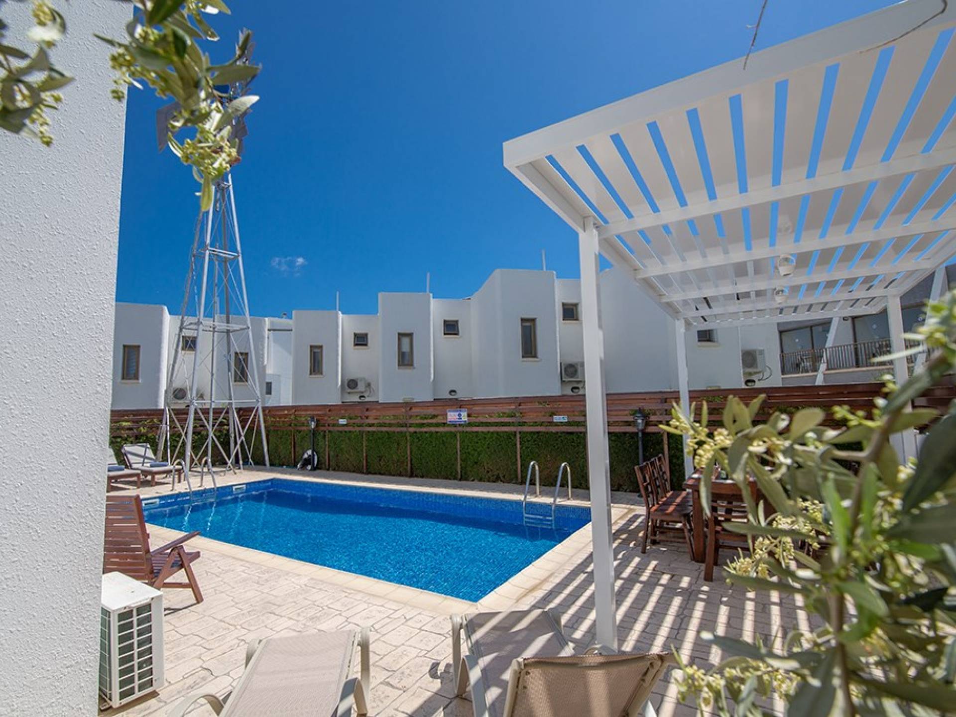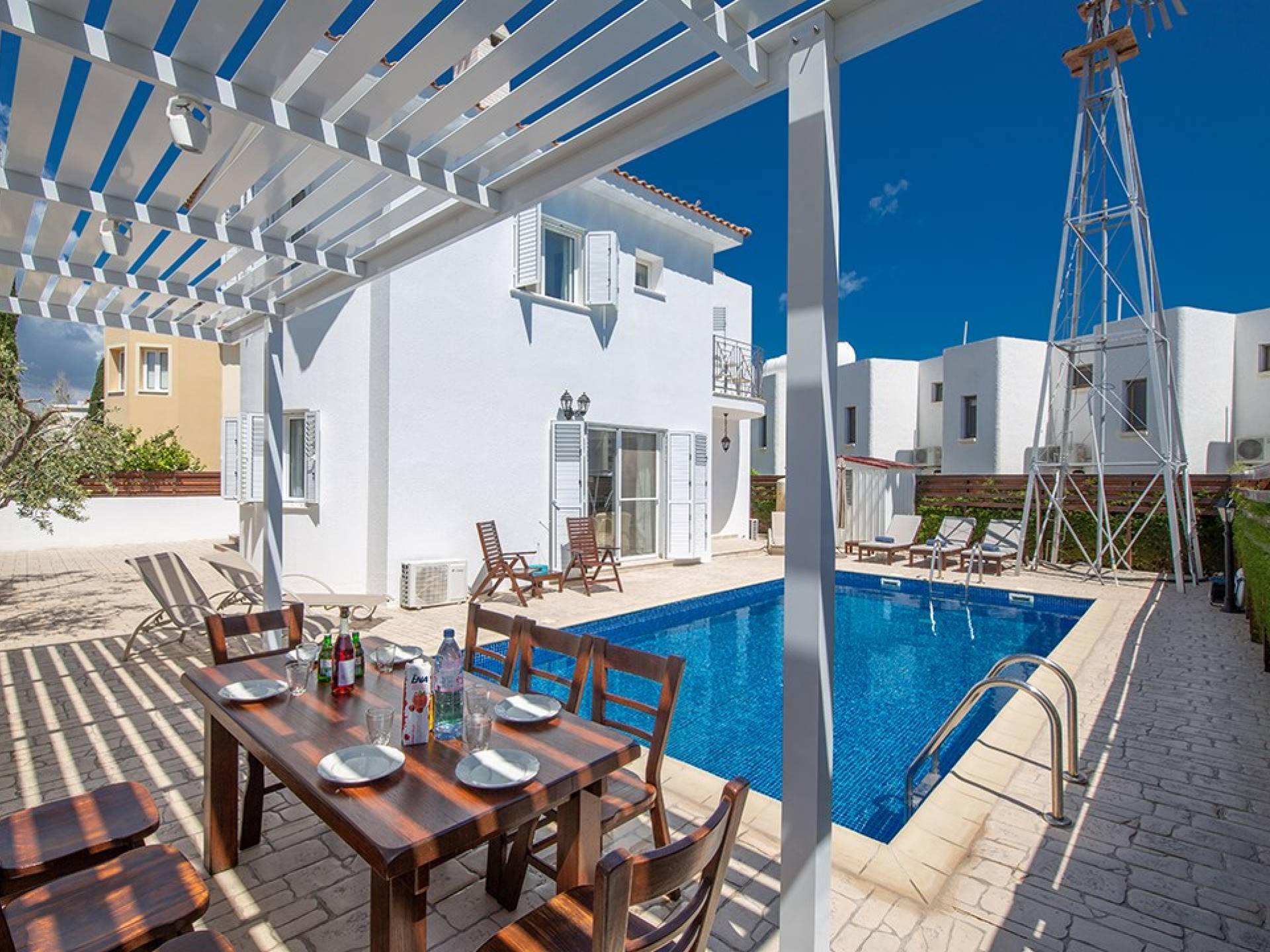 À l'extérieur, la villa dispose d'une grande piscine privée et d'un grand jardin avec chaises longues et meubles de patio. Il y a aussi un moulin à vent traditionnel dans le jardin.