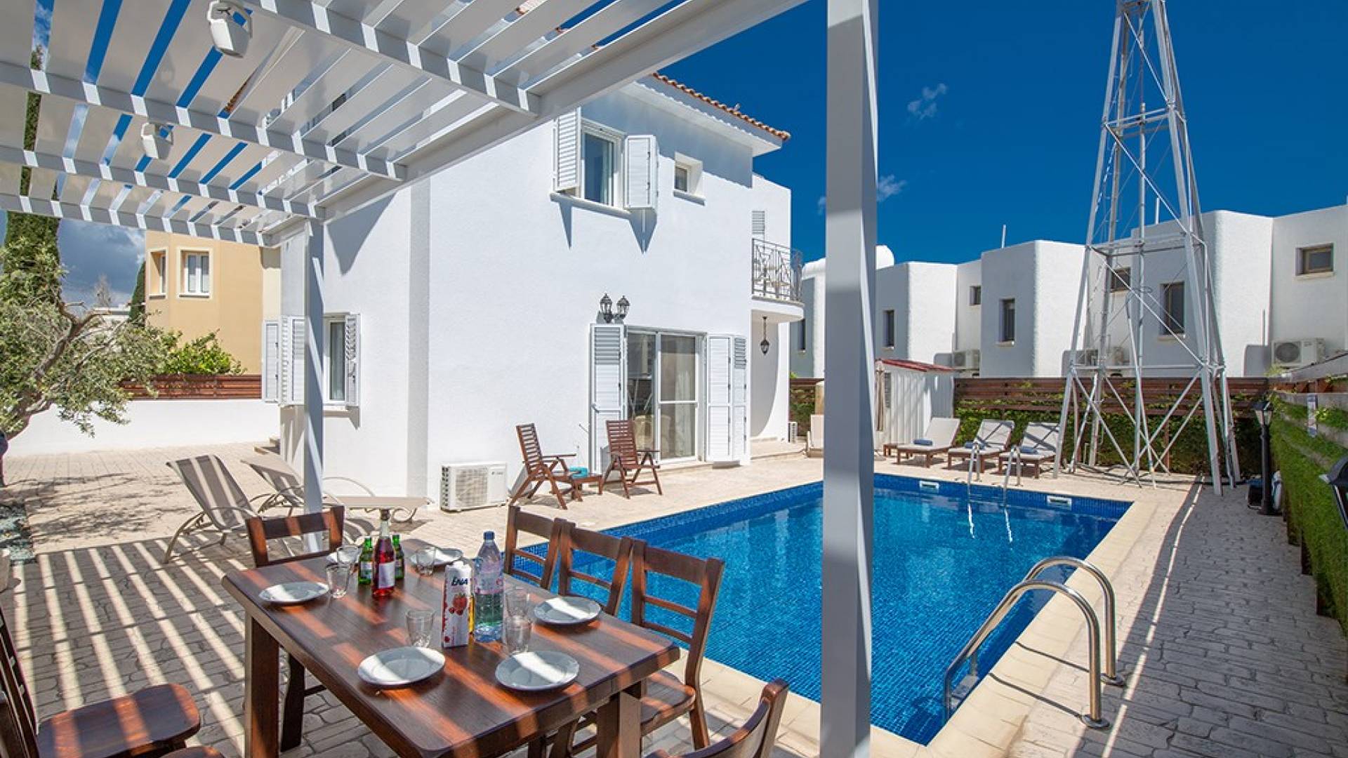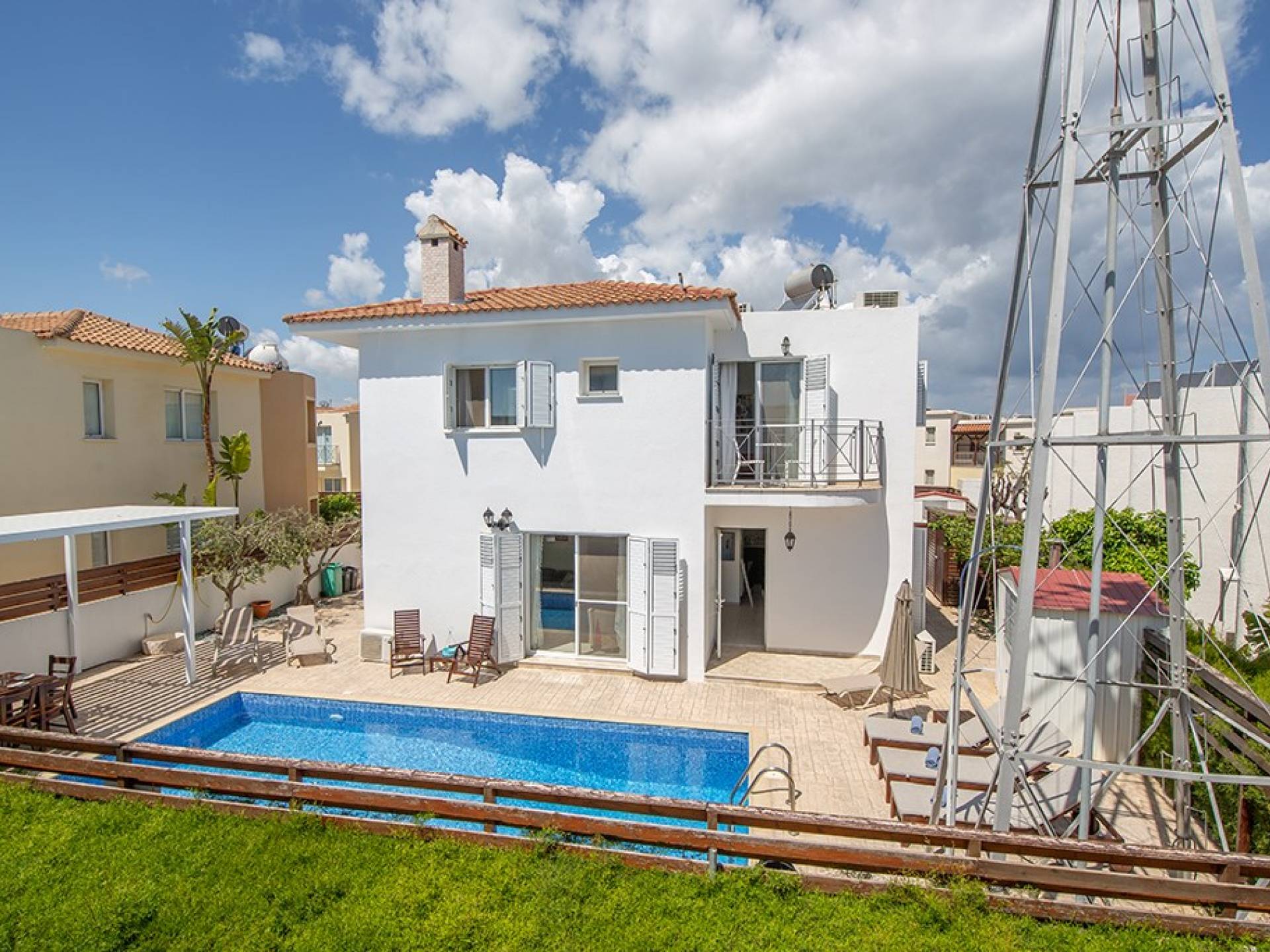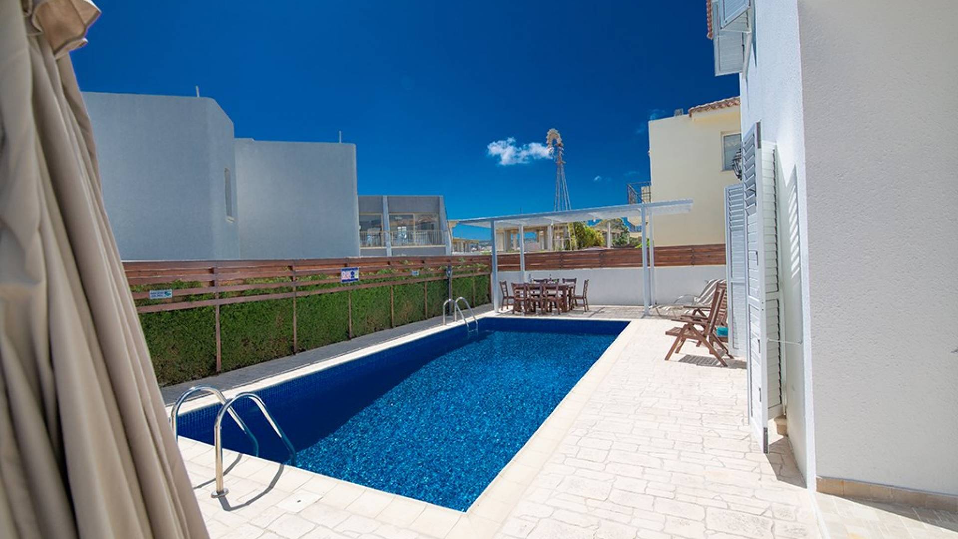 À l'extérieur, la villa dispose d'une grande piscine privée et d'un grand jardin avec chaises longues et meubles de patio. Il y a aussi un moulin à vent traditionnel dans le jardin.