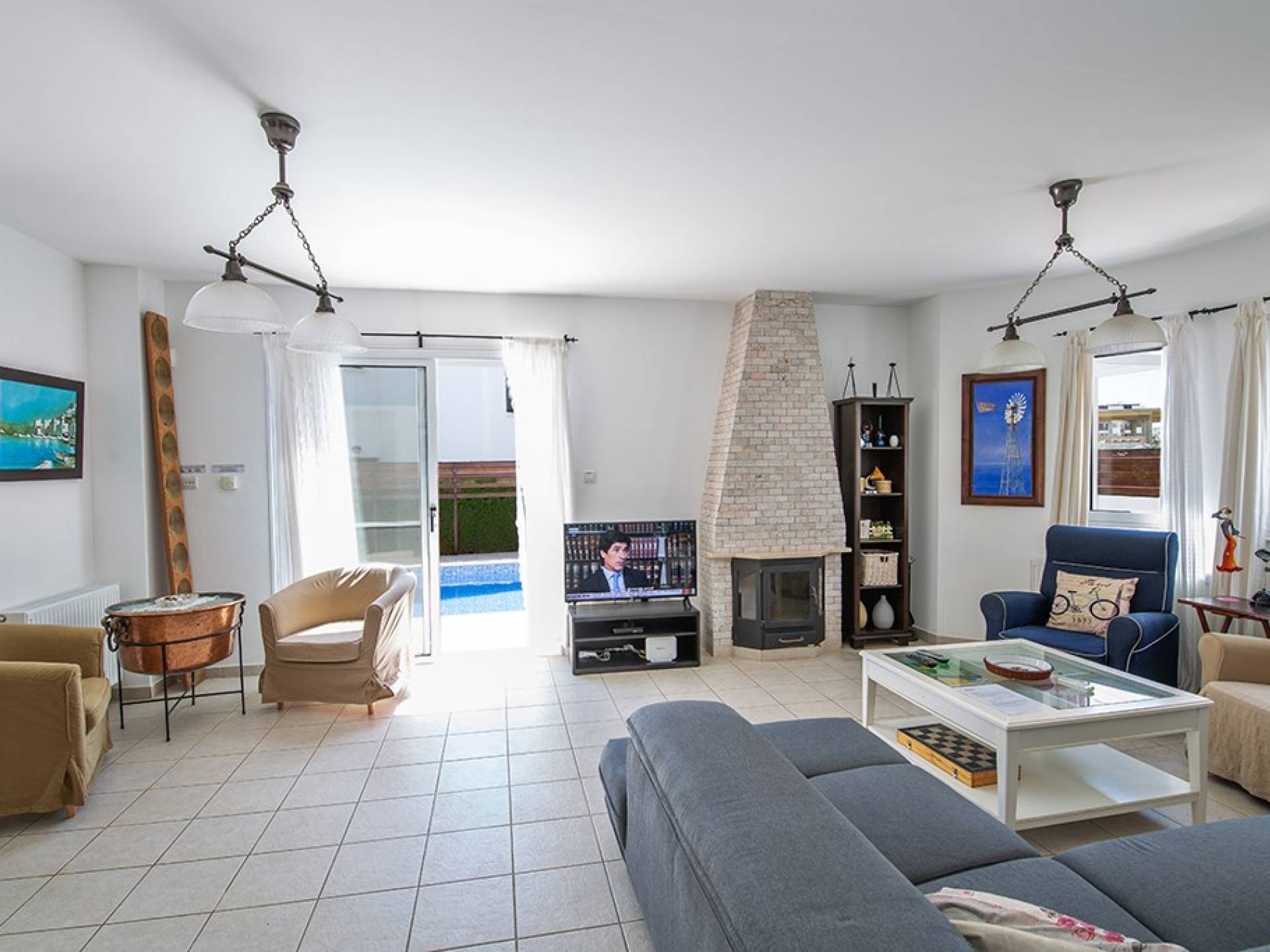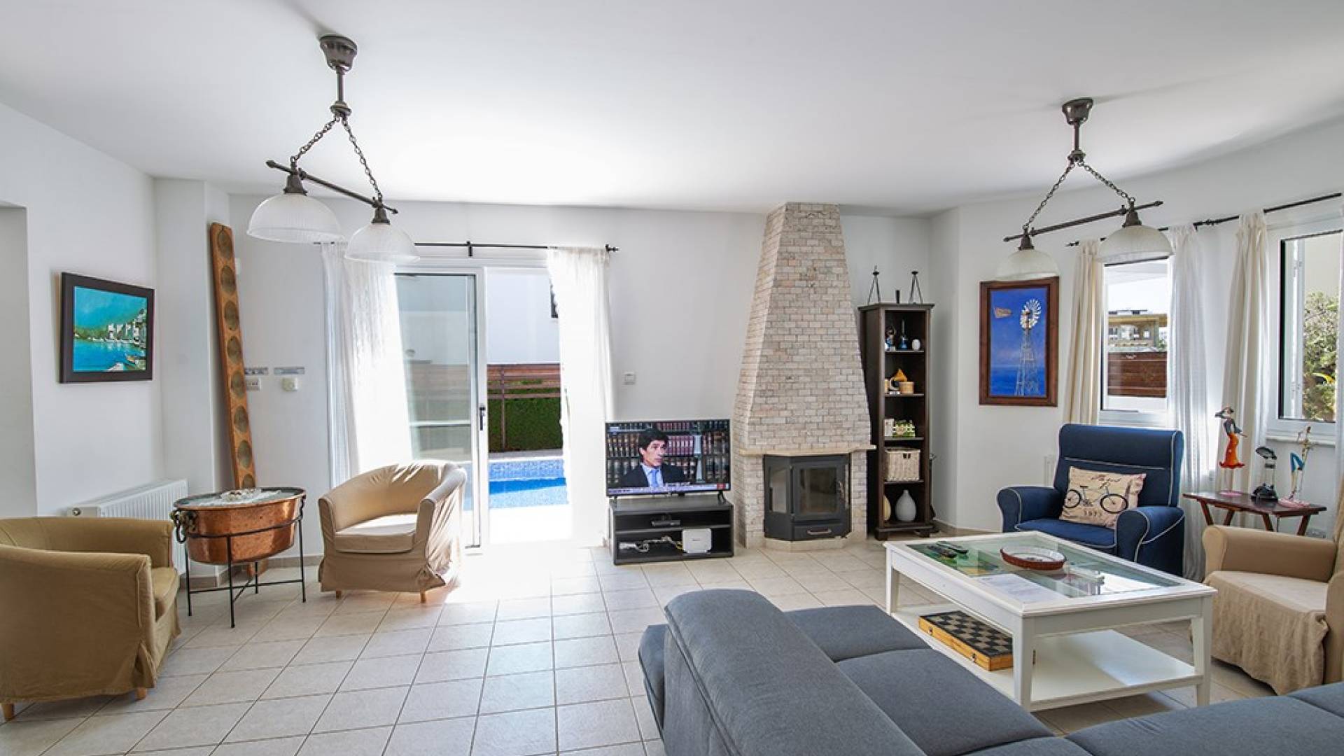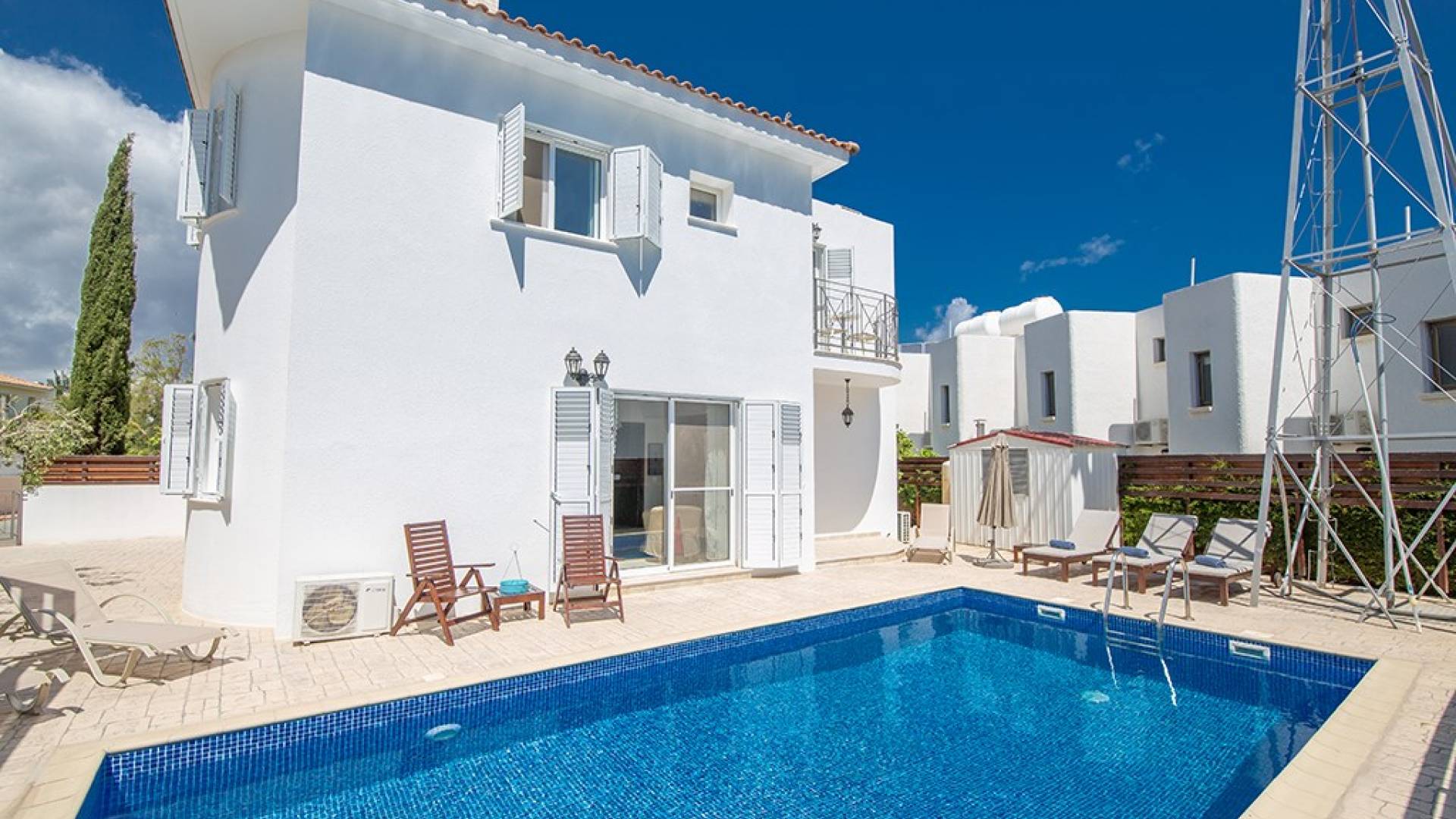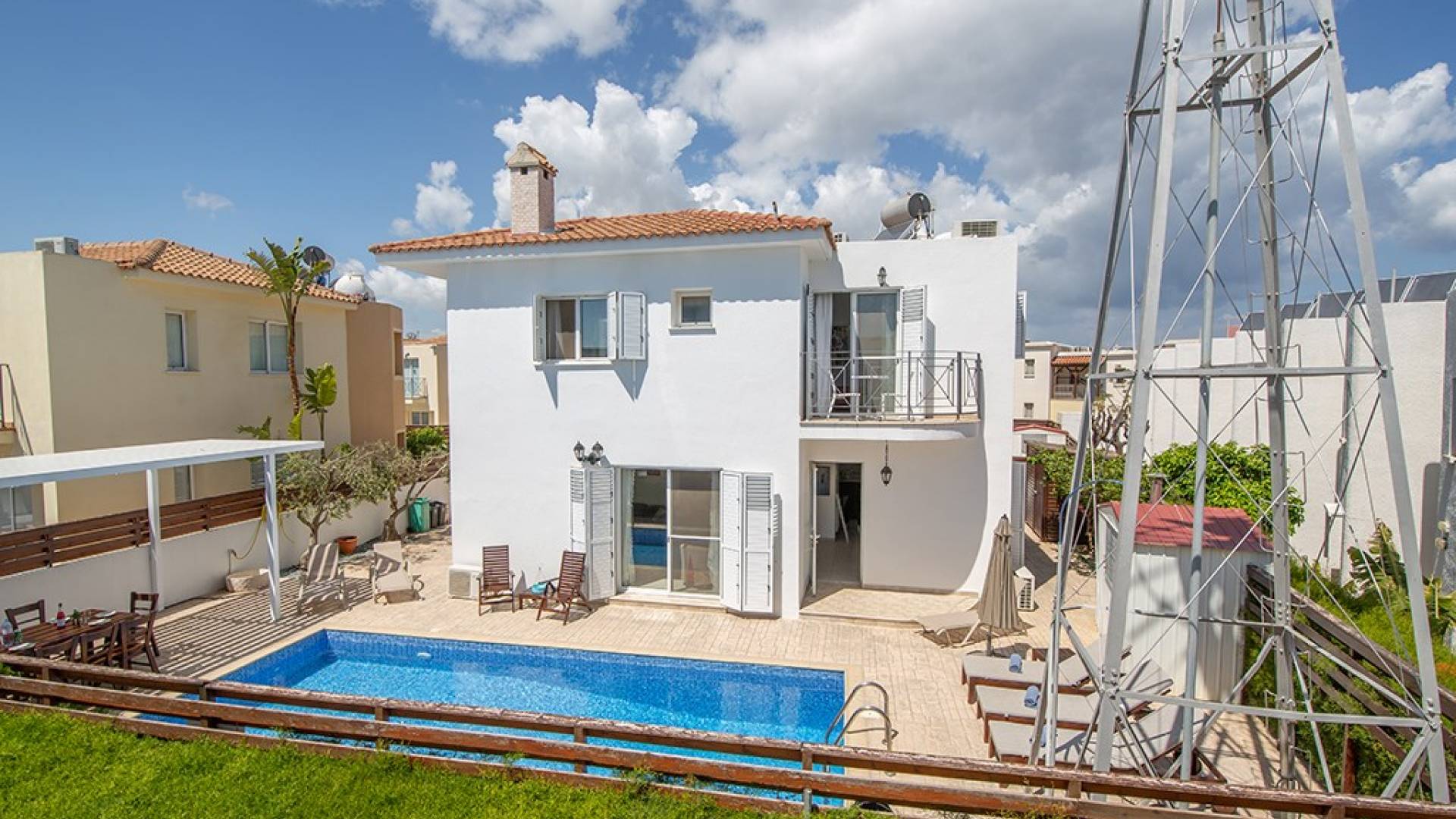 À l'extérieur, la villa dispose d'une grande piscine privée et d'un grand jardin avec chaises longues et meubles de patio. Il y a aussi un moulin à vent traditionnel dans le jardin.