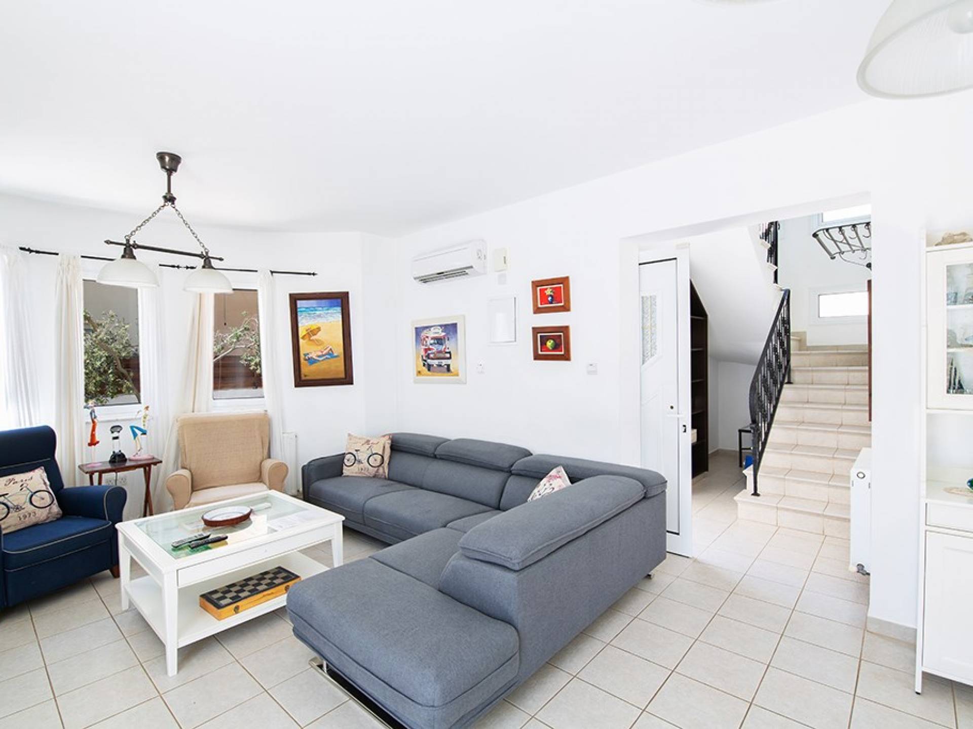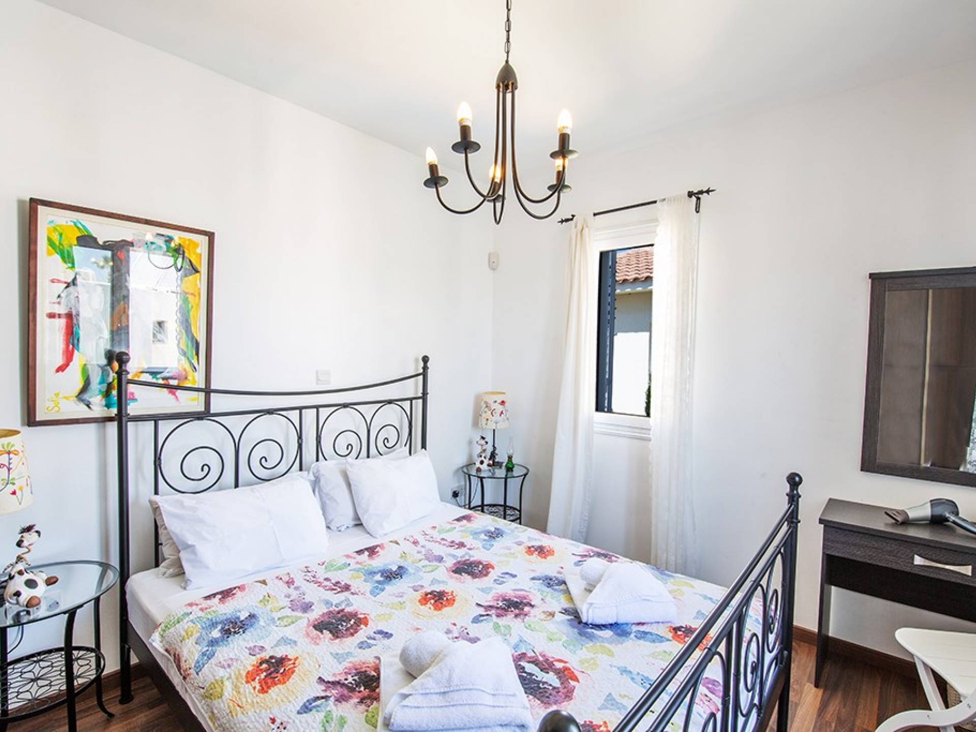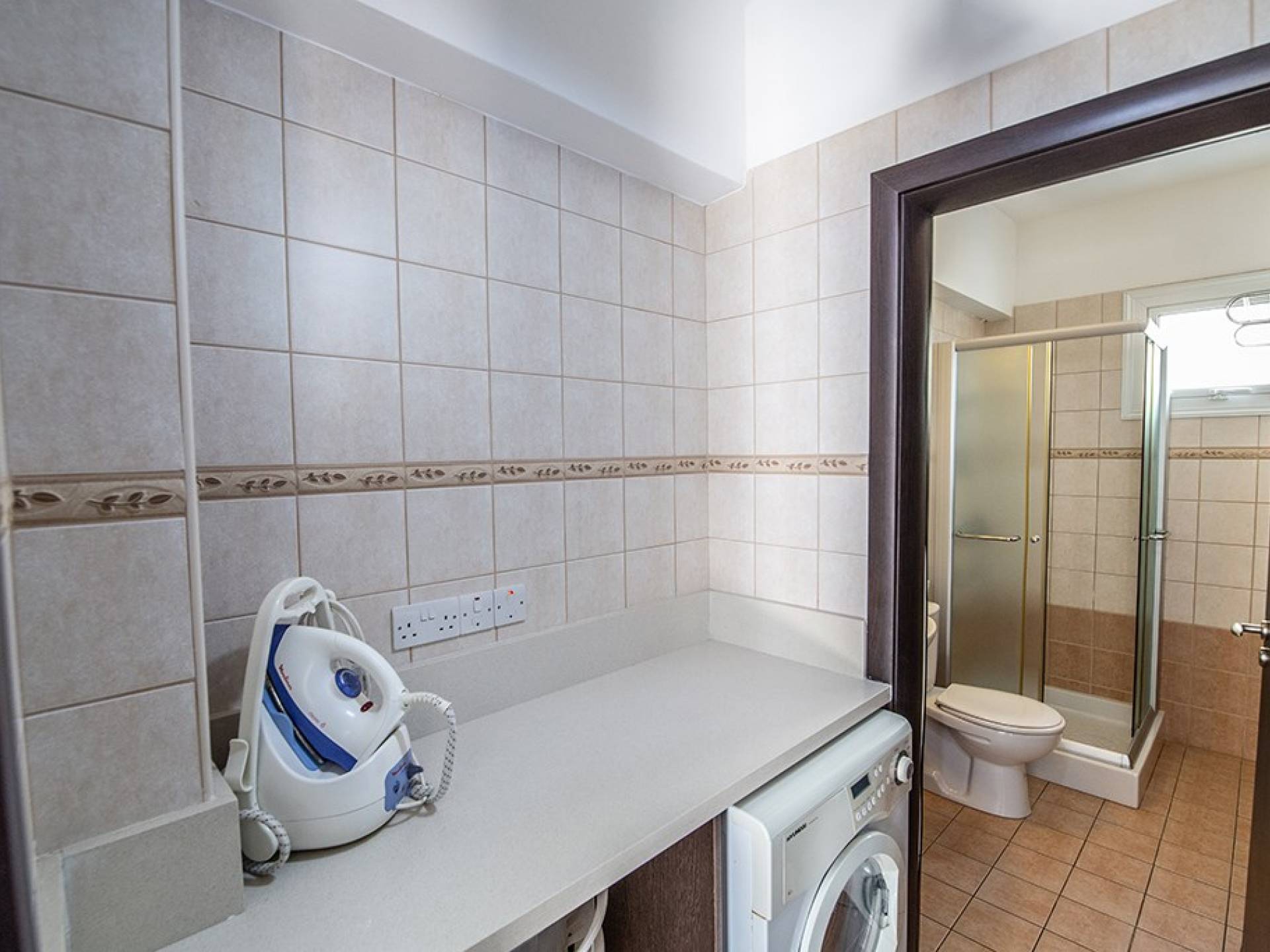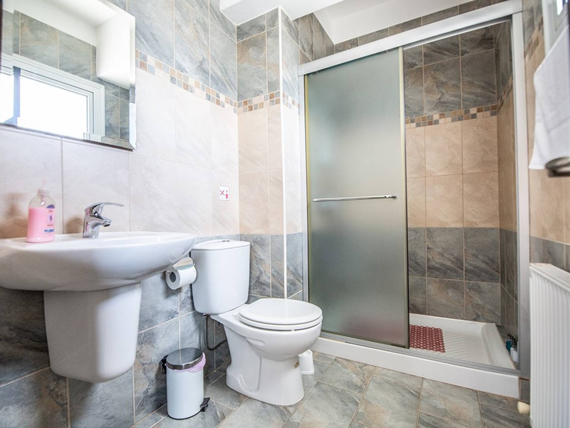 A l'étage, la villa dispose de trois chambres et d'une salle de bain familiale. La chambre principale a un lit double et une salle de bains avec un meuble dans la douche et des toilettes. Il y a une autre chambre double et une chambre avec 2 lits simples. La salle de bain principale a une baignoire, une douche et des toilettes.