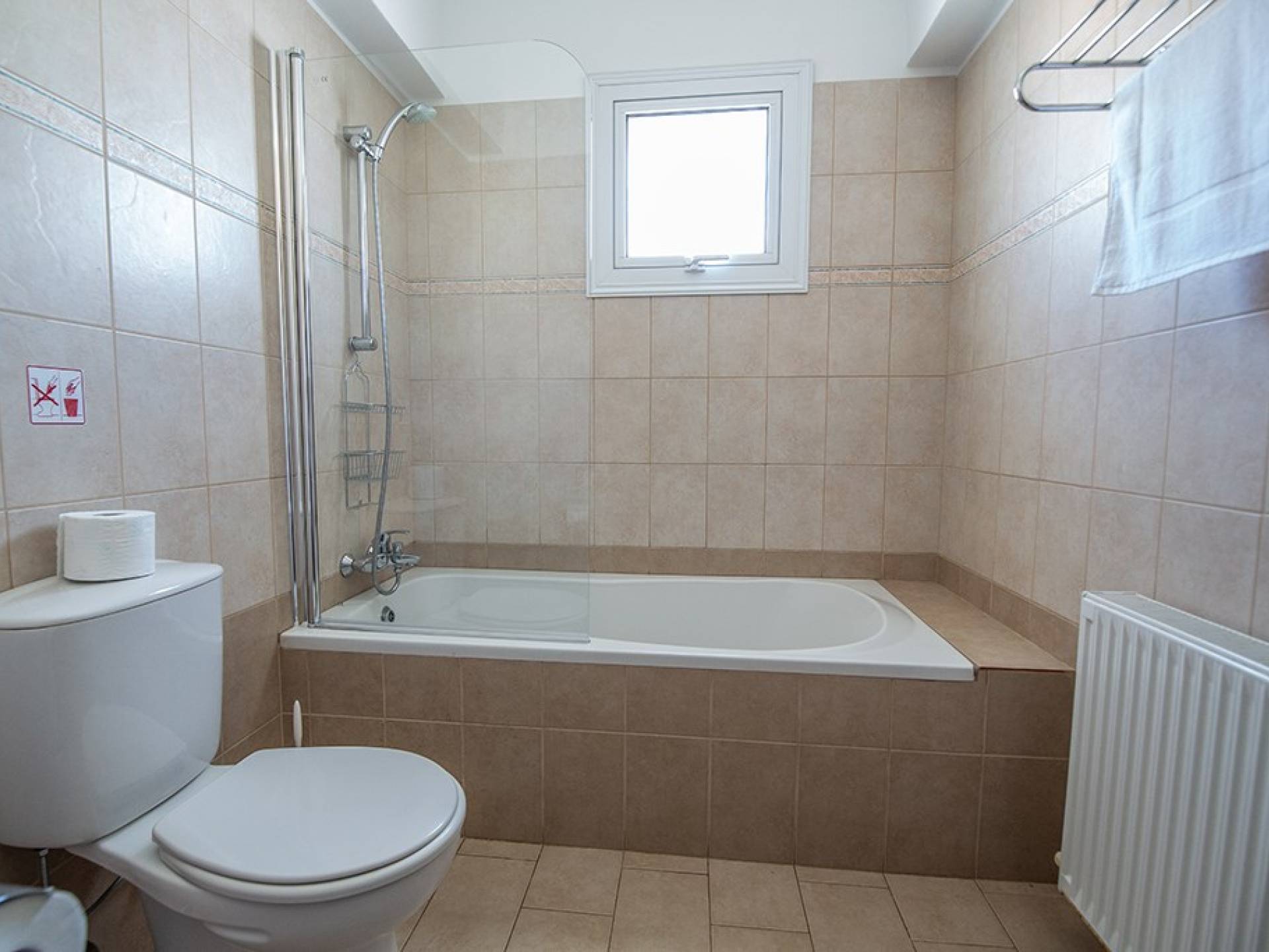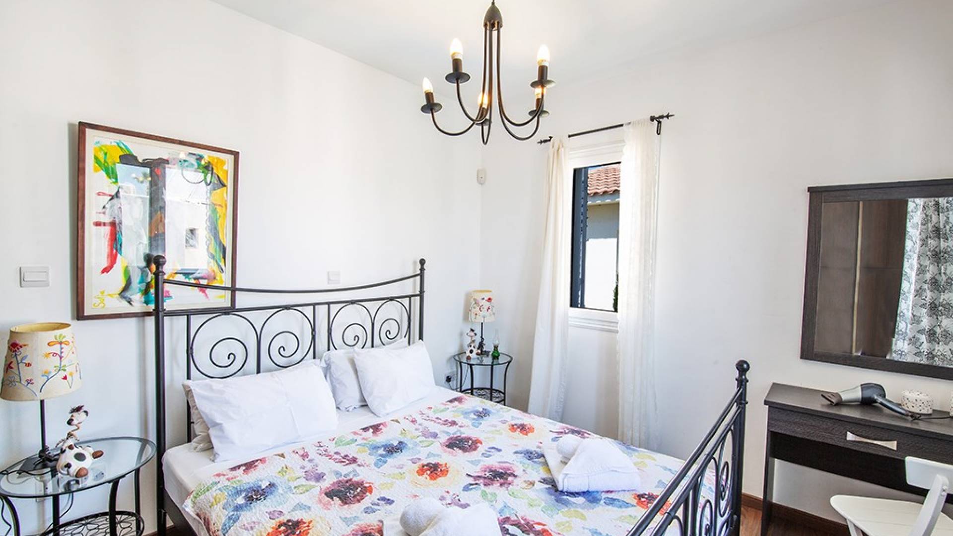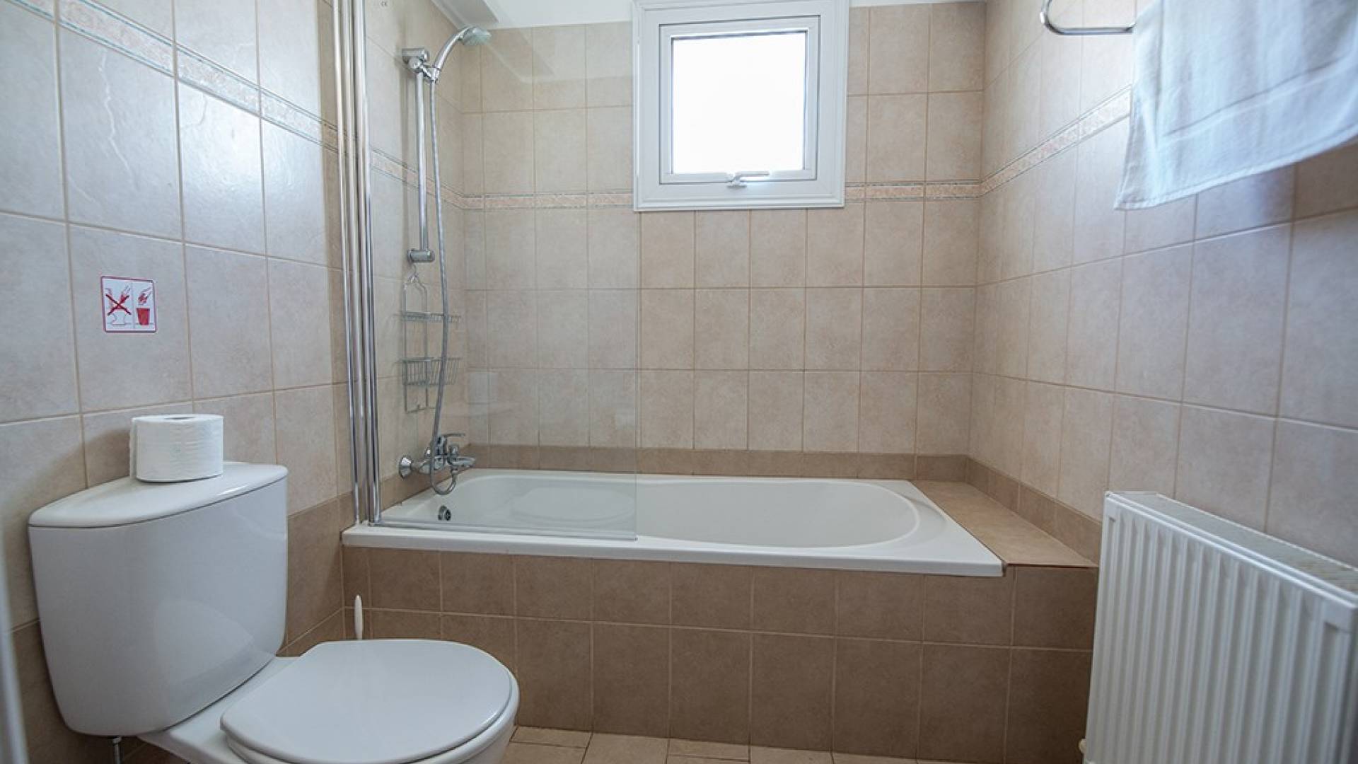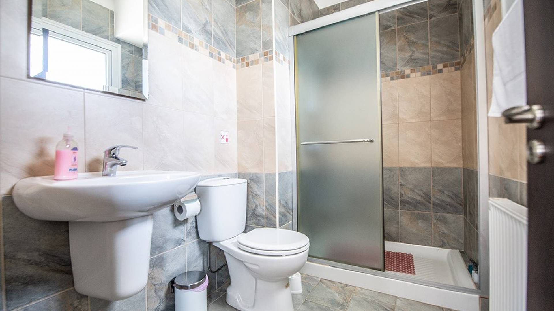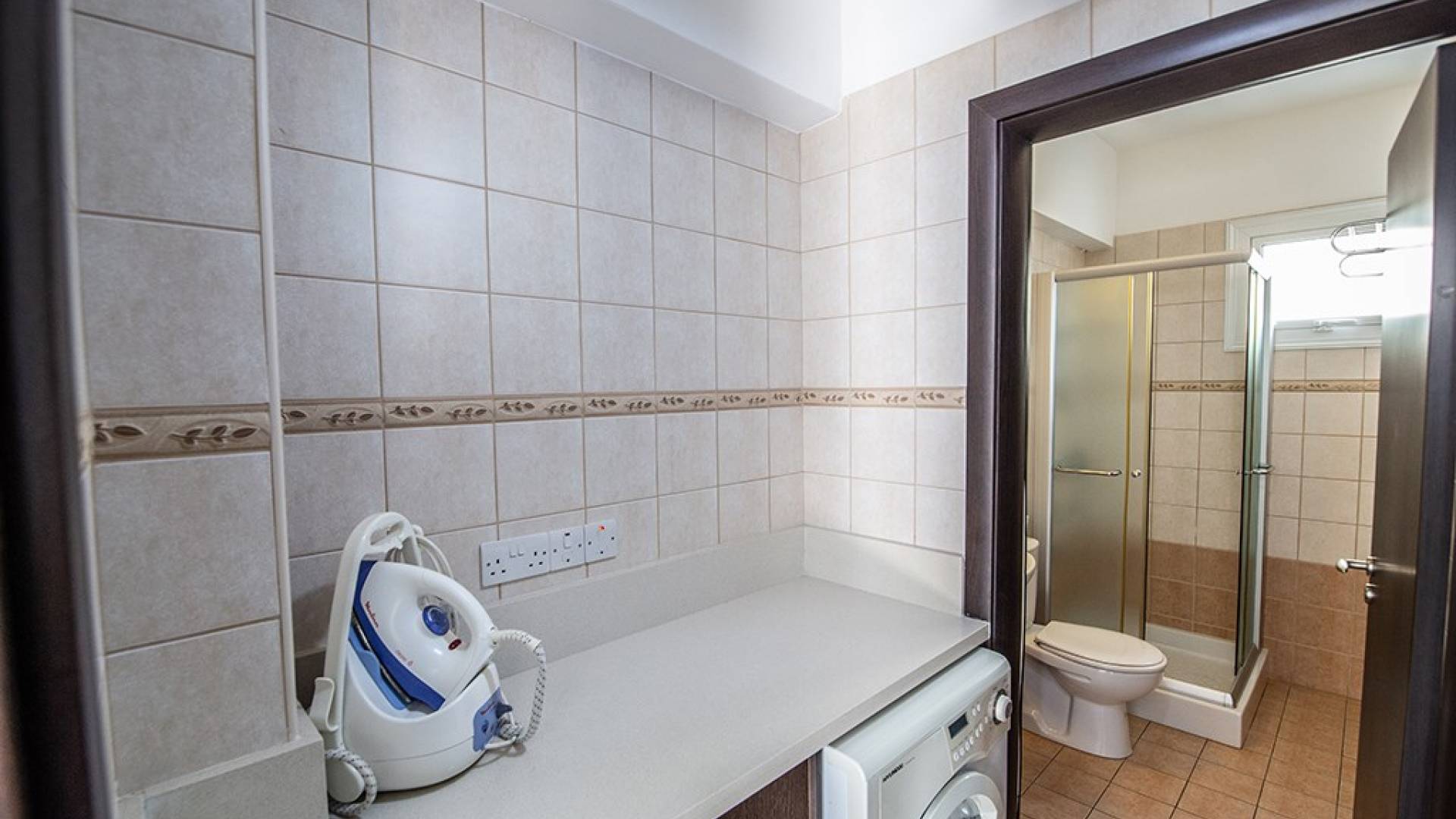 A l'étage, la villa dispose de trois chambres et d'une salle de bain familiale. La chambre principale a un lit double et une salle de bains avec un meuble dans la douche et des toilettes. Il y a une autre chambre double et une chambre avec 2 lits simples. La salle de bain principale a une baignoire, une douche et des toilettes.