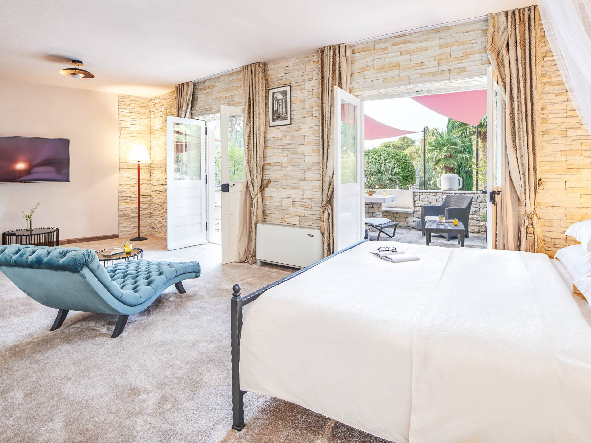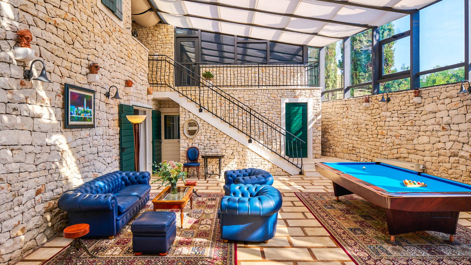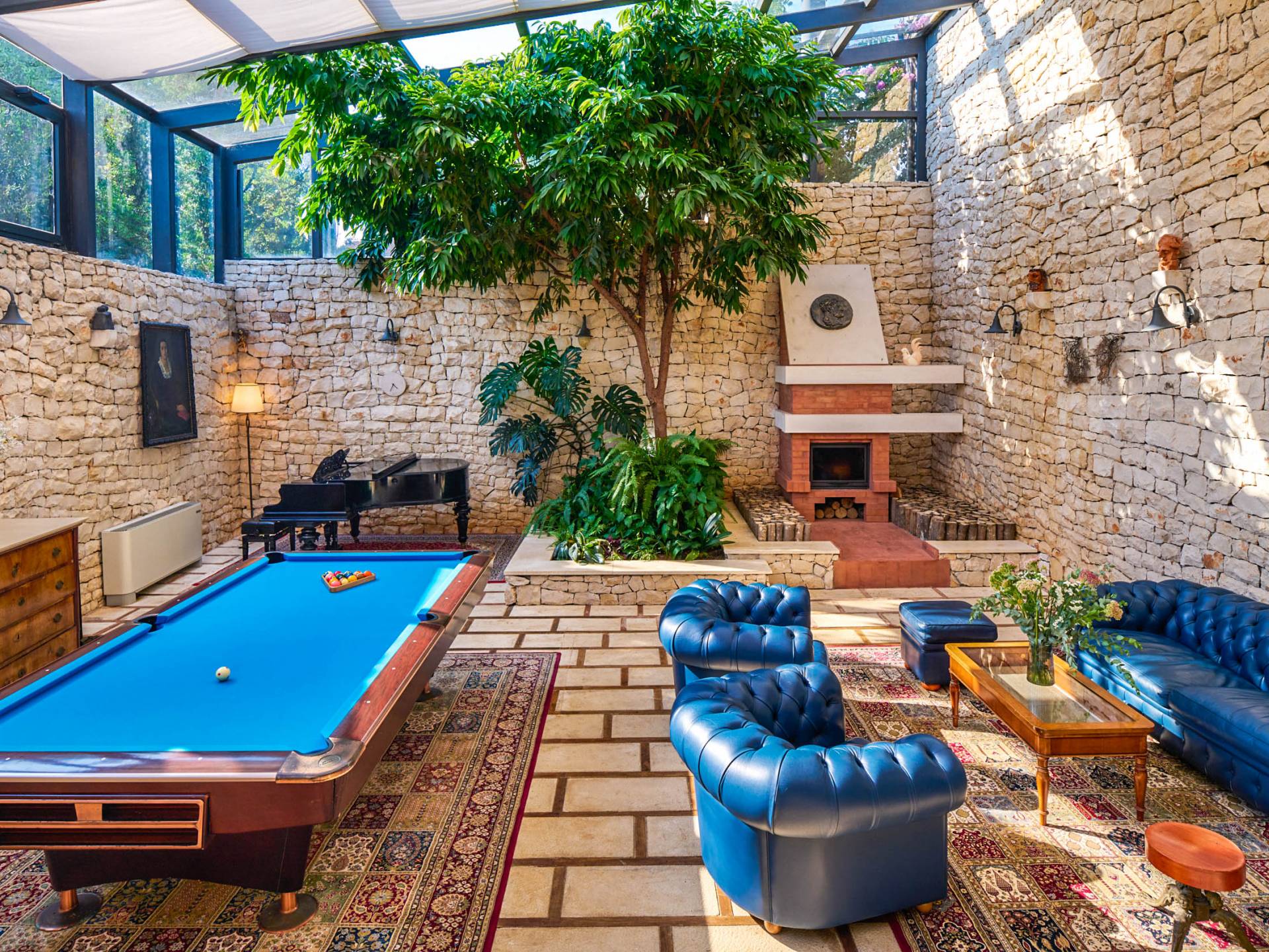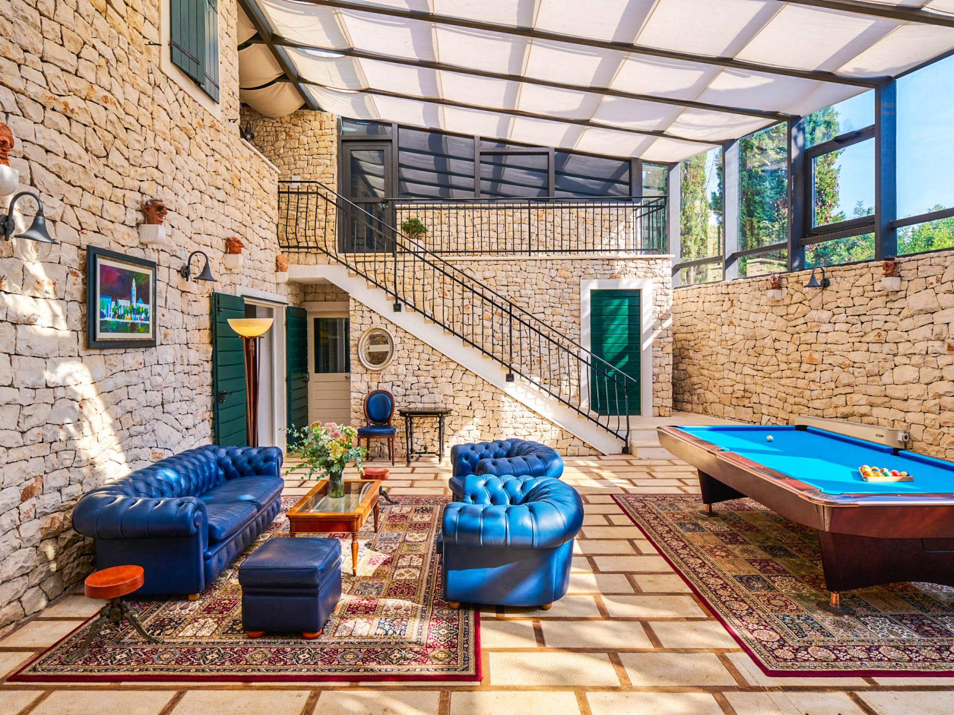 Une cuisine entièrement équipée et un salon et salle à manger spectaculaires avec un toit en verre sont décorés par d'élégants meubles bleu royal, du bois sombre et un piano. De plus, cet espace dispose d'un petit jardin intérieur qui crée une expérience totalement unique et exclusive. Cachée à l'ombre des oliviers, se trouve une superbe piscine de 35 mètres carrés avec hydromassage entourée de chaises longues d'où vous pourrez profiter de la vue sur la plage et la mer Adriatique bleu cristal. Villa Royal Garden cherche à créer une oasis de détente parfaite pour ses clients, c'est pourquoi il existe diverses installations supplémentaires dans cette propriété. Jacuzzi intérieur/extérieur, sauna et fauteuil de massage, ainsi qu'une salle de sport pour ceux qui souhaitent s'en tenir à leur routine saine pendant les vacances.