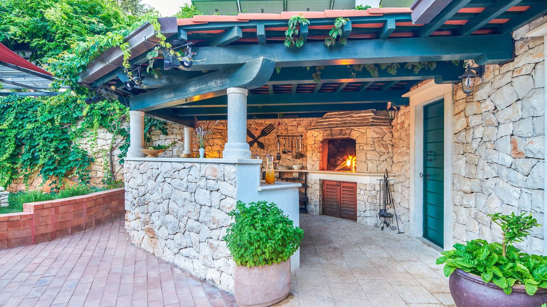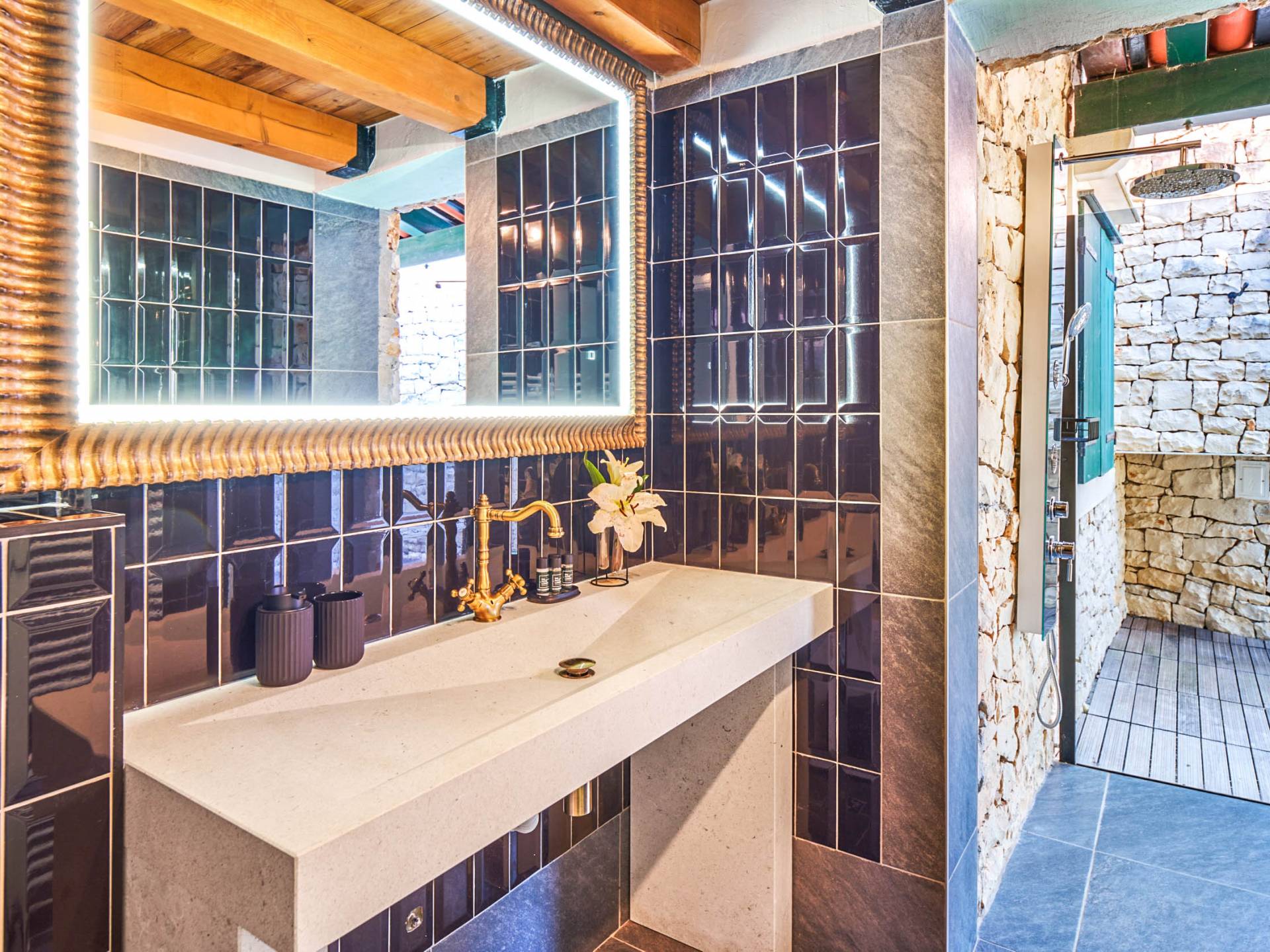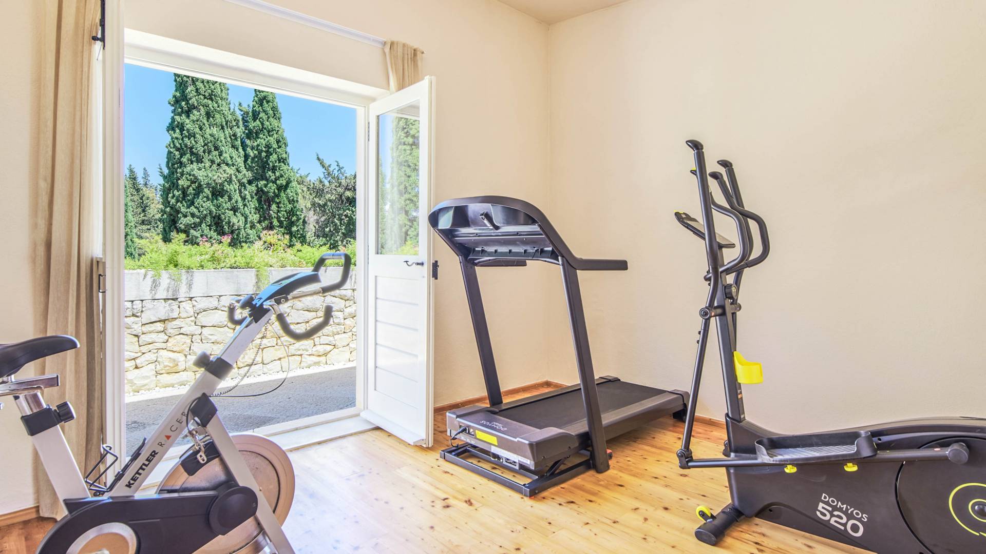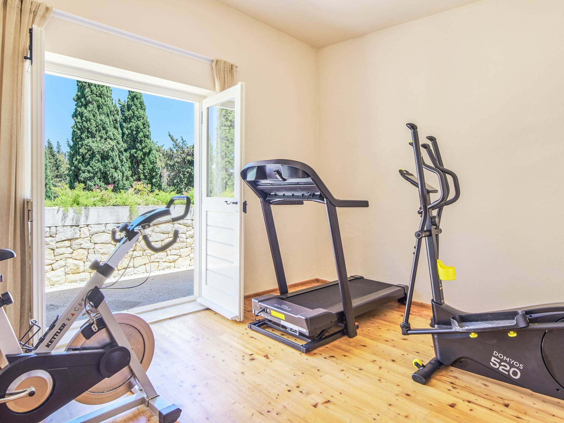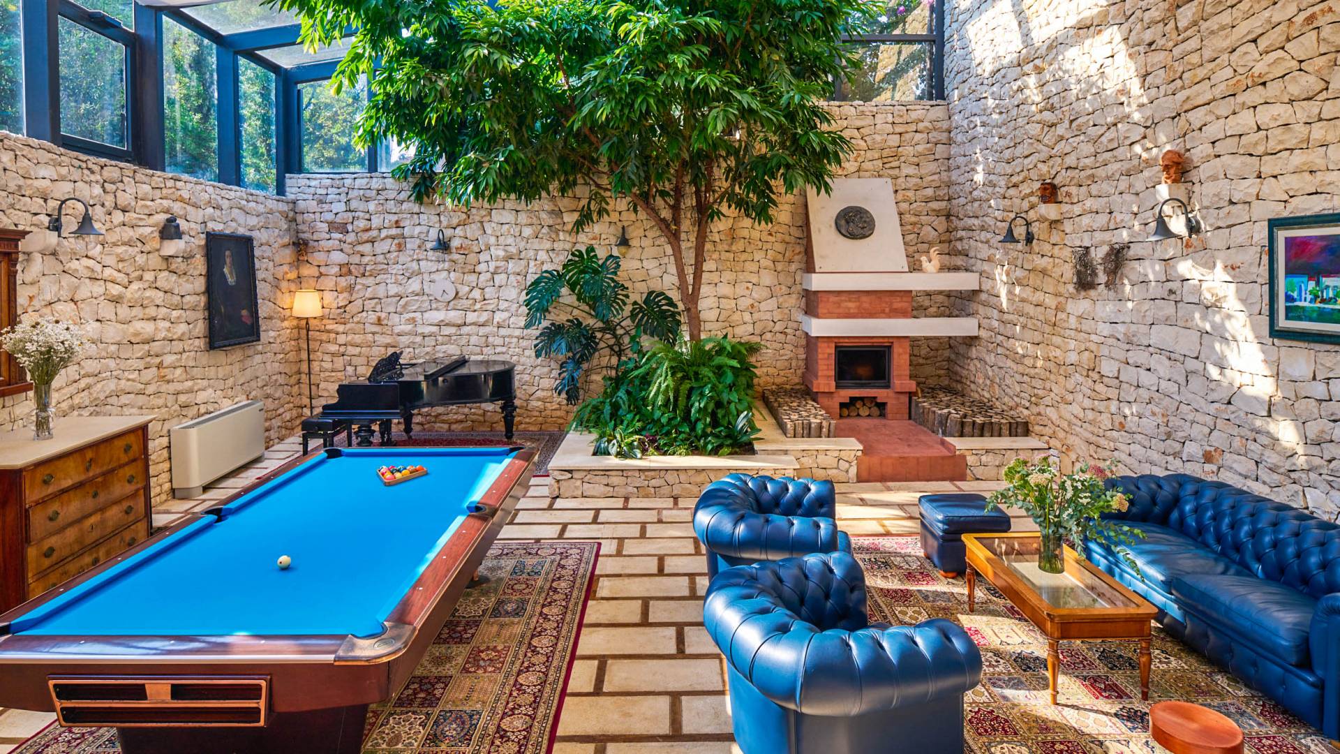 Une cuisine entièrement équipée et un salon et salle à manger spectaculaires avec un toit en verre sont décorés par d'élégants meubles bleu royal, du bois sombre et un piano. De plus, cet espace dispose d'un petit jardin intérieur qui crée une expérience totalement unique et exclusive. Cachée à l'ombre des oliviers, se trouve une superbe piscine de 35 mètres carrés avec hydromassage entourée de chaises longues d'où vous pourrez profiter de la vue sur la plage et la mer Adriatique bleu cristal. Villa Royal Garden cherche à créer une oasis de détente parfaite pour ses clients, c'est pourquoi il existe diverses installations supplémentaires dans cette propriété. Jacuzzi intérieur/extérieur, sauna et fauteuil de massage, ainsi qu'une salle de sport pour ceux qui souhaitent s'en tenir à leur routine saine pendant les vacances.