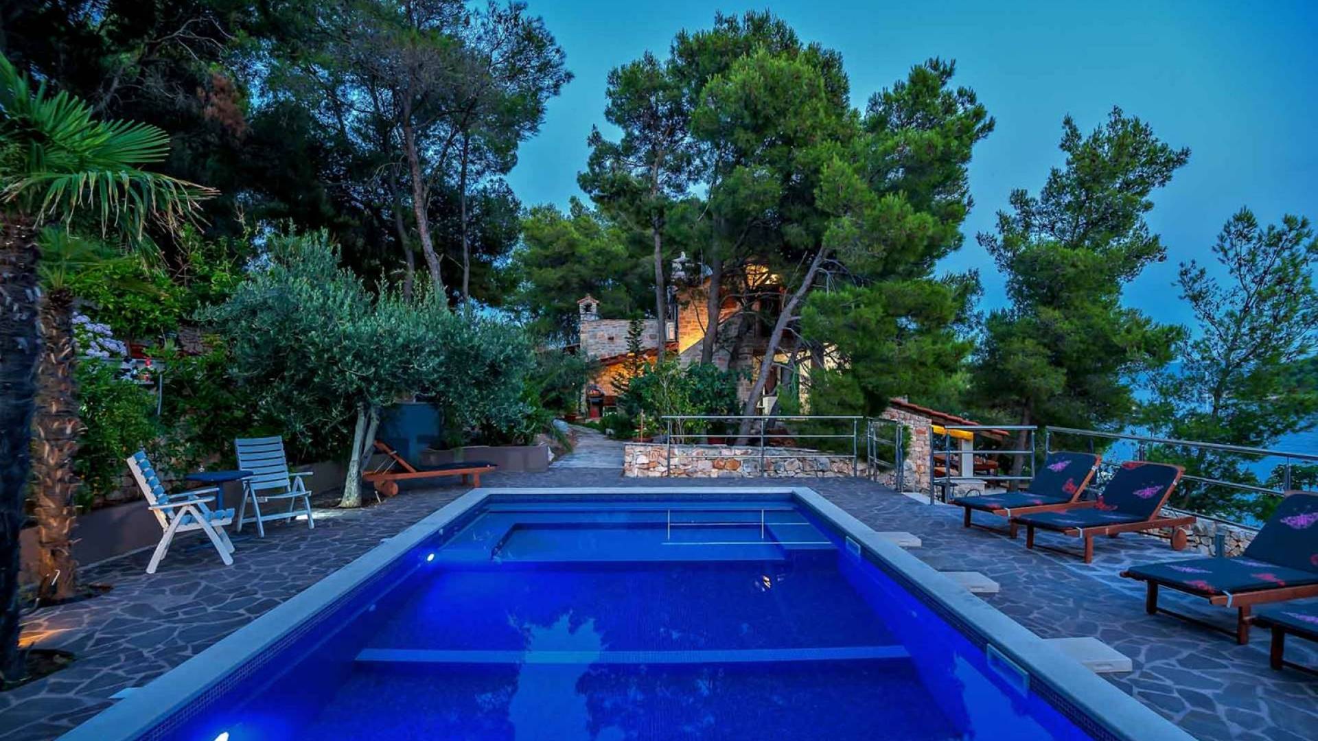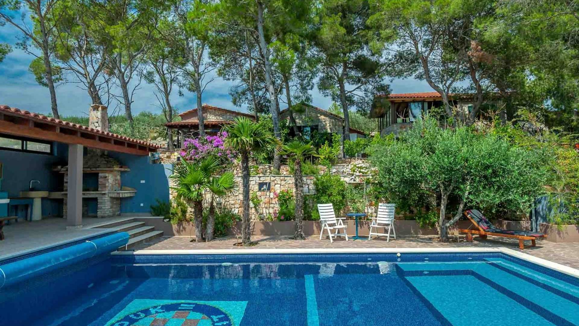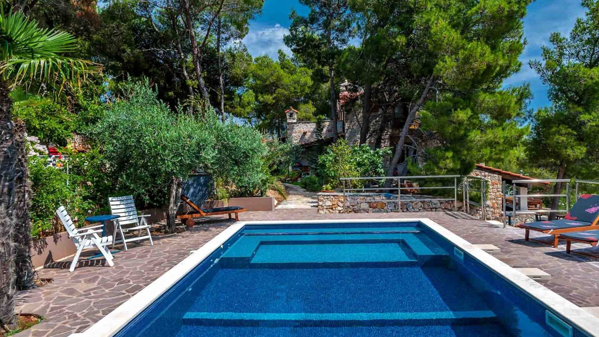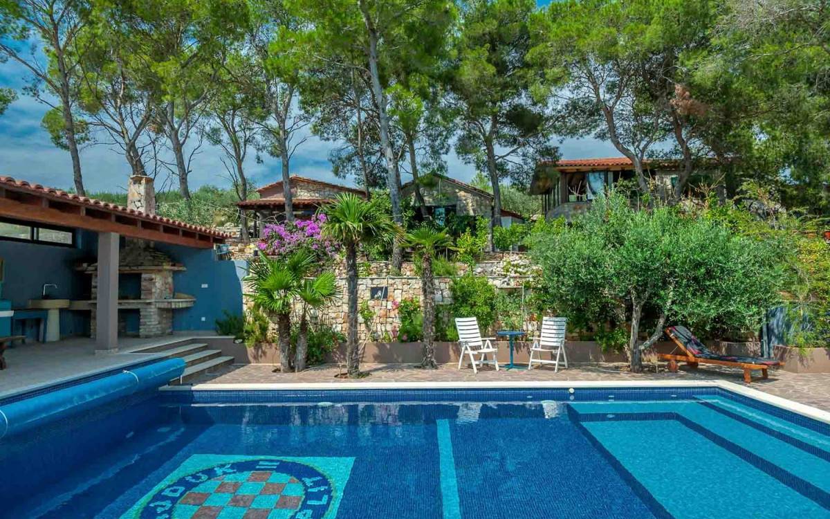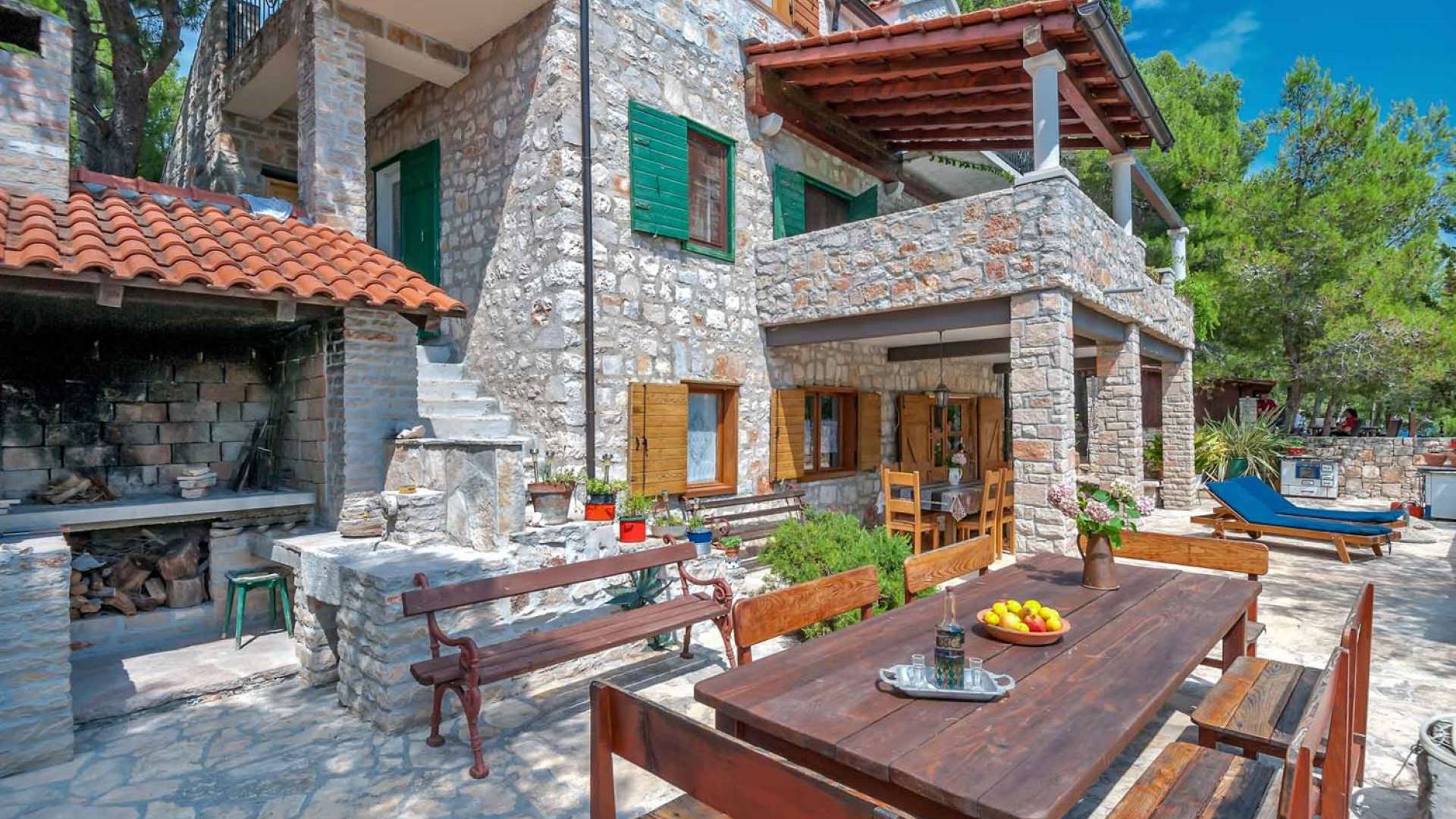 L'extérieur dispose d'une grande piscine privée (40 m²) entourée de transats et de parasols confortables, ainsi que d'une salle à manger ombragée idéale pour les repas en plein air et les moments de socialisation, rehaussée par le parfum distinctif des types de végétation dans cette région de la Méditerranée. Il y a aussi une cuisine d'été typiquement dalmate où vous pouvez préparer des plats savoureux mais si vous aimez un restaurant servant des aliments cultivés localement se trouve également sur place.